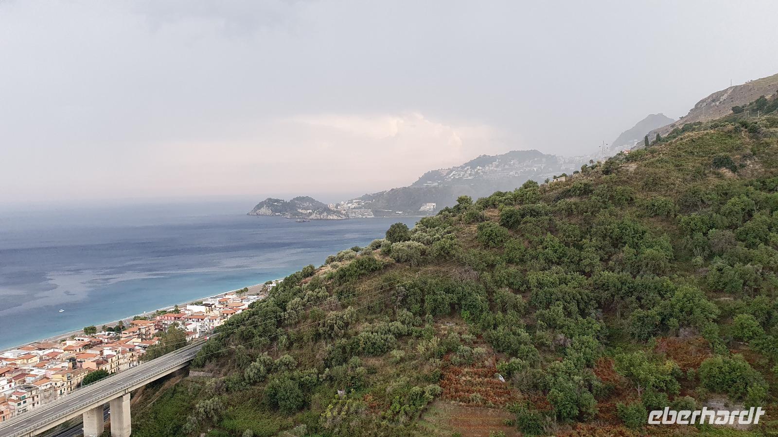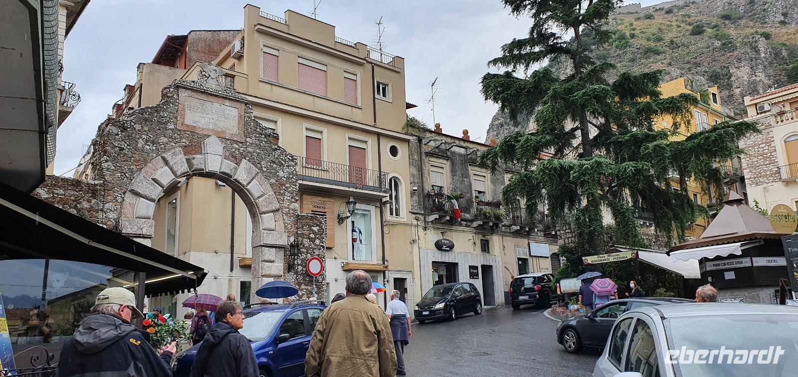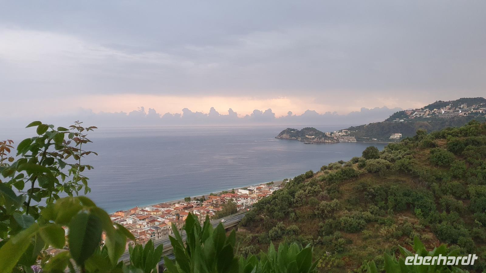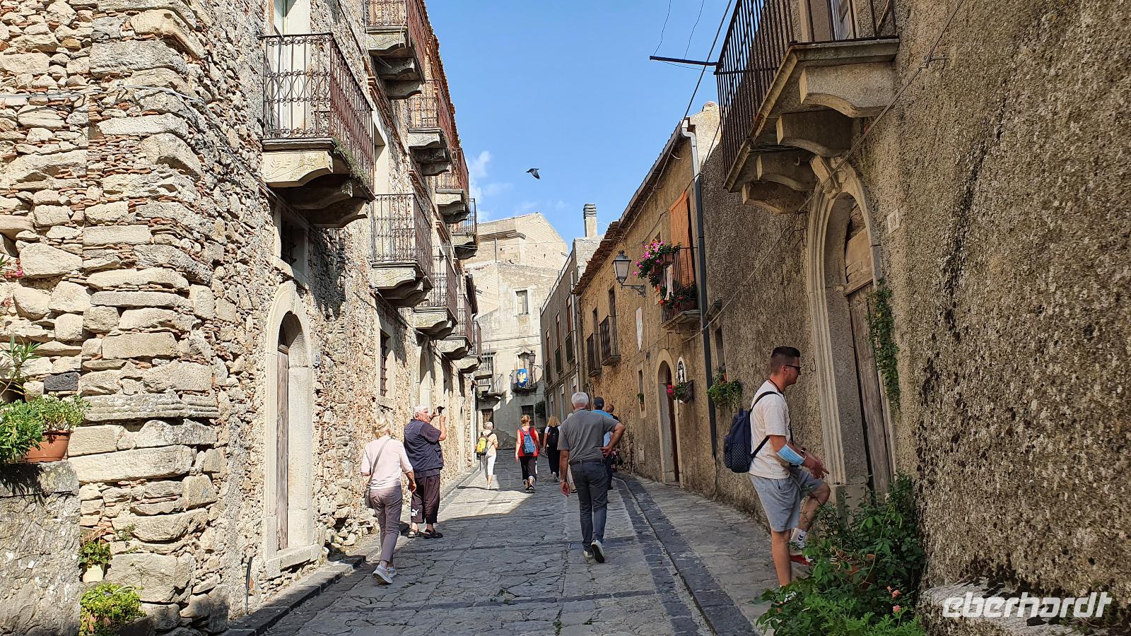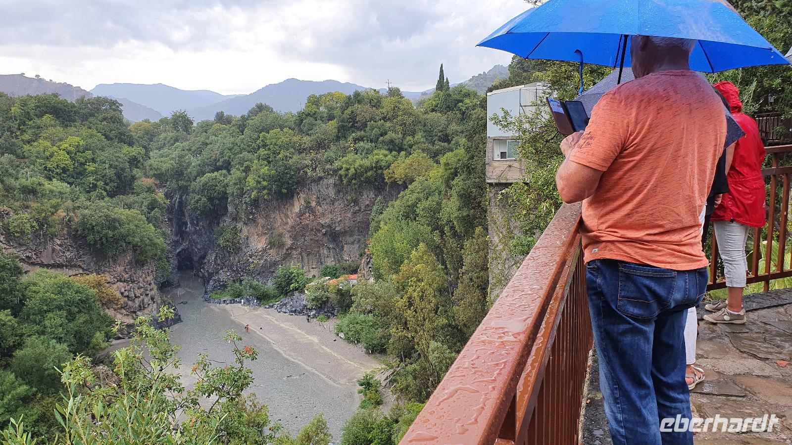Wieder verabschieden wir uns von einem Ort, es heißt Koffer packen und zurück zur Südküste Siziliens. Dieses Mal nehmen wir aber nicht die Küstenstraße sondern fahren durchs Landesinnere. Eines der schönsten Dörfer Siziliens ist unser erstes Ziel: Montalbano Elicona. Diesen Titel hat es vor einigen Jahren verliehen bekommen- leider ist die erhoffte touristische Belebung ausgeblieben und so ziehen viele Menschen hier weg- leider. Das Leben ist nicht einfach, es braucht den guten Familienzusammenhalt, füreinander dazusein und sich zu helfen. Am Markt steigen wir aus und spazieren hinauf zur Burg. Es ist eine Normannenburg, sie beherbergt ein kleines Museum und so können wir hautnah mittelalterliche Wappen, Waffen und Kleidung erleben, aber auch Musikinstrumente aus aller Welt und aus allen Epochen. Wer möchte steigt zum Burgturm hinauf und genießt die Aussicht von hier oben. Dann geht es die verwinkelten Gassen zurück zum Bus und unsere Fahrt führt uns nun weiter ins Nebrodi Gebirge. Auf der Hochebene von Agrimusco machen wir einen Stopp und einen Ausflug zu den Megalithen. Manch einer sieht in den Felsen reine Naturformen, anderen sind sie heilige Kultstätten, wie auch immer, wir genießen den Spaziergang. Begrüßen den "Adlerfelsen" und dann endlich auch wieder den Ätna. Wieder am Bus angekommen gibt es eine kleine Überraschung: ich hatte Trauben und Cracker besorgt, dazu den versprochenen süßen Marsala und da war ja auch noch etwas Limoncello...Alle freuen sich, genießen die Kleinigkeiten und den Aufenthalt hier oben. Nun aber geht es weiter zu unserer Mittagspause: ein Agriturismo wieder- dasBorgo San Nicolae. Wir werden herzlich begrüßt und können uns erst einmal umsehen. Zum Agriturismo gehört eine Käserei und in die "Schatzkammer"- das Kühlhaus- können wir einen Blick werfen- Käselaibe reifen hier, aber auch der berühmte Schinken. Daneben die Ställe für Pferde, Federvieh... Vorbei an Bäumen voller fast reifer Esskastanien geht es zurück und dann dürfen wir schlemmen. Es gibt eine Vielzahl Antipasti, Brot, Käse, Schinken, Salami und Wein. Was für ein köstliches Mahl! Da waren sich alle einig. Rosario bereitete noch eine Überraschung für uns vor: er sammelte Kaktusfeigen und schälte sie für uns. Die werden wir morgen bekommen.hmmm. Dann geht unsere Reise weiter. An Randazzo vorbei und am ältesten Nebenkrater des Ätna, dem Moio Alcantara. Unterwegs beginnt es heftig zu regnen, es gibt ein Gewitter und dann auch einen Regenbogen. So erreichen wir die Alcantara Schlucht. Wir sind nicht sicher, ob wir aussteigen wollen- aber was solls, mehr als nass werden können wir nicht. In einer kurzen Regenpause geht es zum Aussichtspunkt. Von hier oben kann man die Schluchten sehen und einen Blick auf den Alcantara Fluss werfen, der in der Nähe von Giardini Naxos ins Meer mündet. Über tausende von Jahren hat sich der Fluss bis zu 20 Meter tief ins Lavagestein gegraben und bizarre Schluchten erschaffen. Nach diesem kurzen Stopp geht es weiter zu unserem Hotel der ersten beiden Tage hier. In Letojanni beziehen wir wieder unsere Zimmer im Antares Hotel. Das Gewitter hat uns nun eingeholt und es blitzt und donnert ordentlich. Gut, dass wir uns zwischenzeitlich gut auskennen hier, so müssen wir nicht durch die Außenanlagen und kommen trocken zum Abendessen. Und so verabschieden wir uns nach dem Essen voneinander- bis morgen.