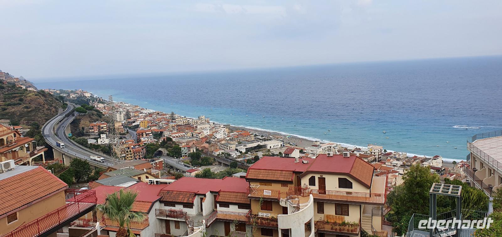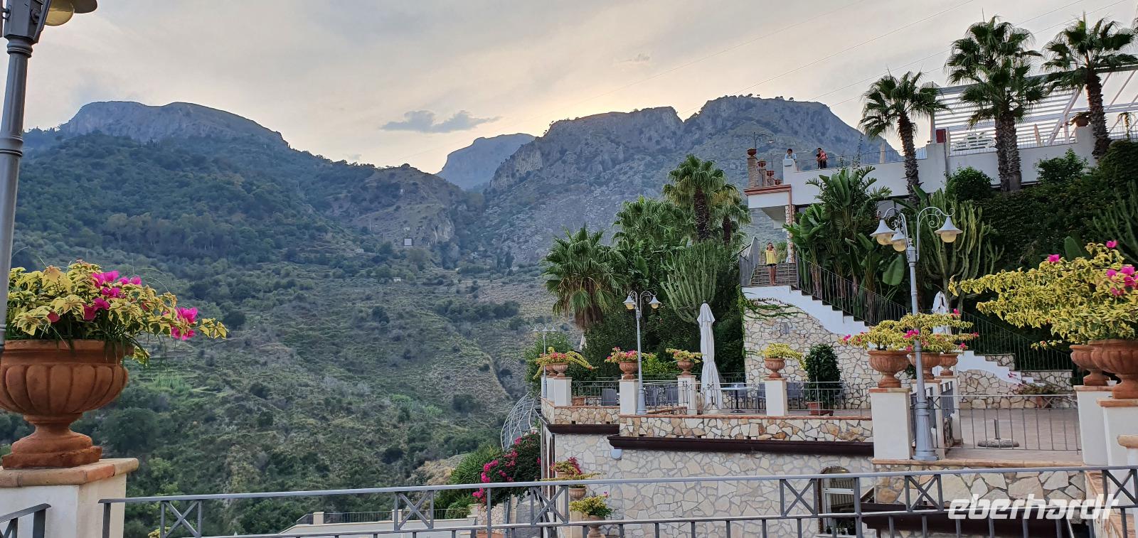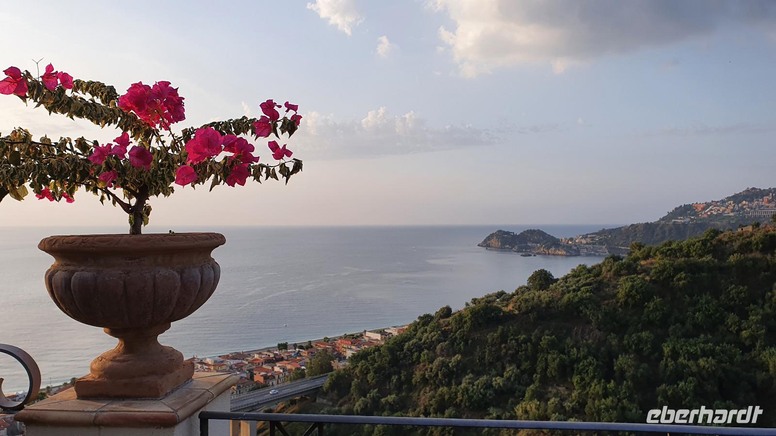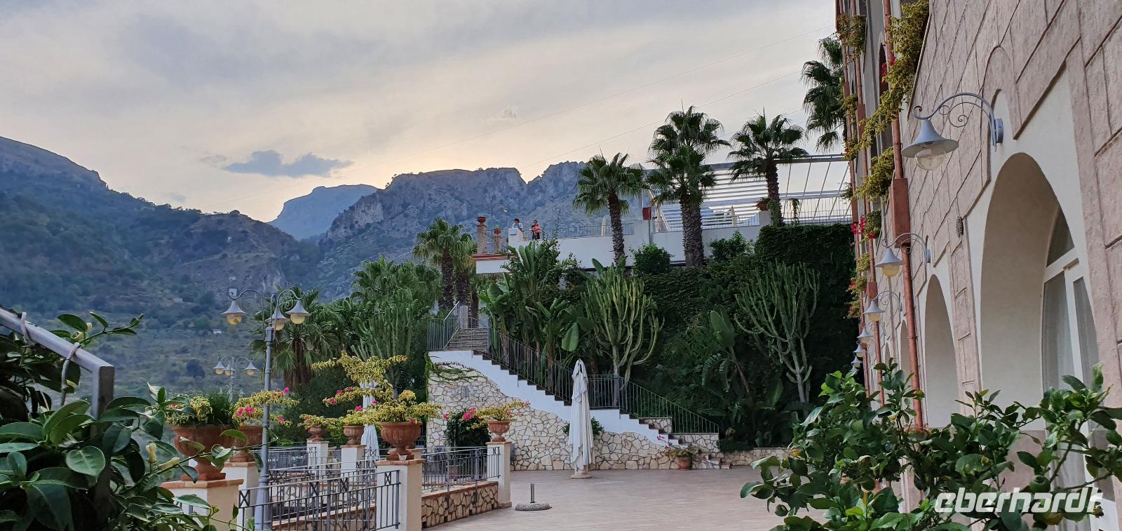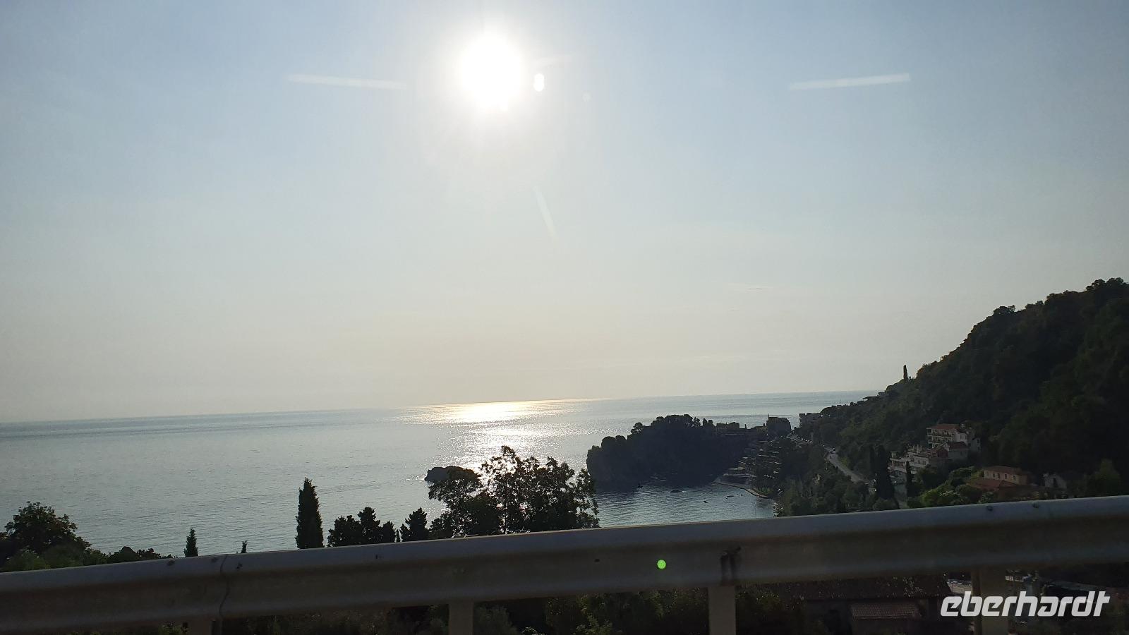 Schon früh am Morgen treffen wir uns auf den Flughäfen des Landes: Berlin, Dresden, Frankfurt. Für die meisten geht es dann via Stuttgart nach Catania. Manche sind auch schon einige Tage eher angereist und quasi bereits im Urlaubsmodus. Das können wir auch bald sein. Unser Flug und auch die Kofferausgabe verlaufen unkompliziert und reibungslos. Renate, unsere örtliche Reiseleiterin, begrüßt uns am Flughafen Catania und Rosario, unser Busfahrer, bringt uns sicher nach Letojanni zu unserem Hotel Antares. Alle bekommen ihre Zimmerschlüssel, die Koffer werden vom Bus zum Hoteleingang gebracht und dann heißt es: Zimmer finden. Unglaublich, wie riesig und verschachtelt ein Hotel sein kann. Also mit dem Schrägaufzug bis Station 2, dann zum nächsten Fahrstuhl- ein oder zwei Etagen? ...Die Zeit bis zum Abendessen nutzen wir für Orientierungsfahrten und - gänge und wer mochte auch bis zum Ort hinunter und zum Strand. Eine kleine Begrüßungsrunde und Infos zu den fakultativen Ausflügen am Ende unserer Reise und dann geht es ans Buffett. Hinter den Glaswänden stellt man uns unsere Teller nach unseren Wünschen zusammen und dann dürfen wir probieren und schlemmen. Highlight natürlich das Dessert- Buffett. So klingt ein langer Tag aus und wir verabschieden uns- bis morgen.