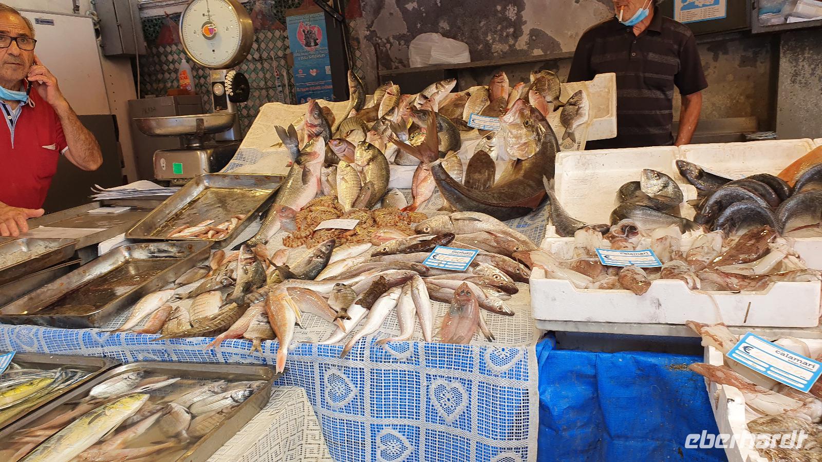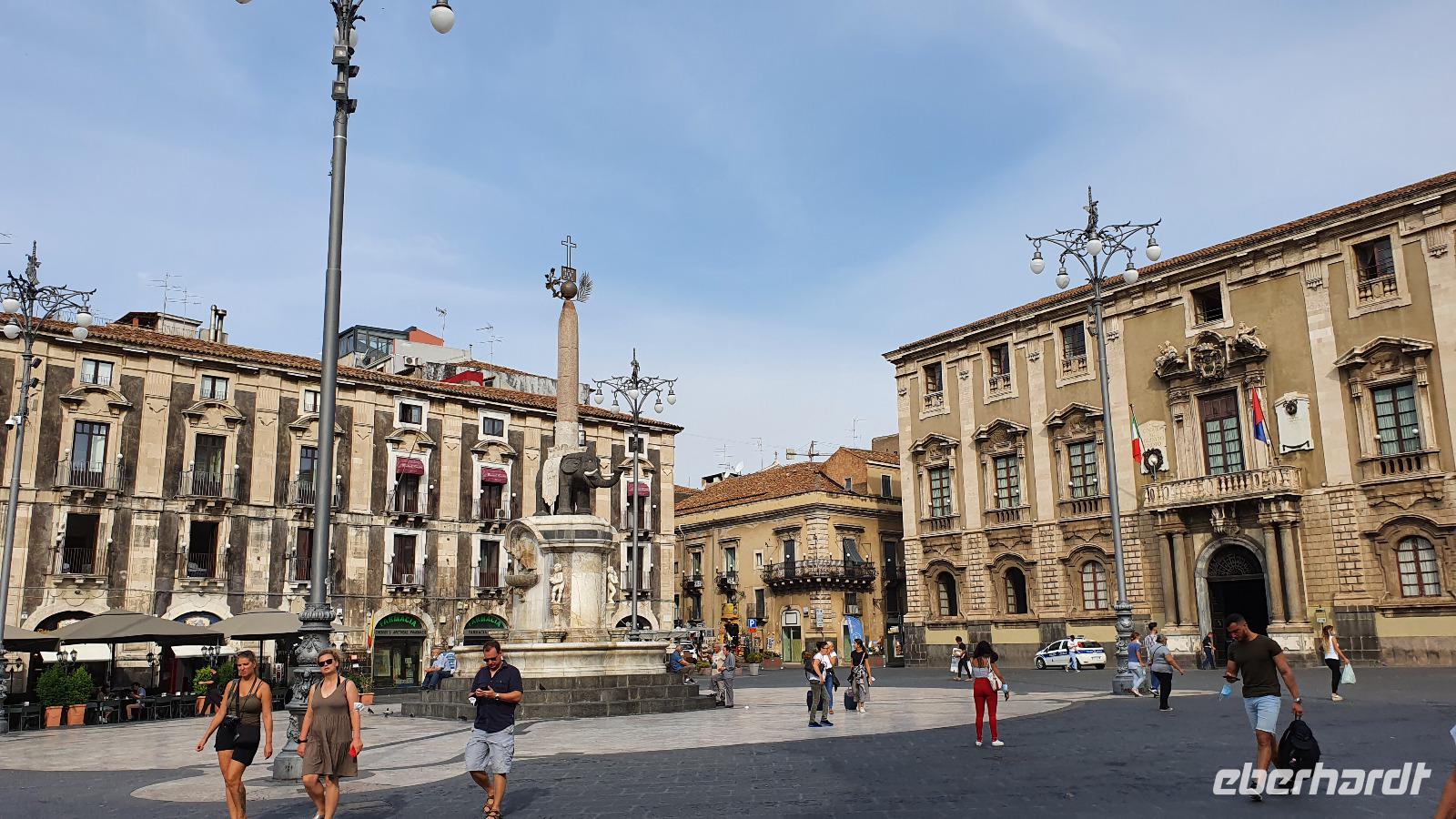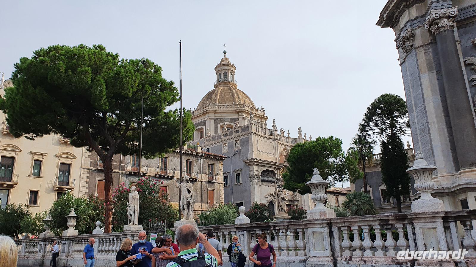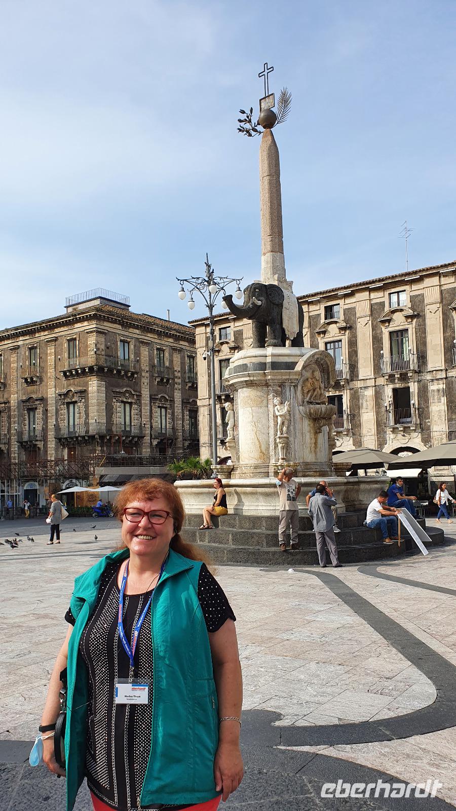 Alle haben sich heute für den falkultativen Ausflug nach Catania entschieden und so starten wir noch einmal alle gemeinsam. Eine gute Stunde Fahrt ist es bis Catania und wir genießen unterwegs die Ausblicke auf den Ätna, die Buchten und das Meer. Am Busbahnhof steigen wir aus und können als erstes köstliche Kaktusfeigen probieren, die uns Rosario gestern gesammelt und geschält hat. Das ist gar nicht so einfach, denn die haben ganz fiese Stacheln und bohren sich gern mal in die Haut. Müssen wir aber nicht befürchten, unsere sind geschält. So erfrischt starten wir unsere Erkundung am Stadttor. Und sind schon auf dem Domplatz. Der berühmte Elefantenbrunnen grüßt und wir spazieren zur Universität. Leider dürfen wir nicht hinein, da der Zutritt für Fremde verboten wurde, so geht es also zurück zum Dom. Renate erklärt uns die Geschichte und das Innere des Domes- hinein dürfen keine Gruppen- also gehen wir individuell. Wissen nun aber, wo das Grab von Bellini ist usw. Bellini wird hoch verehrt von den Sizilianern. Seine Musik oft gespielt und geliebt. Im Dom können wir uns in aller Ruhe umschauen und Fotos machen, dann geht es weiter. Der berühmte Fischmarkt von Catania ist unser nächstes Ziel und schon am Eingang wird es ohrenbetäubend laut. Die Händler versuchen sich gegenseitig zu überbieten- und was für eine Auswahl kann man hier kaufen. Da ist von Schwertfisch bis zur Sardine, von der Muschel bis zur Auster, vom Tintenfisch bis zur Garnele alles dabei. Dann folgen die Gemüsestände- wir hätten am liebsten alle eingekauft- aber wie mit dem Flugzeug nach Hause bringen? So blieb es bei dem einen oder anderen Stück Parmesan, das man sich einschweißen lassen konnte und ein paar Trauben zum Naschen. Von hier aus spazierten wir weiter zum Castell Ursino. Wieder eine Normannenburg. Beim verheerenden Vulkanausbruch lief die Lava bis zum Meer hinunter. Am Castell stoppte sie, schob aber das Wasser vor sich her, so dass das Castell heute nicht mehr am Wasser sondern in der Stadt steht. Mitten durch die Stadt floss die Lava, zerstörte fast alles. Nachfolgende Erdbeben, besonders das von 1693 taten ihr Übriges. So wurde die Stadt wieder aufgebaut, im barocken Stil und in Schwarz-Weiß. Weißer Marmor und schwarzes Basaltgestein prägen heute die Fassaden der Stadt. Gemeinsam spazieren wir zurück zum Domplatz und nun war wieder Zeit für individuelle Erkundungen. Wer wollte probierte eine Arancini- gefüllte Reiskugeln- lecker. Nach dem Mittag ging es dann zurück zum Hotel, unser Halbtagesausflug war zu Ende und leider auch die Fahrt mit Rosario und seinem Bus. Er wurde kurzfristig anders eingesetzt und so verabschiedeten wir uns von ihm mit einem herzlichen Applaus. Den freien Nachmittag genossen alle für sich, beim Baden, Bummeln im Ort, relaxen am Pool oder einfach mal nix tun. Erst am späten Nachmittag zog dann das für Mittag bereits angekündigte Gewitter auf und begleitete uns bis zum Abend mit Regen, Blitz und Donner. Das machte uns aber nichts aus. Wir genossen gemeinsam unser Abendessen und dann gibt es schon erste Verabschiedungen. Nicht alle kommen morgen zum fakultativen Ausflug nach Syracus mit und wir fliegen übermorgen mit unterschiedlichen Flugzeugen und zu unterschiedlichen Zeiten heim.