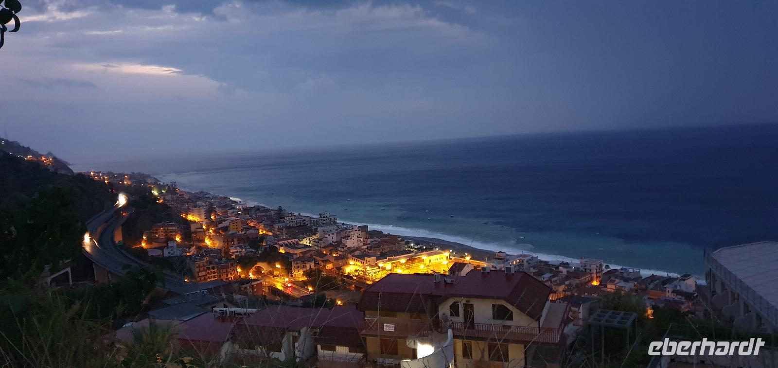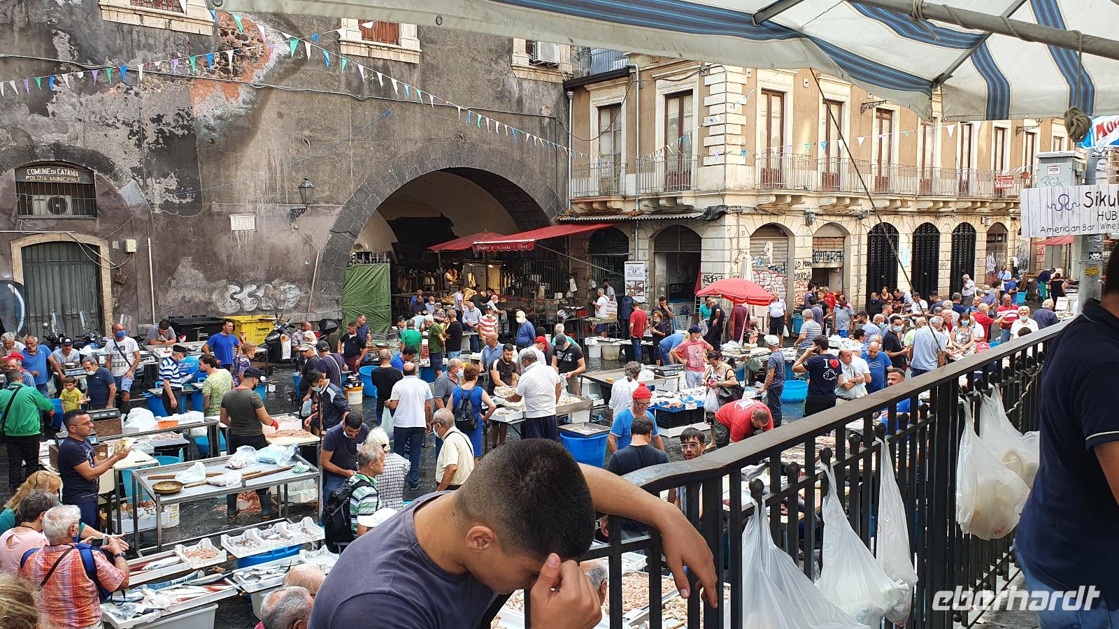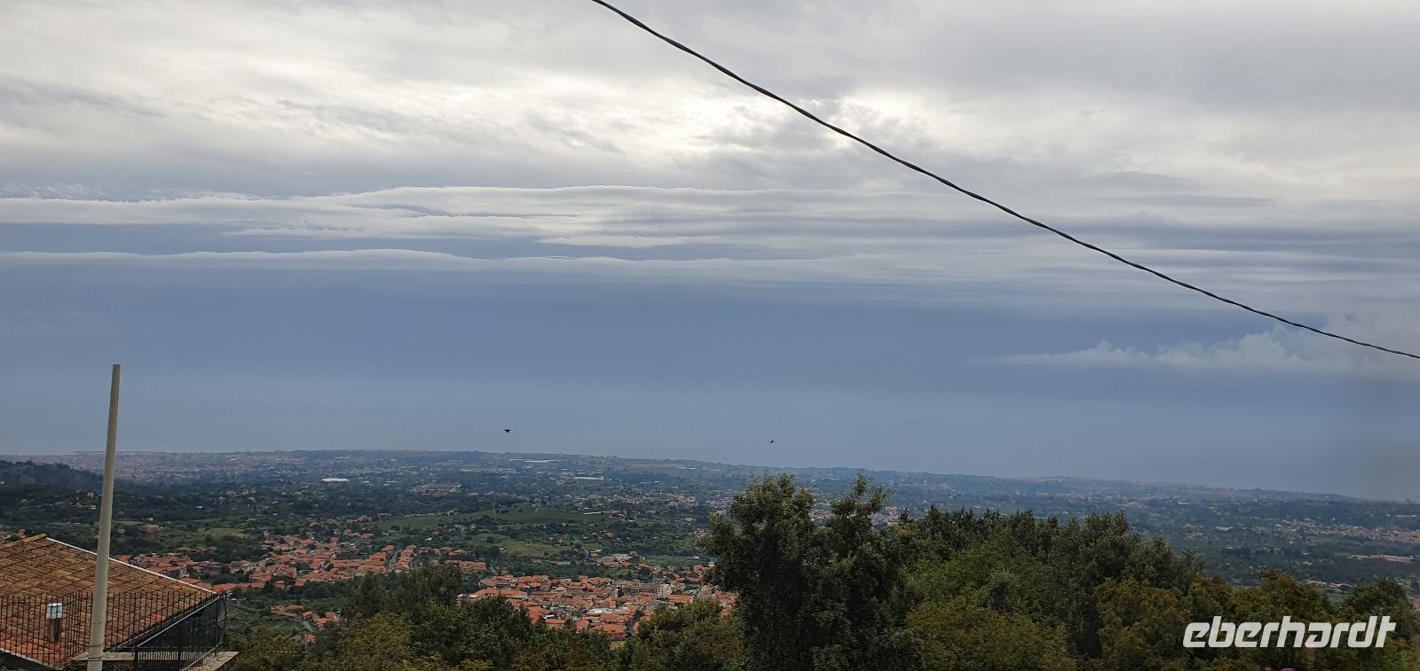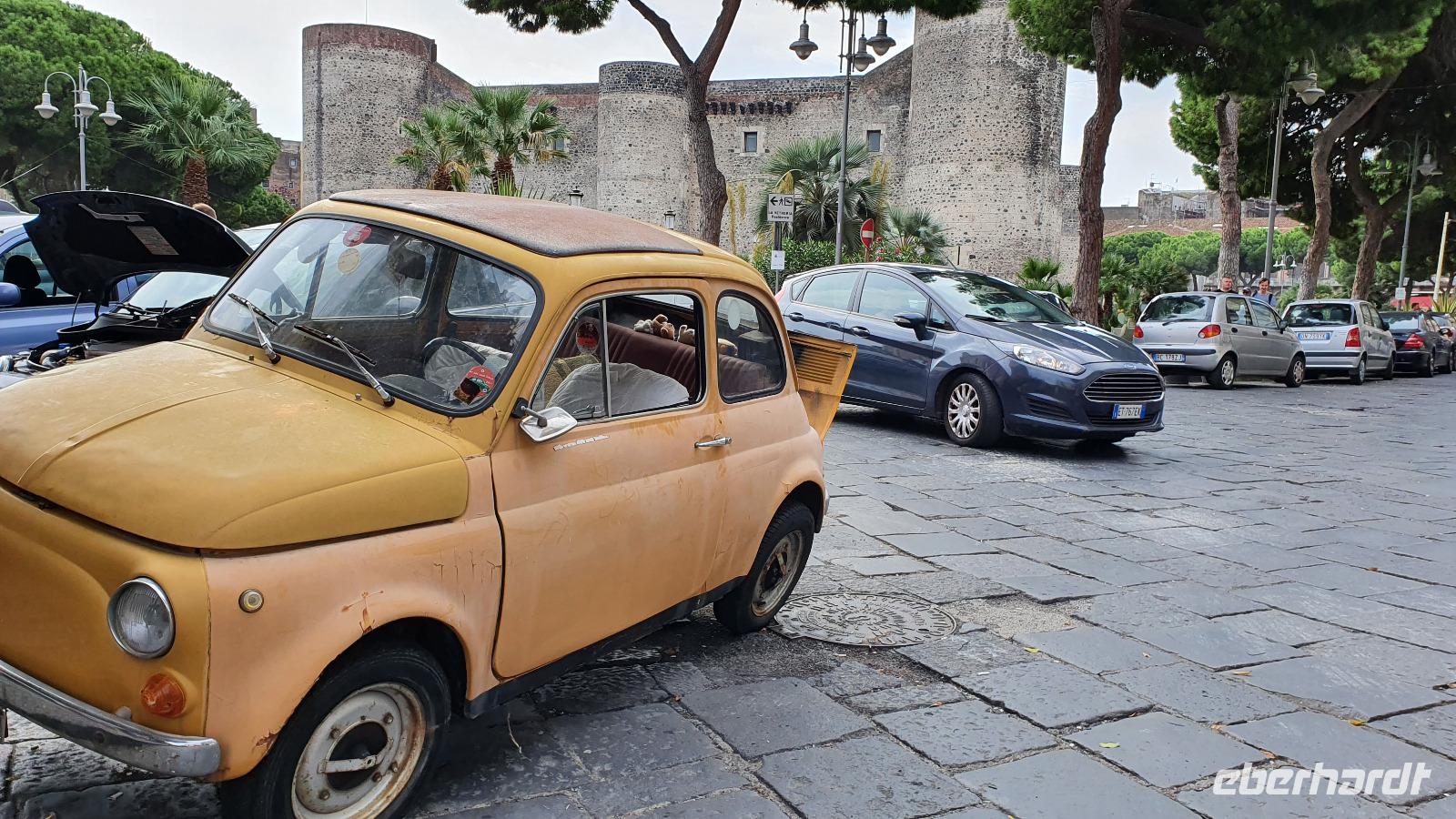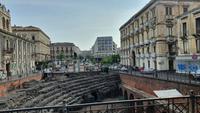 Alle haben sich heute für den falkultativen Ausflug nach Catania entschieden und so starten wir noch einmal alle gemeinsam. Eine gute Stunde Fahrt ist es bis Catania und wir genießen unterwegs die Ausblicke auf den Ätna, die Buchten und das Meer. Am Busbahnhof steigen wir aus und können als erstes köstliche Kaktusfeigen probieren, die uns Rosario gestern gesammelt und geschält hat. Das ist gar nicht so einfach, denn die haben ganz fiese Stacheln und bohren sich gern mal in die Haut. Müssen wir aber nicht befürchten, unsere sind geschält. So erfrischt starten wir unsere Erkundung am Stadttor. Und sind schon auf dem Domplatz. Der berühmte Elefantenbrunnen grüßt und wir spazieren zur Universität. Leider dürfen wir nicht hinein, da der Zutritt für Fremde verboten wurde, so geht es also zurück zum Dom. Renate erklärt uns die Geschichte und das Innere des Domes- hinein dürfen keine Gruppen- also gehen wir individuell. Wissen nun aber, wo das Grab von Bellini ist usw. Bellini wird hoch verehrt von den Sizilianern. Seine Musik oft gespielt und geliebt. Im Dom können wir uns in aller Ruhe umschauen und Fotos machen, dann geht es weiter. Der berühmte Fischmarkt von Catania ist unser nächstes Ziel und schon am Eingang wird es ohrenbetäubend laut. Die Händler versuchen sich gegenseitig zu überbieten- und was für eine Auswahl kann man hier kaufen. Da ist von Schwertfisch bis zur Sardine, von der Muschel bis zur Auster, vom Tintenfisch bis zur Garnele alles dabei. Dann folgen die Gemüsestände- wir hätten am liebsten alle eingekauft- aber wie mit dem Flugzeug nach Hause bringen? So blieb es bei dem einen oder anderen Stück Parmesan, das man sich einschweißen lassen konnte und ein paar Trauben zum Naschen. Von hier aus spazierten wir weiter zum Castell Ursino. Wieder eine Normannenburg. Beim verheerenden Vulkanausbruch lief die Lava bis zum Meer hinunter. Am Castell stoppte sie, schob aber das Wasser vor sich her, so dass das Castell heute nicht mehr am Wasser sondern in der Stadt steht. Mitten durch die Stadt floss die Lava, zerstörte fast alles. Nachfolgende Erdbeben, besonders das von 1693 taten ihr Übriges. So wurde die Stadt wieder aufgebaut, im barocken Stil und in Schwarz-Weiß. Weißer Marmor und schwarzes Basaltgestein prägen heute die Fassaden der Stadt. Gemeinsam spazieren wir zurück zum Domplatz und nun war wieder Zeit für individuelle Erkundungen. Wer wollte probierte eine Arancini- gefüllte Reiskugeln- lecker. Nach dem Mittag ging es dann zurück zum Hotel, unser Halbtagesausflug war zu Ende und leider auch die Fahrt mit Rosario und seinem Bus. Er wurde kurzfristig anders eingesetzt und so verabschiedeten wir uns von ihm mit einem herzlichen Applaus. Den freien Nachmittag genossen alle für sich, beim Baden, Bummeln im Ort, relaxen am Pool oder einfach mal nix tun. Erst am späten Nachmittag zog dann das für Mittag bereits angekündigte Gewitter auf und begleitete uns bis zum Abend mit Regen, Blitz und Donner. Das machte uns aber nichts aus. Wir genossen gemeinsam unser Abendessen und dann gibt es schon erste Verabschiedungen. Nicht alle kommen morgen zum fakultativen Ausflug nach Syracus mit und wir fliegen übermorgen mit unterschiedlichen Flugzeugen und zu unterschiedlichen Zeiten heim.