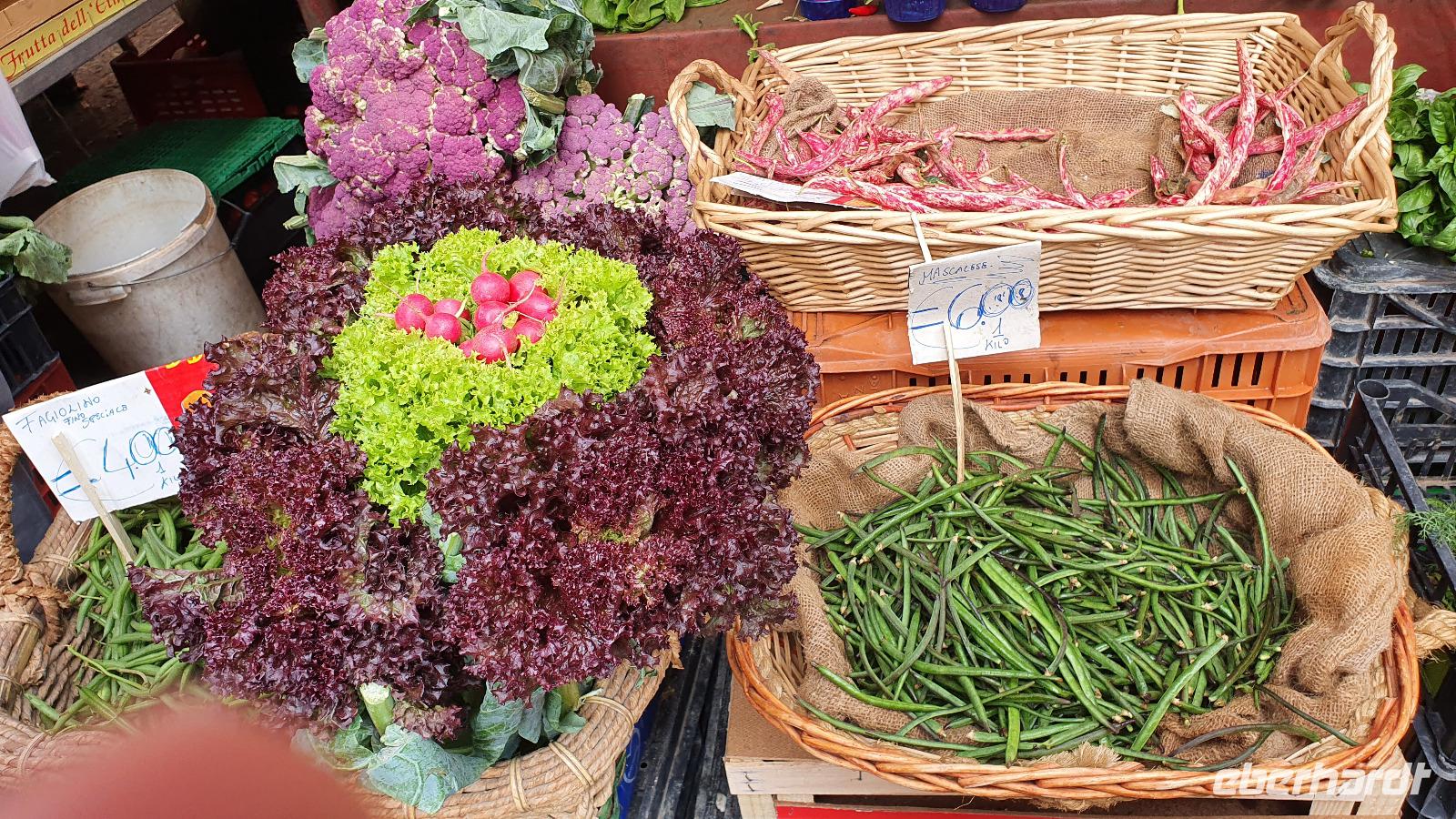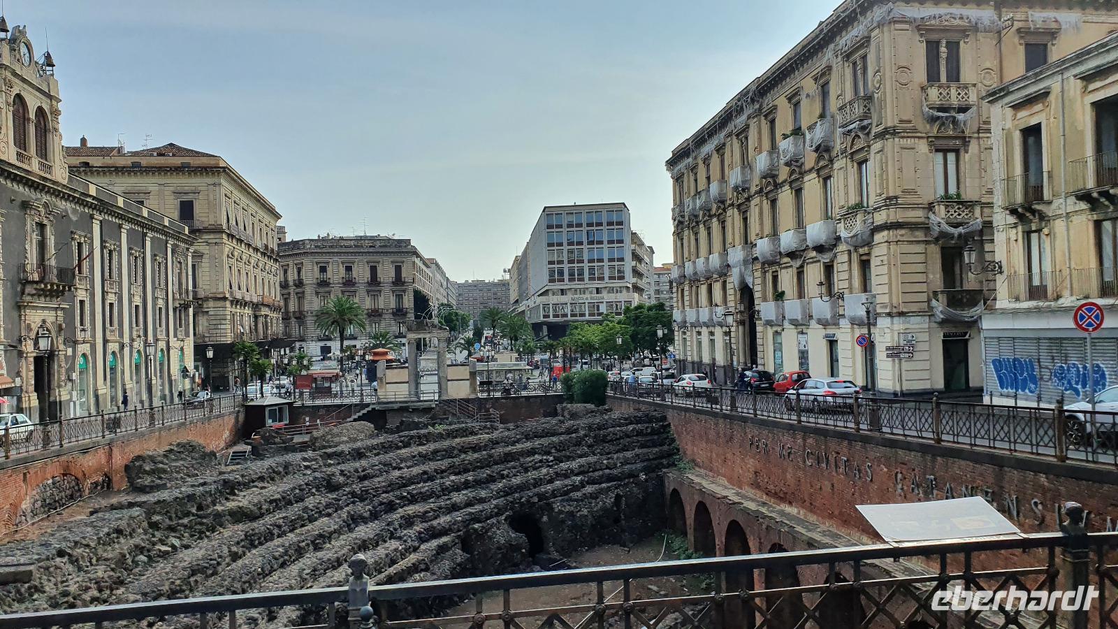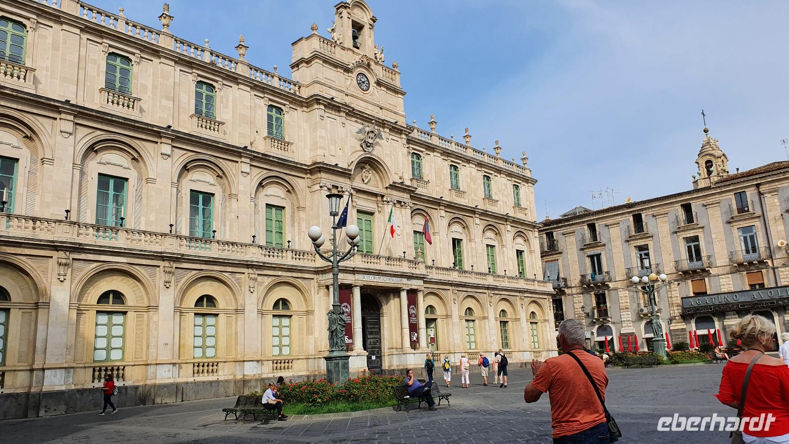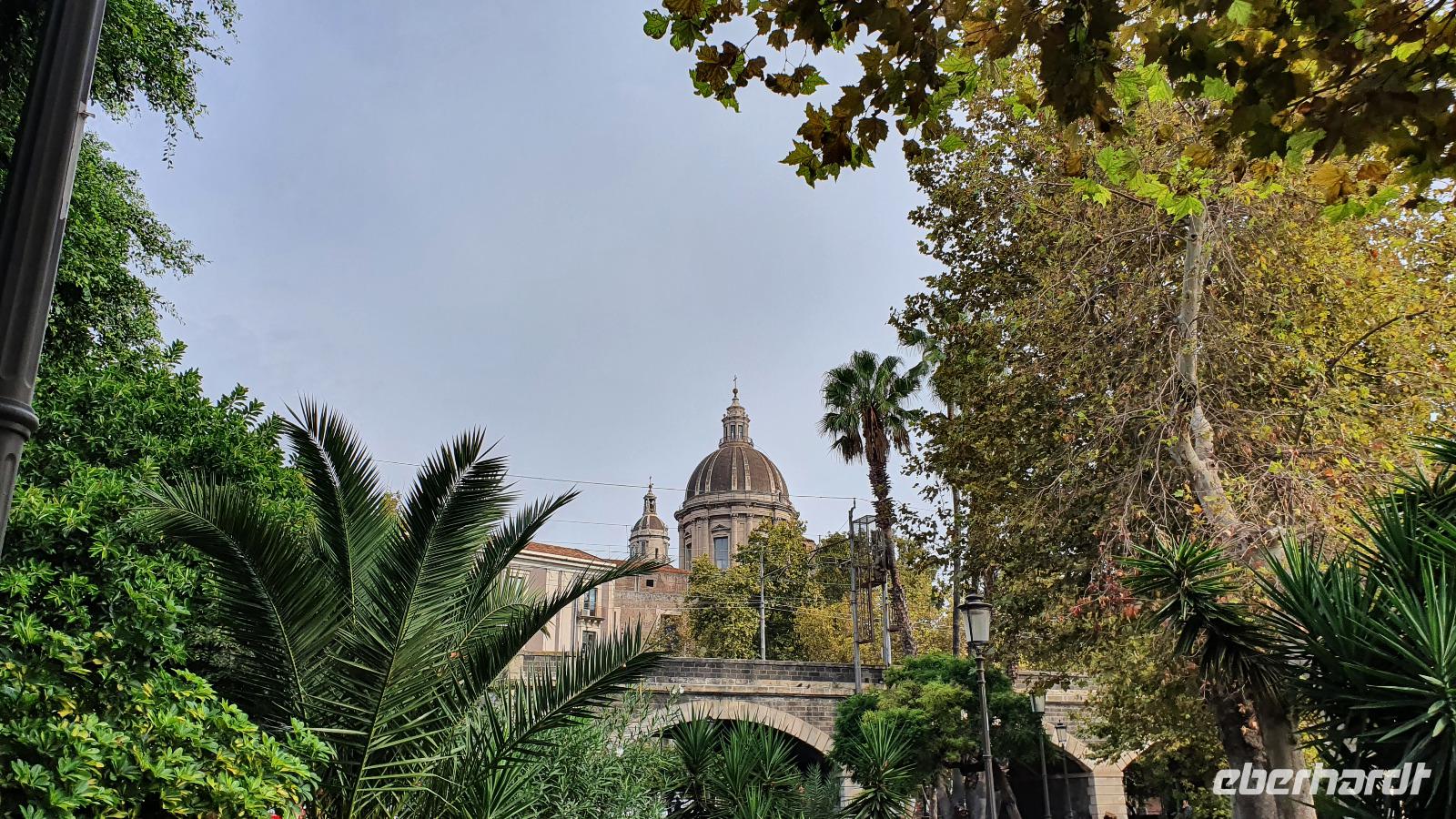 Alle haben sich heute für den falkultativen Ausflug nach Catania entschieden und so starten wir noch einmal alle gemeinsam. Eine gute Stunde Fahrt ist es bis Catania und wir genießen unterwegs die Ausblicke auf den Ätna, die Buchten und das Meer. Am Busbahnhof steigen wir aus und können als erstes köstliche Kaktusfeigen probieren, die uns Rosario gestern gesammelt und geschält hat. Das ist gar nicht so einfach, denn die haben ganz fiese Stacheln und bohren sich gern mal in die Haut. Müssen wir aber nicht befürchten, unsere sind geschält. So erfrischt starten wir unsere Erkundung am Stadttor. Und sind schon auf dem Domplatz. Der berühmte Elefantenbrunnen grüßt und wir spazieren zur Universität. Leider dürfen wir nicht hinein, da der Zutritt für Fremde verboten wurde, so geht es also zurück zum Dom. Renate erklärt uns die Geschichte und das Innere des Domes- hinein dürfen keine Gruppen- also gehen wir individuell. Wissen nun aber, wo das Grab von Bellini ist usw. Bellini wird hoch verehrt von den Sizilianern. Seine Musik oft gespielt und geliebt. Im Dom können wir uns in aller Ruhe umschauen und Fotos machen, dann geht es weiter. Der berühmte Fischmarkt von Catania ist unser nächstes Ziel und schon am Eingang wird es ohrenbetäubend laut. Die Händler versuchen sich gegenseitig zu überbieten- und was für eine Auswahl kann man hier kaufen. Da ist von Schwertfisch bis zur Sardine, von der Muschel bis zur Auster, vom Tintenfisch bis zur Garnele alles dabei. Dann folgen die Gemüsestände- wir hätten am liebsten alle eingekauft- aber wie mit dem Flugzeug nach Hause bringen? So blieb es bei dem einen oder anderen Stück Parmesan, das man sich einschweißen lassen konnte und ein paar Trauben zum Naschen. Von hier aus spazierten wir weiter zum Castell Ursino. Wieder eine Normannenburg. Beim verheerenden Vulkanausbruch lief die Lava bis zum Meer hinunter. Am Castell stoppte sie, schob aber das Wasser vor sich her, so dass das Castell heute nicht mehr am Wasser sondern in der Stadt steht. Mitten durch die Stadt floss die Lava, zerstörte fast alles. Nachfolgende Erdbeben, besonders das von 1693 taten ihr Übriges. So wurde die Stadt wieder aufgebaut, im barocken Stil und in Schwarz-Weiß. Weißer Marmor und schwarzes Basaltgestein prägen heute die Fassaden der Stadt. Gemeinsam spazieren wir zurück zum Domplatz und nun war wieder Zeit für individuelle Erkundungen. Wer wollte probierte eine Arancini- gefüllte Reiskugeln- lecker. Nach dem Mittag ging es dann zurück zum Hotel, unser Halbtagesausflug war zu Ende und leider auch die Fahrt mit Rosario und seinem Bus. Er wurde kurzfristig anders eingesetzt und so verabschiedeten wir uns von ihm mit einem herzlichen Applaus. Den freien Nachmittag genossen alle für sich, beim Baden, Bummeln im Ort, relaxen am Pool oder einfach mal nix tun. Erst am späten Nachmittag zog dann das für Mittag bereits angekündigte Gewitter auf und begleitete uns bis zum Abend mit Regen, Blitz und Donner. Das machte uns aber nichts aus. Wir genossen gemeinsam unser Abendessen und dann gibt es schon erste Verabschiedungen. Nicht alle kommen morgen zum fakultativen Ausflug nach Syracus mit und wir fliegen übermorgen mit unterschiedlichen Flugzeugen und zu unterschiedlichen Zeiten heim.