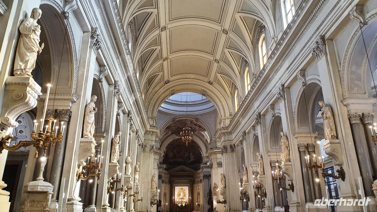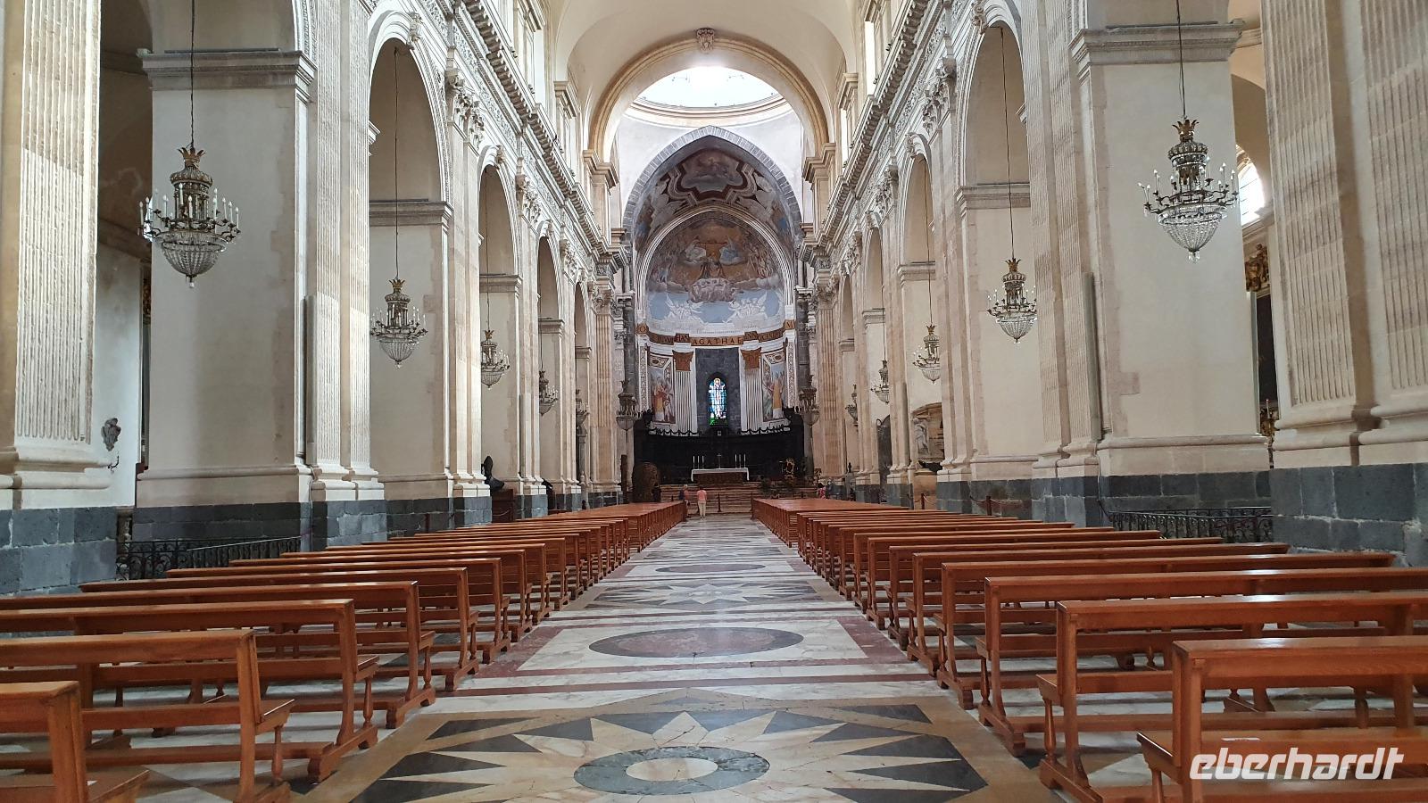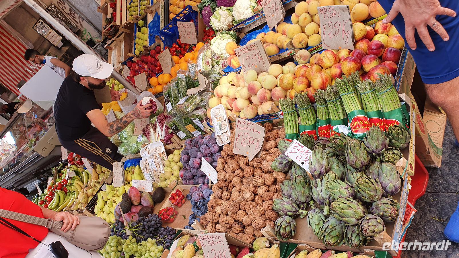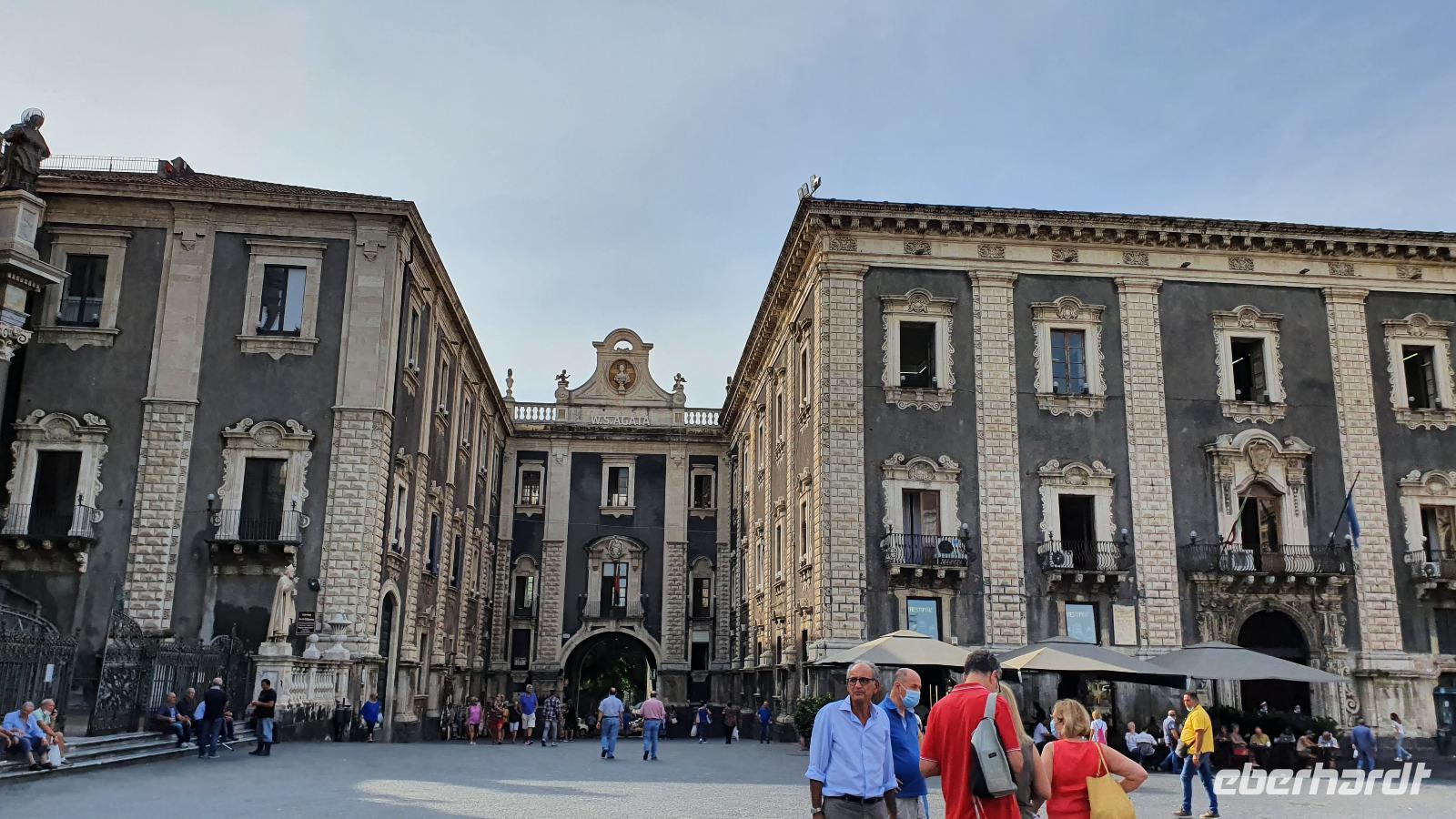 Alle haben sich heute für den falkultativen Ausflug nach Catania entschieden und so starten wir noch einmal alle gemeinsam. Eine gute Stunde Fahrt ist es bis Catania und wir genießen unterwegs die Ausblicke auf den Ätna, die Buchten und das Meer. Am Busbahnhof steigen wir aus und können als erstes köstliche Kaktusfeigen probieren, die uns Rosario gestern gesammelt und geschält hat. Das ist gar nicht so einfach, denn die haben ganz fiese Stacheln und bohren sich gern mal in die Haut. Müssen wir aber nicht befürchten, unsere sind geschält. So erfrischt starten wir unsere Erkundung am Stadttor. Und sind schon auf dem Domplatz. Der berühmte Elefantenbrunnen grüßt und wir spazieren zur Universität. Leider dürfen wir nicht hinein, da der Zutritt für Fremde verboten wurde, so geht es also zurück zum Dom. Renate erklärt uns die Geschichte und das Innere des Domes- hinein dürfen keine Gruppen- also gehen wir individuell. Wissen nun aber, wo das Grab von Bellini ist usw. Bellini wird hoch verehrt von den Sizilianern. Seine Musik oft gespielt und geliebt. Im Dom können wir uns in aller Ruhe umschauen und Fotos machen, dann geht es weiter. Der berühmte Fischmarkt von Catania ist unser nächstes Ziel und schon am Eingang wird es ohrenbetäubend laut. Die Händler versuchen sich gegenseitig zu überbieten- und was für eine Auswahl kann man hier kaufen. Da ist von Schwertfisch bis zur Sardine, von der Muschel bis zur Auster, vom Tintenfisch bis zur Garnele alles dabei. Dann folgen die Gemüsestände- wir hätten am liebsten alle eingekauft- aber wie mit dem Flugzeug nach Hause bringen? So blieb es bei dem einen oder anderen Stück Parmesan, das man sich einschweißen lassen konnte und ein paar Trauben zum Naschen. Von hier aus spazierten wir weiter zum Castell Ursino. Wieder eine Normannenburg. Beim verheerenden Vulkanausbruch lief die Lava bis zum Meer hinunter. Am Castell stoppte sie, schob aber das Wasser vor sich her, so dass das Castell heute nicht mehr am Wasser sondern in der Stadt steht. Mitten durch die Stadt floss die Lava, zerstörte fast alles. Nachfolgende Erdbeben, besonders das von 1693 taten ihr Übriges. So wurde die Stadt wieder aufgebaut, im barocken Stil und in Schwarz-Weiß. Weißer Marmor und schwarzes Basaltgestein prägen heute die Fassaden der Stadt. Gemeinsam spazieren wir zurück zum Domplatz und nun war wieder Zeit für individuelle Erkundungen. Wer wollte probierte eine Arancini- gefüllte Reiskugeln- lecker. Nach dem Mittag ging es dann zurück zum Hotel, unser Halbtagesausflug war zu Ende und leider auch die Fahrt mit Rosario und seinem Bus. Er wurde kurzfristig anders eingesetzt und so verabschiedeten wir uns von ihm mit einem herzlichen Applaus. Den freien Nachmittag genossen alle für sich, beim Baden, Bummeln im Ort, relaxen am Pool oder einfach mal nix tun. Erst am späten Nachmittag zog dann das für Mittag bereits angekündigte Gewitter auf und begleitete uns bis zum Abend mit Regen, Blitz und Donner. Das machte uns aber nichts aus. Wir genossen gemeinsam unser Abendessen und dann gibt es schon erste Verabschiedungen. Nicht alle kommen morgen zum fakultativen Ausflug nach Syracus mit und wir fliegen übermorgen mit unterschiedlichen Flugzeugen und zu unterschiedlichen Zeiten heim.