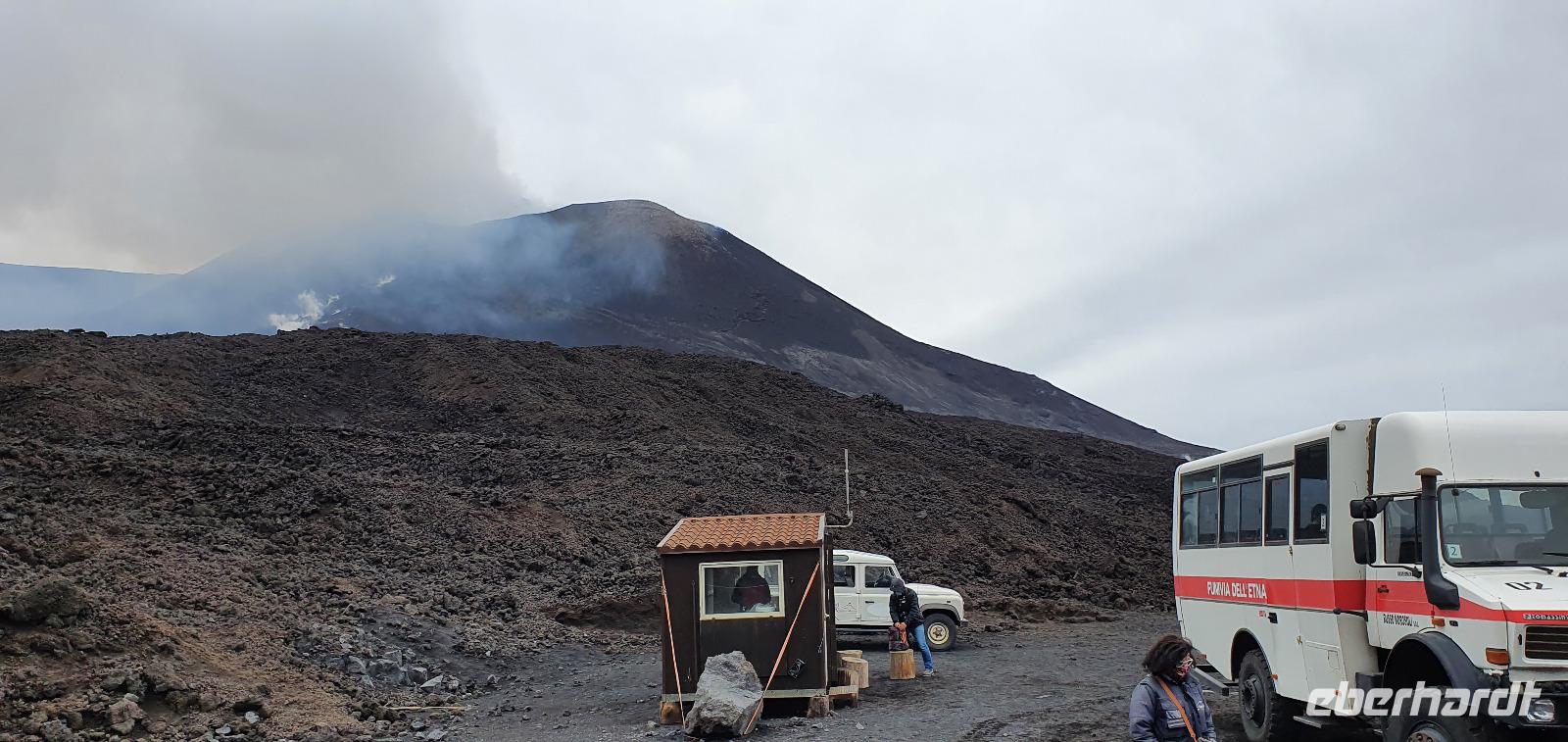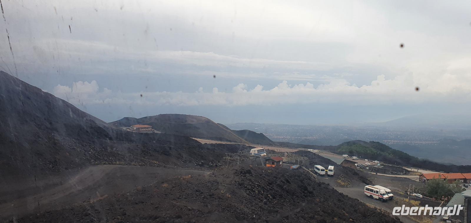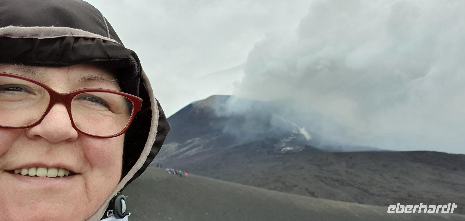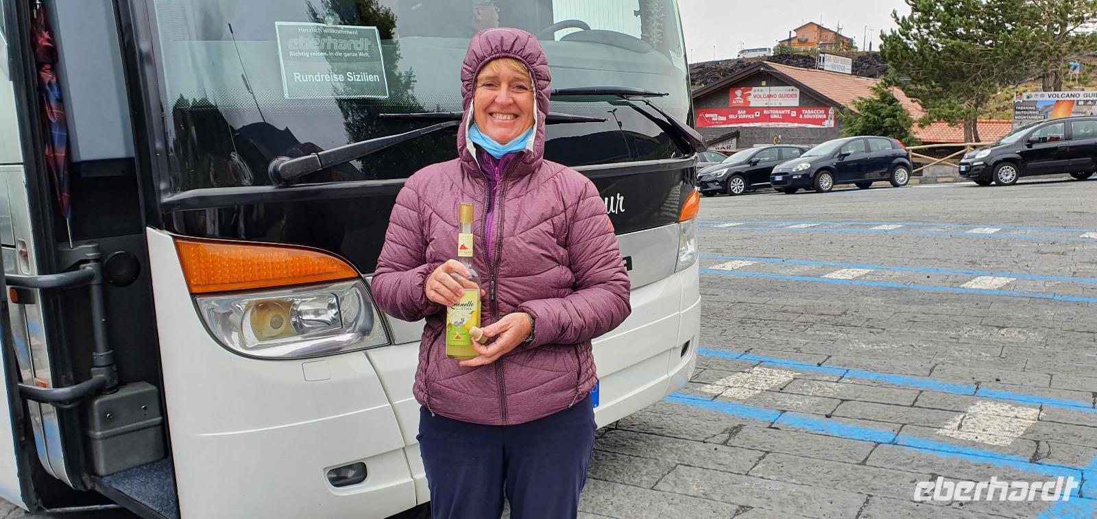 Entwarnung am Morgen: alle haben ihre Zimmer wiedergefunden und auch den Weg zum Restaurant zum Frühstück ;-)aber etwas abenteuerlich war es schon. Abenteuerlich geht es auch weiter: Wir brechen zeitig auf und starten zum Ätna. Unterwegs erzählt uns Renate vom Leben am und mit dem Vulkan. Angst- nein, Respekt-ja. Kein Sizilianer, so sagt sie, würde wegen des Ätna seine Heimatinsel verlassen. Wenn, dann würden wirtschaftliche Gründe der Auslöser sein, aber niemals der Ätna. Die erkaltete Lava wandelt den Boden hier nach Jahren in fruchtbaren, ertragreichen Boden um und so gedeihen Zitronen, Orangen, Nüsse und Esskastanien. Berühmt ist der Honig von den Zitronen- und Orangenblüten, in Zafferana wird dazu eigens einmal im Jahr ein Fest gefeiert. An der Talstation angekommen lösen wir unsere Tickets und mit der Seilbahn geht es hinauf auf 2200 Meter Höhe. Ein toller Blick auf die Silvestri-Krater von hier oben! Links und rechts sehen wir die Ski-Lifte, die im Winter hier gern genutzt werden. Schnee bleibt bis in den April liegen, so erzählt Renate und da ist der Ätna dann beliebtes Skigebiet. Allerdings ist die Auffahrt ziemlich beschwerlich: seit der Naturschutzpark Ätna eingerichtet wurde wird auch nicht mehr gestreut- da braucht es dann doch schon Ketten an den Rädern. Noch aber liegt kein Schnee- wie nah dran wir sind, sollten wir noch erleben. Mit den Unimogs geht es nämlich noch weiter nach oben- bis auf 3000 Meter! Francesco ist unser Guide. Er führt uns zu den Kratern des Ausbruchs von 2002. Es pfeift ganz ordentlich und mit gerade mal 6°C bewegen wir uns deutlich Richtung Frost. Das hält uns natürlich nicht davon ab, diese Krater zu erkunden. Ganz nah heran dürfen wir und können bis in die Tiefe schauen...was für ein Gefühl! Auch den zweiten Krater des Ausbruchs können wir ganz nah erleben, rot gefärbt vom Eisen oder gelb vom Schwefel- ein tolles Bild. Dazu der Ausblick Richtung Catania oder Bucht von Messina- umwerfend. Wir umrunden die Krater weiter und da macht sich nun auch die Höhe bemerkbar. Scheinbar leichte Anstiege erfodern doch ordentlich Puste. Zumal es an der Ostseite richtig stürmt und eisekalt ist. Da erscheint es wie ein Wunder, dass in nur wenigen Zentimetern Tiefe die Erde warm und angenehm ist. Der Hauptkrater des Ätna zeigt uns derweil, wie aktiv er ist: er schickt Wasserdampf-Wolken in den Himmel und an seinen Flanken sieht man weitere kleine Risse, aus denen Wasserdampf quillt. Alle sind froh, dieses Abenteuer miterlebt zu haben. Voller Respekt für den Berg und mit einem tollen Gefühl fahren wir mit den Unimogs wieder zur Seilbahnstation zurück. Hier ist noch etwas Zeit und dann geht es retour zur Talstation. Die Seilbahn bringt uns hinunter und hier wartet Rosario schon mit dem Bus auf uns. Bevor es aber losgeht gibt es noch eine kleine Überraschung: Ätna-Limoncello zum probieren. Wo, wenn nicht hier, sollten wir den probieren? Immerhin sollen am Ätna die leckersten Zitronen wachsen. Dann geht es zu unserer Mittagspause nach Giardini Naxos. Naxos war die erste griechische Siedlung auf Sizilien, schon mehr als 700 Jahre vor Christus gründeten sie hier diesen Ort. Es nieselte vor sich hin und so entschieden wir uns für Tische im Inneren. Spezialität des Hauses waren die gegrillten Schwertfischröllchen und hausgemachte Pasta, die mußten wir natürlich probieren. Wer den Regen nicht scheute genoss noch ein wenig das Wellenspiel, wir waren direkt am Hafen und die Wellen schlugen gegen die Felsen. Meditation pur. Doch schon hieß es Aufbruch: unser neues Ziel ist Taormina. Es soll die schönste Stadt Siziliens sein. Anmutig schmiegt sie sich an den Felsen und Rosario bringt uns mit dem Bus die Küstenstraße entlang hinauf. Am Busbahnhof steigen wir aus und spazieren gemeinsam zur Porta Messina. Hier beginnt der Corso Umberto- die Flaniermeile schlechthin bis zur Porta Catania. Wir biegen aber erst einmal zum griechisch-römischen Theater ab. Nach dem Covid-Prozedere mit Temperatur messen und Maske-tragen gingen wir mit Renate hinauf zu den Zuschauerrängen. Hier konnten wir die Ausmaße erst richtig erkennen. Trotzdem wurde es nicht künstlich vergrößert, vielmehr wurden die natürlichen Gegebenheiten ausgenutzt. Und so thront es hoch oben über der Stadt und gibt wundervolle Ausblicke auf die Buchten und bis nach Kalabrien frei- wenn es nicht gerade regnet (wie bei uns). So können wir den berühmten Blick auf den Ätna auch nur erahnen. So steigen wir wieder hinunter und werfen noch einen Blick auf die Filme, die anschaulich die Geschichte des Theaters wiedergeben. Nun ist Zeit, die Stadt individuell zu erkunden, zu bummeln, einen Caffee zu trinken oder das eine oder andere Souvenir zu erstehen. Viel zu schnell ist unsere Zeit hier vorbei und wir treffen uns am Bus wieder. Rosario bringt uns zu unserem Hotel und wir probieren gleich die Fahrstühle nach oben, die wir morgen früh auch nutzen wollen. So ein Schräg-Fahrstuhl ist schon etwas ganz besonderes. Und einen Hotelkomplex über mehrere Ebenen und Etagen haben wir bisher auch noch nicht gesehen. Wohlbehalten kommen alle in ihren Zimmern an und ein gemeinsames Abendessen beschließt den Tag für heute.