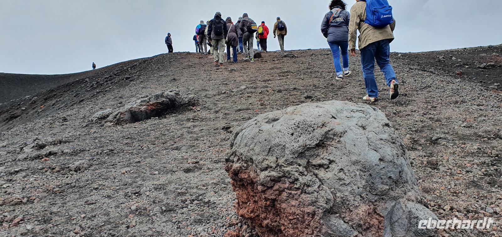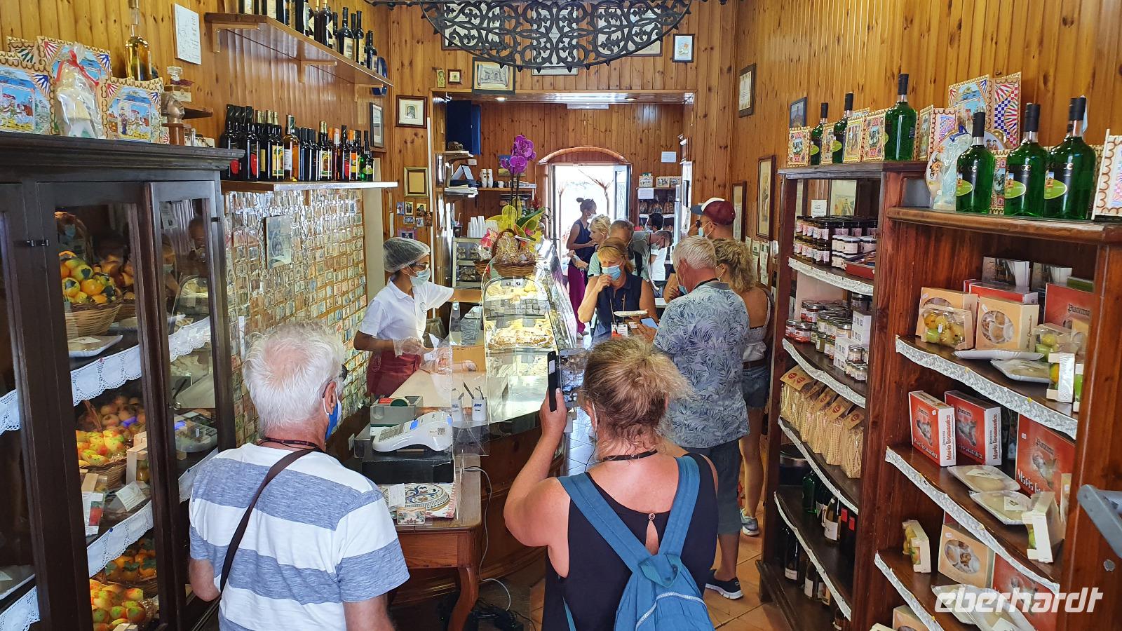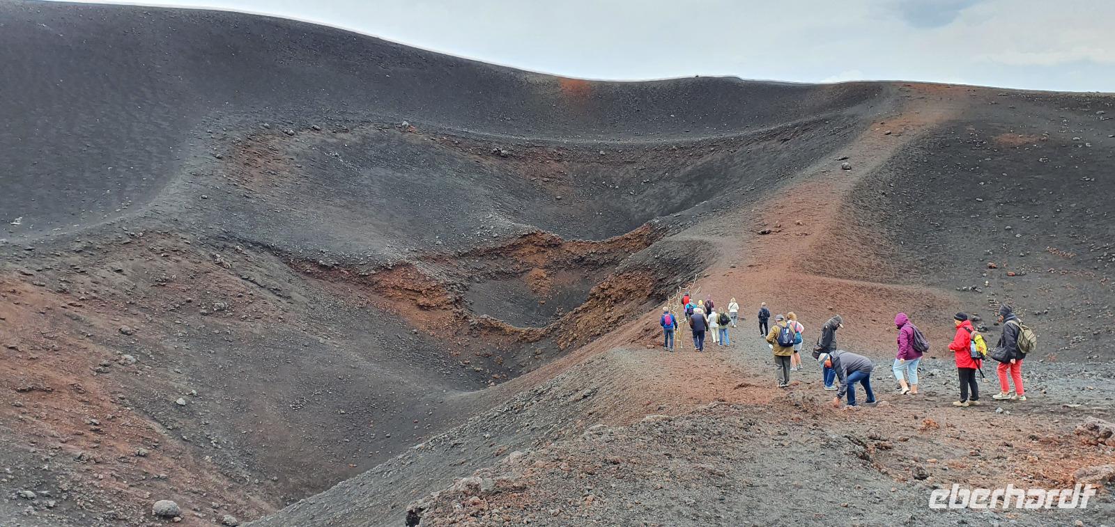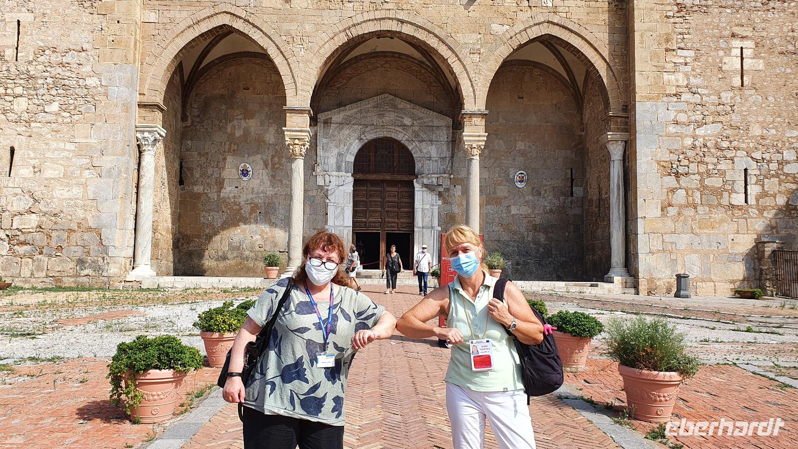 Entwarnung am Morgen: alle haben ihre Zimmer wiedergefunden und auch den Weg zum Restaurant zum Frühstück ;-)aber etwas abenteuerlich war es schon. Abenteuerlich geht es auch weiter: Wir brechen zeitig auf und starten zum Ätna. Unterwegs erzählt uns Renate vom Leben am und mit dem Vulkan. Angst- nein, Respekt-ja. Kein Sizilianer, so sagt sie, würde wegen des Ätna seine Heimatinsel verlassen. Wenn, dann würden wirtschaftliche Gründe der Auslöser sein, aber niemals der Ätna. Die erkaltete Lava wandelt den Boden hier nach Jahren in fruchtbaren, ertragreichen Boden um und so gedeihen Zitronen, Orangen, Nüsse und Esskastanien. Berühmt ist der Honig von den Zitronen- und Orangenblüten, in Zafferana wird dazu eigens einmal im Jahr ein Fest gefeiert. An der Talstation angekommen lösen wir unsere Tickets und mit der Seilbahn geht es hinauf auf 2200 Meter Höhe. Ein toller Blick auf die Silvestri-Krater von hier oben! Links und rechts sehen wir die Ski-Lifte, die im Winter hier gern genutzt werden. Schnee bleibt bis in den April liegen, so erzählt Renate und da ist der Ätna dann beliebtes Skigebiet. Allerdings ist die Auffahrt ziemlich beschwerlich: seit der Naturschutzpark Ätna eingerichtet wurde wird auch nicht mehr gestreut- da braucht es dann doch schon Ketten an den Rädern. Noch aber liegt kein Schnee- wie nah dran wir sind, sollten wir noch erleben. Mit den Unimogs geht es nämlich noch weiter nach oben- bis auf 3000 Meter! Francesco ist unser Guide. Er führt uns zu den Kratern des Ausbruchs von 2002. Es pfeift ganz ordentlich und mit gerade mal 6°C bewegen wir uns deutlich Richtung Frost. Das hält uns natürlich nicht davon ab, diese Krater zu erkunden. Ganz nah heran dürfen wir und können bis in die Tiefe schauen...was für ein Gefühl! Auch den zweiten Krater des Ausbruchs können wir ganz nah erleben, rot gefärbt vom Eisen oder gelb vom Schwefel- ein tolles Bild. Dazu der Ausblick Richtung Catania oder Bucht von Messina- umwerfend. Wir umrunden die Krater weiter und da macht sich nun auch die Höhe bemerkbar. Scheinbar leichte Anstiege erfodern doch ordentlich Puste. Zumal es an der Ostseite richtig stürmt und eisekalt ist. Da erscheint es wie ein Wunder, dass in nur wenigen Zentimetern Tiefe die Erde warm und angenehm ist. Der Hauptkrater des Ätna zeigt uns derweil, wie aktiv er ist: er schickt Wasserdampf-Wolken in den Himmel und an seinen Flanken sieht man weitere kleine Risse, aus denen Wasserdampf quillt. Alle sind froh, dieses Abenteuer miterlebt zu haben. Voller Respekt für den Berg und mit einem tollen Gefühl fahren wir mit den Unimogs wieder zur Seilbahnstation zurück. Hier ist noch etwas Zeit und dann geht es retour zur Talstation. Die Seilbahn bringt uns hinunter und hier wartet Rosario schon mit dem Bus auf uns. Bevor es aber losgeht gibt es noch eine kleine Überraschung: Ätna-Limoncello zum probieren. Wo, wenn nicht hier, sollten wir den probieren? Immerhin sollen am Ätna die leckersten Zitronen wachsen. Dann geht es zu unserer Mittagspause nach Giardini Naxos. Naxos war die erste griechische Siedlung auf Sizilien, schon mehr als 700 Jahre vor Christus gründeten sie hier diesen Ort. Es nieselte vor sich hin und so entschieden wir uns für Tische im Inneren. Spezialität des Hauses waren die gegrillten Schwertfischröllchen und hausgemachte Pasta, die mußten wir natürlich probieren. Wer den Regen nicht scheute genoss noch ein wenig das Wellenspiel, wir waren direkt am Hafen und die Wellen schlugen gegen die Felsen. Meditation pur. Doch schon hieß es Aufbruch: unser neues Ziel ist Taormina. Es soll die schönste Stadt Siziliens sein. Anmutig schmiegt sie sich an den Felsen und Rosario bringt uns mit dem Bus die Küstenstraße entlang hinauf. Am Busbahnhof steigen wir aus und spazieren gemeinsam zur Porta Messina. Hier beginnt der Corso Umberto- die Flaniermeile schlechthin bis zur Porta Catania. Wir biegen aber erst einmal zum griechisch-römischen Theater ab. Nach dem Covid-Prozedere mit Temperatur messen und Maske-tragen gingen wir mit Renate hinauf zu den Zuschauerrängen. Hier konnten wir die Ausmaße erst richtig erkennen. Trotzdem wurde es nicht künstlich vergrößert, vielmehr wurden die natürlichen Gegebenheiten ausgenutzt. Und so thront es hoch oben über der Stadt und gibt wundervolle Ausblicke auf die Buchten und bis nach Kalabrien frei- wenn es nicht gerade regnet (wie bei uns). So können wir den berühmten Blick auf den Ätna auch nur erahnen. So steigen wir wieder hinunter und werfen noch einen Blick auf die Filme, die anschaulich die Geschichte des Theaters wiedergeben. Nun ist Zeit, die Stadt individuell zu erkunden, zu bummeln, einen Caffee zu trinken oder das eine oder andere Souvenir zu erstehen. Viel zu schnell ist unsere Zeit hier vorbei und wir treffen uns am Bus wieder. Rosario bringt uns zu unserem Hotel und wir probieren gleich die Fahrstühle nach oben, die wir morgen früh auch nutzen wollen. So ein Schräg-Fahrstuhl ist schon etwas ganz besonderes. Und einen Hotelkomplex über mehrere Ebenen und Etagen haben wir bisher auch noch nicht gesehen. Wohlbehalten kommen alle in ihren Zimmern an und ein gemeinsames Abendessen beschließt den Tag für heute.