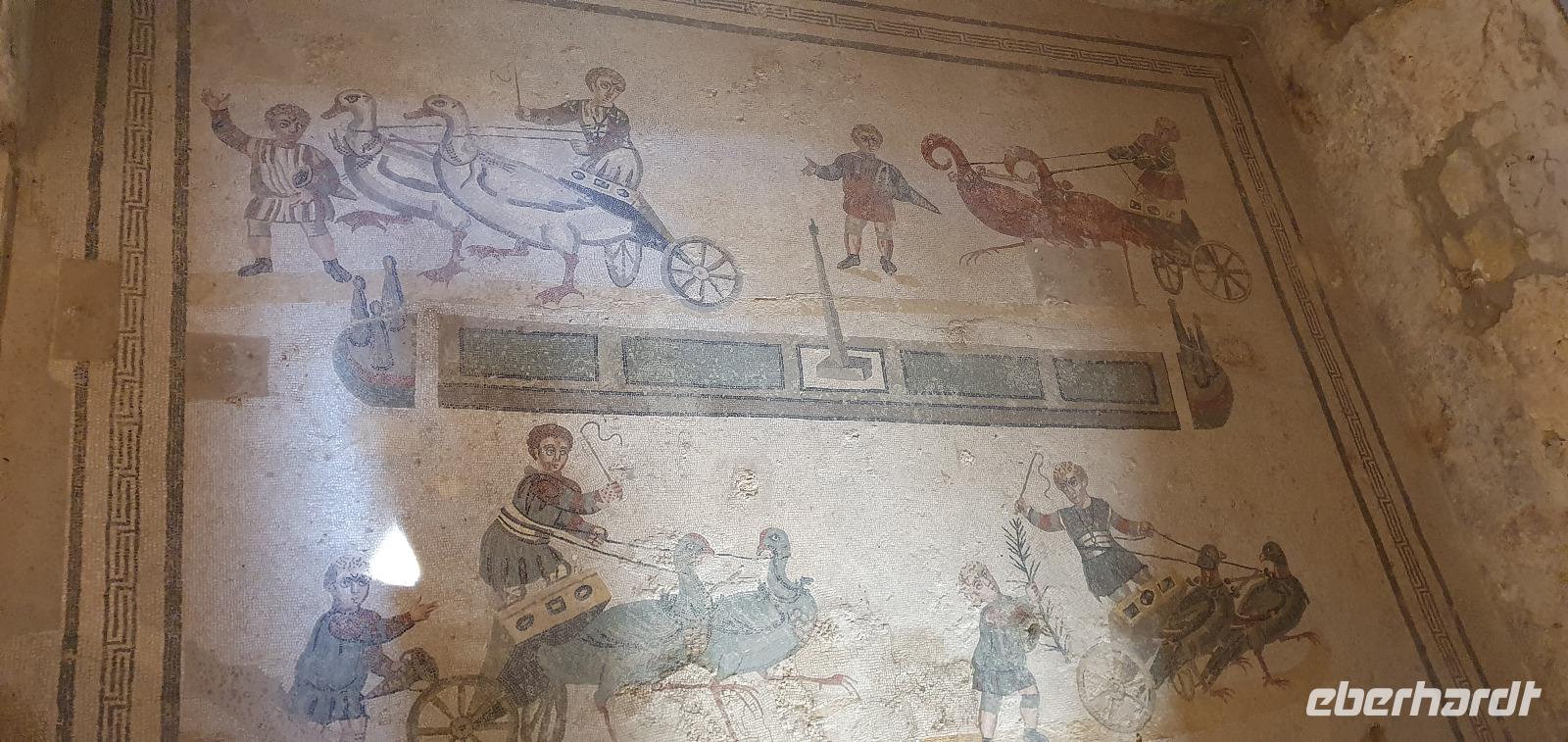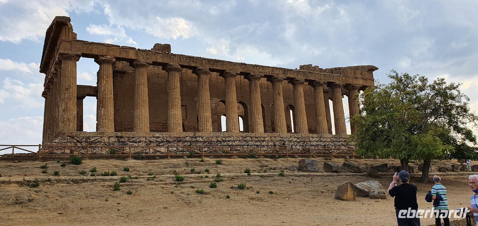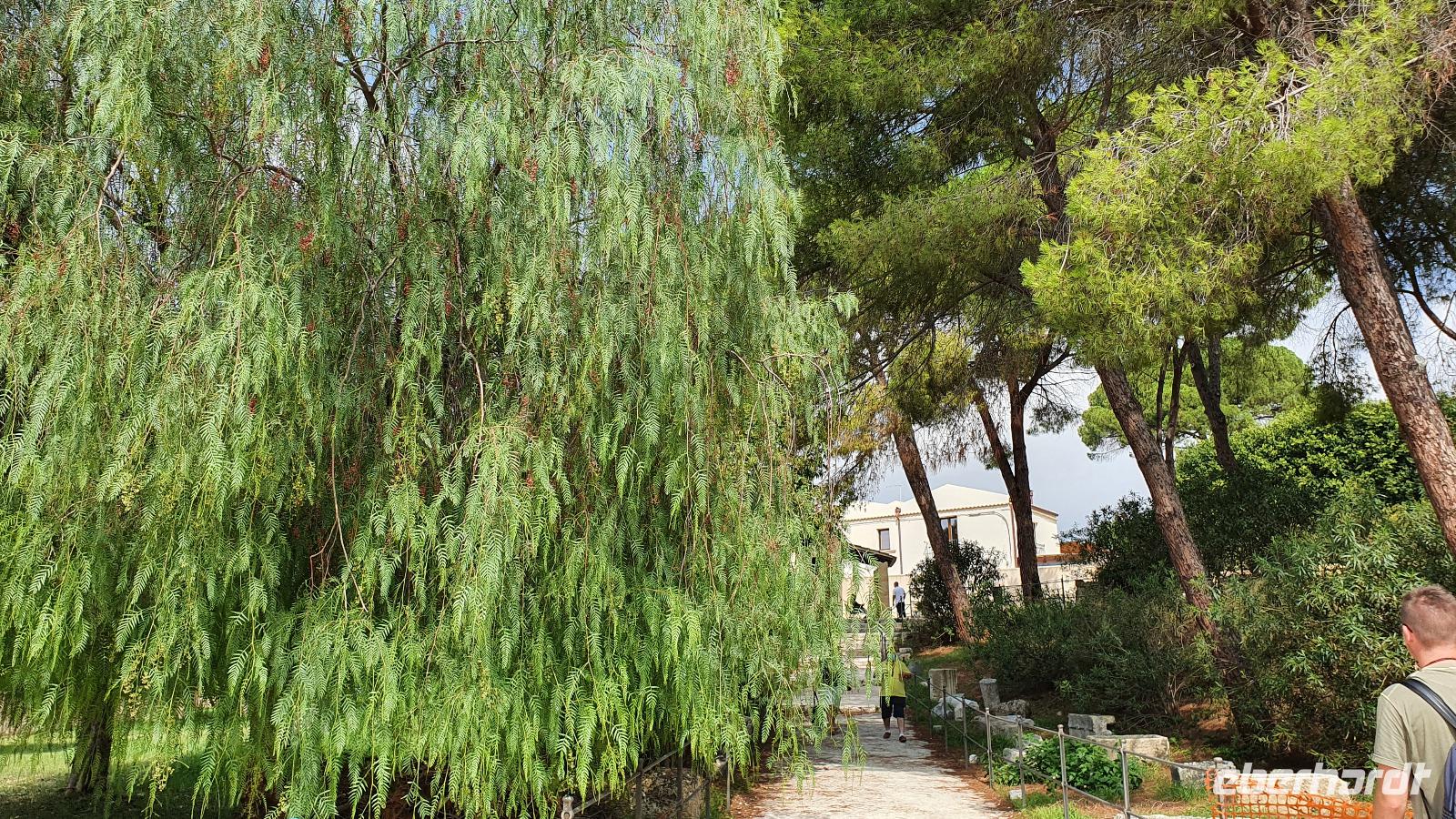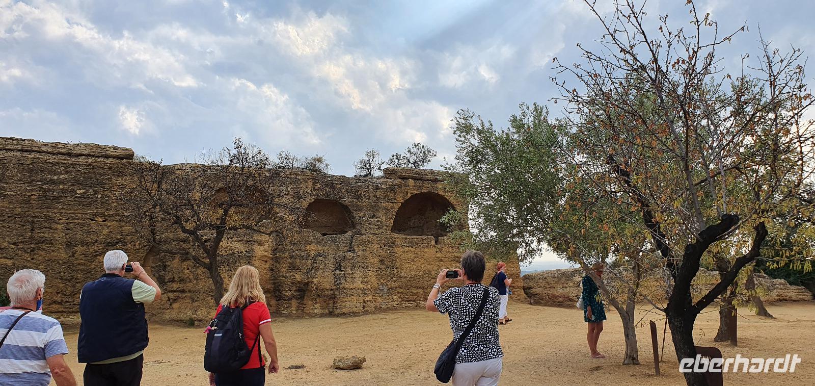 Zeitig geht es heute morgen los. Entsprechend ruhig ist es noch im Hotel. Wie sind (wieder) die ersten am Frühstücks-Buffett und wir können danach ungestört die Fahrstühle nach unten nehmen. Hier wartet Rosario mit dem Bus auf uns und auch der Kofferservice funktioniert reibungslos. Unsere Rundreise kann weitergehen. Sie führt uns heute ins Landesinnere nach Piazza Armerina. Hier wurden 1926 bei Bauarbeiten Mosaiken gefunden, die alles bisherige übertrafen. Nach und nach wurde eine römische Villa freigelegt, die nach einem Erdrutsch begraben worden war. Die Mosaiken wurden dadurch quasi konserviert- was für ein Glück für uns heute. Mehr als 3000 qm Fussbodenmosaik kann man jetzt bewundern. Die UNESCO hat die Villa Romana in ihr Weltkulturerbe aufgenommen und so werden große Anstrengungen unternommen, die Mosaiken zu schützen. Auf eigens konstruierten Plattformen können wir die Mosaiken in den einzelnen Räumen und Hallen anschauen. Renate erläutert uns die einzelnen Szenen, Besonderheiten wie den Einsatz von Porphyrsteinchen, die wunderbar dunkelrot leuchten. Jedes Zimmer hat seine eigene Charakteristik, da sind die Gästezimmer mit Ornamenten, ein anderes mit der sogenannten "Kleinen Jagd"- Darstellungen von Jagdszenen auf Tiere, die es einmal auf Sizilien gab wie Wölfe oder Wildschweine. Und dann ist da die "Große Jagd"- mehr als 70 Meter Mosaike zeigen das Fangen und Verladen wilder Tiere Afrikas. Absolut beeindruckend. Und so viel mehr gibt es zu entdecken: die berühmten Bikini-Mädchen in ihrem Fünfkampf oder die Kinderzimmer mit den detailreichen Mosaiken- deutlich zu sehen, dass Mathe auch früher schon keinen Spass gemacht hat. Oder die Darstellung des Polyphem, der von Odysseus überlistet wird, die Herrenzimmer...Ein Rundgang draußen schließt unseren Besuch ab, ein Erdbeerbaum wird bestaunt und dann gehen wir durch die Souvenirstände zurück zum Bus. Er bringt uns in die Stadt und Rosario fährt auch durch die engsten Gassen souverän durch. Bei "da Toto" genießen wir ein leckeres Mittagessen bevor es zum nächsten Highlight geht: dem Tal der Tempel in Agrigent. Wir genießen die vorbeiziehende Landschaft. Getreidefelder haben nun die Zitrusplantagen abgelöst. Wir lernen ein neues Gesicht Siziliens kennen. Dann können wir schon von weitem hoch oben die Tempel sehen. Sie schauen aufs Meer und scheinen zu sagen- wage nicht, in feindlicher Absicht zu kommen- sieh, wozu unsere Erbauer fähig sind! Rosario fährt uns hinauf, durch eine Allee aus Pinienbäumen und dann können wir bereits den Tempel der Hera ausmachen. Bevor wir diesen aber besichtigen können heißt es: Sicherheitskontrolle wie am Flughafen. Die passieren wir problemlos, lösen unsere Tickets und dann kann es losgehen. Auf unserem Spaziergang zum Tempel werden wir von Hera standesgemäß begrüßt: mit einem deutlichen Grollen grüßt ein vorbeiziehendes Gewitter. Wir müssen schmunzeln und einige hegen den Verdacht, dass Zeus wohl wieder einmal untreu geworden war. Renate erzählt uns zur Geschichte und Architektur des Tempels bevor sie uns den ältesten Olivenbaum Siziliens zeigt. Manche sagen, er sei mehr als 2000 Jahre alt, andere wieder, es seien nicht mehr als 900- was solls, es ist ein Prachtexemplar. Dann spazieren wir weiter, eigentlich ist es ja kein Tal sondern eine Hochebene, die wir hinablaufen. An der ehemaligen Stadtmauer geht es ein Stück entlang, diese wurde aus dem vorhandenen Felsen gehauen und ergänzt. Später wurde sie als Bestattungsplatz genutzt, Höhlen erinnern daran. Der nächste, der Concordia-Tempel, ist der am besten erhaltene in ganz Sizilien. Im 6. Jahrhundert wurde er in eine Kirche umgewandelt und teilweise zugemauert, erst im 18. Jahrhundert wurde er in seinen ursprünglichen Zustand zurück versetzt und war dadurch quasi konserviert. Vor dem Tempel liegt eine riesige Bronze-Figur: Ikarus mit zerstörten Flügeln. Ein polnischer Bildhauer hat ihn erschaffen und schließlich dem Tal der Tempel geschenkt. Ein überaus beliebtes Fotomotiv! Im angrenzenden Olivenhain begegnen wir ungewöhnlichen Ziegen. Mit ihren gedrehten Hörnern sind sie eine eigenständige Rasse, so erklärt es uns Renate. Dann sehen wir tiefen Fuhrrinnen im Fels- hier haben sich im Laufe der Zeit die Wagenräder eingegraben, die die Wagen mit den Steinen transportierten. So tiefe Furchen- wieviele Tonnen müssen da wohl von den Stieren gezogen worden sein? Wir schauen uns den Herakles-Tempel an und auch den Tempel des Zeus, ein riesiger Telamon liegt davor (als Kopie, das Original ist im Museum), diese Figuren trugen das Dachgebälk und waren fast 8 Meter groß. Es soll der größte aller Tempel hier gewesen sein. Dann aber beenden wir unseren Besuch hier. Es ist schon später Nachmittag und wir müssen noch eine ordentliche Strecke zu unserem Agriturismo fahren, in dem wir die nächsten beiden Nächte verbringen werden. Es geht am Meer entlang und mit der untergehenden Sonne erreichen wir das Case di Latomie. Michele begrüßt uns feundlich, wir bekommen unsere Zimmerschlüssel und treffen uns dann zum Abendessen wieder. Hier können wir als erstes das preisgekrönte Olivenöl des Agriturismo probieren, dem folgen leckere Antipasti, Pasta und schließlich Schwertfisch mit Salat. Ein toller Abschluss eines tollen Tages.
