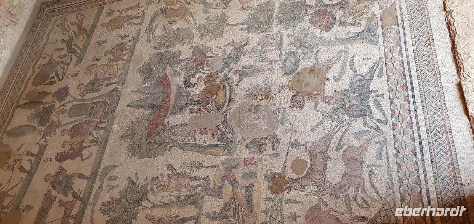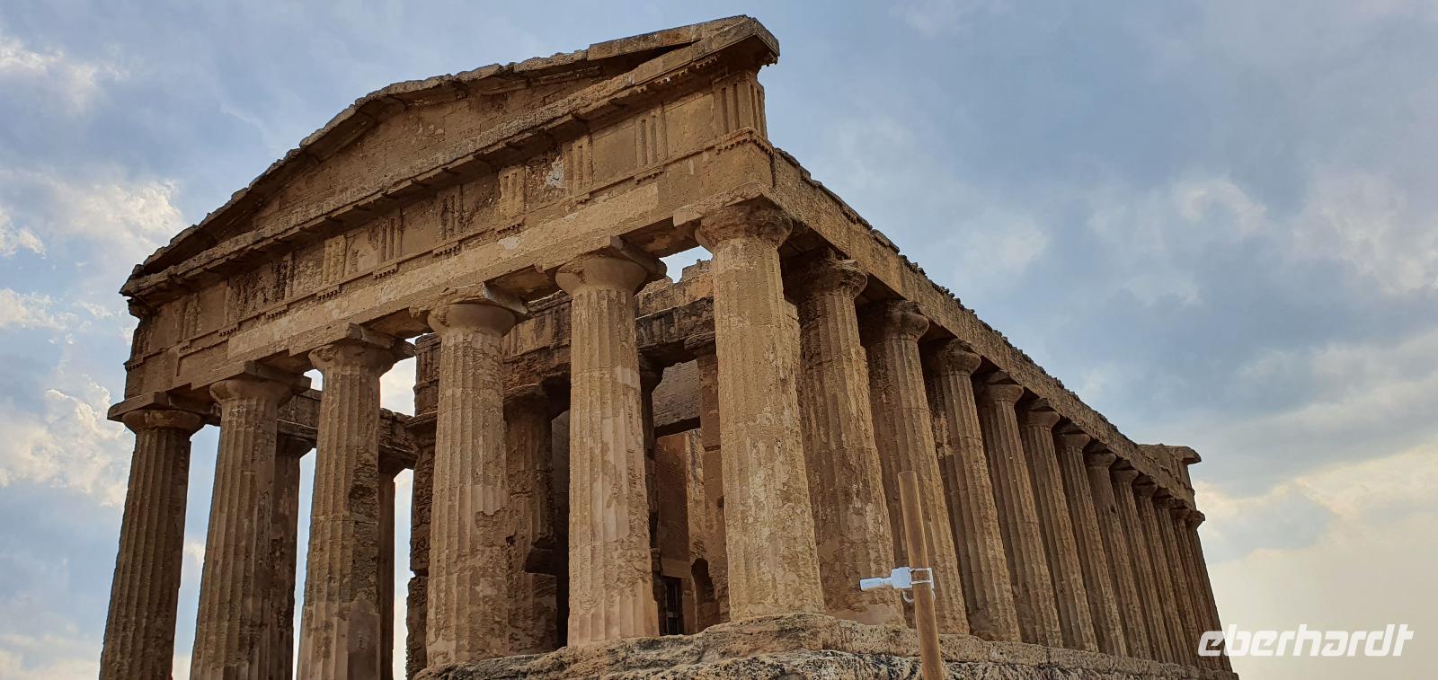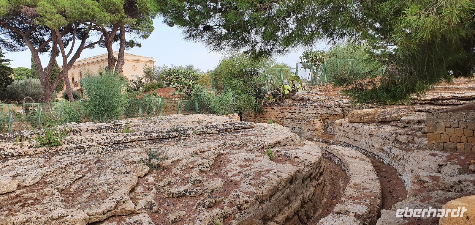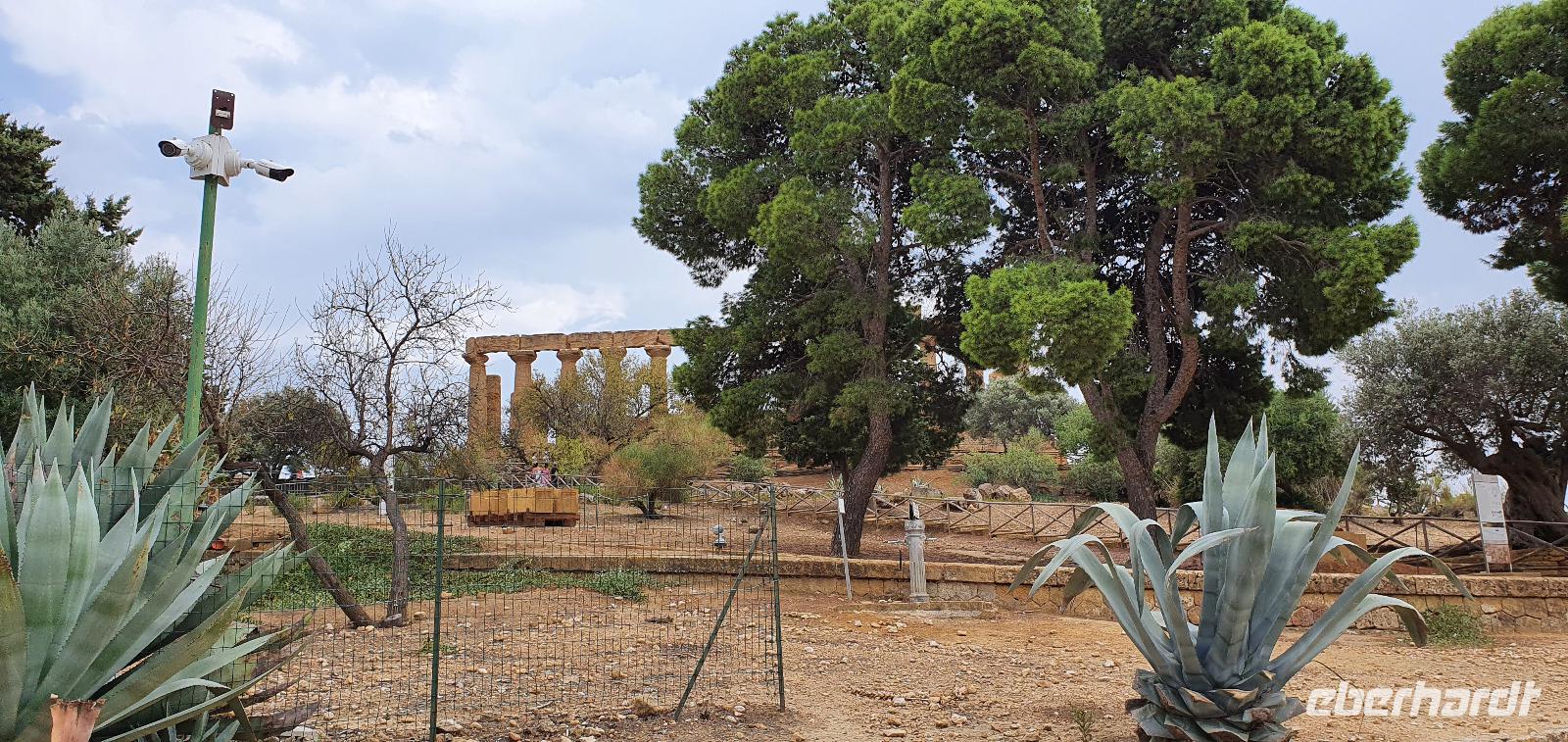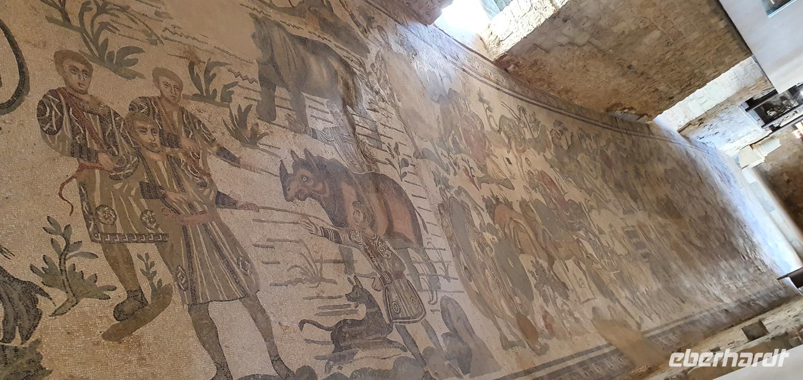 Zeitig geht es heute morgen los. Entsprechend ruhig ist es noch im Hotel. Wie sind (wieder) die ersten am Frühstücks-Buffett und wir können danach ungestört die Fahrstühle nach unten nehmen. Hier wartet Rosario mit dem Bus auf uns und auch der Kofferservice funktioniert reibungslos. Unsere Rundreise kann weitergehen. Sie führt uns heute ins Landesinnere nach Piazza Armerina. Hier wurden 1926 bei Bauarbeiten Mosaiken gefunden, die alles bisherige übertrafen. Nach und nach wurde eine römische Villa freigelegt, die nach einem Erdrutsch begraben worden war. Die Mosaiken wurden dadurch quasi konserviert- was für ein Glück für uns heute. Mehr als 3000 qm Fussbodenmosaik kann man jetzt bewundern. Die UNESCO hat die Villa Romana in ihr Weltkulturerbe aufgenommen und so werden große Anstrengungen unternommen, die Mosaiken zu schützen. Auf eigens konstruierten Plattformen können wir die Mosaiken in den einzelnen Räumen und Hallen anschauen. Renate erläutert uns die einzelnen Szenen, Besonderheiten wie den Einsatz von Porphyrsteinchen, die wunderbar dunkelrot leuchten. Jedes Zimmer hat seine eigene Charakteristik, da sind die Gästezimmer mit Ornamenten, ein anderes mit der sogenannten "Kleinen Jagd"- Darstellungen von Jagdszenen auf Tiere, die es einmal auf Sizilien gab wie Wölfe oder Wildschweine. Und dann ist da die "Große Jagd"- mehr als 70 Meter Mosaike zeigen das Fangen und Verladen wilder Tiere Afrikas. Absolut beeindruckend. Und so viel mehr gibt es zu entdecken: die berühmten Bikini-Mädchen in ihrem Fünfkampf oder die Kinderzimmer mit den detailreichen Mosaiken- deutlich zu sehen, dass Mathe auch früher schon keinen Spass gemacht hat. Oder die Darstellung des Polyphem, der von Odysseus überlistet wird, die Herrenzimmer...Ein Rundgang draußen schließt unseren Besuch ab, ein Erdbeerbaum wird bestaunt und dann gehen wir durch die Souvenirstände zurück zum Bus. Er bringt uns in die Stadt und Rosario fährt auch durch die engsten Gassen souverän durch. Bei "da Toto" genießen wir ein leckeres Mittagessen bevor es zum nächsten Highlight geht: dem Tal der Tempel in Agrigent. Wir genießen die vorbeiziehende Landschaft. Getreidefelder haben nun die Zitrusplantagen abgelöst. Wir lernen ein neues Gesicht Siziliens kennen. Dann können wir schon von weitem hoch oben die Tempel sehen. Sie schauen aufs Meer und scheinen zu sagen- wage nicht, in feindlicher Absicht zu kommen- sieh, wozu unsere Erbauer fähig sind! Rosario fährt uns hinauf, durch eine Allee aus Pinienbäumen und dann können wir bereits den Tempel der Hera ausmachen. Bevor wir diesen aber besichtigen können heißt es: Sicherheitskontrolle wie am Flughafen. Die passieren wir problemlos, lösen unsere Tickets und dann kann es losgehen. Auf unserem Spaziergang zum Tempel werden wir von Hera standesgemäß begrüßt: mit einem deutlichen Grollen grüßt ein vorbeiziehendes Gewitter. Wir müssen schmunzeln und einige hegen den Verdacht, dass Zeus wohl wieder einmal untreu geworden war. Renate erzählt uns zur Geschichte und Architektur des Tempels bevor sie uns den ältesten Olivenbaum Siziliens zeigt. Manche sagen, er sei mehr als 2000 Jahre alt, andere wieder, es seien nicht mehr als 900- was solls, es ist ein Prachtexemplar. Dann spazieren wir weiter, eigentlich ist es ja kein Tal sondern eine Hochebene, die wir hinablaufen. An der ehemaligen Stadtmauer geht es ein Stück entlang, diese wurde aus dem vorhandenen Felsen gehauen und ergänzt. Später wurde sie als Bestattungsplatz genutzt, Höhlen erinnern daran. Der nächste, der Concordia-Tempel, ist der am besten erhaltene in ganz Sizilien. Im 6. Jahrhundert wurde er in eine Kirche umgewandelt und teilweise zugemauert, erst im 18. Jahrhundert wurde er in seinen ursprünglichen Zustand zurück versetzt und war dadurch quasi konserviert. Vor dem Tempel liegt eine riesige Bronze-Figur: Ikarus mit zerstörten Flügeln. Ein polnischer Bildhauer hat ihn erschaffen und schließlich dem Tal der Tempel geschenkt. Ein überaus beliebtes Fotomotiv! Im angrenzenden Olivenhain begegnen wir ungewöhnlichen Ziegen. Mit ihren gedrehten Hörnern sind sie eine eigenständige Rasse, so erklärt es uns Renate. Dann sehen wir tiefen Fuhrrinnen im Fels- hier haben sich im Laufe der Zeit die Wagenräder eingegraben, die die Wagen mit den Steinen transportierten. So tiefe Furchen- wieviele Tonnen müssen da wohl von den Stieren gezogen worden sein? Wir schauen uns den Herakles-Tempel an und auch den Tempel des Zeus, ein riesiger Telamon liegt davor (als Kopie, das Original ist im Museum), diese Figuren trugen das Dachgebälk und waren fast 8 Meter groß. Es soll der größte aller Tempel hier gewesen sein. Dann aber beenden wir unseren Besuch hier. Es ist schon später Nachmittag und wir müssen noch eine ordentliche Strecke zu unserem Agriturismo fahren, in dem wir die nächsten beiden Nächte verbringen werden. Es geht am Meer entlang und mit der untergehenden Sonne erreichen wir das Case di Latomie. Michele begrüßt uns feundlich, wir bekommen unsere Zimmerschlüssel und treffen uns dann zum Abendessen wieder. Hier können wir als erstes das preisgekrönte Olivenöl des Agriturismo probieren, dem folgen leckere Antipasti, Pasta und schließlich Schwertfisch mit Salat. Ein toller Abschluss eines tollen Tages.