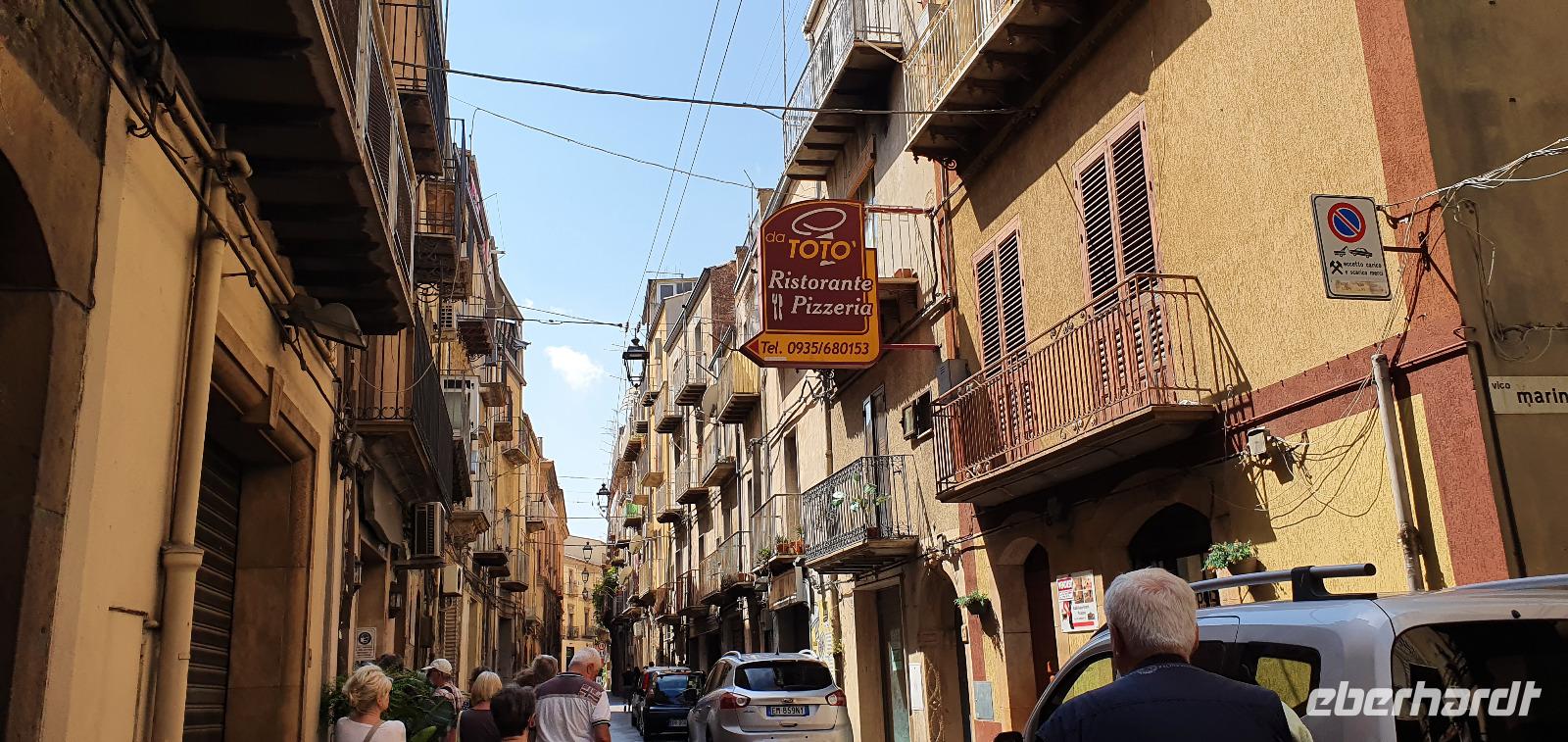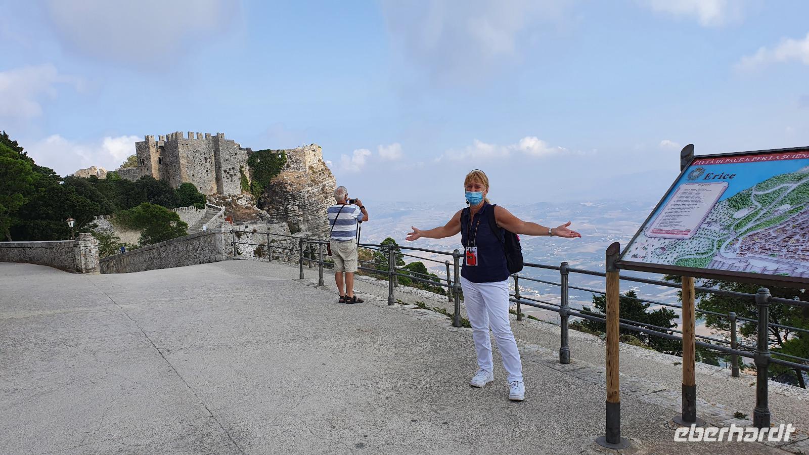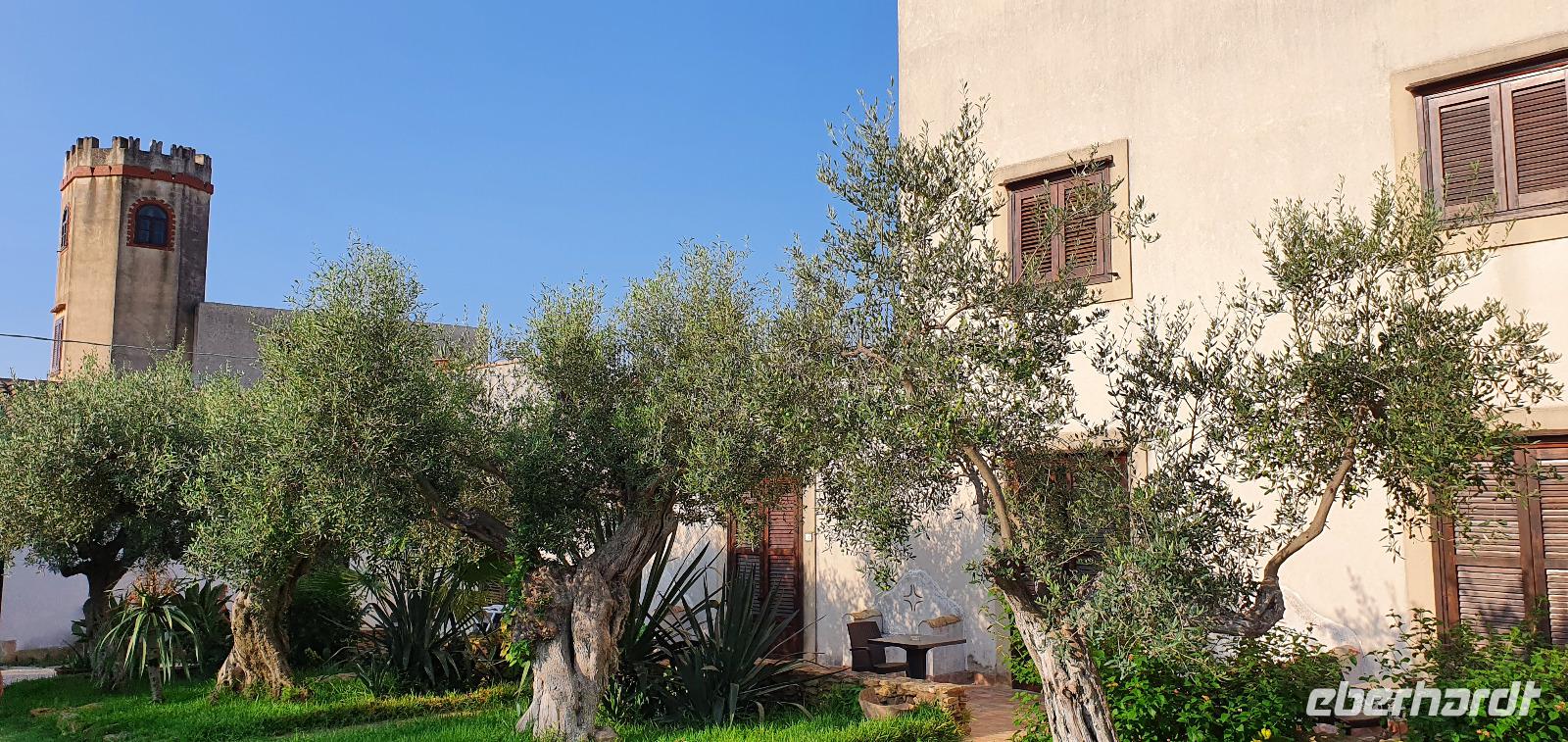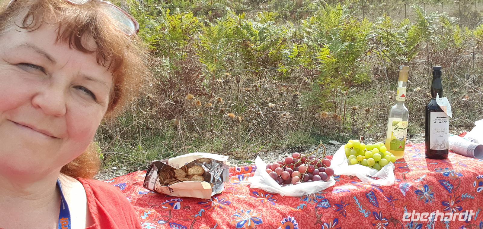 Unser Tag beginnt mit einem leckeren Frühstück. Für sizilianische Verhältnisse ausgesprochen üppig. Renate hatte uns erzählt, dass sie eigentlich nur eine Brioche essen und eventuell eine Granita dazu (im Sommer)- das hätte wohl den meisten von uns nicht wirklich gereicht ;-) Gestärkt folgen wir dann dem Hausherren auf einen kleinen Rundgang. Ein ehemaliger Steinbruch (=Latomie) war es hier, er verleiht den Oliven einzigartigen Geschmack. Heute lädt ein Pool zum Entspannen und Genießen ein und ein uralter Olivenbaum - 1200 Jahre alt!- schaut zu. Was der wohl alles schon gesehen hat? Daneben ein Bananenbaum- mit Früchten und Blüten. Umwerfend schön. Dann machen wir uns auf den Weg, Selinunte liegt quasi gleich um die Ecke und wir sind kaum mehr als 20 Minuten unterwegs. Hier besuchen wir den Archäologischen Park Selinunte. Nach dem obligatorischen Prozedere mit Maske, Fieber messen und eigens ausgewiesenen Wegen können wir dann zum Tempel E starten. Da niemand eindeutig sagen kann, wem die Tempel zuzuschreiben waren, haben sie eben Buchstaben bekommen. Die Tempelanlagen hier wurden einst von Erdbeben und Tsunami verwüstet, ein Wiederaufbau undenkbar. Nur der Tempel E kippte so zur Seite um, dass er quasi wieder aufgerichtet wurde. So können wir ihn heute besichtigen, auch die Heiligtümer im Inneren sind noch nachvollziehbar. Besonders angetan hat es uns aber die tolle Aussicht zur Akropolis und zum Meer. Was für ein Blick! Schön, dass wir den Tempel betreten und so den tollen Ausblick genießen konnten. Unser Spaziergang führt uns zu Überresten weiterer Tempel- F und G. Man vermutet, dass Tempel G Zeus geweiht gewesen sei, er soll mehr als 100 Meter lang gewesen sein und wurde vermutlich nie fertiggestellt. Riesige Kapitelle und Säulen liegen heute verstreut als hätte ein Riese mit seinem Bauklötzen gewürfelt. Wir umrunden das Areal und genießen die Sonne, strahlendblauen Himmel, die einzigartige Atmosphäre und das Meer. Dann heißt es weiterfahren. Jenseits der Autobahnen fährt uns Rosario nach Marsala zu den Salinen hier. Unterwegs bekommen wir so einen guten Eindruck vom tatsächlichen Leben hier. Wir passieren den Hafen von Marsala und sind schon an den Salzgewinnungsbecken angekommen. Ein Fotostopp darf natürlich nicht fehlen, dann geht es zu unserem nächsten Ziel: die Salinen von Paceco. Hier haben wir auch unsere Mittagspause und wieder genießen wir landestypische Antipasti, Pasta und Fisch. Dazu ein Glas Wein- so läßt es sich leben. Wer wollte versorgte sich noch mit einem groben oder feinen Salz von hier und dann ging unsere Fahrt auch schon weiter. Unterwegs sehen wir Flamingos in den Salzbecken stehen - was für ein Glück. Dann geht es in die Höhe- genauer auf 760 Meter hinauf auf den Monte Giuliano. Hier oben thront Erice. Souverän fährt Rosario die Serpentinen hinauf und Renate erzählt uns zur Geschichte der Stadt. Ein Großteil der Einwohner wohnt heute am Fusse des Berges, hier entstand Valderice. Nur wenige Hundert wohnen noch ständig oben in Erice. Wir betreten die Stadt durch das Stadttor, die Porta Trapani, und fühlen uns tatsächlich ins Mittelalter versetzt, sehen schmale Gassen, das Starßenpflaster ist in Ornamenten gelegt, und natürlich steht die Hauptkirche gleich am Ortseingang. Wir statten der Kirche der Mutter Gottes natürlich einen Besuch ab. Sie ist die einzig gotische Kirche von einstmals bis zu 60 Kirchen im Ort. Besonders besticht die weiße Decke mit manuelinischen Elementen. Unser Spaziergang führt uns durch die Gassen zur wohl berühmtesten Pasticceria der Stadt- zu Maria Grammatico und ihrem köstlichen Mandelgebäck. Das konnte, wer wollte, probieren bevor es weiterging hinauf zur Burg. Hier befand sich vorher der Venustempel, der Liebesgöttin huldigte man früher auch in Form der Tempelprostitution. Wir jedenfalls genießen den Ausblick von hier oben und als kleine Überraschung einen Marsala- ein Wein aus der Region. Ein echtes WOW von Eberhardt Travel eben. Individuell erkundeten wir nun die Stadt bevor es zurück ging zum Bus. Wieder genossen wir bei der Rückfahrt die spektakulären Aussichten über die Bucht bis zum Monte Cofano. Angekommen in unserem Agriturismo bei Castelvetrano blieb noch etwas Zeit bevor wir uns unser Abendessen schmecken ließen. Neben lecker Vorspeisen und Pasta konnten wir heute Involtinis probieren, gefüllte Rindfleischröllchen.