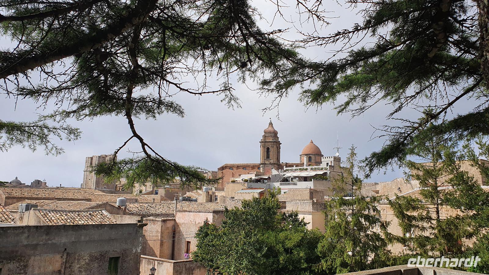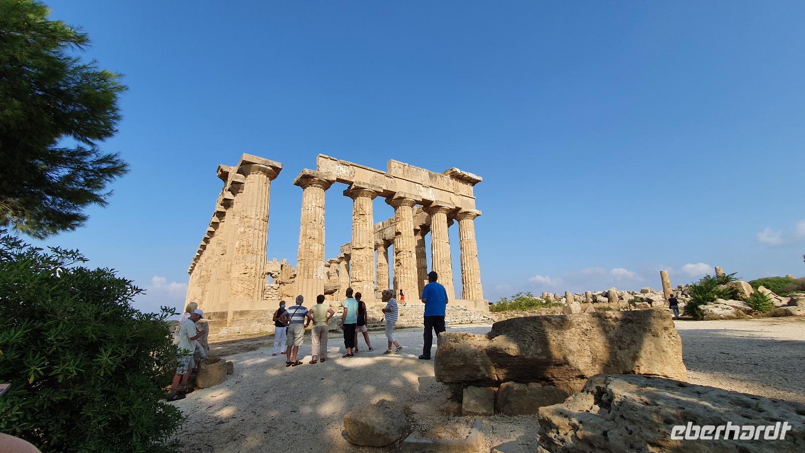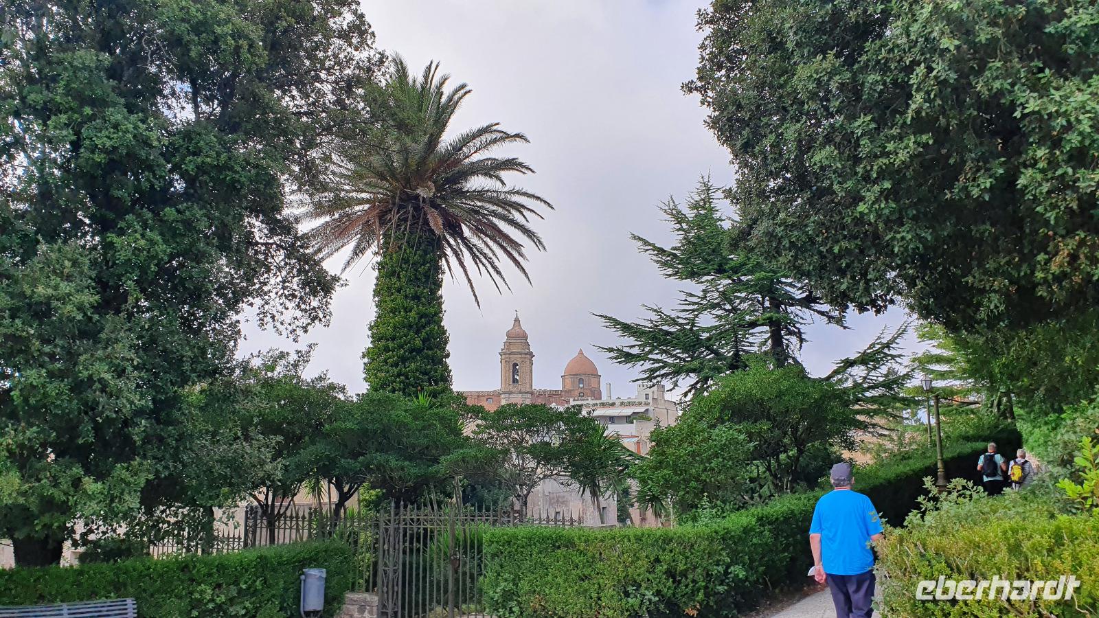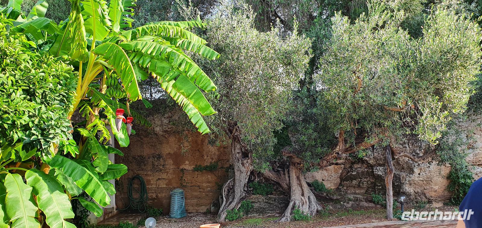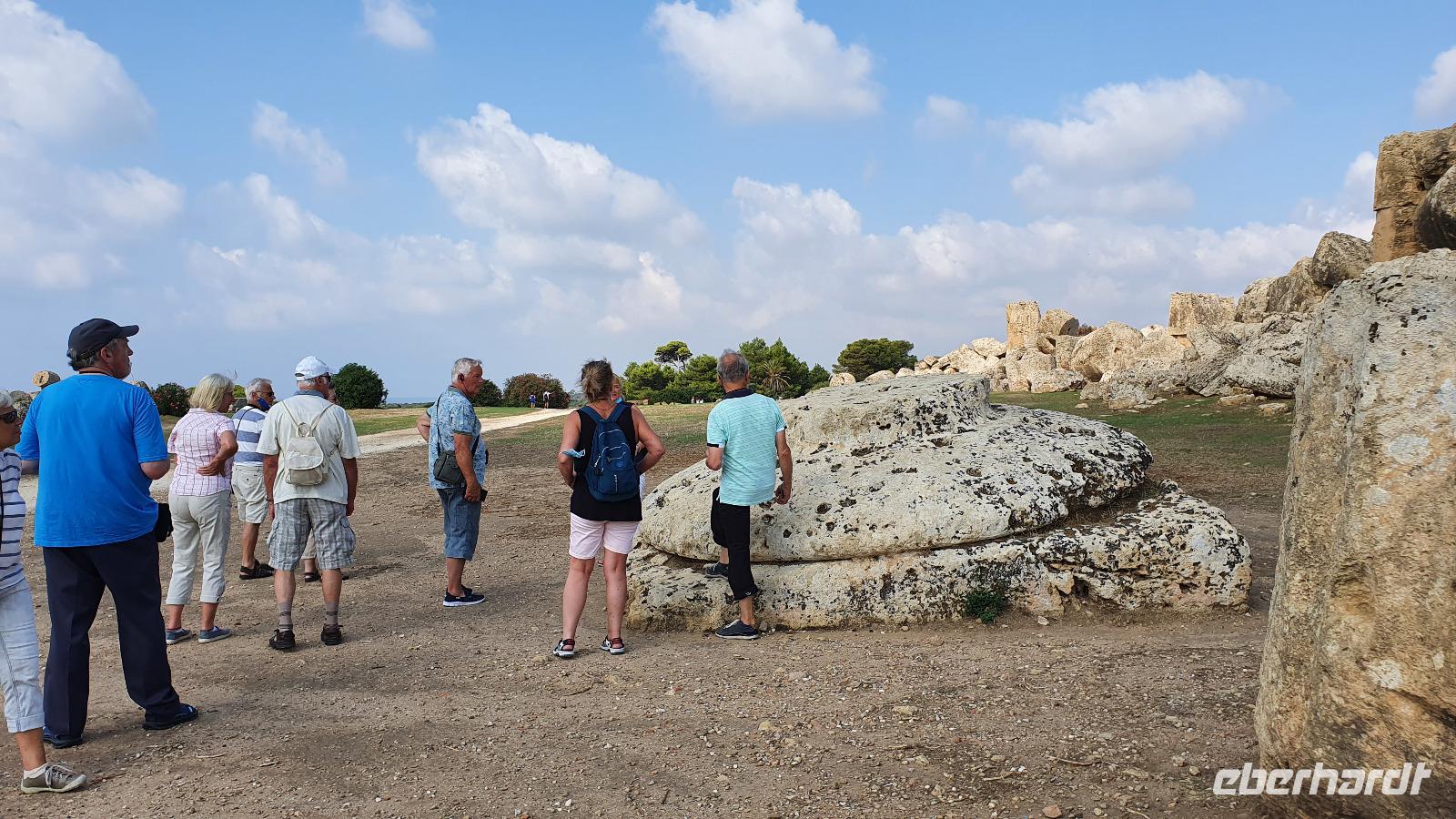 Unser Tag beginnt mit einem leckeren Frühstück. Für sizilianische Verhältnisse ausgesprochen üppig. Renate hatte uns erzählt, dass sie eigentlich nur eine Brioche essen und eventuell eine Granita dazu (im Sommer)- das hätte wohl den meisten von uns nicht wirklich gereicht ;-) Gestärkt folgen wir dann dem Hausherren auf einen kleinen Rundgang. Ein ehemaliger Steinbruch (=Latomie) war es hier, er verleiht den Oliven einzigartigen Geschmack. Heute lädt ein Pool zum Entspannen und Genießen ein und ein uralter Olivenbaum - 1200 Jahre alt!- schaut zu. Was der wohl alles schon gesehen hat? Daneben ein Bananenbaum- mit Früchten und Blüten. Umwerfend schön. Dann machen wir uns auf den Weg, Selinunte liegt quasi gleich um die Ecke und wir sind kaum mehr als 20 Minuten unterwegs. Hier besuchen wir den Archäologischen Park Selinunte. Nach dem obligatorischen Prozedere mit Maske, Fieber messen und eigens ausgewiesenen Wegen können wir dann zum Tempel E starten. Da niemand eindeutig sagen kann, wem die Tempel zuzuschreiben waren, haben sie eben Buchstaben bekommen. Die Tempelanlagen hier wurden einst von Erdbeben und Tsunami verwüstet, ein Wiederaufbau undenkbar. Nur der Tempel E kippte so zur Seite um, dass er quasi wieder aufgerichtet wurde. So können wir ihn heute besichtigen, auch die Heiligtümer im Inneren sind noch nachvollziehbar. Besonders angetan hat es uns aber die tolle Aussicht zur Akropolis und zum Meer. Was für ein Blick! Schön, dass wir den Tempel betreten und so den tollen Ausblick genießen konnten. Unser Spaziergang führt uns zu Überresten weiterer Tempel- F und G. Man vermutet, dass Tempel G Zeus geweiht gewesen sei, er soll mehr als 100 Meter lang gewesen sein und wurde vermutlich nie fertiggestellt. Riesige Kapitelle und Säulen liegen heute verstreut als hätte ein Riese mit seinem Bauklötzen gewürfelt. Wir umrunden das Areal und genießen die Sonne, strahlendblauen Himmel, die einzigartige Atmosphäre und das Meer. Dann heißt es weiterfahren. Jenseits der Autobahnen fährt uns Rosario nach Marsala zu den Salinen hier. Unterwegs bekommen wir so einen guten Eindruck vom tatsächlichen Leben hier. Wir passieren den Hafen von Marsala und sind schon an den Salzgewinnungsbecken angekommen. Ein Fotostopp darf natürlich nicht fehlen, dann geht es zu unserem nächsten Ziel: die Salinen von Paceco. Hier haben wir auch unsere Mittagspause und wieder genießen wir landestypische Antipasti, Pasta und Fisch. Dazu ein Glas Wein- so läßt es sich leben. Wer wollte versorgte sich noch mit einem groben oder feinen Salz von hier und dann ging unsere Fahrt auch schon weiter. Unterwegs sehen wir Flamingos in den Salzbecken stehen - was für ein Glück. Dann geht es in die Höhe- genauer auf 760 Meter hinauf auf den Monte Giuliano. Hier oben thront Erice. Souverän fährt Rosario die Serpentinen hinauf und Renate erzählt uns zur Geschichte der Stadt. Ein Großteil der Einwohner wohnt heute am Fusse des Berges, hier entstand Valderice. Nur wenige Hundert wohnen noch ständig oben in Erice. Wir betreten die Stadt durch das Stadttor, die Porta Trapani, und fühlen uns tatsächlich ins Mittelalter versetzt, sehen schmale Gassen, das Starßenpflaster ist in Ornamenten gelegt, und natürlich steht die Hauptkirche gleich am Ortseingang. Wir statten der Kirche der Mutter Gottes natürlich einen Besuch ab. Sie ist die einzig gotische Kirche von einstmals bis zu 60 Kirchen im Ort. Besonders besticht die weiße Decke mit manuelinischen Elementen. Unser Spaziergang führt uns durch die Gassen zur wohl berühmtesten Pasticceria der Stadt- zu Maria Grammatico und ihrem köstlichen Mandelgebäck. Das konnte, wer wollte, probieren bevor es weiterging hinauf zur Burg. Hier befand sich vorher der Venustempel, der Liebesgöttin huldigte man früher auch in Form der Tempelprostitution. Wir jedenfalls genießen den Ausblick von hier oben und als kleine Überraschung einen Marsala- ein Wein aus der Region. Ein echtes WOW von Eberhardt Travel eben. Individuell erkundeten wir nun die Stadt bevor es zurück ging zum Bus. Wieder genossen wir bei der Rückfahrt die spektakulären Aussichten über die Bucht bis zum Monte Cofano. Angekommen in unserem Agriturismo bei Castelvetrano blieb noch etwas Zeit bevor wir uns unser Abendessen schmecken ließen. Neben lecker Vorspeisen und Pasta konnten wir heute Involtinis probieren, gefüllte Rindfleischröllchen.