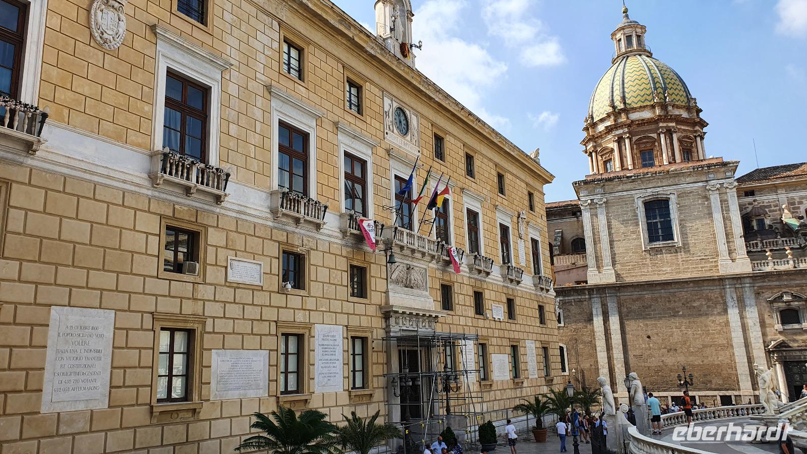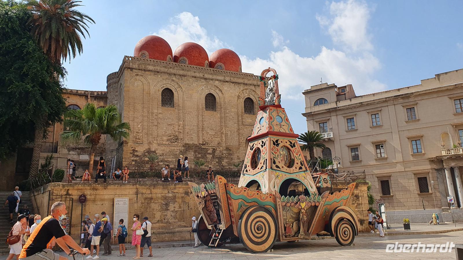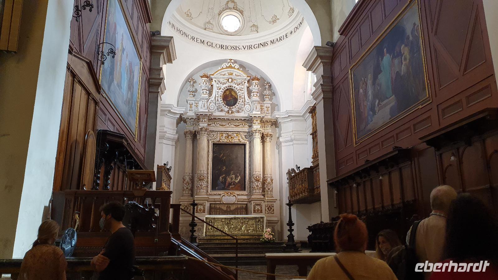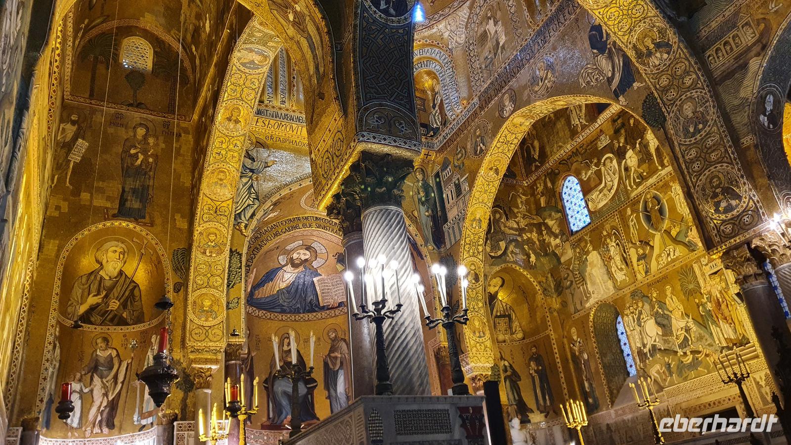 Heute heißt es Abschied nehmen von unserem Agriturismo. Viele würden gern noch bleiben, aber es ist ja eine Rundreise und wir wollen noch viel mehr kennenlernen. Dazu gehört heute mit Palermo die Hauptstadt Siziliens. Renate erzählt unterwegs auch von der sogenannten "Familie", der Mafia. Sie wird dort stark, wo z.B. die Jugendarbeitslosigkeit hoch ist und junge Leute einem schnell verdienten Geld schwer widerstehen können. Bei einer Quote von bis zu 40 % Jugendarbeitslosigkeit also ein schwieriges Unterfangen. Trotzdem wird gerade in Schulen und der Kirche versucht aufzuklären und mit Angeboten für junge Menschen dagegen zu wirken. Zwei Richter haben mit ihrer konsequenten Strafverfolgung gegen die Mafia dazu beigetragen, dass sich die Haltung zur Mafia änderte. Sie wurden ermordet und diese Morde rüttelten viele auf. Auf unserer Autobahn fahen wir auch an der Stelle vorbei, an der Richter Falcone mit seiner Frau und seinen Leibwächtern ums Leben kam. Hier steht heute ein Mahnmal und oben an der Bergwand prangt groß: No Mafia. Ein Hoffnungszeichen. Dann haben wir Palermo erreicht und steigen in der Nähe des Normannenpalastes aus. Vor dem Stadttor bewundern wir die Blüten des Kapokbaumes um dann durch die Porta Nuova die Altstadt zu betreten. Da der Normannenpalast auch Sitz der Regierung ist müssen wir durch eine Sicherheitskontrolle bevor wir einen weiteren Höhepunkt unserer Rundreise besichtigen können: die Cappella Palatina. Im Inneren erwarten uns auf dem Boden und an den Wänden arabische Mosaikarbeiten, da sie keine Menschen darstellen sind es wunderschöne Ornamente. Die Wände oben zieren unglaubliche Mosaiken. Sie erzählen Geschichten aus der Bibel, dem alten und neuen Testament und in der Apsis thront Christus als Pantokrator. Nur hier ist auch die originale Decke aus Holz erhalten- ein Stalaktitengewölbe mit Mosaiken aus Seide und Gold. Nirgendwo anders verschmelzen byzantinische, arabische und normannische Kunst derart wie hier. Da nur wenige Besucher hier sind freuen wir uns über den Platz und die Zeit, die wir hier verbringen können. Doch auch unser nächster Programmpunkt ist wieder ein Highlight: die Kathedrale von Palermo. Vor der Kathedrale erklärt uns Renate die verschiedenen Baustile und wie die Kirche immer wieder um- und ausgebaut wurde. Dann wollen wir sie auch von innen besichtigen- das wird jäh gebremst. Für eine anstehende Hochzeit wurden bereits Teile im Inneren abgesperrt, wir können gerade noch einige Altäre an der Westfront anschauen bevor wir uns in den hinteren Teil der Kathedrale zurückziehen müssen. So erfahren wir hier von der Verehrung der heiligen Rosalia, deren Kapelle weithin sichtbar von Silber funkelt, von den Normannengräbern, die hier liegen, immerhin die Stauferkaiser Heinrich IV., Friedrich II. und Constanze, Königin von Sizilien. Denn wie der Normannenpalast stammt auch die Kathedrale aus dem 12. Jahrhundert. Weiter erkunden wir Palermo zu Fuss. Spazieren über die Via Vittorio Emanuele bis zu den Quattro Canti, dieser besonderen Straßenkreuzung. Alle 4 Ecken wurden barock verziert, zeigen Herrscher und Figuren, die die Jahreszeiten repräsentieren. Wir sehen den sogenannten Schambrunnen, seine unbekleideten Figuren sollen die Nonnen des gegenüberliegenden Klosters verwirrt haben, andere sagen, dass die Stadt wohl andere Probleme hätte, als für viel Geld diesen Brunnen zu kaufen, es wäre eine Schande. So kam der Brunnen vor dem Rathaus zu seinem Namen. Natürlich sehen wir auch die Maturanakirche, im Innern ähnlich reich an Mosaiken wie die Capella Palatina und davor steht ein Prozessionswagen der hl. Rosalia. Weiter geht es, vorbei an tollen Palästen, aber auch arg verfallenen. Auch eine Ausstellung "No Mafia" sehen wir. So erreichen wir schließlich das Teatro Massimo, das drittgrößte Opernhaus Europas. In der Nähe verbringen wir unsere Mittagspause und dann heißt es: Auf Wiedersehen Palermo. Entlang der Küste fahren wir weiter nach Cefalu. Eine wunderschöne kleine Stadt direkt am Meer mit einer imposanten und interessanten Kirche. Eigentlich einem Dom. Über dem Städtchen thront er und auch hier sind wunderbare Mosaiken erhalten geblieben. Sie wurden vor kurzem restauriert und erstrahlen nun wieder in ganzer Pracht. An den Wänden sind noch Überreste der arabischen Bodenmosaike ausgestellt, leider ist nicht mehr sehr viel davon erhalten. Gut, dass wir unseren Eberhardt-Funk haben, so kann uns Renate vieles erklären und auch unsere Fotografen kommen auf ihre Kosten, ohne etwas zu verpassen. Nach dem Besuch des Domes haben alle Freizeit, wer möchte kann hinunter an den Strand spazieren, durch den wunderschönen Ort bummeln oder einfach im Cafe ein leckeres Eis genießen. Viel zu schnell vergeht die Zeit hier und wir spazieren an der Küstenstraße zurück zum Leuchtturm und zu unserem Bus. Rosario bringt uns dann sicher nach Capo d'Orlando zu unserem Hotel Il Mulino. Das liegt direkt an der Strandpromenade und einige nutzen rasch noch die Gelegenheit für ein erfrischendes Bad im Meer. Zum Abendessen treffen wir uns wieder und lassen dann langsam den Tag ausklingen.