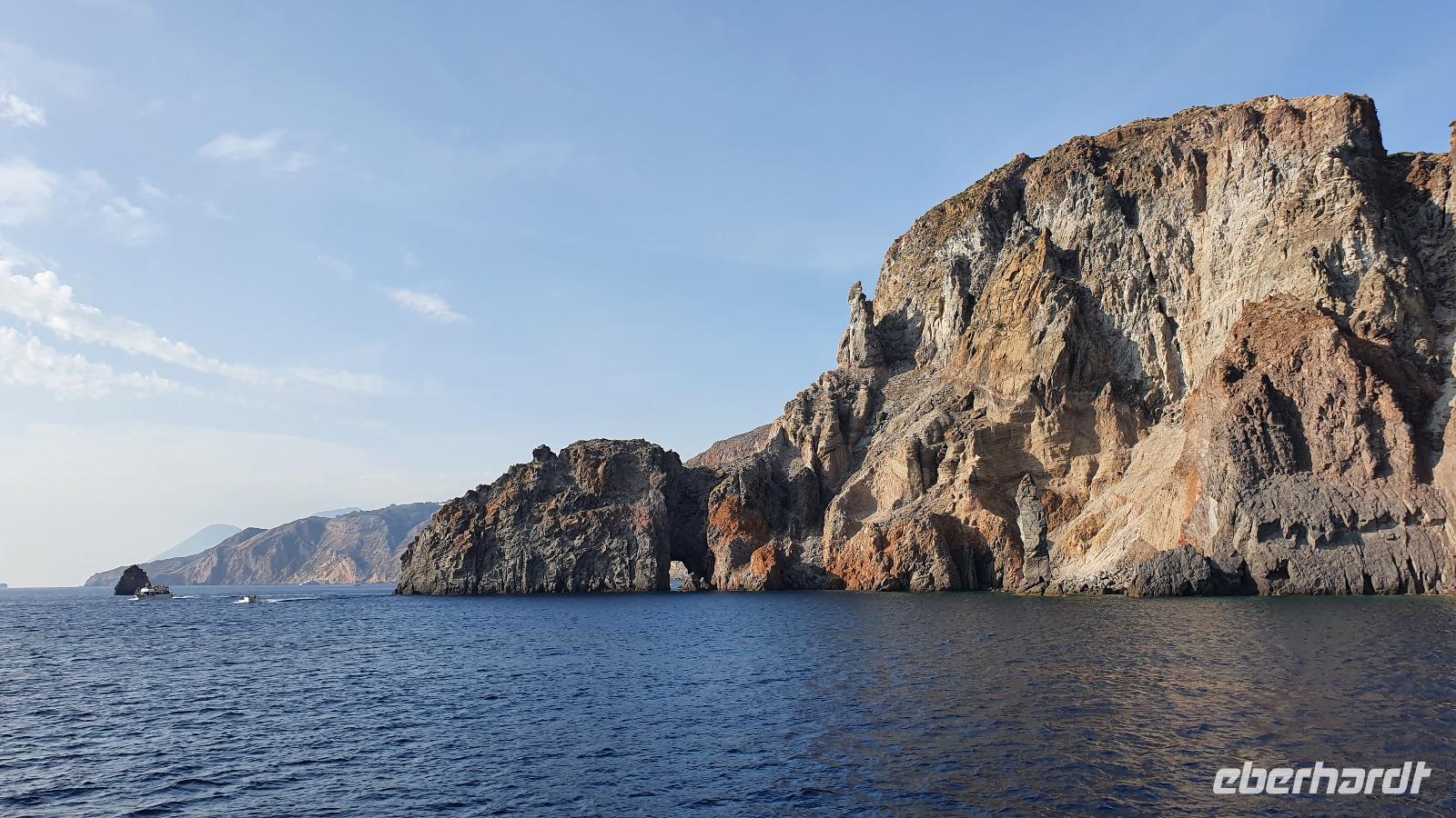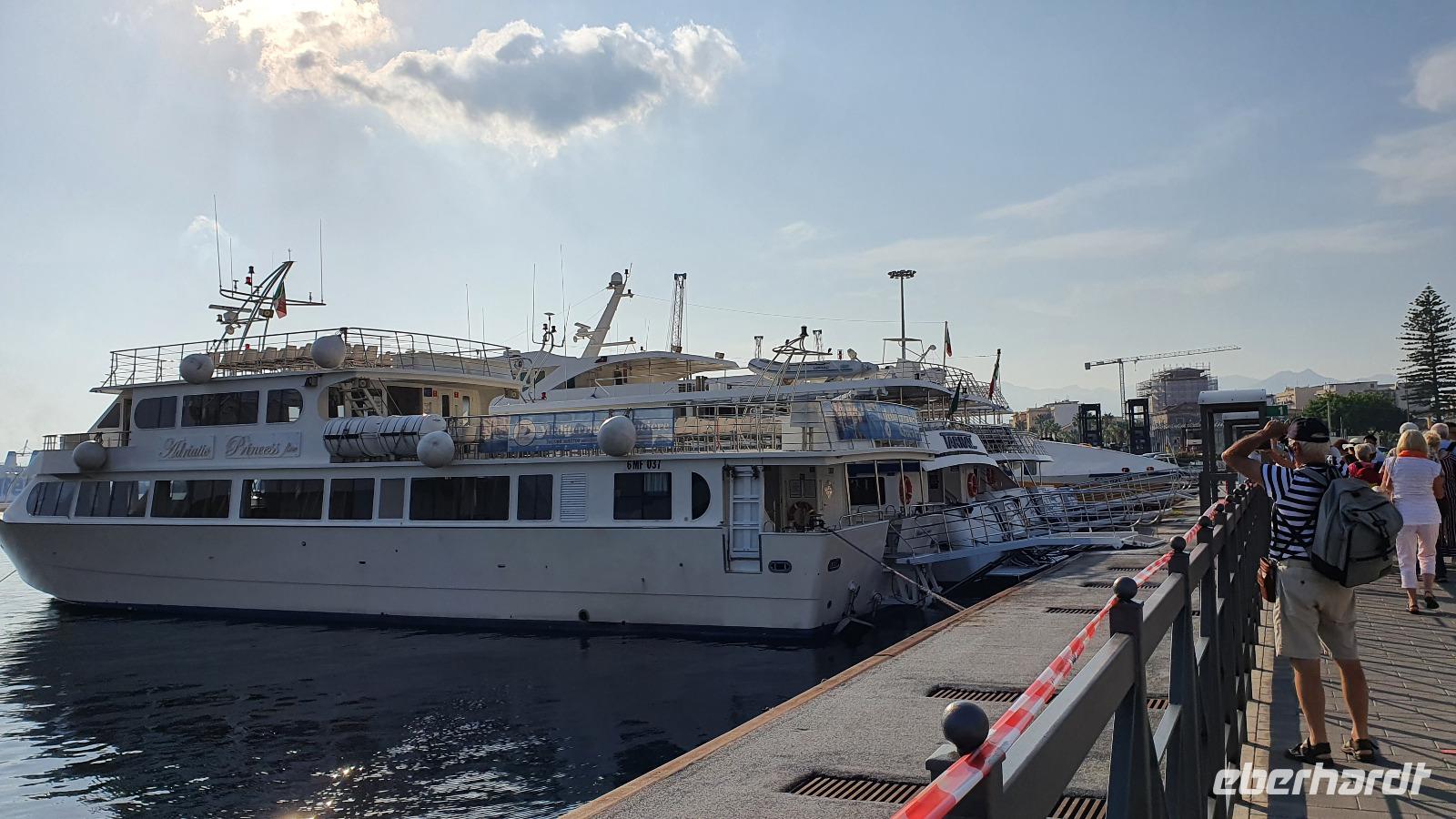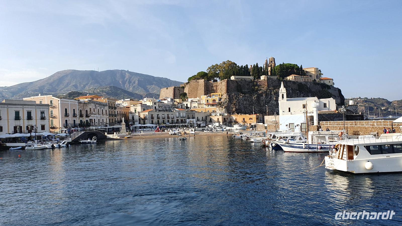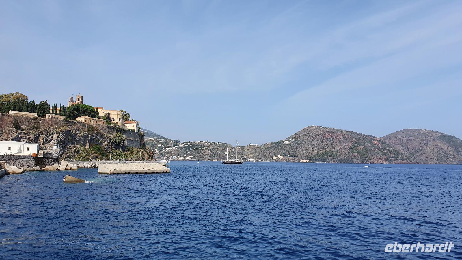 Heute soll es zeitig losgehen- die Äolischen Inseln rufen. Und ausgerechnet heute, wo wir pünktlich am Schiffsanleger sein müssen, dauert es ewig, bis jeder seinen Kaffee oder Cappucchino bekommen hat. Da muss das Hotel wohl noch etwas nachbessern. Dank der sonntäglichen Ruhe im morgendlichen Straßenverkehr kommen wir dann doch gut durch und sind rechtzeitig in Milazzo am Hafen. Die Äolische Prinzessin- unser Schiff- wartet bereits auf uns und so können wir an Bord gehen. Das Meer ist ruhig, die Sonne strahlt vom blauen Himmel- was kann es da schöneres geben als eine Bootstour? Wir brauchen eine gute Stunde bis nach Vulcano, unserer ersten Insel, die wir besuchen. Alle hatten sich im Vorfeld informiert und so ging es zielstrebig zum schwarzen Strand zum Baden, in Wanderschuhen auf den (noch aktiven) Vulkan hinauf, im Bus zu einer Inselrundfahrt oder einfach zum Bummeln durch den Ort. Das Schwefel-Fango-Bad war leider geschlossen, aber dafür hatte sich ohnehin kaum jemand von uns entschieden. Insgesamt für alle eine schöne, individuelle Auszeit hier. Wer wollte ass noch eine Kleinigkeit denn nach dem Mittag fuhr unser Schiff weiter nach Lipari, auf die größte der Äolischen Inseln. Den Namen gab ihnen Äolos, der Gott des Windes, manche nennen sie aber auch Liparische Inseln nach der Hauptinsel Lipari. Diese lernten wir bei einer Bustour näher kennen. Hinauf ging die Tour, an den alten Bimsstein-Brüchen vorbei. Deren Betrieb wurde eingestellt, als die Inseln Weltkulturerbe wurden. Nun beginnt man, die Anlagen zurückzubauen und einen Naturpark aus dem Areal zu machen. Erste Sträucher und Bäume haben sich bereits auf den vom Bimsstein weißen Bergen angesiedelt und das Gebiet wird in kürze komplett sein Gesicht verändern. Fotostopps an Panorama-Plätzen sorgen dafür, dass unsere Fotografen nicht zu kurz kommen und wir haben die einmalige Gelegenheit, Spezialitäten der Insel zu kosten: Liköre, Weine, Kapern und Kapernäpfel...Auch ein Blick nach Salina ist möglich. Die Insel hat ihren Namen von der Salzgewinnung, die aber heute nicht mehr betrieben wird. Wieder im Hafen angekommen trennen sich unsere Wege, denn nun ist wieder Zeit für individuelle Erkundungen. Leider war die Kirche St. Bartolomeo geschlossen, gab aber wie die Burg ein tolles Fotomotiv. Am Hafen konnte man den Seglern und Motorbooten zuschauen, durch die Gassen schlendern oder das eine oder andere spezielle Souvenir von hier erstehen. Am Schiff trafen wir uns wieder und bevor wir nach Milazzo zurückkehrten fuhr unser Kapitän eine Schleife zu den Felsen von Lipari und Vulcano Da waren die Bischofsmütze, die Mumie oder auch die Engelsgrotte. Den Namen hat sie weil es sich anhören soll, als wenn Engel singen, wenn der Wind durchpfeift. Auf Lipari dann sehen wir die Löwenkopfinsel, ganz nah fährt der Kapitän an die Felsen und wer kann entdeckt Pegasus und das Bad der Venus. Ein tolles Erlebnis! Nun aber geht es zurück nach Milazzo. Eine ruhige See macht die Überfahrt traumhaft schön und die bereits tiefstehende Sonne zaubert tolles Licht aufs Wasser. Im Hafen wartet bereits Rosario mit dem Bus auf uns. Er bringt uns sicher zurück nach Capo d'Orlando, wo wir uns in unserem Hotel unser Abendessen schmecken lassen.
