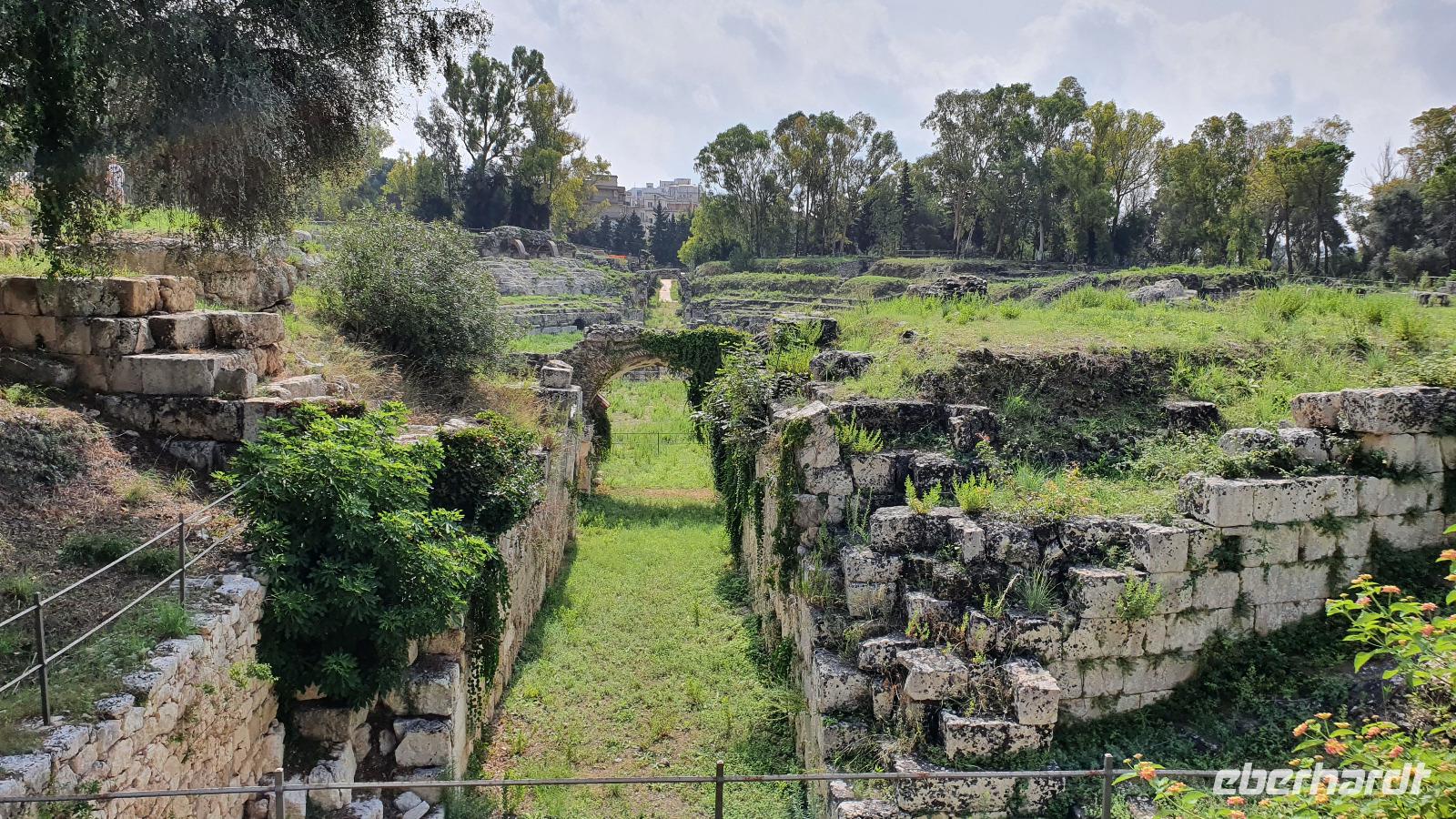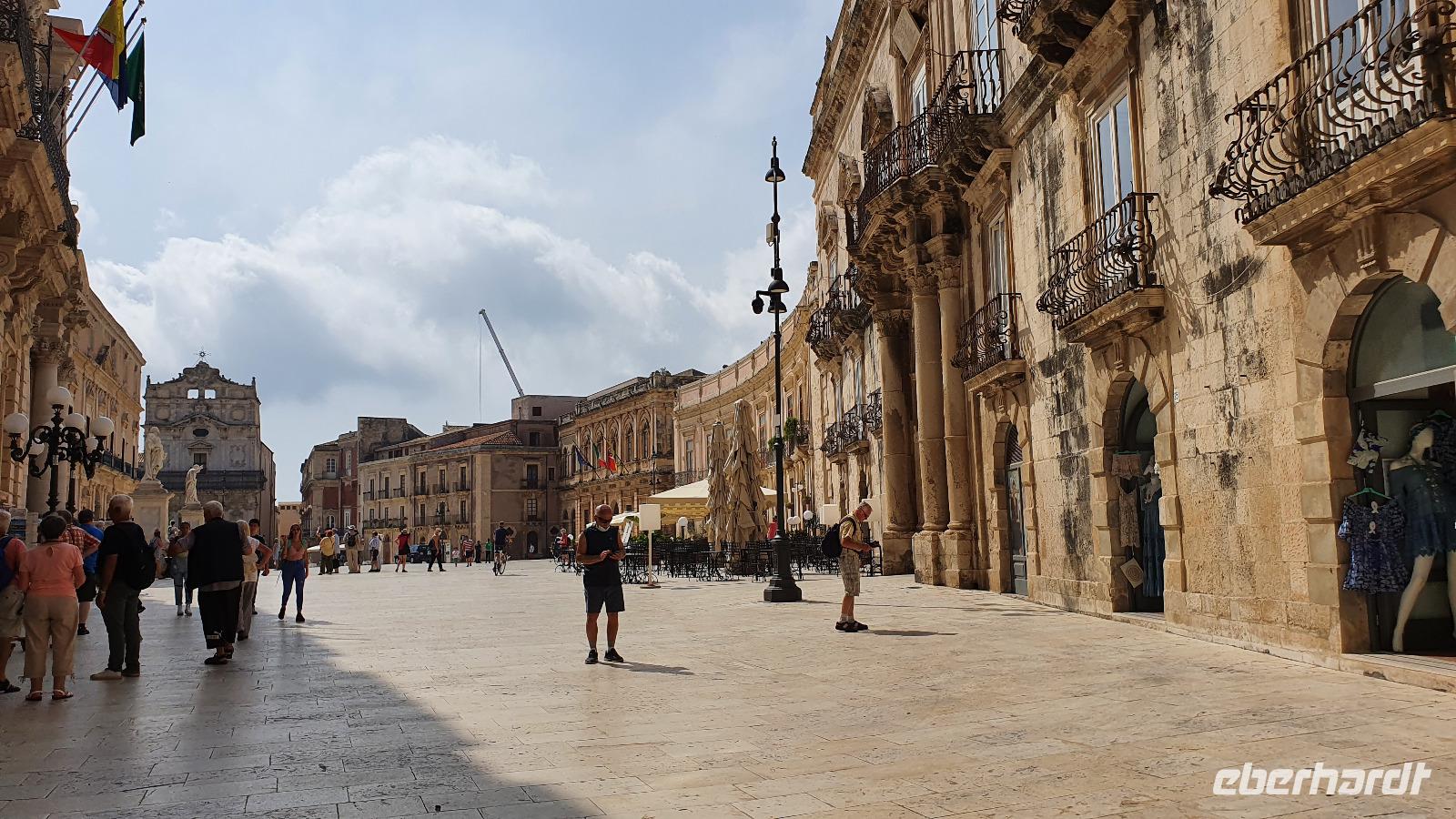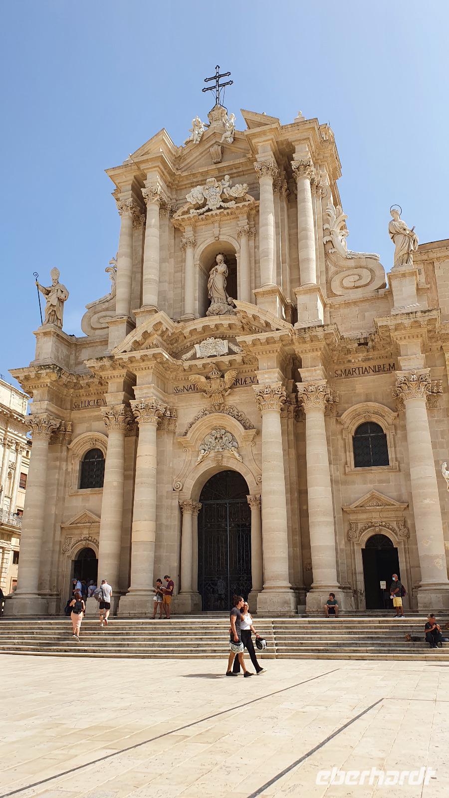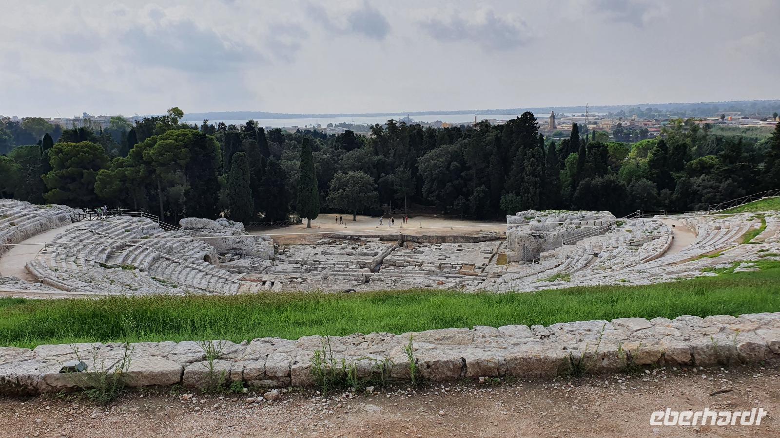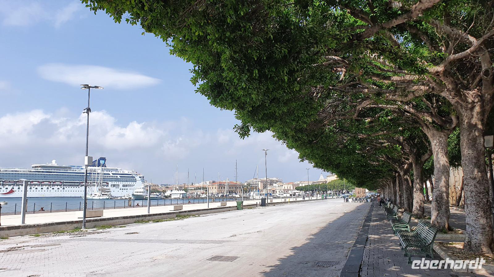 Heute startet unser fakultativer Ausflug nach Syrakus. Leider haben wir nun einen kleineren Bus bekommen, und das, obwohl wir nur 1 Gast weniger sind heute. Aber es ist nicht zu ändern und so machen wir das Beste draus. Toto ist unser Fahrer und Renate beantwortet uns unterwegs alle unsere Fragen, die wir bisher noch nicht gestellt hatten. Leider hüllt sich der Ätna in tiefe Wolken- ein Abschiedsfoto ist nicht möglich also fahren wir weiter, passieren Catania und erreichen dann Syrakus. Wir beginnen im archäologischen Park. Es ist schon früh am Tag drückend heiß und schwül, wir sind froh, im ehemaligen Steinbruch zu beginnen. Heute heißt er Paradies- früher war er für die Arbeiter hier alles andere als das. Dann kommen wir zum sogenannten "Ohr des Dionisio". Das ist eine Höhle, die aus den Fels gehauen wurde und die Form eines Ohres hat. Sie wurde auch als Gefängnis genutzt und oben soll der Tyrann gelauscht haben, was die Gefangenen so erzählten. Die Akkustik des Ortes kam ihm dabei zupass. Die probierten wir natürlich aus und sangen gemeinsam das Steigerlied- Glück auf, Glück auf. Stimmt- ein tolles Echo. Als wichtige griechische Provinz mußte natürlich ein Theater her und das wurde hoch oben über dem Hafen aus den Felsen gehauen. Auch heute wird es im Sommer noch für Aufführungen genutzt. Lange blieben wir nicht hier, wir nutzen das Wasser in den Höhlen für eine Erfrischung und stiegen lieber wieder hinab. Noch ein kurzer Fotostopp hier unten und dann zeigte uns Renate den riesigen Opferaltar. Einmal im Jahr wurden hier hunderte Stiere gleichzeitig geopfert, Stücke gingen an die Priester, an die Stifter aber auch an das Volk, dass so 1 mal im Jahr in den Genuss von Fleisch kam. Unseren Rundgang beendeten wir am römischen Amphitheater. Dabei lernte wir, dass Amphi heißt: von beiden Seiten von Zuschauerrängen umgeben. Im Gegensatz zur Muschelform des griechischen Theaters. Aber die Römer hatten es auch eher mit Gladiatoren und Löwen als mit Dramen und Schauspiel. Die Freie Zeit nun nutzten wir für Schattensuche und vielleicht ein kleines Souvenir, dann ging es mit dem Bus in die Stadt. Am Hafen stiegen wir aus und machten uns auf den Weg zur Ortigia- der Altstadt. Das war früher eine Insel, die nun zu Syrakus gehört. Eine Brücke trennt die Nue- von der Altstadt und so erreichen wir bald den ältesten Tempel Siziliens. Zumindest die Überreste davon. Auf 600 vor Christus wurde er datiert und war Apollon gewidmet. Dann spazieren wir durch malerische Gassen, interessanten Geschäften und immer wieder sehen wir Kunsthandwerker, die hier an der Straße ihre Werke anboten- Gold- und Silberschmiede, kunstvolle Flechtarbeiten, Schmuck aus Obsidian...So erreichten wir den Domplatz und statteten der Kirche natürlich einen Besuch ab. Nach dem obligatorischen Fiebermessen und dem Ticketkauf konnten wir uns im Inneren umsehen. Renate machte uns aufmerksam auf die Säulen, die versetzt scheinen- das war aber das Erdbeben 1693, alles andere hat standgehalten. Auch im Krieg, als Syrakus bombardiert wurde hat die Kirche keinen Schaden genommen. Früher befand sich hier der Tempel der Athene, die Kirche wurde einfach drum herum gebaut und heute hat man die Säulen wieder freigelegt. Den Domplatz dann schauen wir uns nur vom Schatten einer Mauer aus an- die Schwüle ist einfach unerträglich. Aber tapfer spazieren wir weiter zur Aretusa-Quelle. Verliebte und Brautpaare kommen oft hierher, gilt sie doch als Ort der Veschmelzung zweier Liebender. Hier endete auch unser gemeinsamer Spaziergang durch Syrakus. Die freie Zeit nun konnte genutzt werden für eine Mittagspause, Bummeln oder einfach weiter die Stadt erkunden. Das aufziehende Gewitter ließ uns dann aber doch etwas eher zum Bus kommen und so fuhren wir am frühen Nachmittag zurück nach Letojanni. Hier mußten wir uns dann auch von Renate verabschieden. Schon im Bus nutzten wir die Gelgenheit, ihr zu danken. Nun eine herzliche Verabschiedung- und vielleicht sieht man sich ja irgendwann wieder. Uns hatten nun auch hier Gewitter und Regen eingeholt. Dazu kam ein heftiger Hagelschauer, wow- das trommelte auf unsere Terrassen! Zum Abendessen trafen wir uns alle wieder und dann verabschiedeten sich auch die Frankfurter Fluggäste. Sie werden morgen in aller Frühe starten, die Münchner etwas später. So klang auch dieser Tag aus, mit viel Sonne, Regen, Hagel, Blitz und Donner, mit vielen interessanten Eindrücken und der Hoffnung, dass bald eine Lösung gefunden wird, damit wir weiterhin reisen und andere Menschen und Kulturen kennenlernen können.