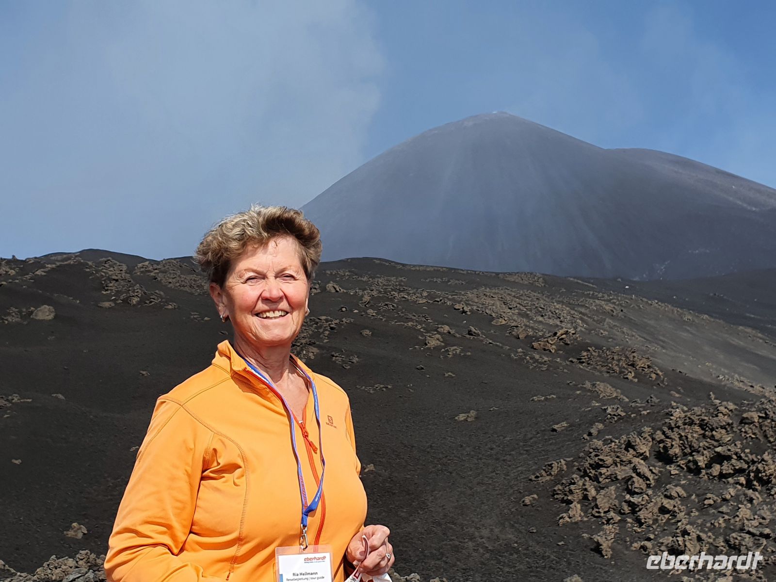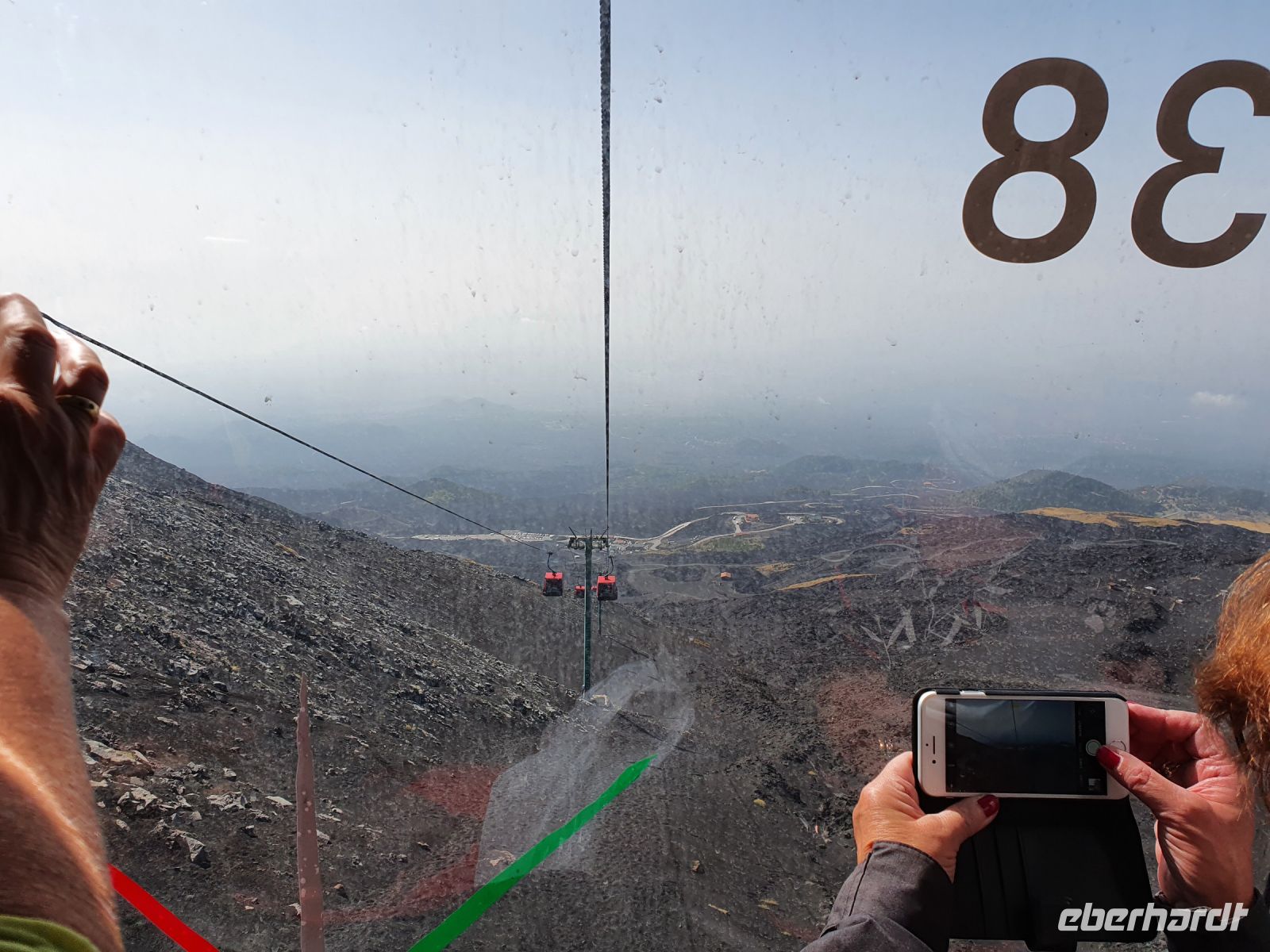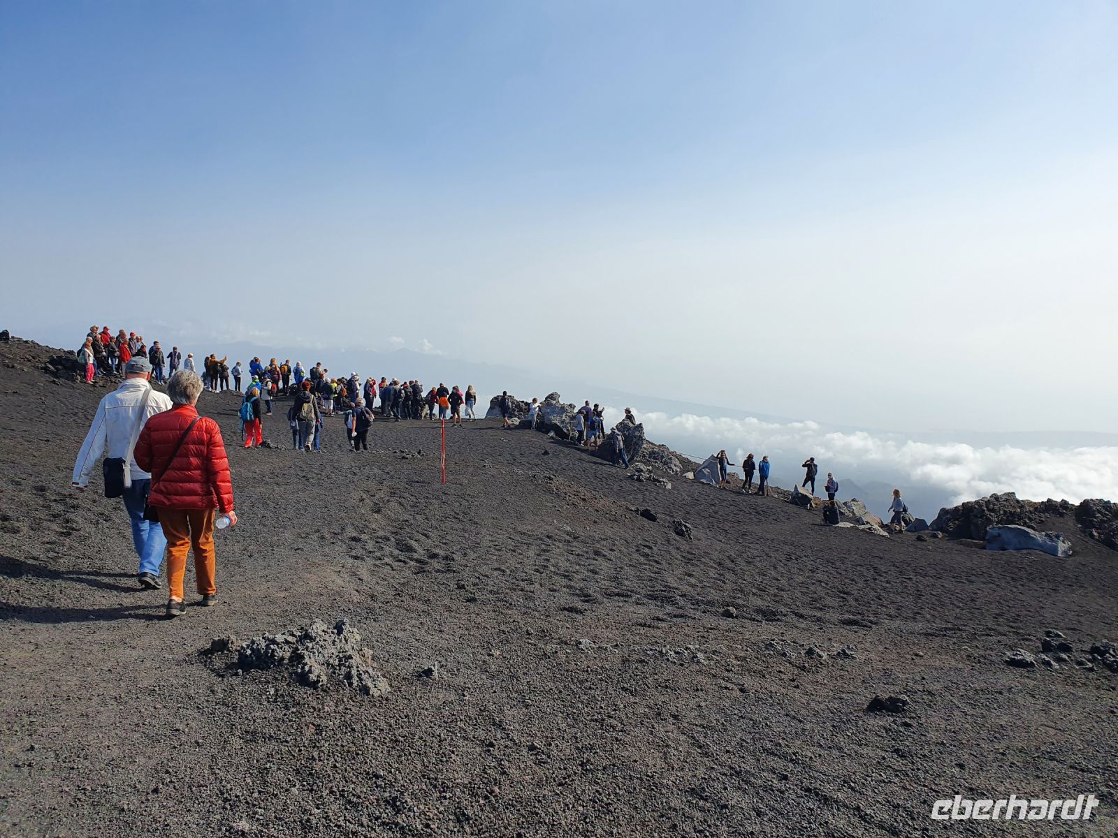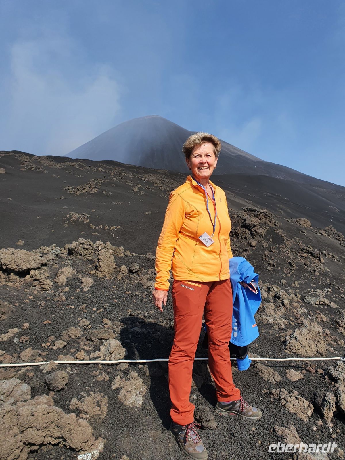 Gegensätzlicher könnte ein Programmtag kaum sein ! Nach dem Frühstück starteten wir mit unserer Reiseleiterin Renate und dem Fahrer Guiseppe in unserem Kleinbus zum Ätna. Wir hatten Glück, die Sicht war frei und so sahen wir den Vulkan schon von der Autobahn aus. Nun ging es steil bergan über Zafferana hinauf zum Parkplatz auf 1900 m Höhe. Wir begaben uns gleich zur Seilbahnstation und schwebten hinauf auf 2400 m Höhe an der Montagnola. Von da ging es weiter mit Geländebussen auf ca. 2850 m Höhe. Da oben war es immer noch aussergewöhnlich mild und wir brauchten unsere Jacken nicht. Mit einem Bergführer spazierten wir in der Lavaasche hinüber zum Kraterrand des Valle del Bove. Dort tat sich ein grandioser Ausblick auf in diese riesige Caldera, die sich über viele tausend Jahre durch mehrere Einstürze gebildet hat. Am Ätna selbst zeugte eine Rauchfahne aus einem Hauptkrater von den Aktivitäten des Vulkans.