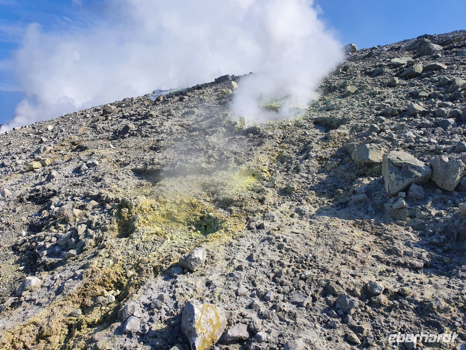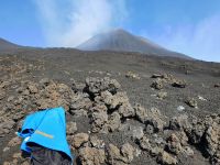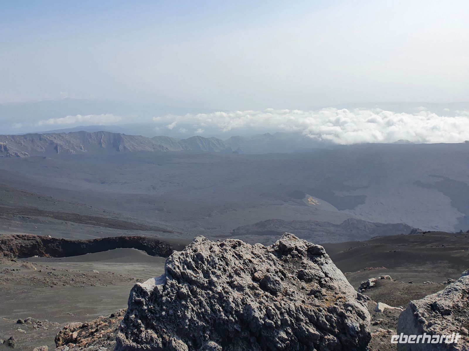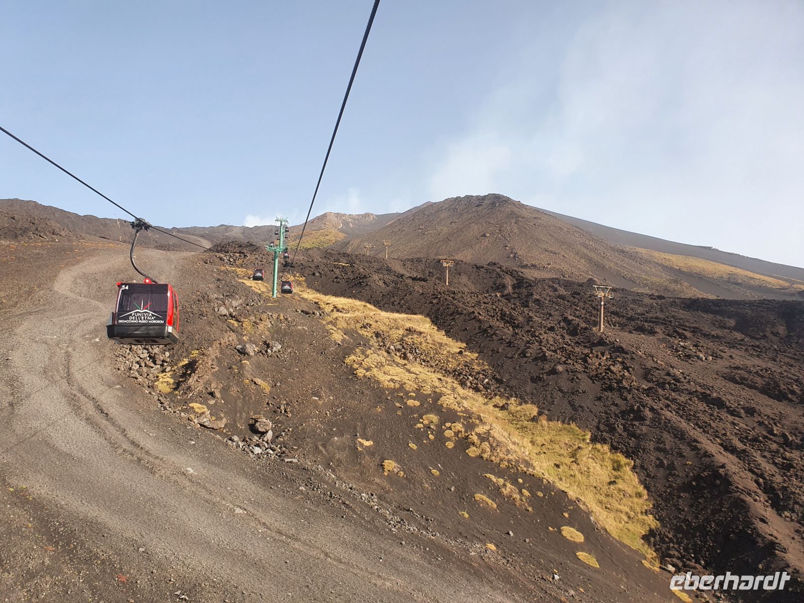 Gegensätzlicher könnte ein Programmtag kaum sein ! Nach dem Frühstück starteten wir mit unserer Reiseleiterin Renate und dem Fahrer Guiseppe in unserem Kleinbus zum Ätna. Wir hatten Glück, die Sicht war frei und so sahen wir den Vulkan schon von der Autobahn aus. Nun ging es steil bergan über Zafferana hinauf zum Parkplatz auf 1900 m Höhe. Wir begaben uns gleich zur Seilbahnstation und schwebten hinauf auf 2400 m Höhe an der Montagnola. Von da ging es weiter mit Geländebussen auf ca. 2850 m Höhe. Da oben war es immer noch aussergewöhnlich mild und wir brauchten unsere Jacken nicht. Mit einem Bergführer spazierten wir in der Lavaasche hinüber zum Kraterrand des Valle del Bove. Dort tat sich ein grandioser Ausblick auf in diese riesige Caldera, die sich über viele tausend Jahre durch mehrere Einstürze gebildet hat. Am Ätna selbst zeugte eine Rauchfahne aus einem Hauptkrater von den Aktivitäten des Vulkans.