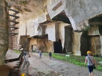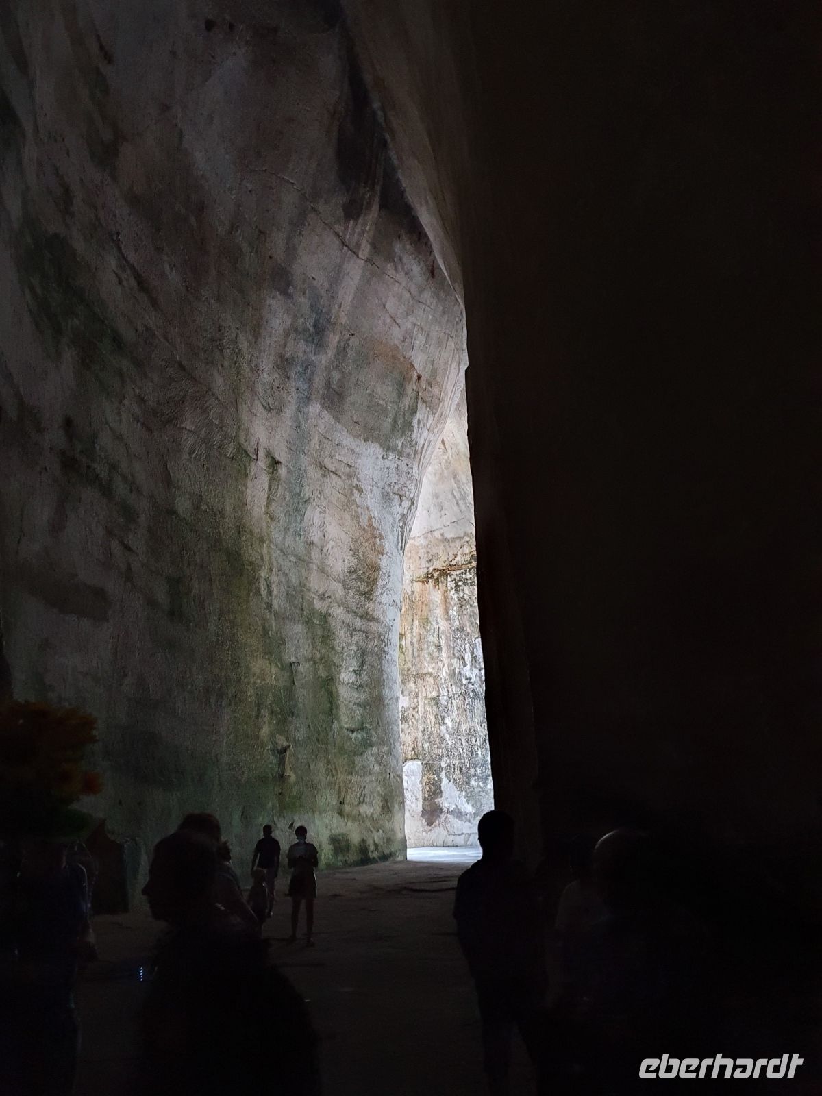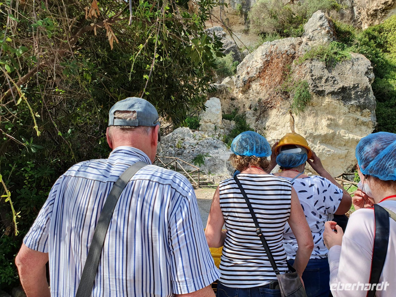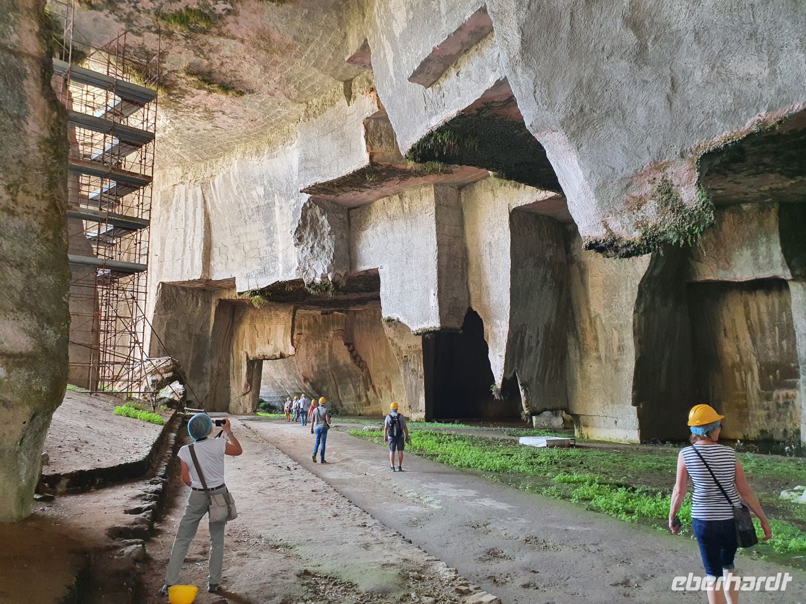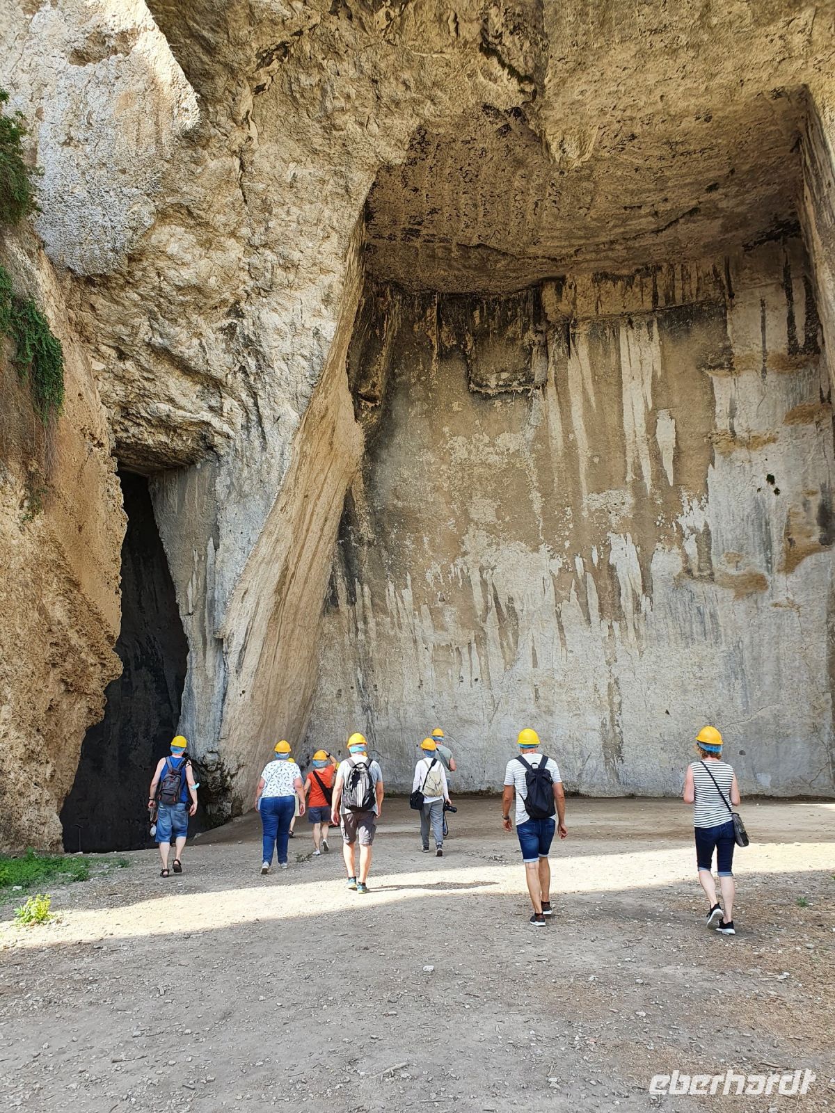 Auf der 2 stündigen Autobahnfahrt erhielt jeder Gast sein Adiogerät, welches auf der ganzen Reise bei Besichtigungen eine große Erleichterung beim Zuhören und Verstehen brachte. In Syrakus begannen wir unsere Besichtigung in der archäologischen Zone. Zunächst besuchten wir den ehemaligen Steinbruch und ausgerüstet mit Helmen durften wir sogar die Seilergrotte besichtigen. Dort sieht man sehr gut, wie große Blöcke aus dem Kalksteinfelsen für den Bau der antiken Gebäude herausgearbeitet wurden. Wieder ohne Helm stand die Grotte "Ohr des Dionysos" auf dem Programm und wir stimmten ein Lied an, um die tolle Akkustik zu erleben. Im höheren Teil der archeologischen Zone liegt das griechische Theater, welches im Sommer noch zu Aufführungen genutzt wird und von wo man einen schönen Ausblick auf die Bucht von Syrakus hat.