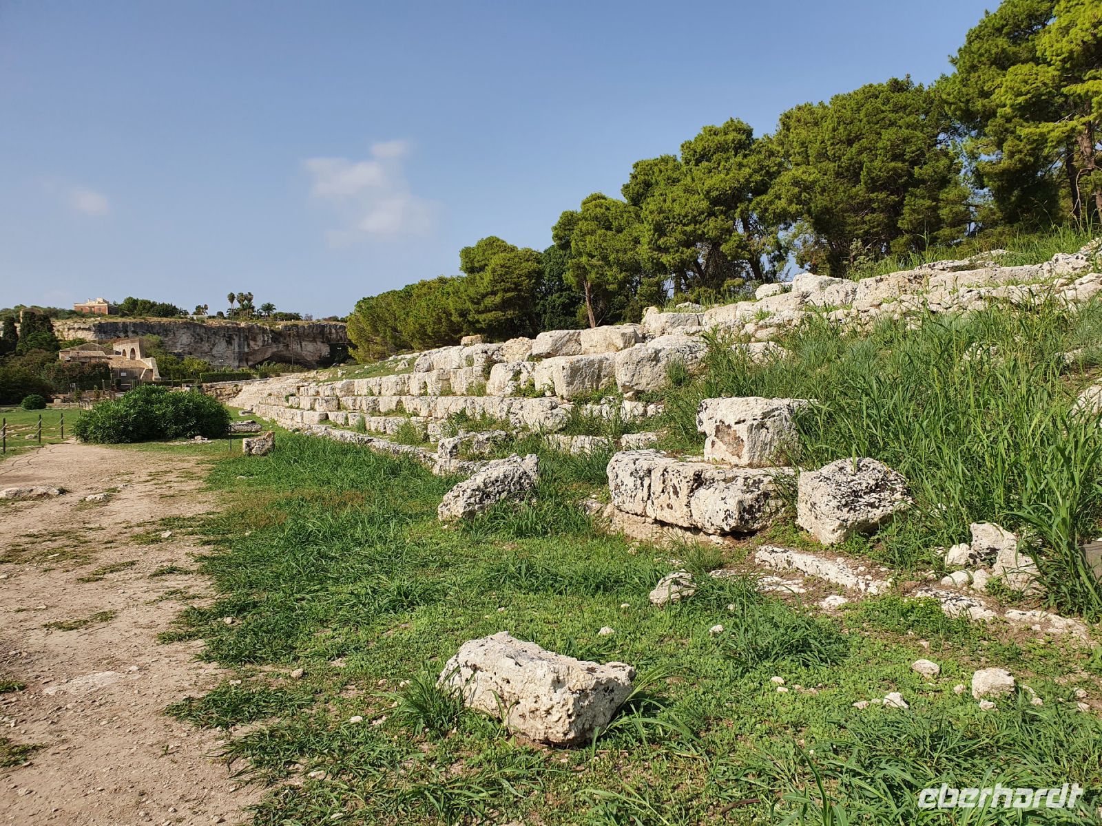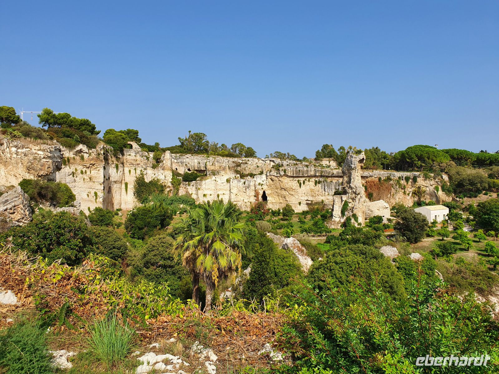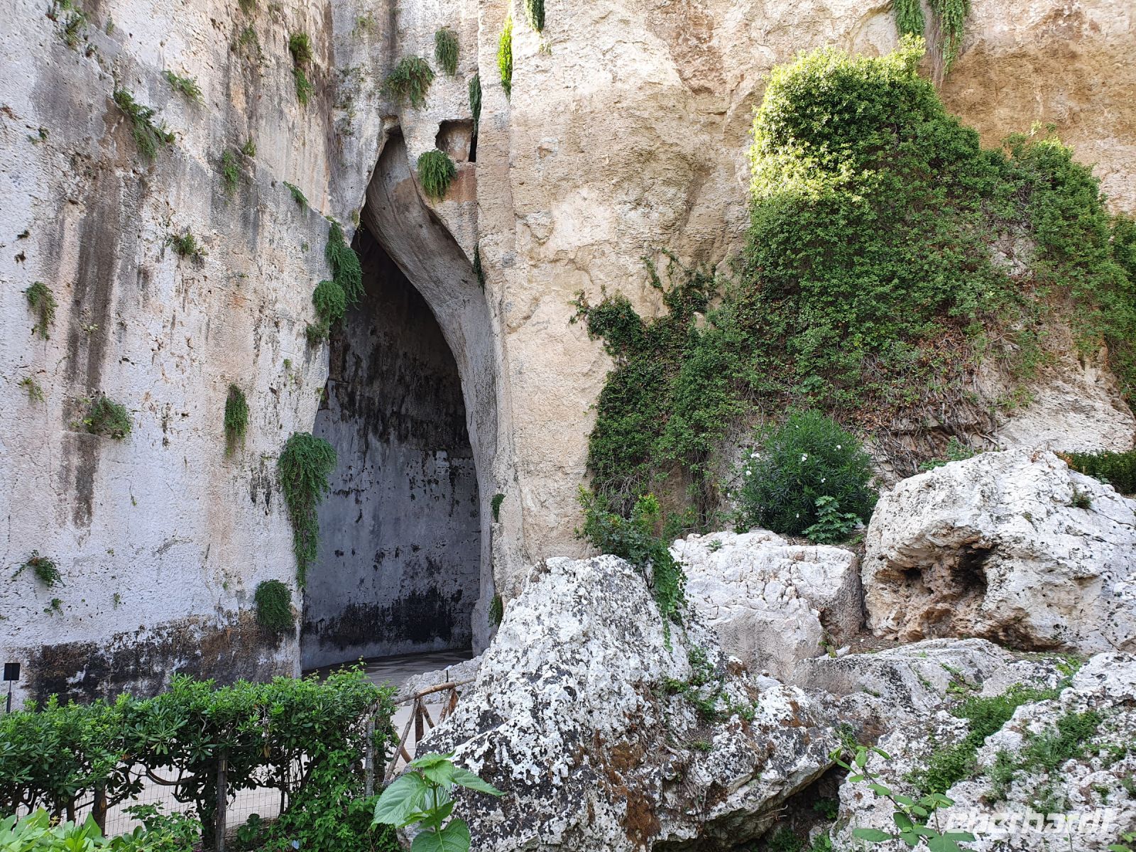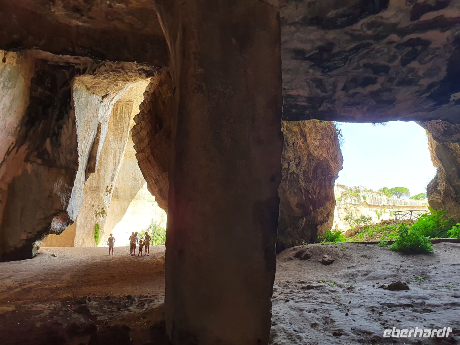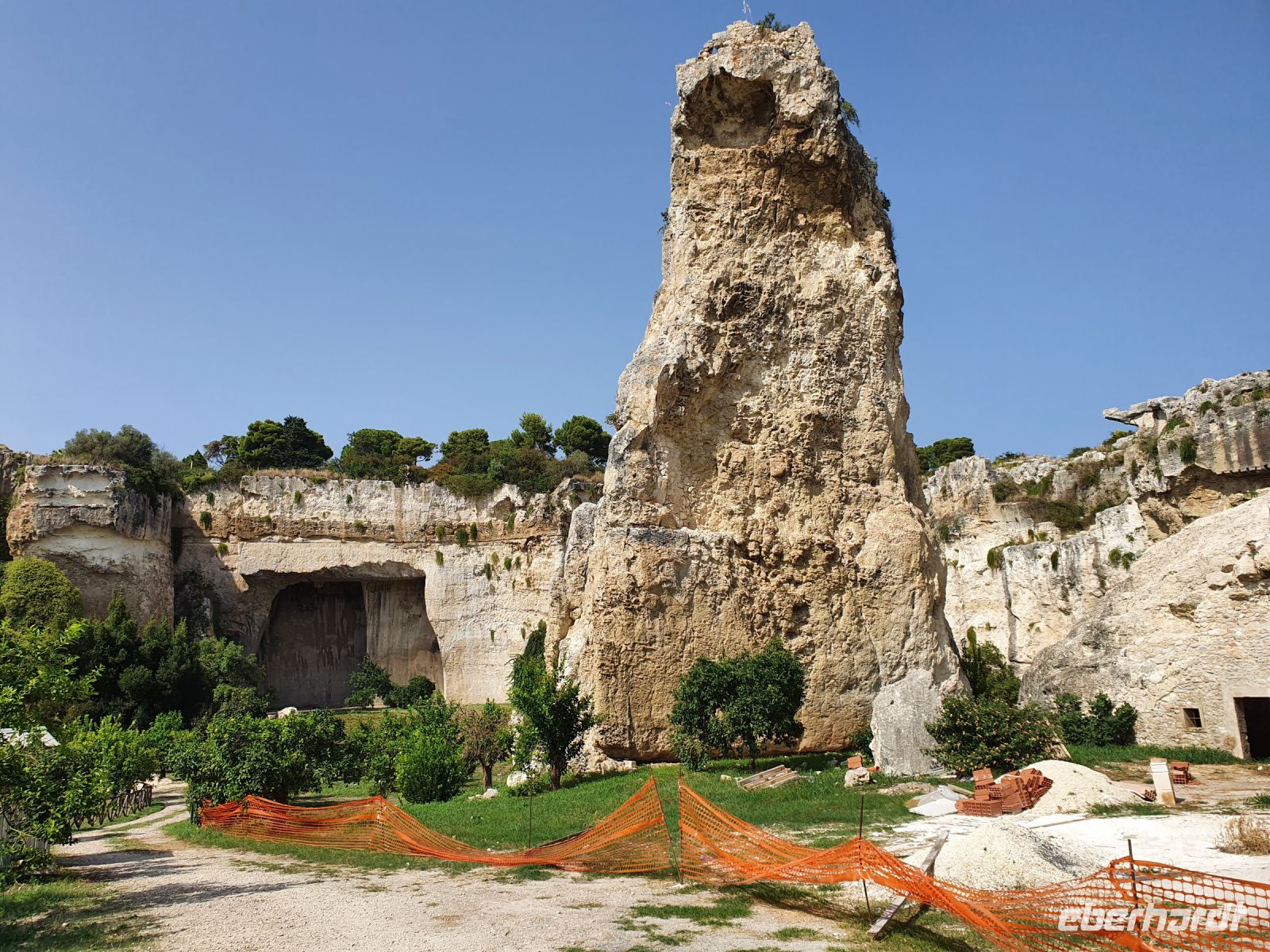 Auf der 2 stündigen Autobahnfahrt erhielt jeder Gast sein Adiogerät, welches auf der ganzen Reise bei Besichtigungen eine große Erleichterung beim Zuhören und Verstehen brachte. In Syrakus begannen wir unsere Besichtigung in der archäologischen Zone. Zunächst besuchten wir den ehemaligen Steinbruch und ausgerüstet mit Helmen durften wir sogar die Seilergrotte besichtigen. Dort sieht man sehr gut, wie große Blöcke aus dem Kalksteinfelsen für den Bau der antiken Gebäude herausgearbeitet wurden. Wieder ohne Helm stand die Grotte "Ohr des Dionysos" auf dem Programm und wir stimmten ein Lied an, um die tolle Akkustik zu erleben. Im höheren Teil der archeologischen Zone liegt das griechische Theater, welches im Sommer noch zu Aufführungen genutzt wird und von wo man einen schönen Ausblick auf die Bucht von Syrakus hat.