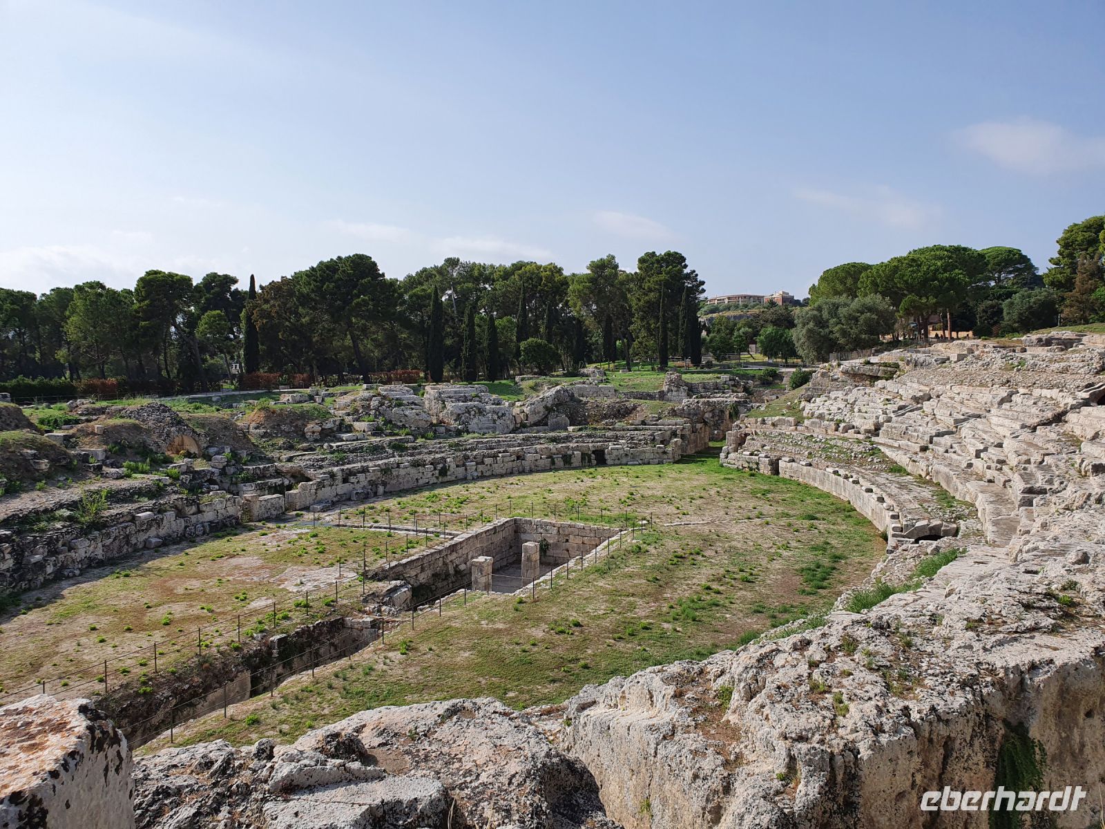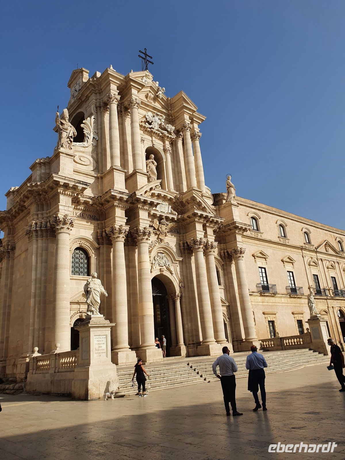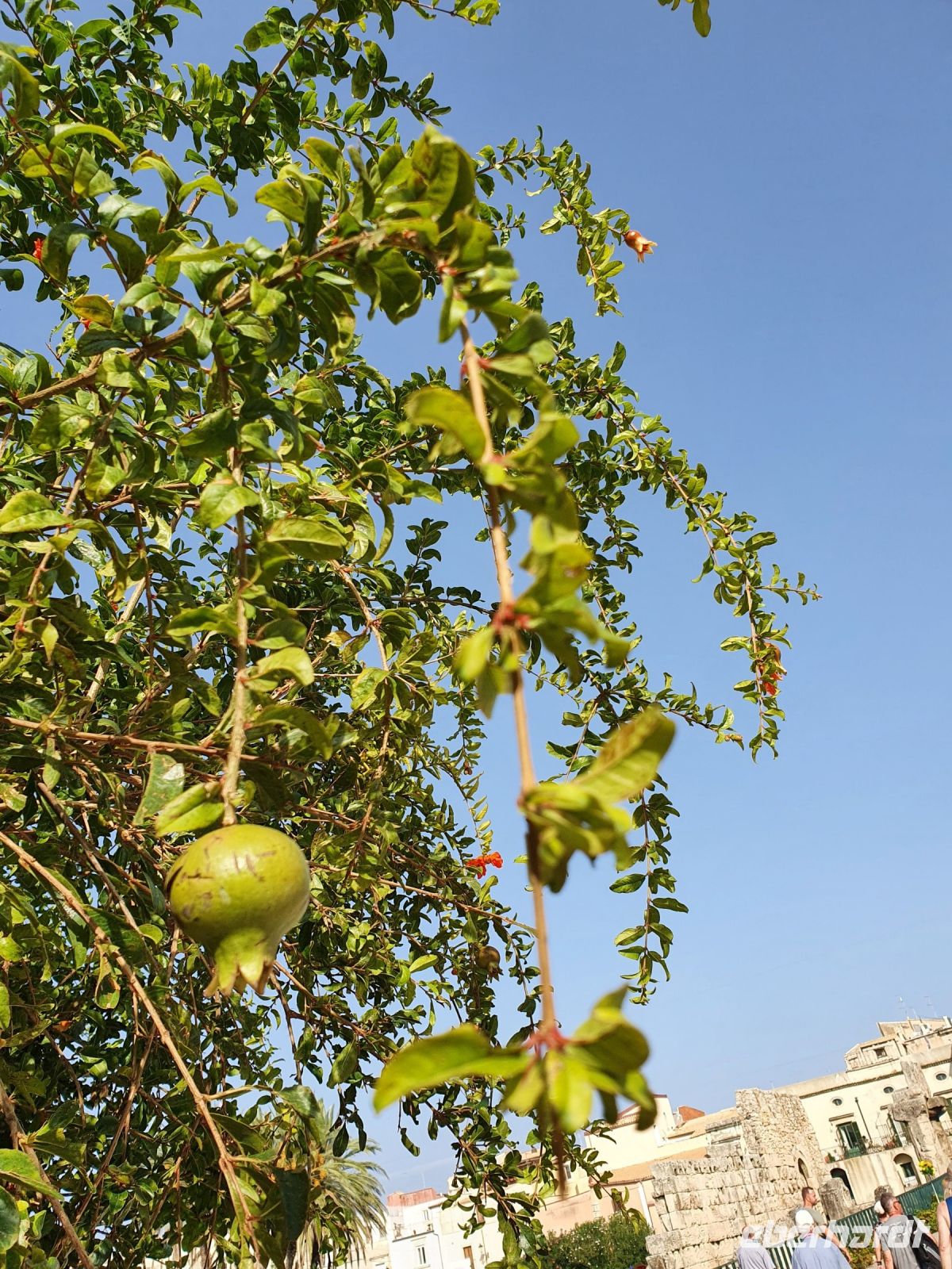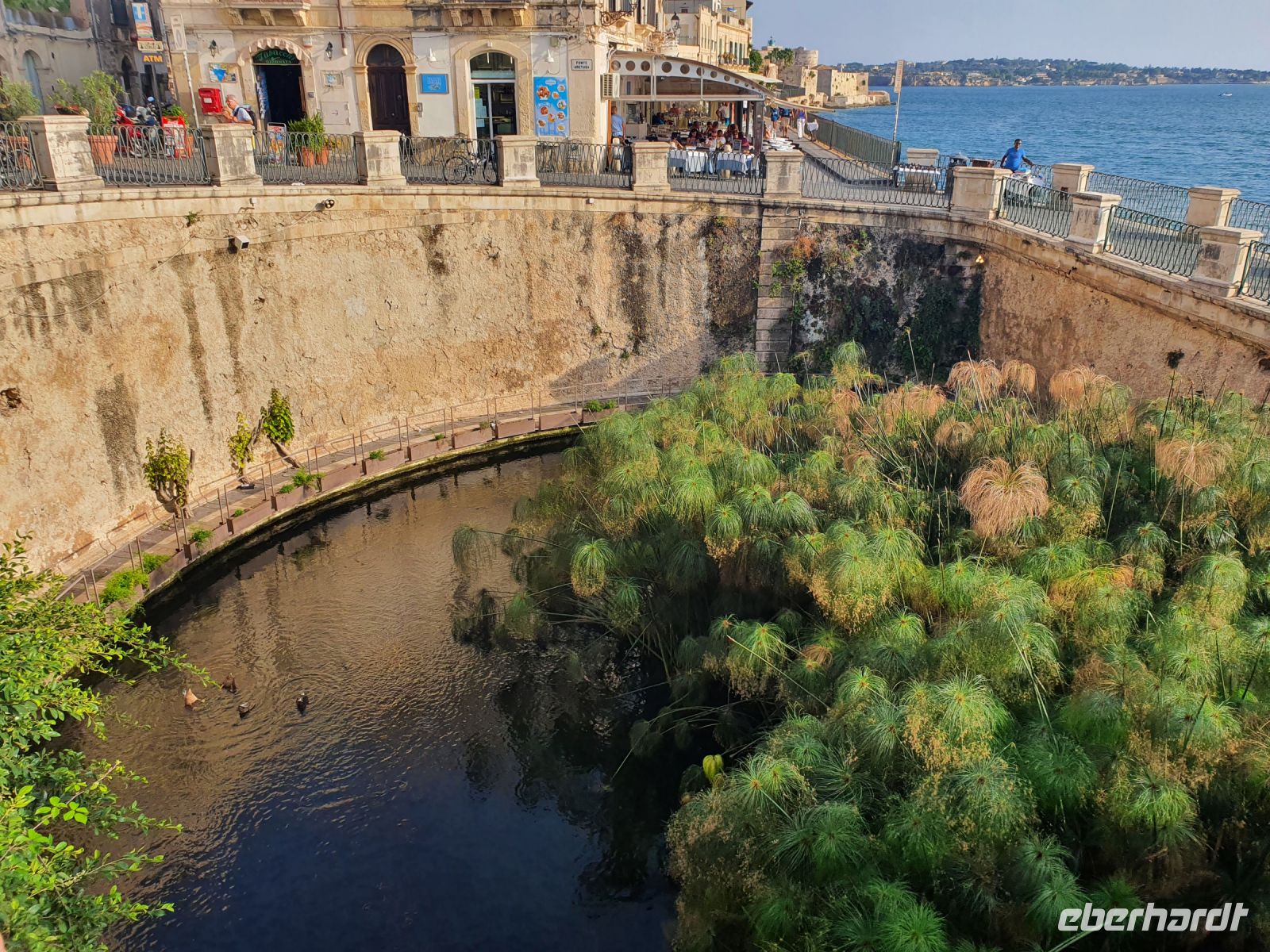 Mit unserem Bus fuhren wir ein kurzes Stück in Syrakus und gingen zu Fuss auf die Insel Ortigia. Dort steht gleich am Anfang der Altstadt der Apollontempel aus dem 6.Jahrhundert vor Ch. Er war einer der ersten und größten Ringhallentempel von Groß Griechenland. Später wurde er umgebaut in eine christliche Kirche, unter den Arabern in eine Moschee und danach wieder in eine Kirche. Das zweite historisch bedeutende Bauwerk in der Altstadt Ortigia ist der Dom, in dessen Bau der alte Athene Tempel integriert wurde und dieses Bauwerk damit einzigartig macht. Auf unserem weiteren Rundgang durch die Altstadt sahen wir die Arethusa Quelle. Der Sage nach floh Arethusa vor einem lüsternen Flussgott und wurde in eine Quelle verwandelt. Für die Stadtgründung von Syrakus auf der Insel Ortigia hatte diese Süsswasserquelle zudem eine extenzielle Bedeutung.