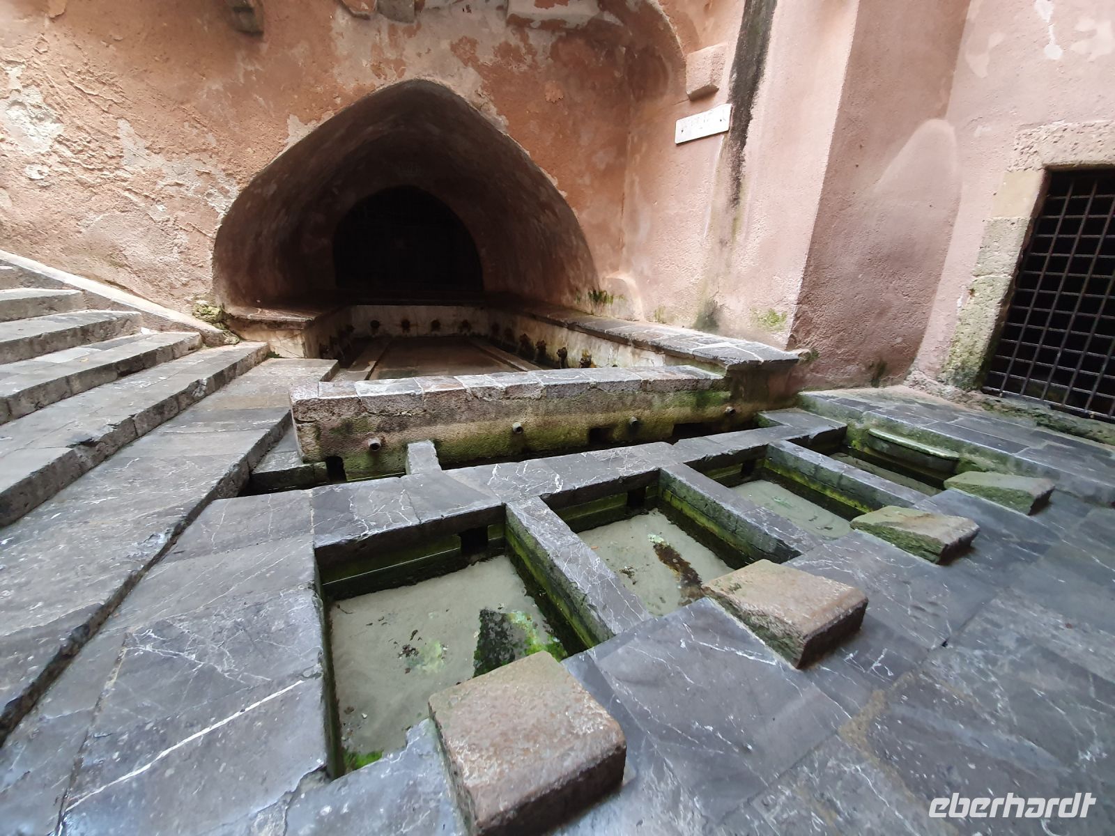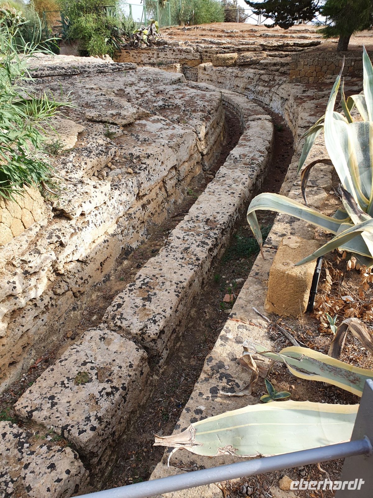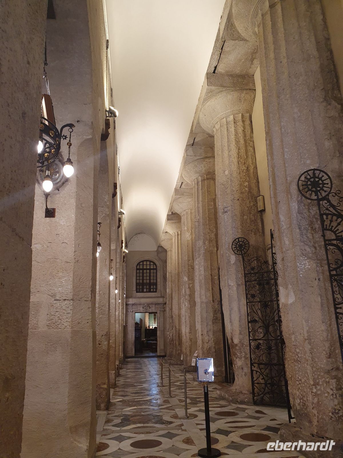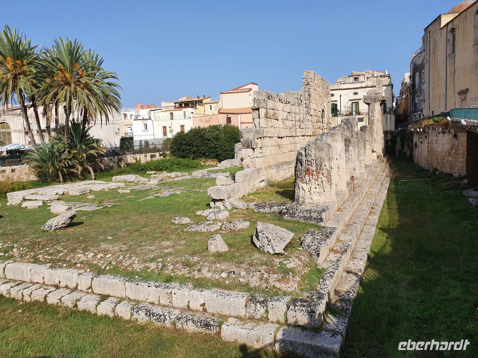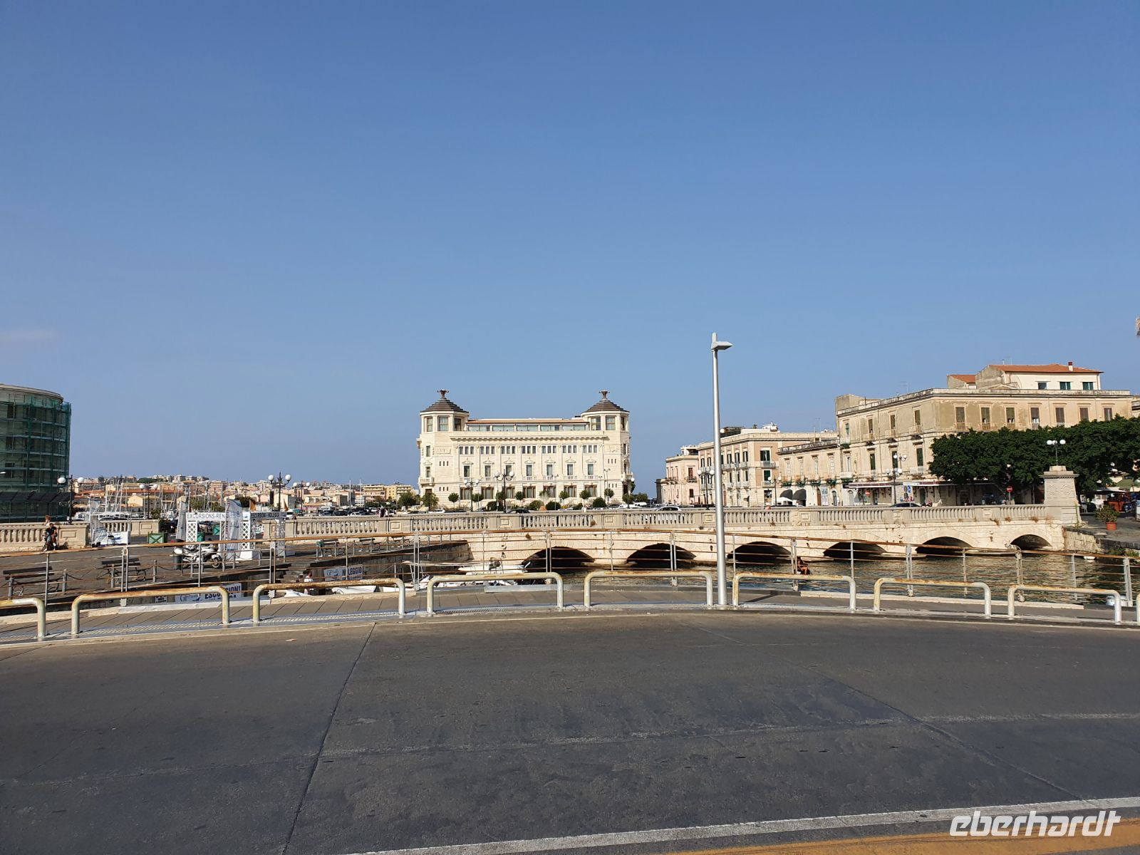 Mit unserem Bus fuhren wir ein kurzes Stück in Syrakus und gingen zu Fuss auf die Insel Ortigia. Dort steht gleich am Anfang der Altstadt der Apollontempel aus dem 6.Jahrhundert vor Ch. Er war einer der ersten und größten Ringhallentempel von Groß Griechenland. Später wurde er umgebaut in eine christliche Kirche, unter den Arabern in eine Moschee und danach wieder in eine Kirche. Das zweite historisch bedeutende Bauwerk in der Altstadt Ortigia ist der Dom, in dessen Bau der alte Athene Tempel integriert wurde und dieses Bauwerk damit einzigartig macht. Auf unserem weiteren Rundgang durch die Altstadt sahen wir die Arethusa Quelle. Der Sage nach floh Arethusa vor einem lüsternen Flussgott und wurde in eine Quelle verwandelt. Für die Stadtgründung von Syrakus auf der Insel Ortigia hatte diese Süsswasserquelle zudem eine extenzielle Bedeutung.