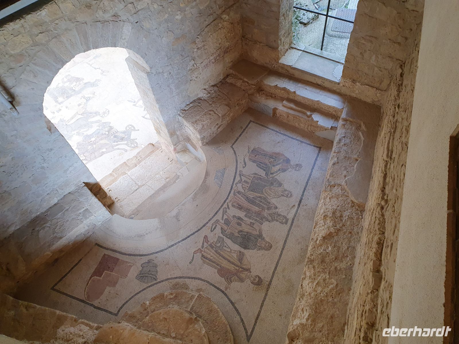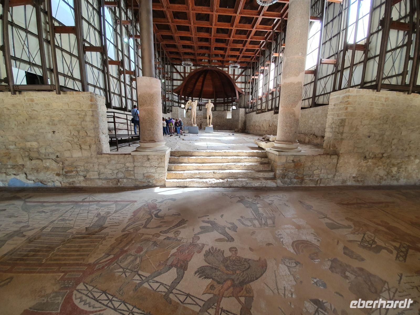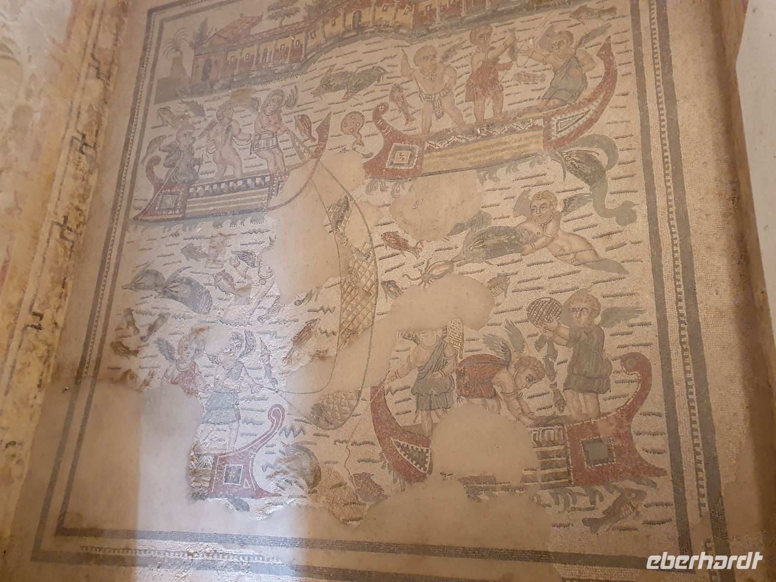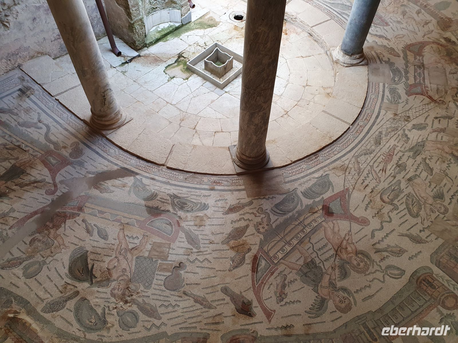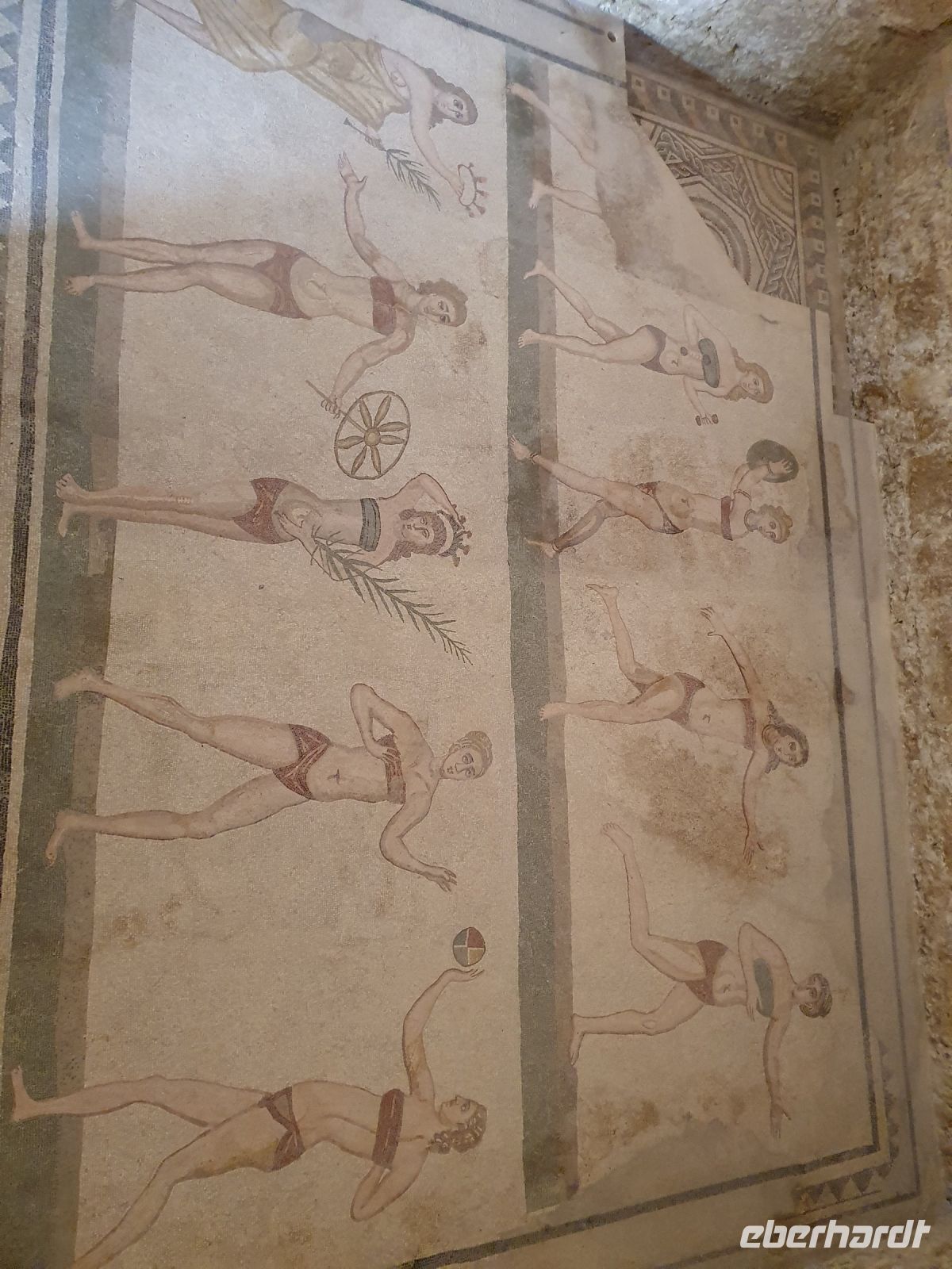 Die römische Villa liegt nahe der Stadt Piazza Armerina im Landesinneren. Sie war der Wohnsitz einer reichen römischen Adelsfamilie und der Bau geht auf das 4.Jahrhundert zurück. Im 12.Jahrhundert wurde der Wohnkomplex bei einem Erdrutsch verschüttet und so konserviert. Heute sind nach umfangreicher Restaurierung auf 3500 qm wunderschöne Bodenmosaike zu bestaunen. Neben der großen und der kleinen Jagd sind die "Bikini Mädchen", die aber Fünfkämpferinnen darstellen sollen, die bekanntesten Motive. Es können die Mosaike von 45 Räumen bestaunt werden und nach der letzten Rekonstruktion hat der Komplex ein festes Dach erhalten, um die Mosaike vor Witterungsunbilden zu schützen. Zur Mittagspause fuhren wir nach Piazza Armerina in ein kleines gemütliches famielien geführtes Lokal.