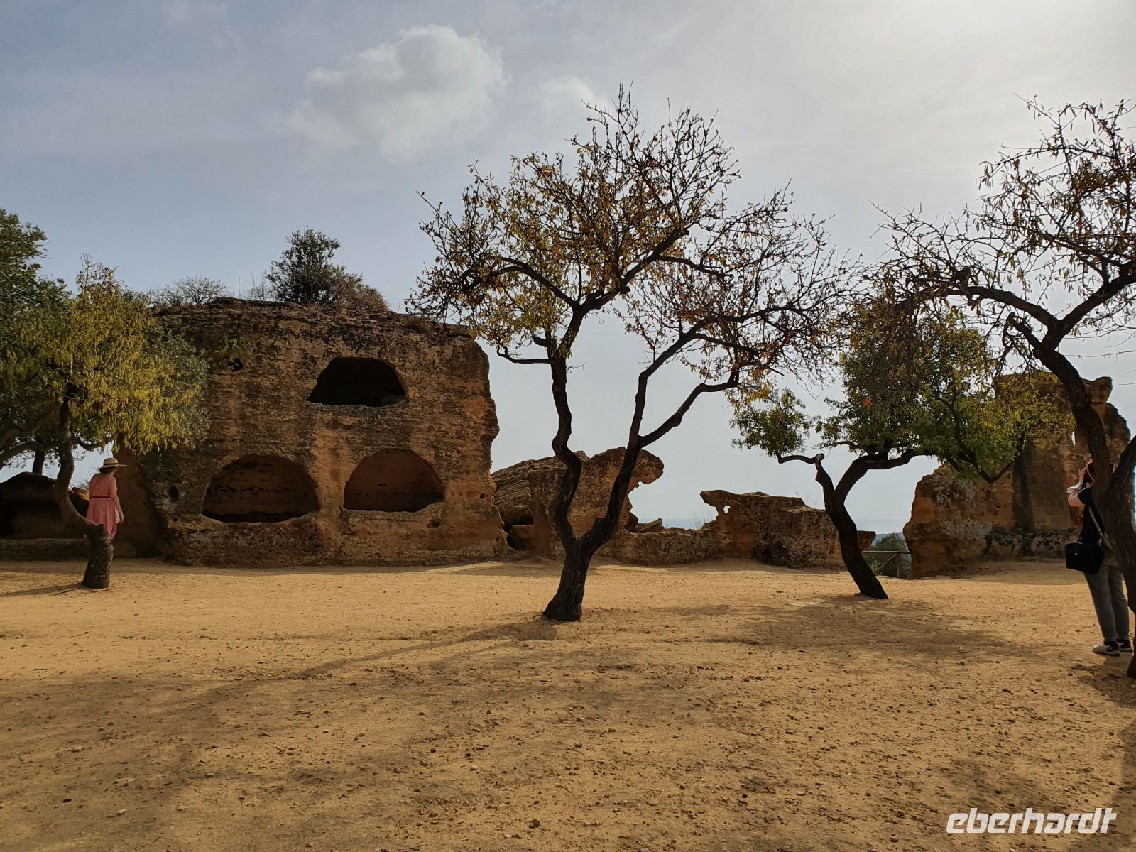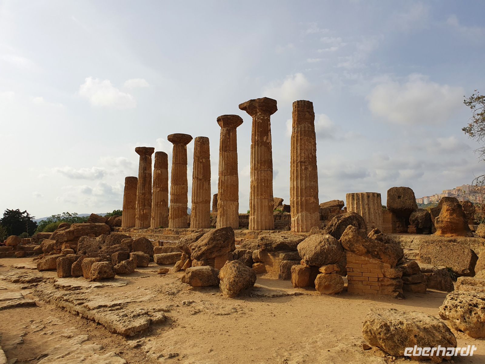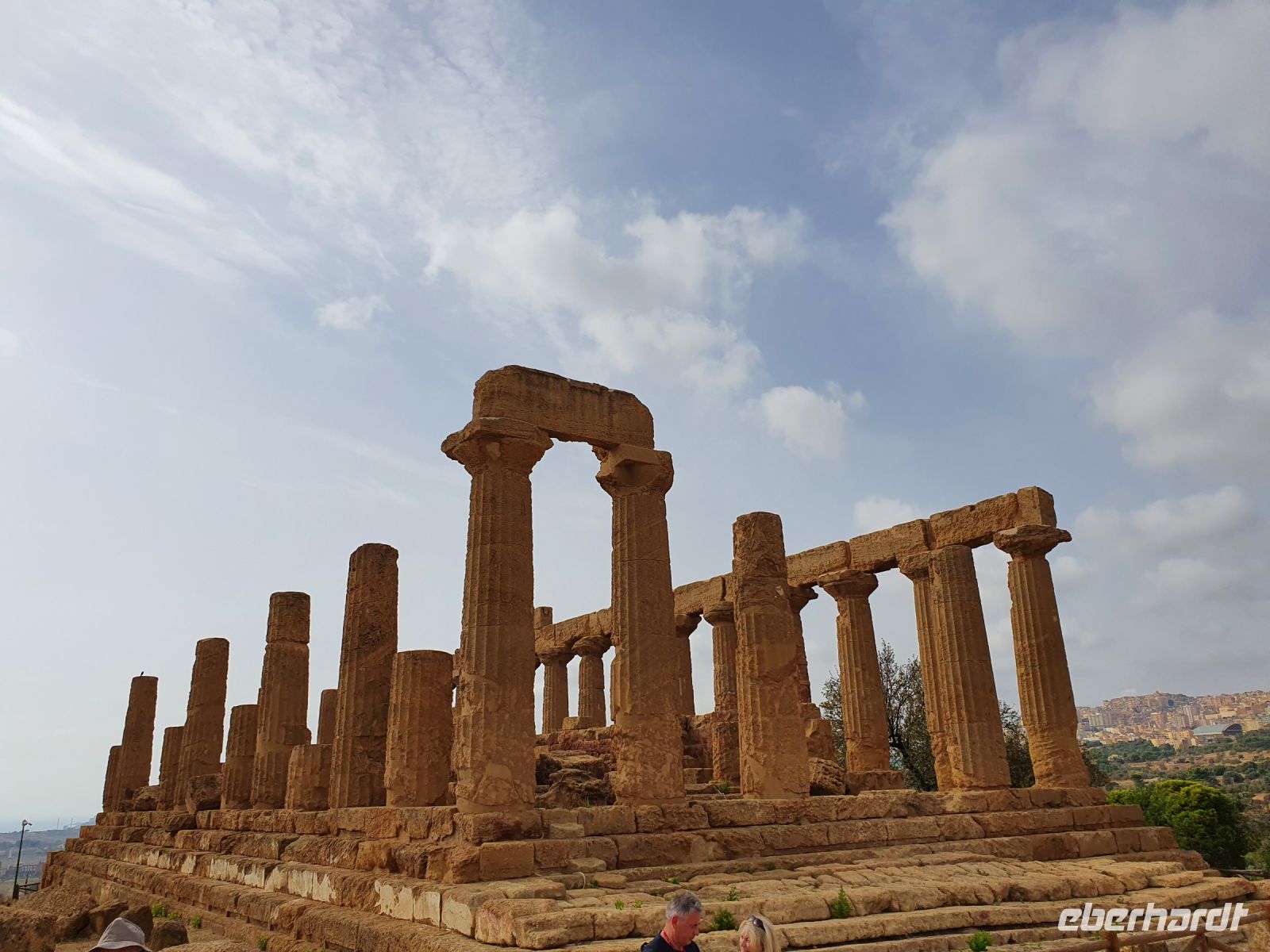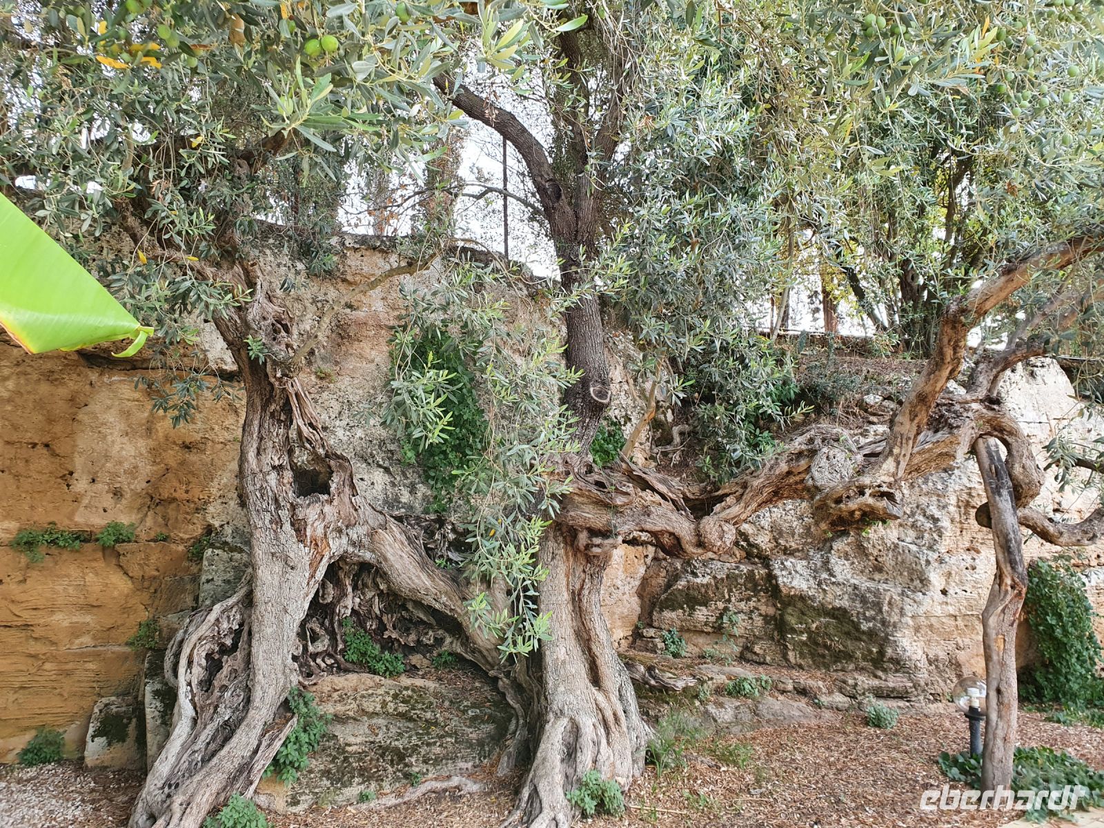 Am Nachmittag erreichten wir die Südwestküste und besuchten ein weiteres UNESCO Kulturerbe, das Tal der Tempel bei Agrigent. Schon Johann Wolfgang Goethe war hier und beschreibt die Tempel in seiner italienischen Reise. Die Tempel stehen auf einem leicht abfallenden Höhenzug vor den Toren der heutigen Stadt Agrigent. Wir begannen unsere Besichtigung am höchsten Punkt mit dem Hera Tempel. Auf dem Weg zum Tempel kommt man am ältesten Olivenbaum Siziliens vorbei. Vom Hera Tempel bis zum Concordia Tempel geht man entlang der ehemaligen Stadtmauer, in die später Nekropolen geschlagen wurden. Der Concordia Tempel ist der am besten erhaltende Tempel der griechischen Antike. In der Nähe des Ausganges stehen die 8 Säulen des wieder errichteten Herakles Tempels und tief eingeschnittene Wagenspuren können bestaunt werden. Auf der anderen Straßenseite liegt das Trümmerfeld es einstigen Zeus Tempels, auch Olylieion genannt. Nach dem Sieg über die Karthager 480 v.Ch. wurde hier ein dorischer Tempel von rießigen Ausmaßen errichtet und zur Stabilisierung sogenannte Telamone - 8 m hohe Figuren von Giganten - als Stützen eingesetzt. Einen liegenden Telamon kann man sehen zwischen den Trümmern. Nach der beeindruckenden Besichtigung fuhren wir zu unserer nächsten Unterkunft in einem Agriturismo mit dem Namen Case di Latomie. Ein herrschaftlicher Landsitz wurde für Touristen geöffnet, die Zimmer mit dem üblichen Standard ausgerüstet und im Restaurant wurden typische Speisen aus der Region serviert. Es war ein Ort zum Wohlfühlen und gern wären wir länger da geblieben.