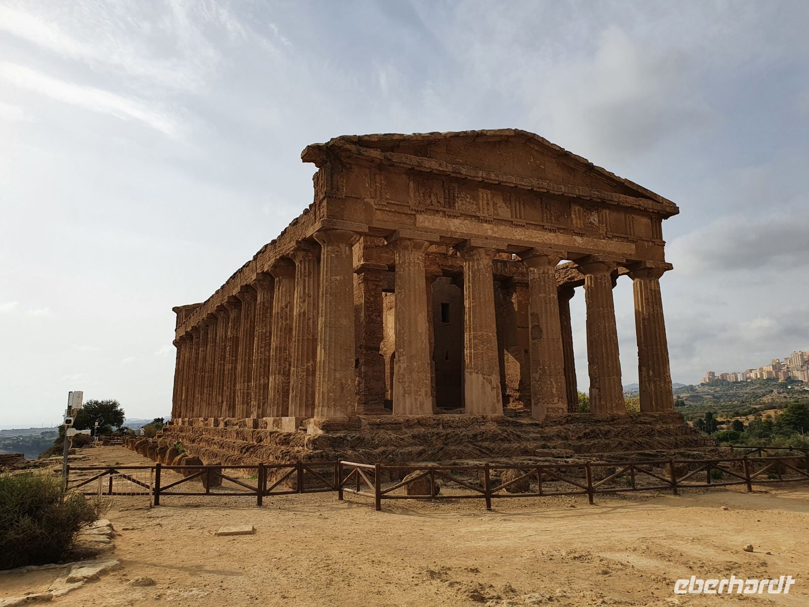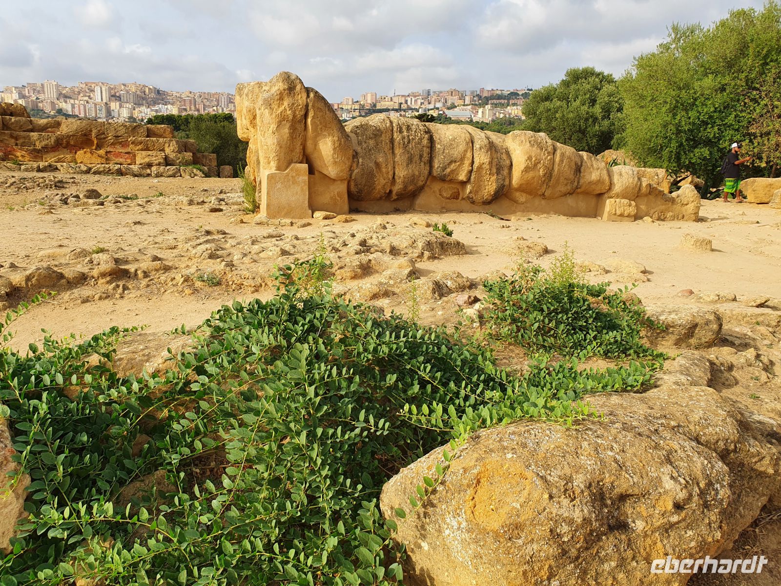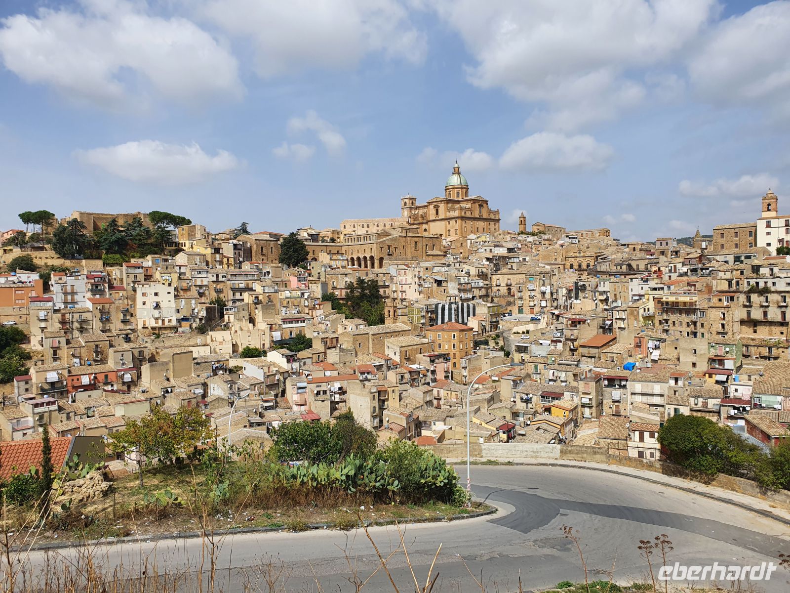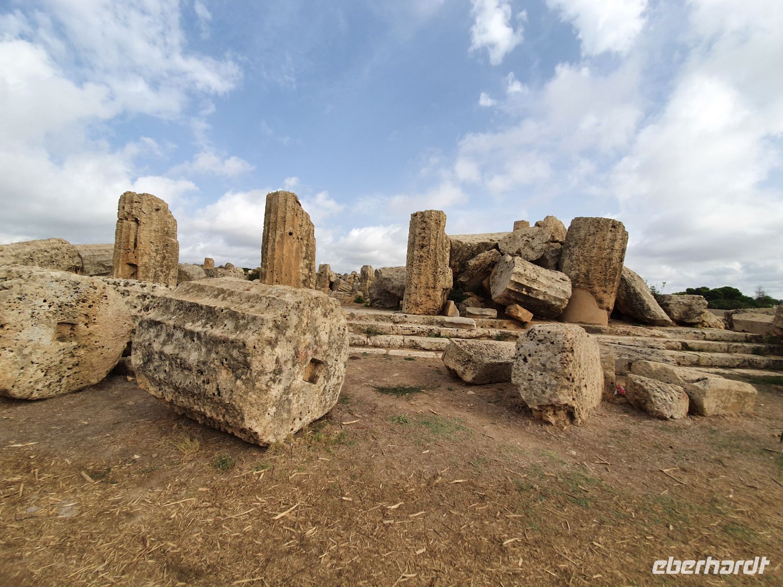 Am Nachmittag erreichten wir die Südwestküste und besuchten ein weiteres UNESCO Kulturerbe, das Tal der Tempel bei Agrigent. Schon Johann Wolfgang Goethe war hier und beschreibt die Tempel in seiner italienischen Reise. Die Tempel stehen auf einem leicht abfallenden Höhenzug vor den Toren der heutigen Stadt Agrigent. Wir begannen unsere Besichtigung am höchsten Punkt mit dem Hera Tempel. Auf dem Weg zum Tempel kommt man am ältesten Olivenbaum Siziliens vorbei. Vom Hera Tempel bis zum Concordia Tempel geht man entlang der ehemaligen Stadtmauer, in die später Nekropolen geschlagen wurden. Der Concordia Tempel ist der am besten erhaltende Tempel der griechischen Antike. In der Nähe des Ausganges stehen die 8 Säulen des wieder errichteten Herakles Tempels und tief eingeschnittene Wagenspuren können bestaunt werden. Auf der anderen Straßenseite liegt das Trümmerfeld es einstigen Zeus Tempels, auch Olylieion genannt. Nach dem Sieg über die Karthager 480 v.Ch. wurde hier ein dorischer Tempel von rießigen Ausmaßen errichtet und zur Stabilisierung sogenannte Telamone - 8 m hohe Figuren von Giganten - als Stützen eingesetzt. Einen liegenden Telamon kann man sehen zwischen den Trümmern. Nach der beeindruckenden Besichtigung fuhren wir zu unserer nächsten Unterkunft in einem Agriturismo mit dem Namen Case di Latomie. Ein herrschaftlicher Landsitz wurde für Touristen geöffnet, die Zimmer mit dem üblichen Standard ausgerüstet und im Restaurant wurden typische Speisen aus der Region serviert. Es war ein Ort zum Wohlfühlen und gern wären wir länger da geblieben.