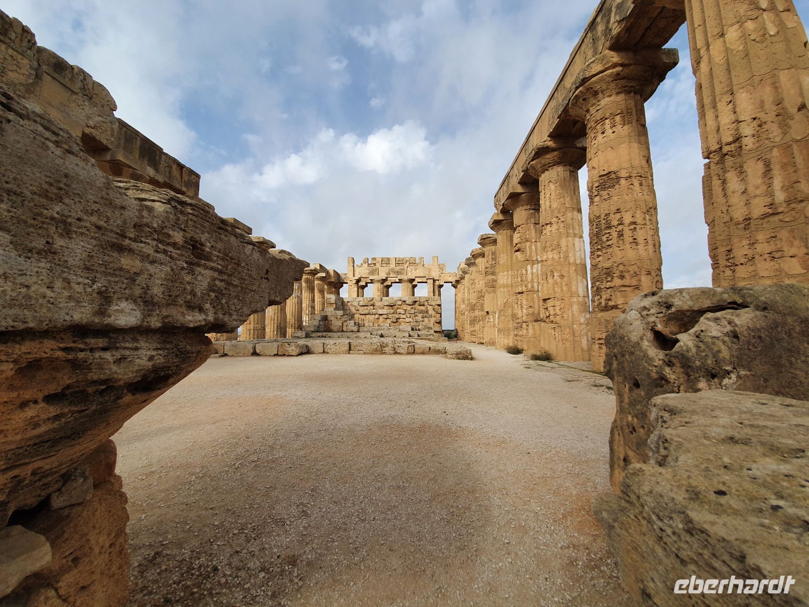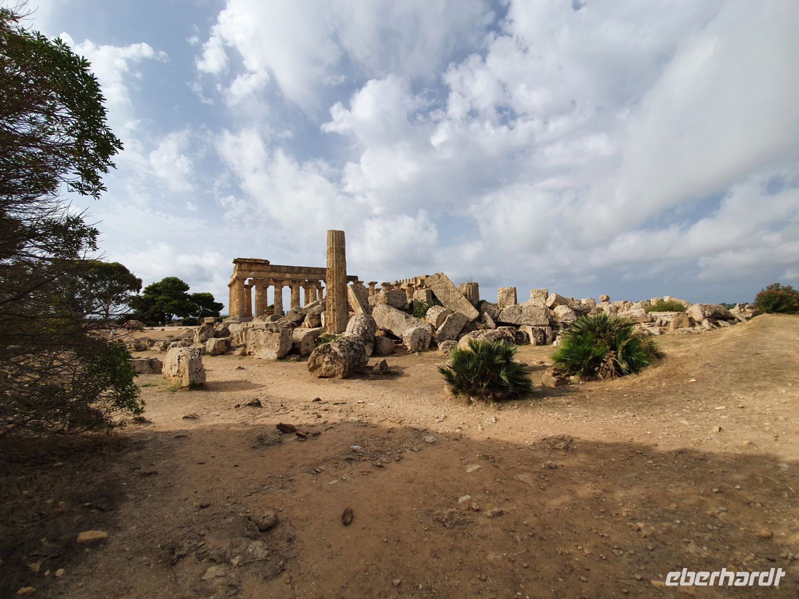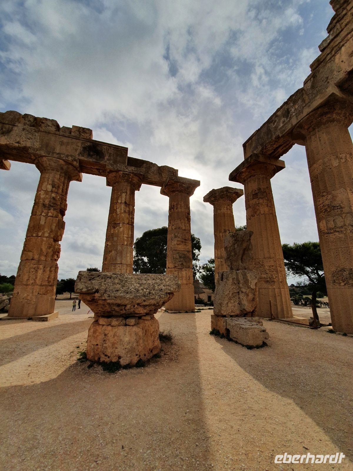 Gleich nach dem Frühstück begleitete uns der Chef Michele durch das Anwesen Case di Latomie, zeigte uns seinen ältesten Olivenbaum und informierte über die nachhaltige Produktion des Olivenöl. Die Case di Latomie wurde auf dem Gelände eines einstigen antiken Steinbruchs errichtet und so gedeihen die Olivenbäume und der Wein sehr gut auf dem kalkhaltigen Boden. Danach durften wir das Olivenöl auch probieren. Am Vormittag stand dann die Besichtigung von Selinunte auf dem Programm und nach einer kurzen Busfahrt kamen wir dort an.
