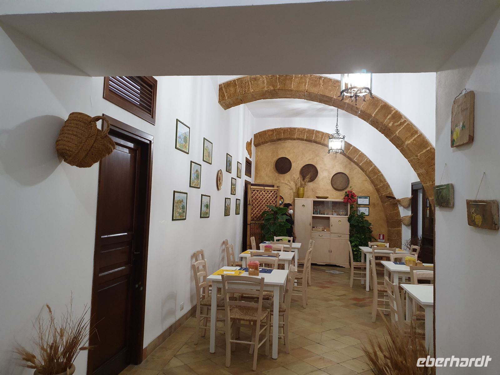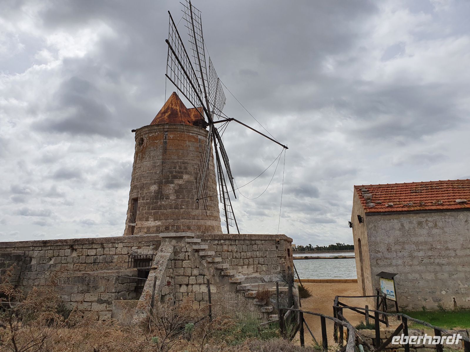 Diese einstige große und bedeutende griechische Stadt wurde durch ein Erdbeben mit anschließendem Tsunami zerstört und so gibt es keine Kenntnis darüber, wem die Tempel geweiht waren und man hat sie deshalb mit Buchstaben bezeichnet. Nur der Tempel E wurde wieder aufgebaut. Alle anderen Tempelüberreste liegen als Trümmer in dem riesigen Areal. An der Größe der Kapitelle kann man erahnen, welche Ausmaße die Tempel hatten. Der Blick geht über eine riesige Fläche bis zur Akropolis am Meer und so kann man sich gut vorstellen, dass einst 100000 Menschen hier lebten. Nach dieser beeindruckenden Besichtigung lud uns Renate auf ein Glas Prosecco ein, um auf ihr gerade geborenes Enkelkind anzustossen. Auf der Fahrt zum Mittagessen besuchten wir die Salinen im Raum Marsala/Trapani. Unser Mittagessen gab es in der Azienda Fontanasalsa. Im Innenhof begrüßte uns eine Sängerin mit Gitarre und das sehr schmackhafte Essen gab es dann in einem urigen Raum, der mit allerlei alten Gegenständen geschmückt war.