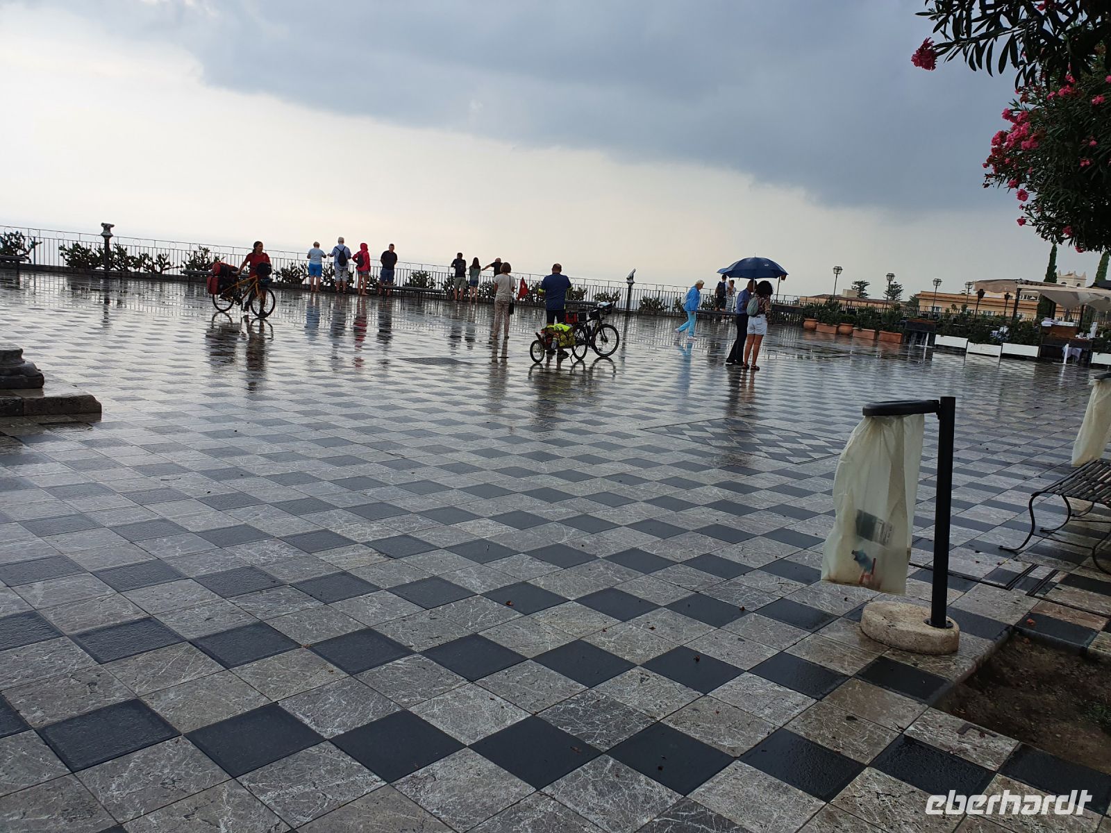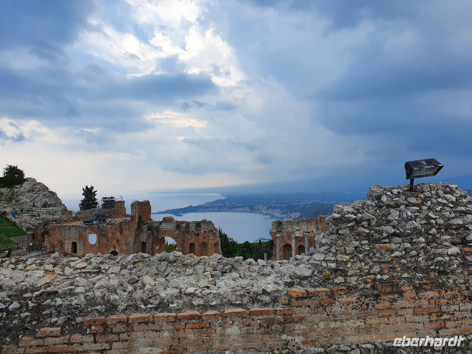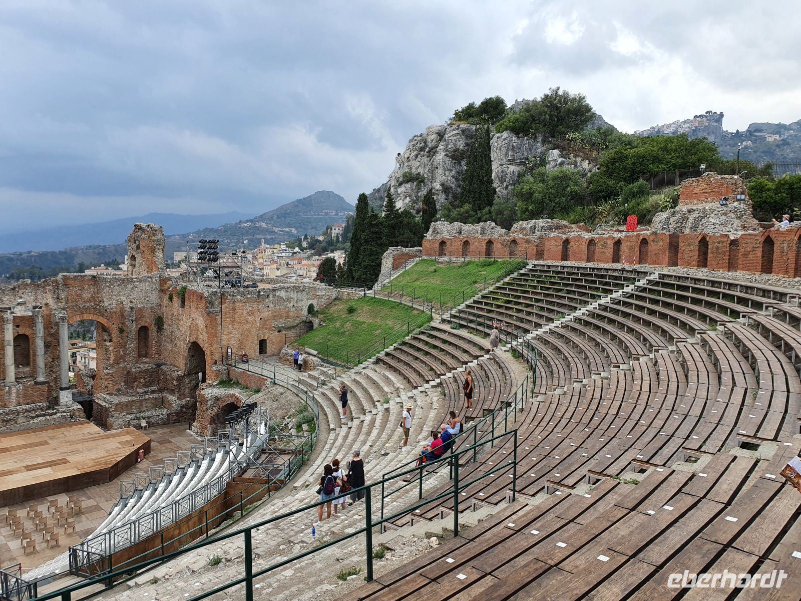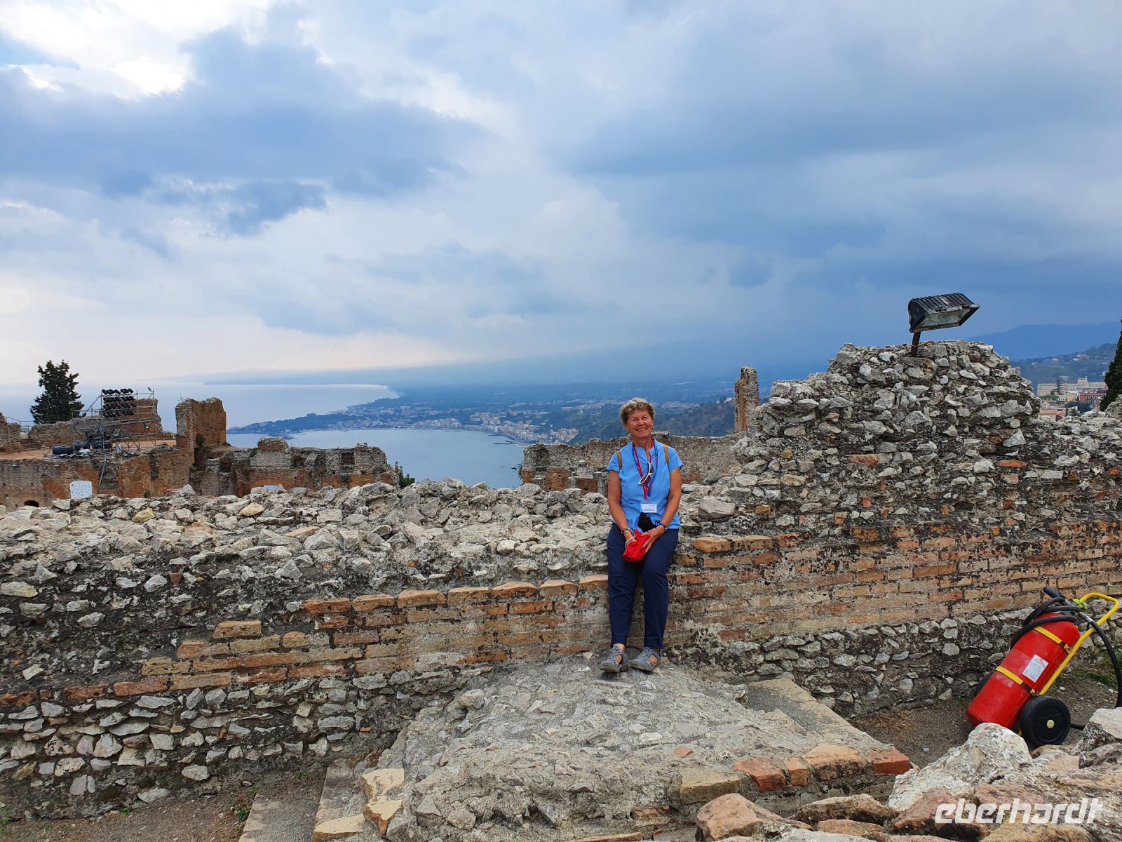 Ein letztes Mal stand ein Hotelwechsel an und so trafen wir uns mit Koffern am Bus. Wir fuhren ein Stück entlang der Nordküste und bei Tindari hinauf in die nebrodischen Berge. Unser erster Stopp war in Montalbano, wo Renate bei einem Spaziergang durch den Ort uns zur Entsiedlung der Bergorte informierte. 2015 war Montalbano das schönste Dorf Italiens. Dann fuhren wir noch ein Stück höher bis auf die Hochebene von Argimusco auf 960 m Höhe und spazierten zu den Megalithen auf der Hochebene. Löwe und Adler waren die beeindruckendsten Formationen und von da oben hatte man eine tolle Sicht in die Umgebung. Lediglich der Ätna versteckte sich hinter einer Wolke. Auf der Weiterfahrt querten wir mehrfach die Gleise der Schmalspurbahn, die den Ätna umrundet. Zum Mittagessen wurde unsere Gruppe im Agriturismo Borgo San Nicolao erwartet. Bei einem Rundgang sahen wir die Stallungen der Pferde, die Weinpresse, das Käselager und beim Mittagessen gab es all diese Köstlichkeiten auf einem Bufett zum Probieren. Nun stand schon unsere letzte gemeinsame Besichtigung ujserer Reise an. Wir fuhren nach Taormina und verließen unseren Bus in einer Kehre bei der Hochfahrt, spazierten durch einen Park und kamen zum griechische Theater. Auch dort waren nur wenige Touristen unterwegs und so war die Besichtigung sehr angenehm. Das Theater wurde von den Griechen errichtet und von den Römern übernommen und erweitert. Heute finden im Sommer Konzerte statt und die Kulisse mit Blick zum Ätna, auf die Bucht von Giardini Naxos und auf Taormino sind einzigartig. Auf dem Rückweg gönnten wir uns ein letztes Eis und in der Stadt Taormina hatten wir ausreichend Zeit für eigene Erkundungen. Danach fuhren wir zurück in unser Hotel Olimpo, verabschiedeten uns von Renate und Guiseppe und dankten beiden für die tolle Betreuung auf unserer Rundreise durch Sizilien. Im Hotelrestaurant trafen wir uns dann zum letzten gemeinsamen Abendessen.