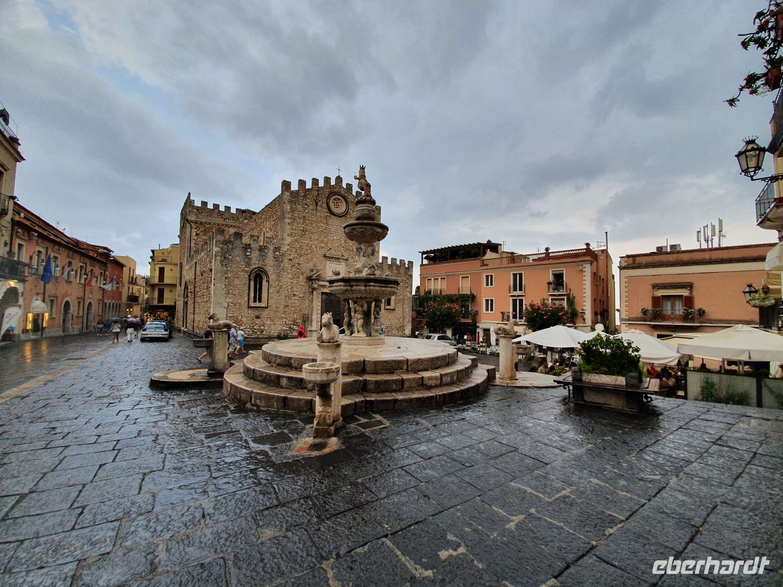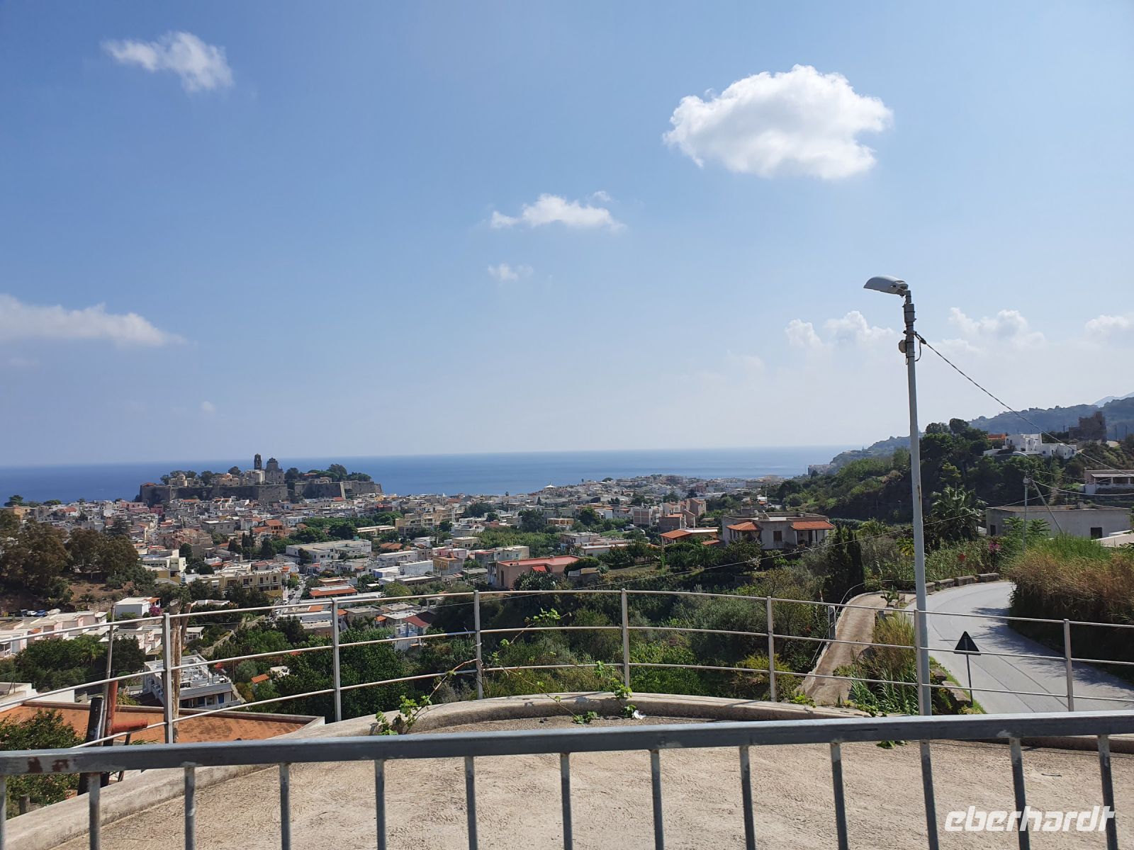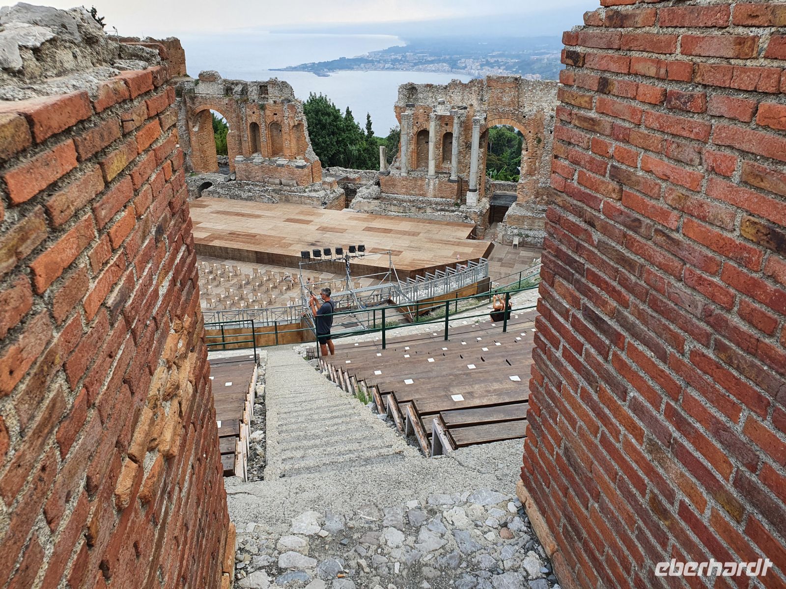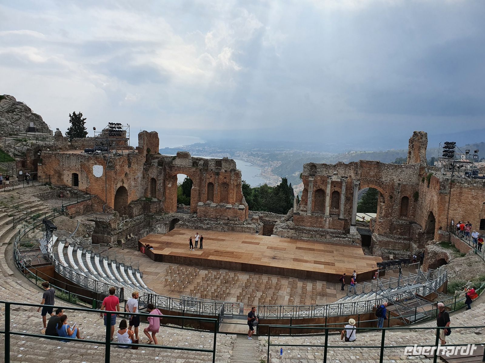 Ein letztes Mal stand ein Hotelwechsel an und so trafen wir uns mit Koffern am Bus. Wir fuhren ein Stück entlang der Nordküste und bei Tindari hinauf in die nebrodischen Berge. Unser erster Stopp war in Montalbano, wo Renate bei einem Spaziergang durch den Ort uns zur Entsiedlung der Bergorte informierte. 2015 war Montalbano das schönste Dorf Italiens. Dann fuhren wir noch ein Stück höher bis auf die Hochebene von Argimusco auf 960 m Höhe und spazierten zu den Megalithen auf der Hochebene. Löwe und Adler waren die beeindruckendsten Formationen und von da oben hatte man eine tolle Sicht in die Umgebung. Lediglich der Ätna versteckte sich hinter einer Wolke. Auf der Weiterfahrt querten wir mehrfach die Gleise der Schmalspurbahn, die den Ätna umrundet. Zum Mittagessen wurde unsere Gruppe im Agriturismo Borgo San Nicolao erwartet. Bei einem Rundgang sahen wir die Stallungen der Pferde, die Weinpresse, das Käselager und beim Mittagessen gab es all diese Köstlichkeiten auf einem Bufett zum Probieren. Nun stand schon unsere letzte gemeinsame Besichtigung ujserer Reise an. Wir fuhren nach Taormina und verließen unseren Bus in einer Kehre bei der Hochfahrt, spazierten durch einen Park und kamen zum griechische Theater. Auch dort waren nur wenige Touristen unterwegs und so war die Besichtigung sehr angenehm. Das Theater wurde von den Griechen errichtet und von den Römern übernommen und erweitert. Heute finden im Sommer Konzerte statt und die Kulisse mit Blick zum Ätna, auf die Bucht von Giardini Naxos und auf Taormino sind einzigartig. Auf dem Rückweg gönnten wir uns ein letztes Eis und in der Stadt Taormina hatten wir ausreichend Zeit für eigene Erkundungen. Danach fuhren wir zurück in unser Hotel Olimpo, verabschiedeten uns von Renate und Guiseppe und dankten beiden für die tolle Betreuung auf unserer Rundreise durch Sizilien. Im Hotelrestaurant trafen wir uns dann zum letzten gemeinsamen Abendessen.