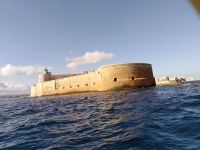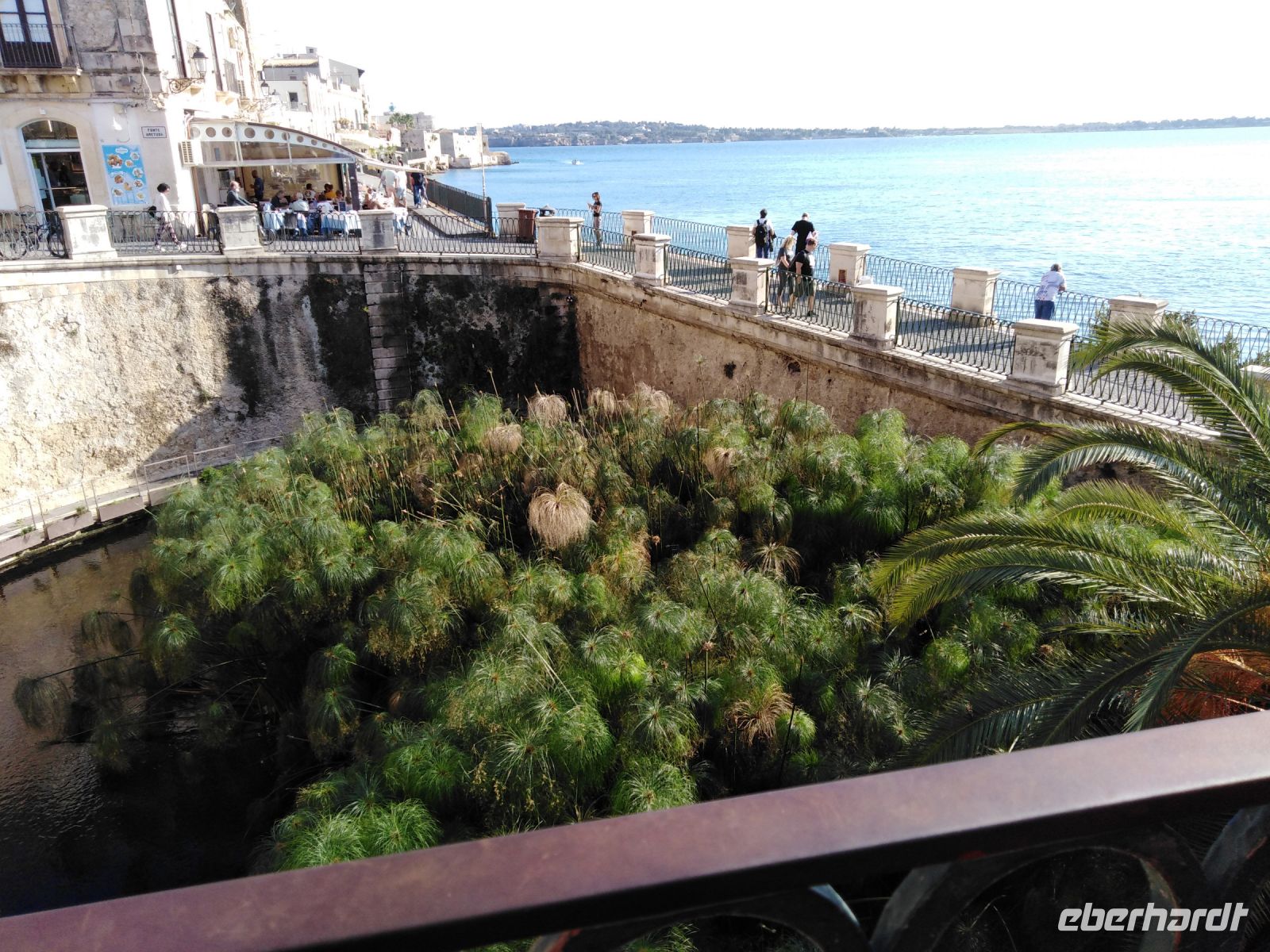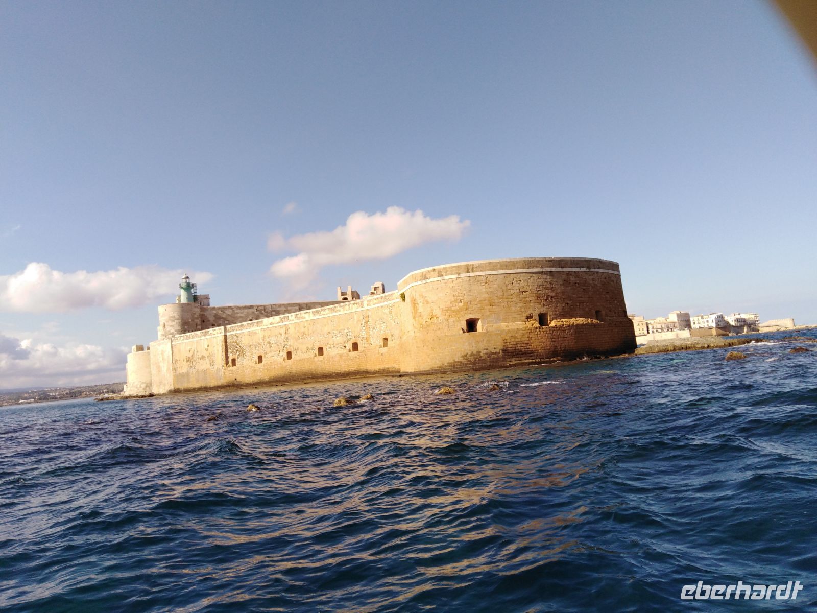 Außen und im Inneren der nunmehr barocken Kathedrale sind die Säulen des ehemaligen Athena-Tempels genau zu erkennen. Bemerkenswert ist, dass den Ostgiebel des Tempels ein großes, goldenes Rundschild schmückte, dass über das Meer weithin von der Macht der Erbauer kündete. Anschließend fuhren wir mit einem Boot an der Küste von Syracus entlang, wir sahen die Kalksteinfelsen, auf denen Syracus entstanden ist und die Stauferfestung Castello Maniace. Auf dem Rückweg zum Bus sahen wir uns noch den Fonte Aretusa an und gelangten bald zum Parkplatz.