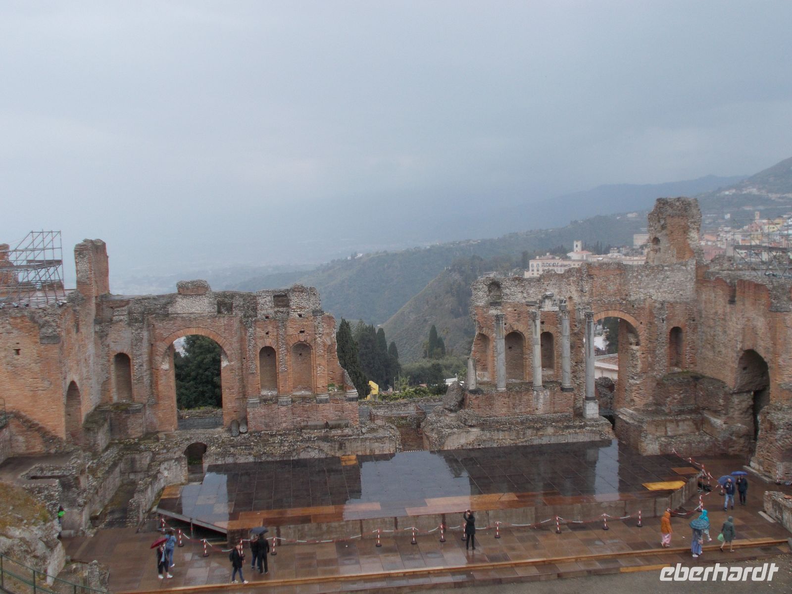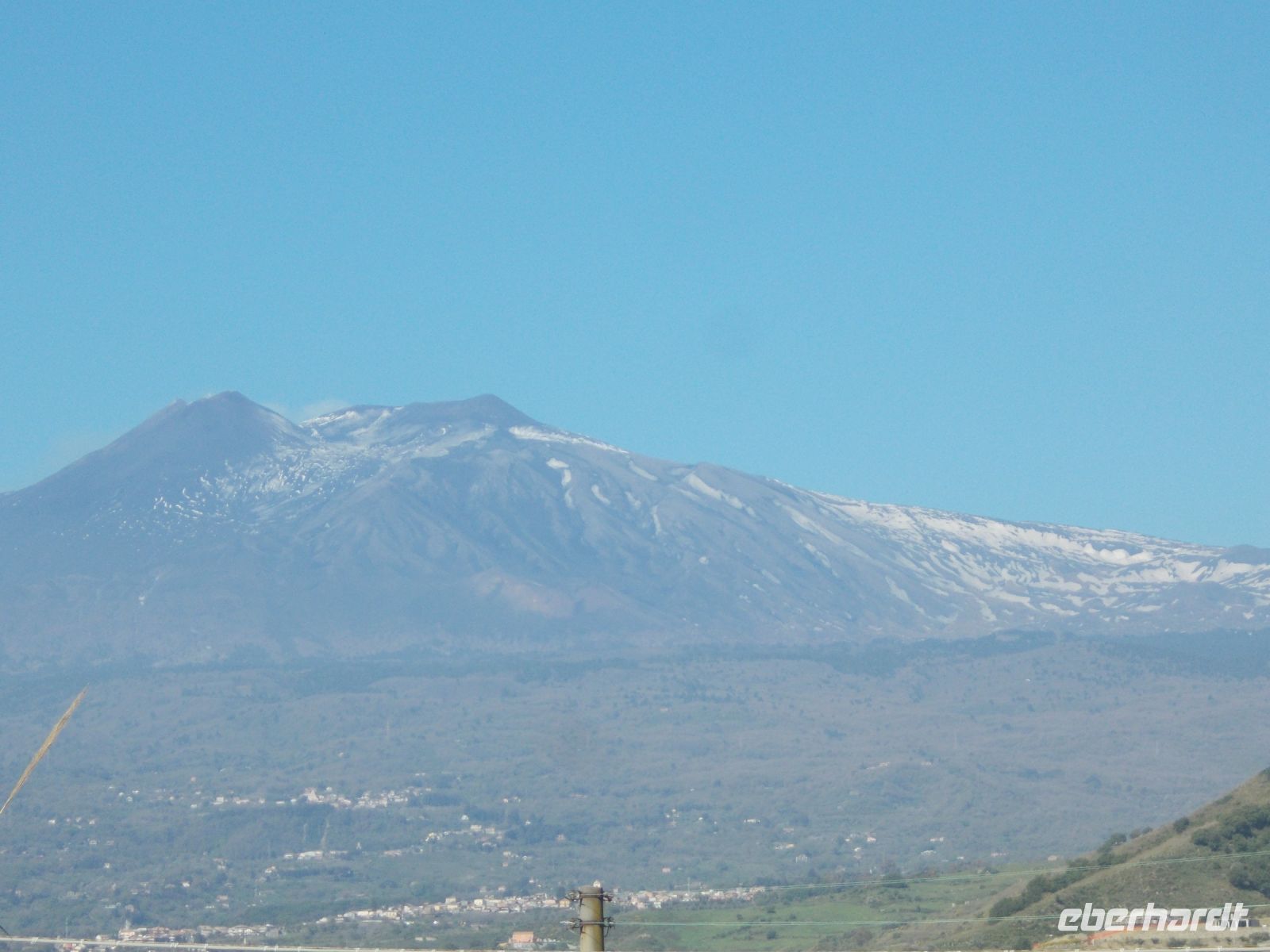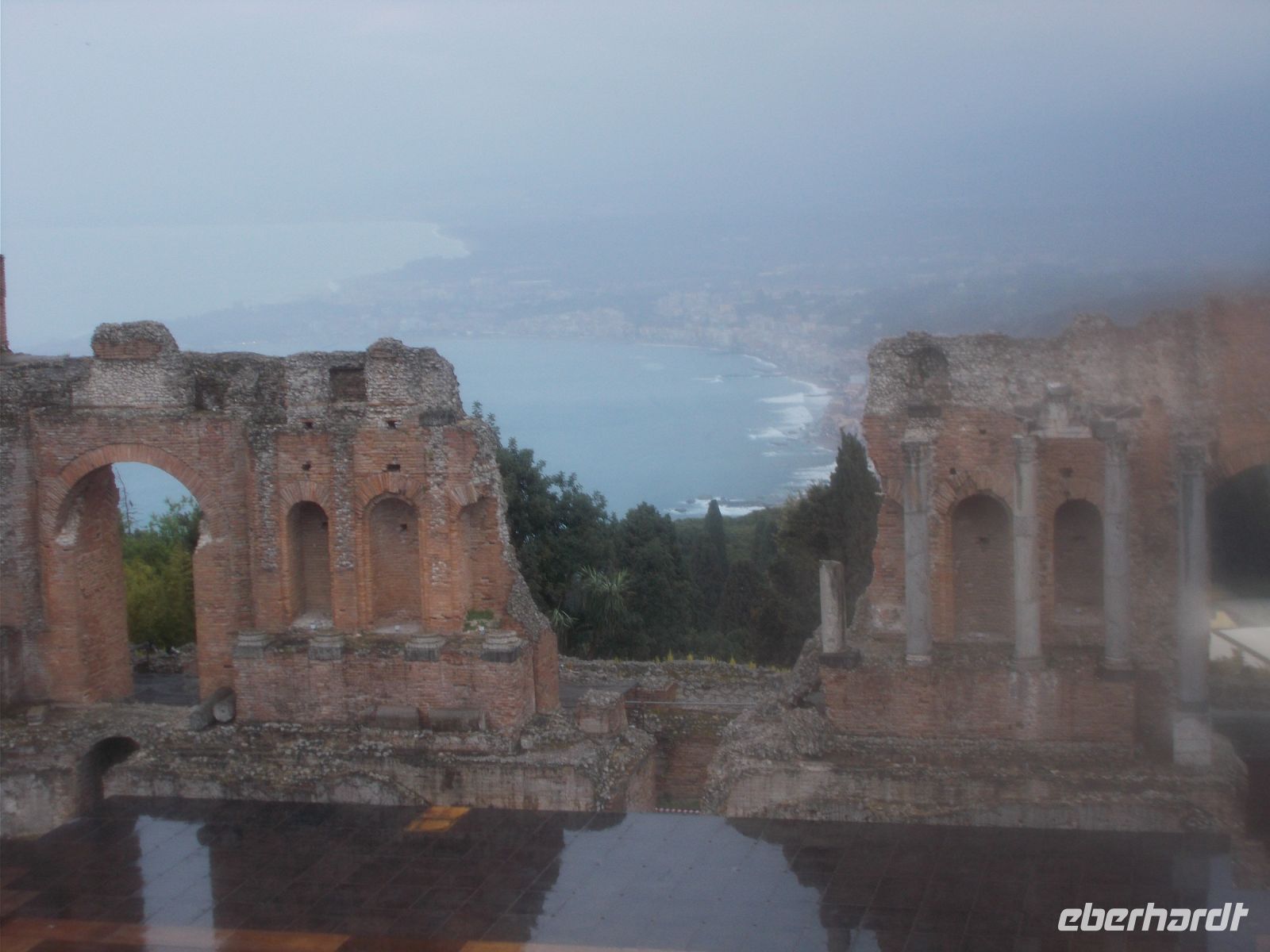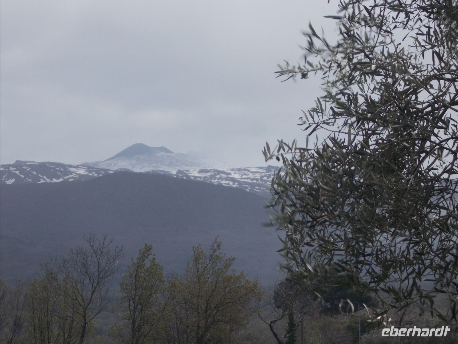 Der Ätna ist eigentlich der Höhepunkt jeder Sizilienreise. Für uns gleich am ersten Tag geplant. Im Flieger und bei der Fahrt zum Hotel ,hatten wir schon einen kleinen Vorgeschmack vom „Berg der Berge“. Leider gibt sich der Mongibello gern als Diva und verhüllt sich im Nebl .So auch heute. Eine Gruppe beschloss trotzdem die Auffahrt, mit der Seilbahn, die leider keine gute Sicht brachte. Eine andere Gruppe entschloss sich ,zu einer kleinen Wanderung um den unteren Silvestri Krater. Leider wurde wir auch hier vom Schnee und Regen eingeholt. Nach und nach fand sich die Gruppe ,in einem Bistro, zum Cappuccino ein.Das war unser Abenteuer „Ätna“ohne ihn wirklich zu sehen. Die Stadt Zaffarena ,unterhalb des Ätnas gelegen, ist bekannt für „den besten Honig Siziliens“und dies wollten wir „er-kosten“.Es schmeckte alles vorzüglich und so landete manches Honigglas im Handgepäck. Leider ließ der Regen überhaupt nicht nach .Auf dem Parkplatz von Taormina wurden Regenschirme gekauft (die fliegenden Händler machten Umsatz )und wir stiefelten zur schönsten Theaterkulisse der Welt ,dem Teatro Greco.Trotz des Regens genossen wir eine tolle Aussicht.Wir liefen durch die Altstadt und sahen uns den Parco Duca Di Cesaro an. Dort entschlossen wir uns den Ausflug etwas eher zu beenden.Der Regen hatte gesiegt.