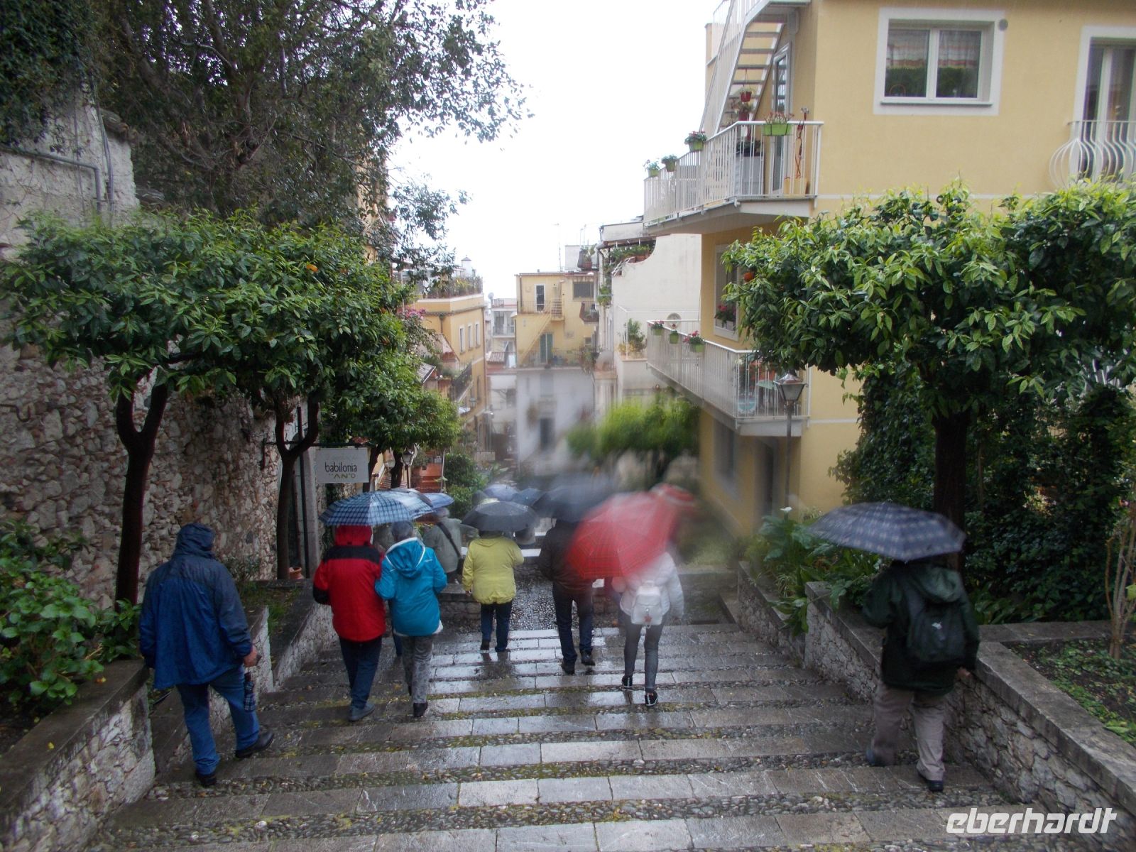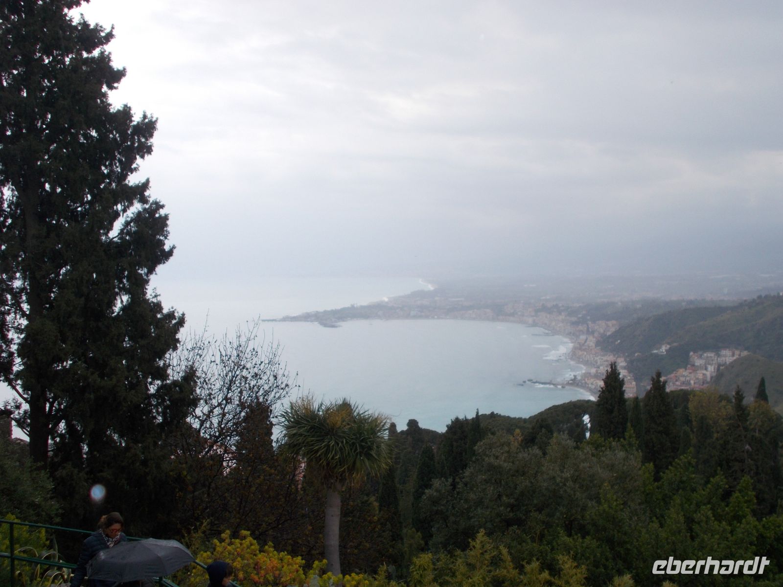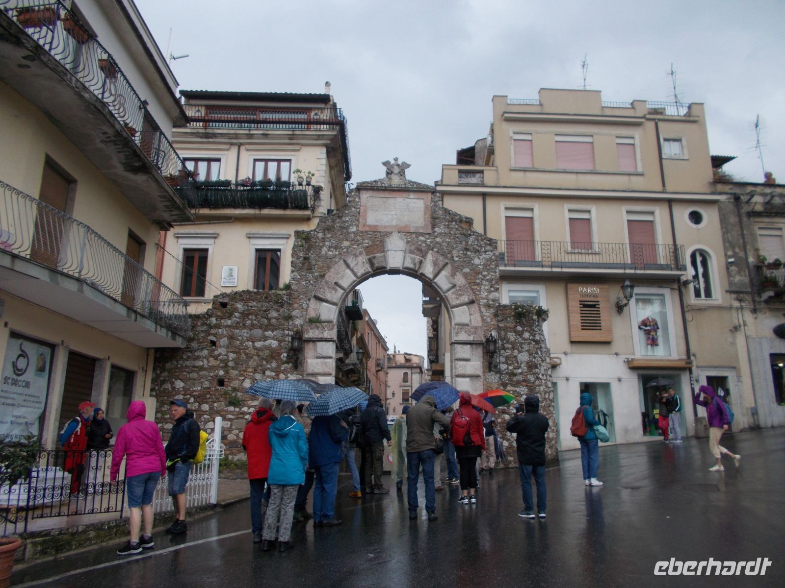 Der Ätna ist eigentlich der Höhepunkt jeder Sizilienreise. Für uns gleich am ersten Tag geplant. Im Flieger und bei der Fahrt zum Hotel ,hatten wir schon einen kleinen Vorgeschmack vom „Berg der Berge“. Leider gibt sich der Mongibello gern als Diva und verhüllt sich im Nebl .So auch heute. Eine Gruppe beschloss trotzdem die Auffahrt, mit der Seilbahn, die leider keine gute Sicht brachte. Eine andere Gruppe entschloss sich ,zu einer kleinen Wanderung um den unteren Silvestri Krater. Leider wurde wir auch hier vom Schnee und Regen eingeholt. Nach und nach fand sich die Gruppe ,in einem Bistro, zum Cappuccino ein.Das war unser Abenteuer „Ätna“ohne ihn wirklich zu sehen. Die Stadt Zaffarena ,unterhalb des Ätnas gelegen, ist bekannt für „den besten Honig Siziliens“und dies wollten wir „er-kosten“.Es schmeckte alles vorzüglich und so landete manches Honigglas im Handgepäck. Leider ließ der Regen überhaupt nicht nach .Auf dem Parkplatz von Taormina wurden Regenschirme gekauft (die fliegenden Händler machten Umsatz )und wir stiefelten zur schönsten Theaterkulisse der Welt ,dem Teatro Greco.Trotz des Regens genossen wir eine tolle Aussicht.Wir liefen durch die Altstadt und sahen uns den Parco Duca Di Cesaro an. Dort entschlossen wir uns den Ausflug etwas eher zu beenden.Der Regen hatte gesiegt.