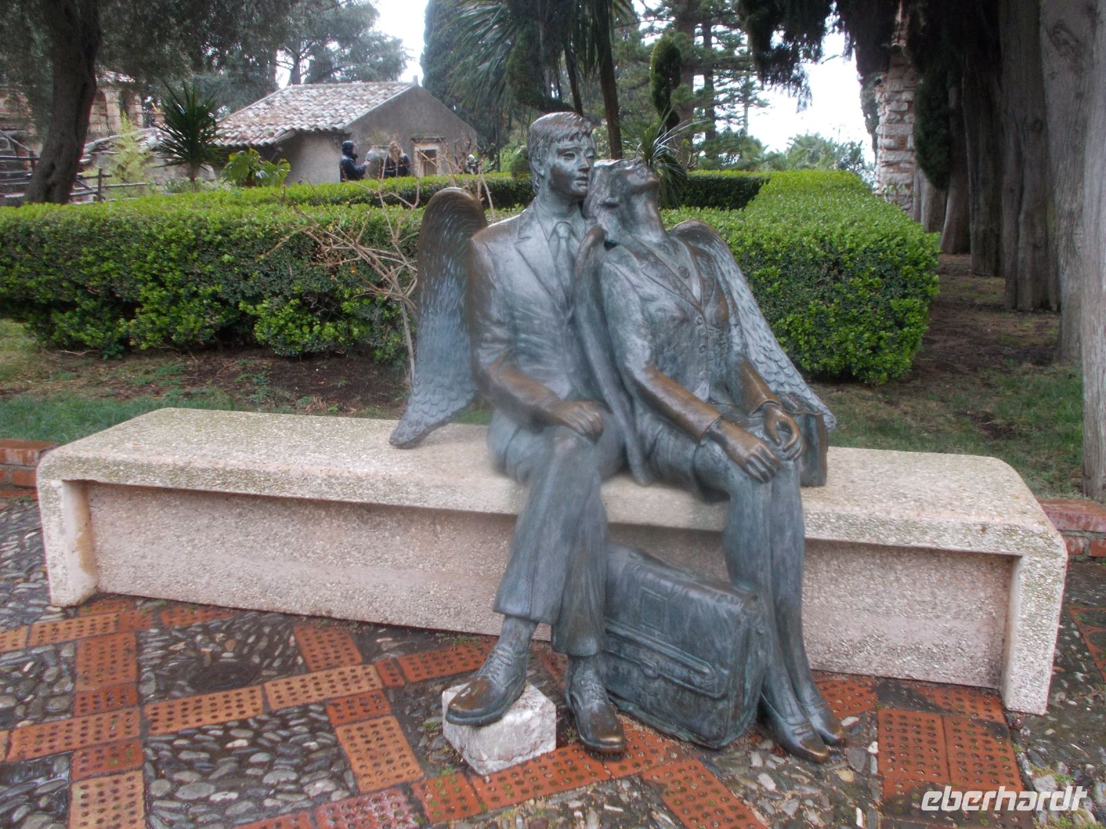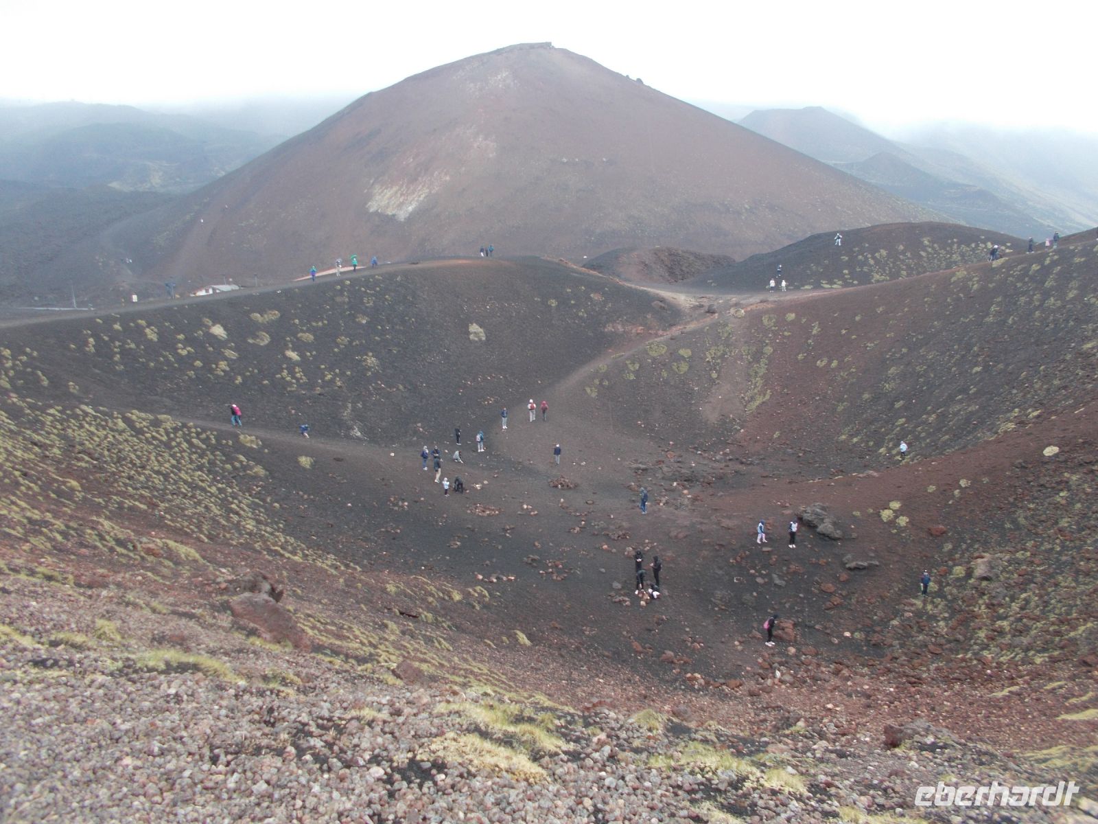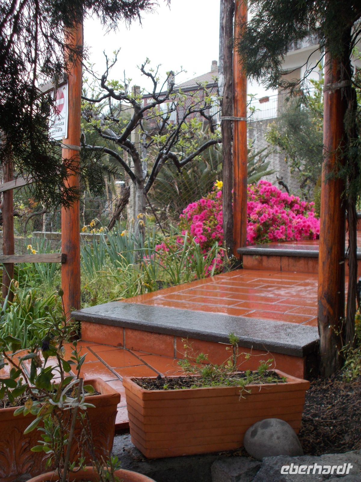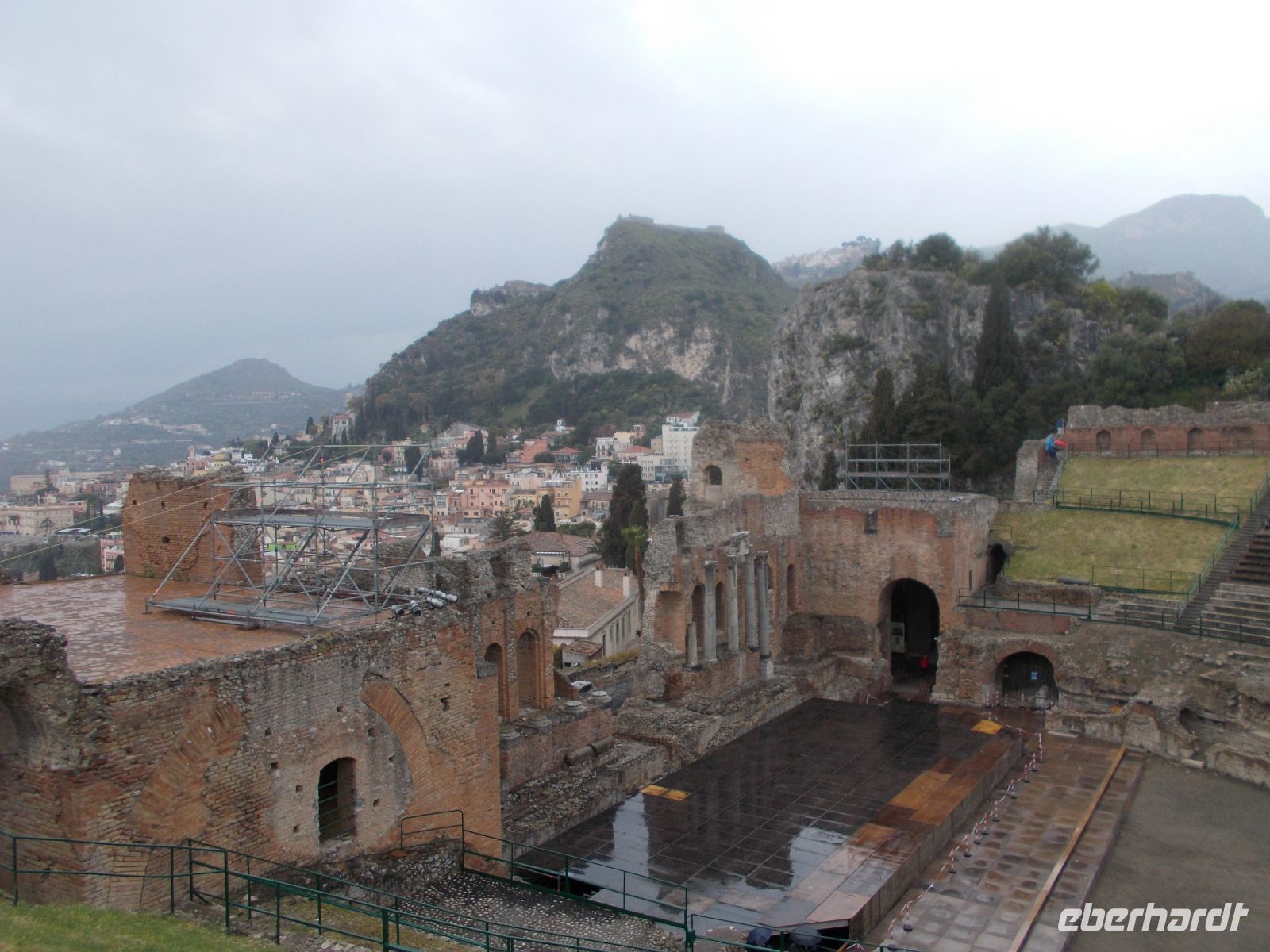 Der Ätna ist eigentlich der Höhepunkt jeder Sizilienreise. Für uns gleich am ersten Tag geplant. Im Flieger und bei der Fahrt zum Hotel ,hatten wir schon einen kleinen Vorgeschmack vom „Berg der Berge“. Leider gibt sich der Mongibello gern als Diva und verhüllt sich im Nebl .So auch heute. Eine Gruppe beschloss trotzdem die Auffahrt, mit der Seilbahn, die leider keine gute Sicht brachte. Eine andere Gruppe entschloss sich ,zu einer kleinen Wanderung um den unteren Silvestri Krater. Leider wurde wir auch hier vom Schnee und Regen eingeholt. Nach und nach fand sich die Gruppe ,in einem Bistro, zum Cappuccino ein.Das war unser Abenteuer „Ätna“ohne ihn wirklich zu sehen. Die Stadt Zaffarena ,unterhalb des Ätnas gelegen, ist bekannt für „den besten Honig Siziliens“und dies wollten wir „er-kosten“.Es schmeckte alles vorzüglich und so landete manches Honigglas im Handgepäck. Leider ließ der Regen überhaupt nicht nach .Auf dem Parkplatz von Taormina wurden Regenschirme gekauft (die fliegenden Händler machten Umsatz )und wir stiefelten zur schönsten Theaterkulisse der Welt ,dem Teatro Greco.Trotz des Regens genossen wir eine tolle Aussicht.Wir liefen durch die Altstadt und sahen uns den Parco Duca Di Cesaro an. Dort entschlossen wir uns den Ausflug etwas eher zu beenden.Der Regen hatte gesiegt.