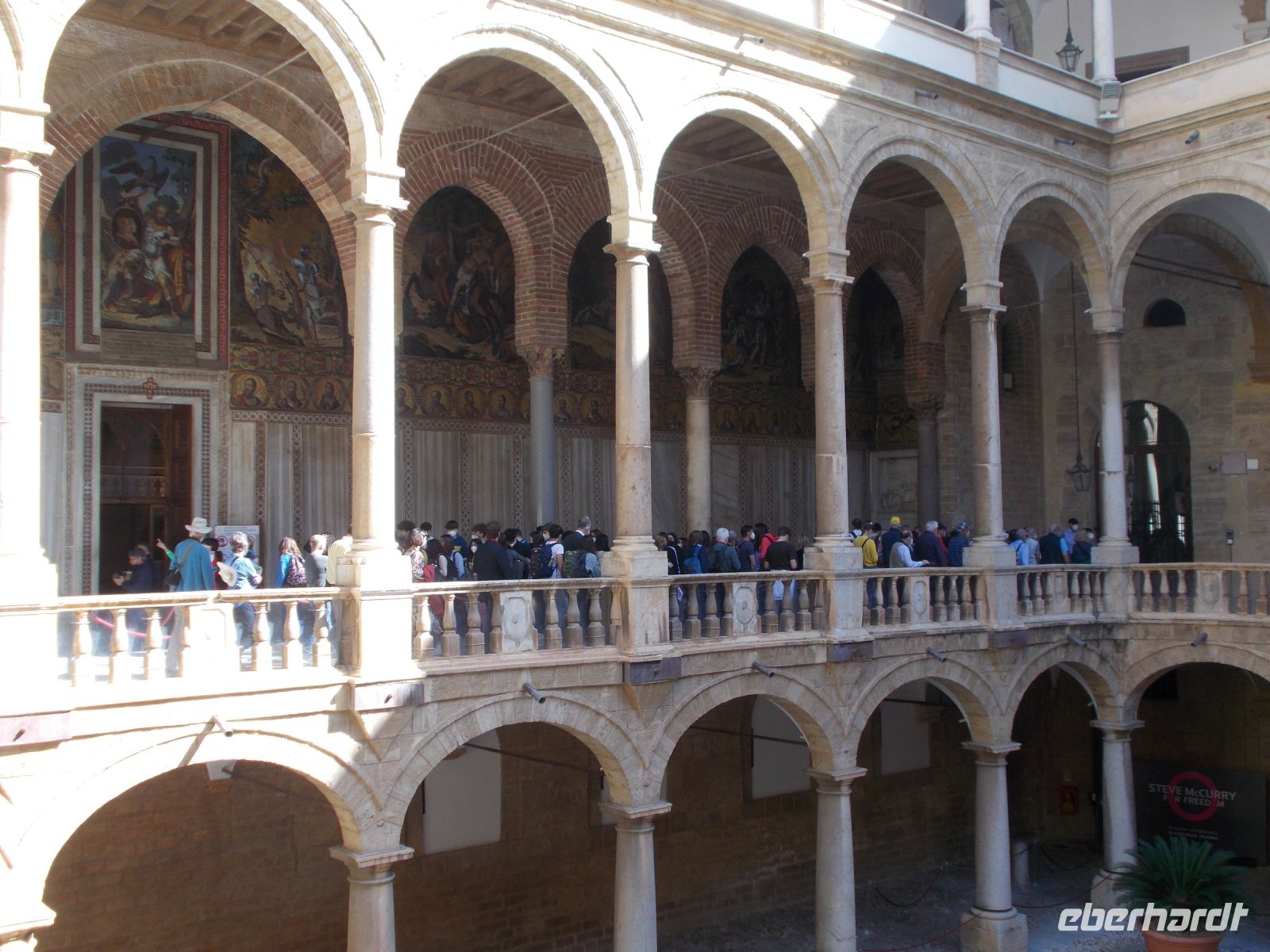 Heute hieß es Abschied nehmen vom Landleben und wir fuhren,mit dem Koffern, ans Tyrrhenische Meer. Palermo „Blume in der goldenen Muschel“(so die Bezeichnung)klingt doch viel besser ,als mit der Mafia in einem Satz genannt zu werden. Wir waren auf diese aufregende sizilianische Metropole sehr gespannt und begaben uns auf Spurensuche der Araber,Byzantiner,Normannen, Staufern und Spanier. Bei der Anfahrt ,ins Centrum, wurden wir trotzdem an die Mafia erinnert und zwar an die Morde des Richters Falcone und des Staatsanwaltes Borsellino. Sie ermittelten gegen die Machenschaften der „Cosa Nostra“,wie die Mafia auf Sizilien genannt wird. Durch die Porta Nuova betraten wir das Centro Storico. Nach einigem Anstehen, am Palazzo die Normanni, wurden wir vom Goldrausch, in der Cappella Palatina, mit den atemberaubenden Mosaiken, geblendet. Der Weg führte uns weiter zur Cattedrale Maria Santissima Assunta. Hautanziehungspunkt sind hier die Kapelle der Schutzpatronin Palermaos- die heilige Rosalia-und die Grablege der Normannen und Staufer Könige. Wir ließen uns durch die belebten Straßen treiben und sahen die Piazza Quattro Canti, mit den prächtig geschmückten Giebelseiten. Vor der Barockkirche Santa Caterina wurde uns die Geschichte zum figurenreichen Schambrunnen „Fontana Pretoria“erzählt. Am Teatro Massimo hatten wir etwas Freizeit, bevor wir uns am Opernplatz wieder trafen um, zum Picknick in den Park zu fahren.Hier ,mit Blick aufs Meer, schmeckten die Arancini ,Cannoli und der rote Hauswein besonders gut. Auf der Fahrt nach Cefalu erholten wir uns etwas im Bus. Das Städtchen, mit den schönen Sandstränden und dem imposanten Dom ,schmiegt sich an den, schon von weitem zu sehenden, Burgberg Rocca di Cefalu. Wir spazierten durch, verträumt aussehende, Gassen und erreichten den ehemaligen arabischen Waschplatz -Lavatoio. Nach etwas Freizeit begaben wir uns zum Bus ,der uns nach Capo d`Orlando brachte. Unser heutiges Hotel „Mulino“ lag direkt am Meer.