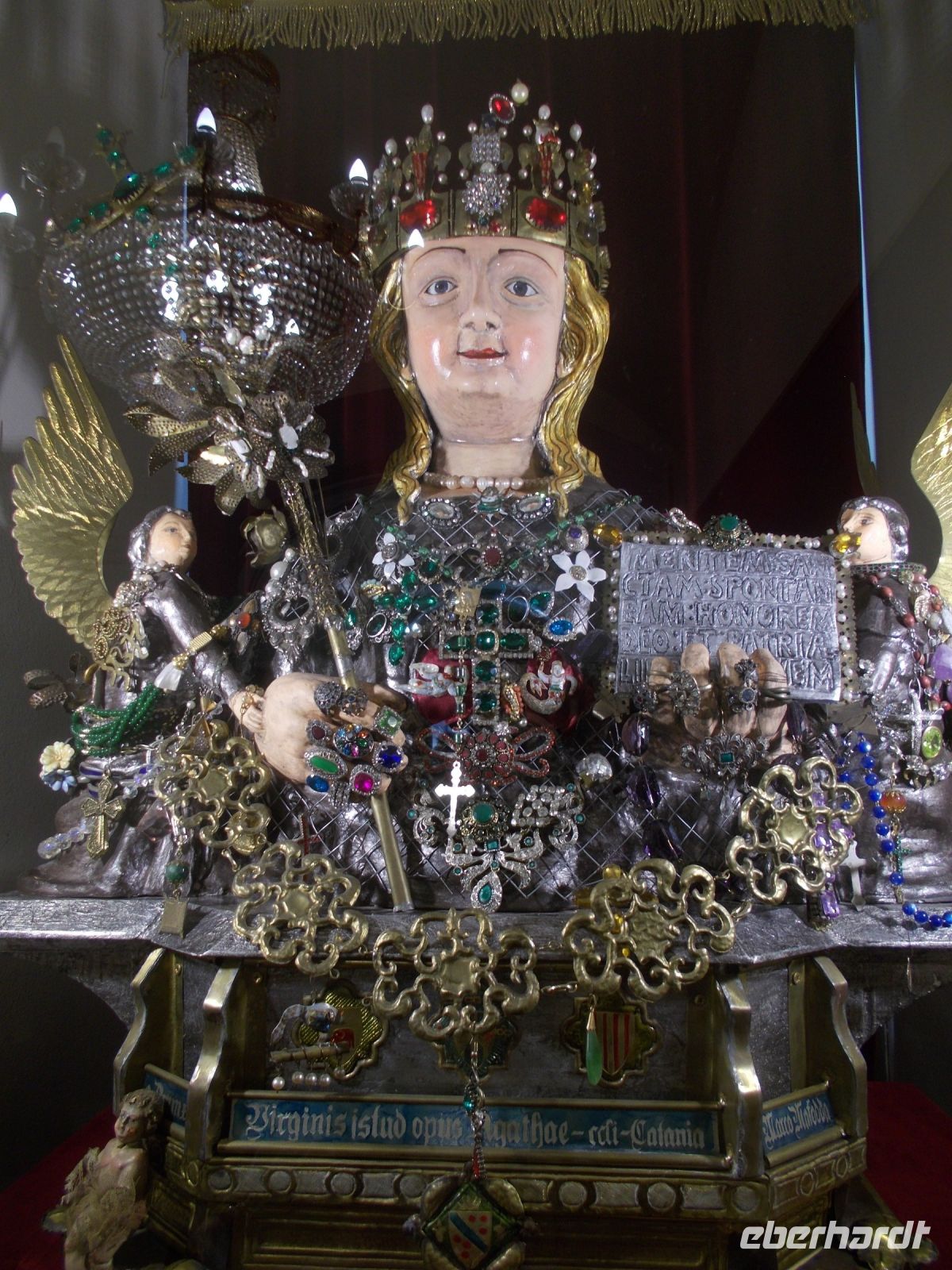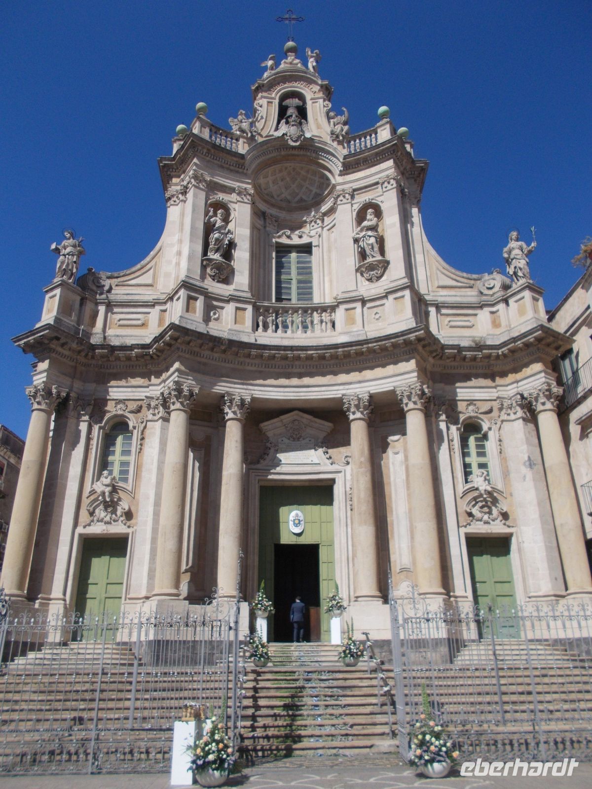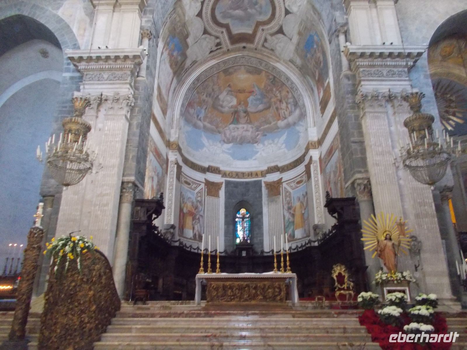 Endlich mal keinen Koffer packen ,ausschlafen ,gemütlich frühstücken und dazu noch Sonnenschein. Unser heutiger Ausflug brachte uns nach Catania, "Tochter des Ätna genannt“. Seit der antiken Gründung wurde die Stadt siebenmal durch Erdbeben oder Vulkanausbrüche total zerstört. Für den Neuaufbau, im 18.Jahrhundert, wurden die schwarzen Lavasteine wieder verwendet. Heute können wir eine schöne ,schwarze Altstadt mit vielen Barock Palästen und Kirchen bewundern. Einen besonderen Stellenwert hat natürlich der Duomo di Sant`Agata. Dort werden auch die Reliquien der Heiligen, in einer silbernen Cappella ,verwahrt. Den Platz vor dem Dom beherrscht der Fontana dell`Elefante. Für uns sollte dieser zum markanten Treffpunkt werden. Uns zog es aber auch zum berühmten Fischmarkt mit seinen, für uns fast unvorstellbaren, “Auslagen“. Wer wollte spazierte die Via Crociferi entlang. Sie bildet ein Ensemble von alten Palazzi, verschiedenen Kirchen und Klöstern. Von der Chiesa della Badia di Sant`Agata hatte man Catania zu Füßen liegen. Nach etwas Freizeit beendeten wir unseren Ausflug. Den verbleibenden Tag nutzten wir in Letojanni, um das Meer und die Sonne zu genießen.