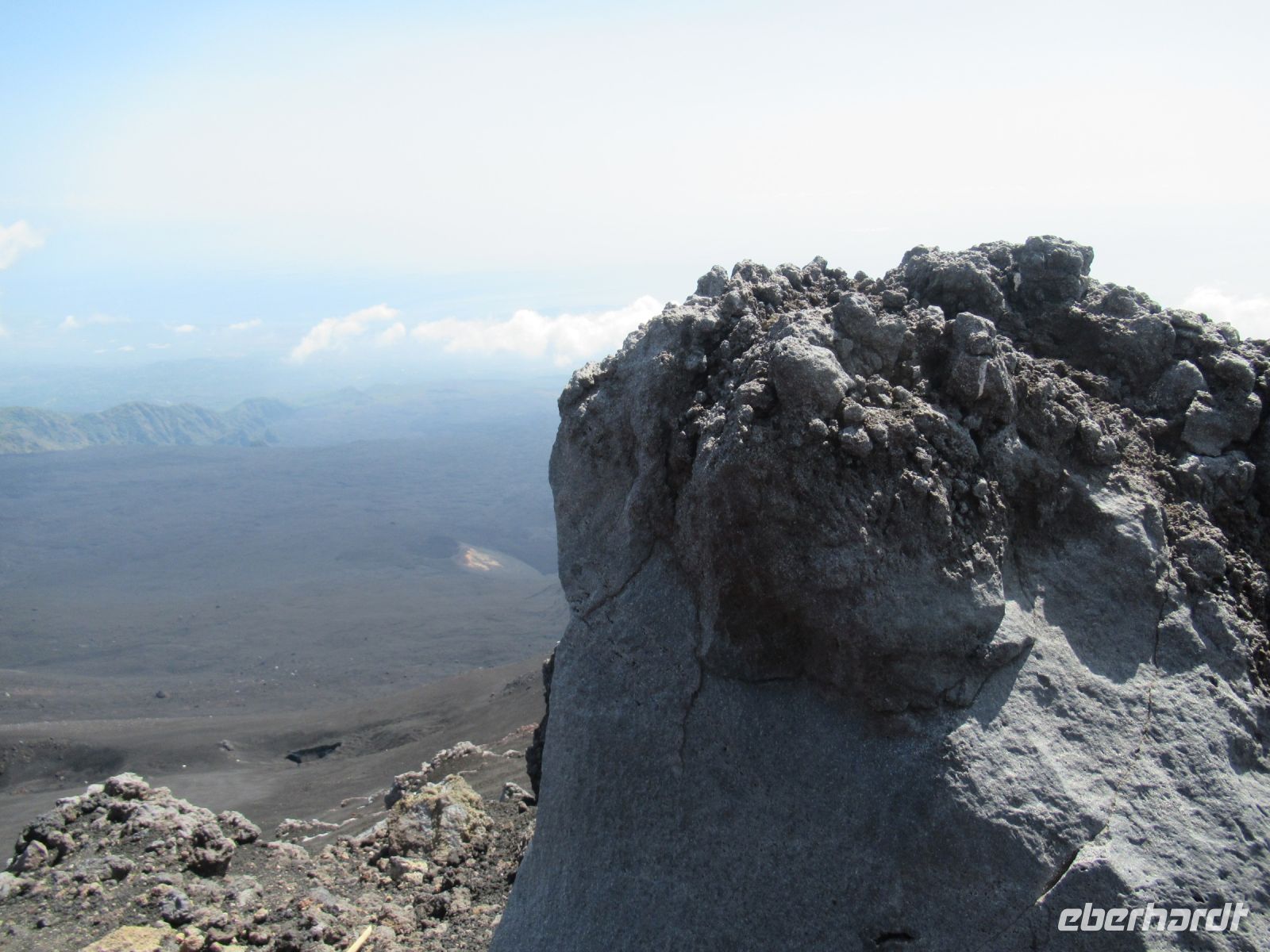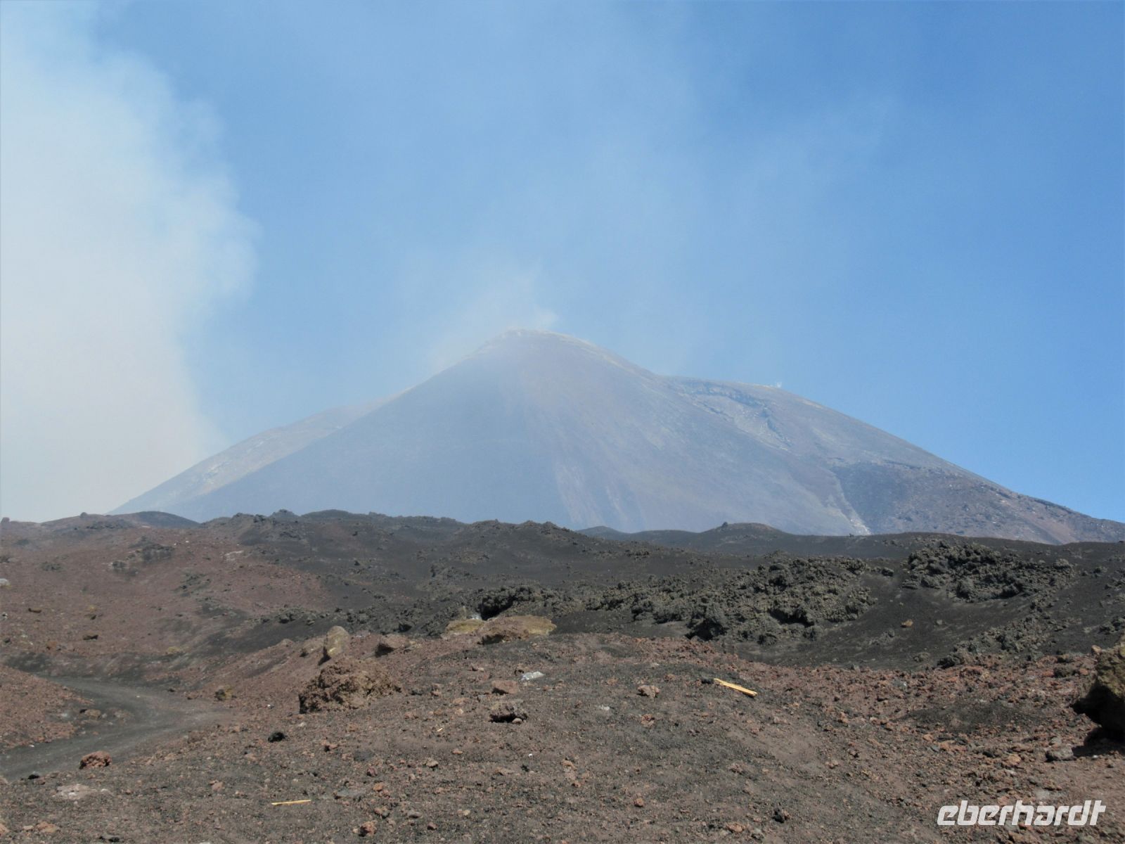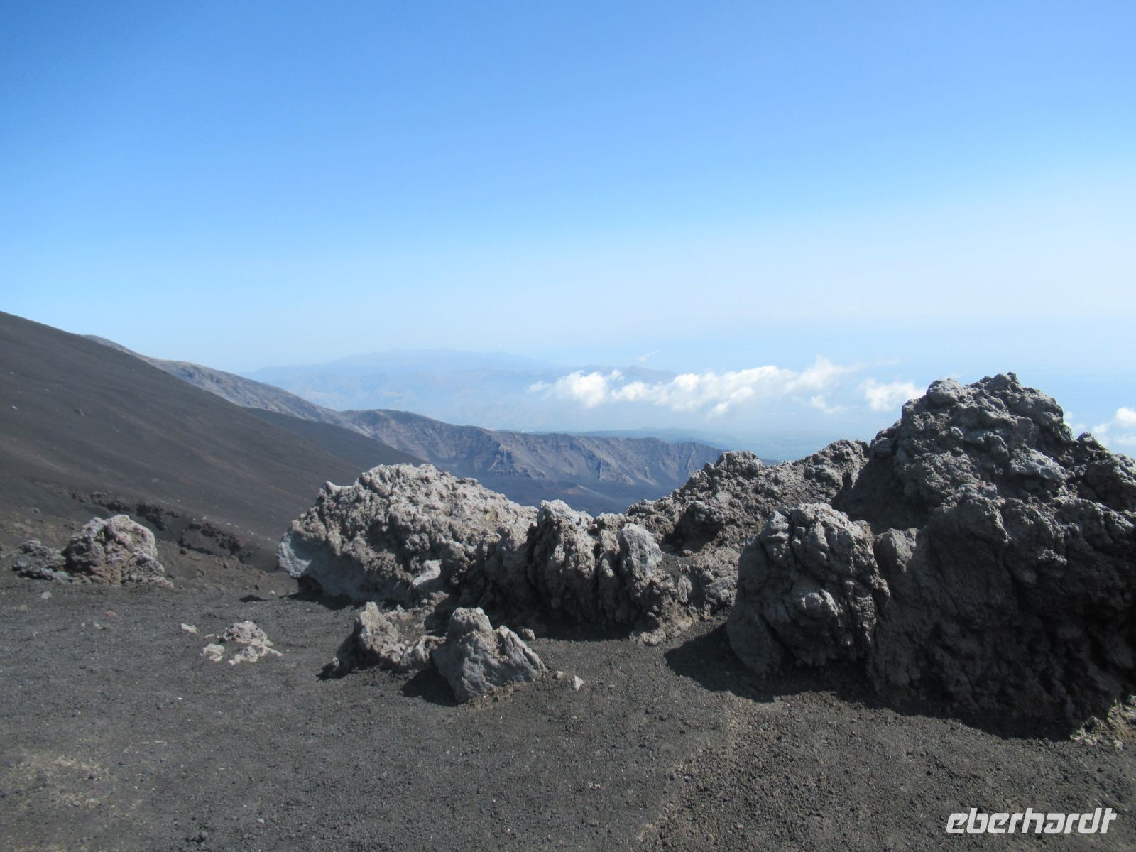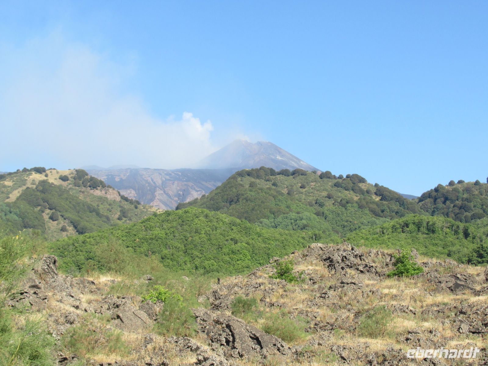 Oben empfingen uns die Bergführer, die uns durch das Geröll höher zu Aussichtspunkten führten. Die Erklärungen in Englisch oder Italienisch sind durch mehrere Gruppen etwas wenig verständlich gewesen, aber die Ausblicke haben uns entschädigt. Wolkenfreier Himmel, der Ätna zeigte sich in voller Schönheit – nur die weißen Dämpfe pafften ruhig vor sich hin. Kein Wind, Sonne pur, unsere Jacken konnten wir bald wieder ablegen.