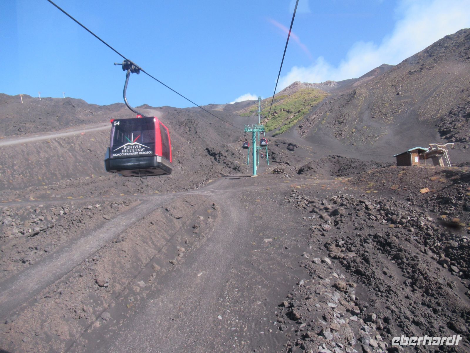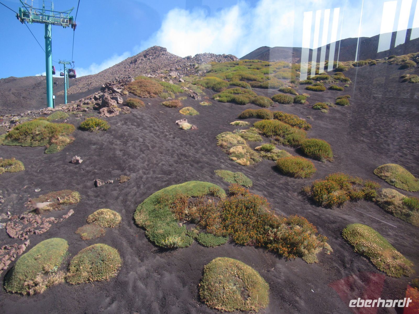 Ich ging mit der Gruppe in der Seilbahn und anschließend mit den Allradbussen bis auf 2.750 Meter Höhe hoch. Alleine die Fahrt mit Seilbahn und dann die Auffahrt mit den Bussen eröffnete die gigantische Breite und Höhe des Ätna. Zwischen den schwarzen Gestein leuchten nun doch plötzlich gelbgrüne Pflanzen, bis dann keine Pflanze eine Chance hat.