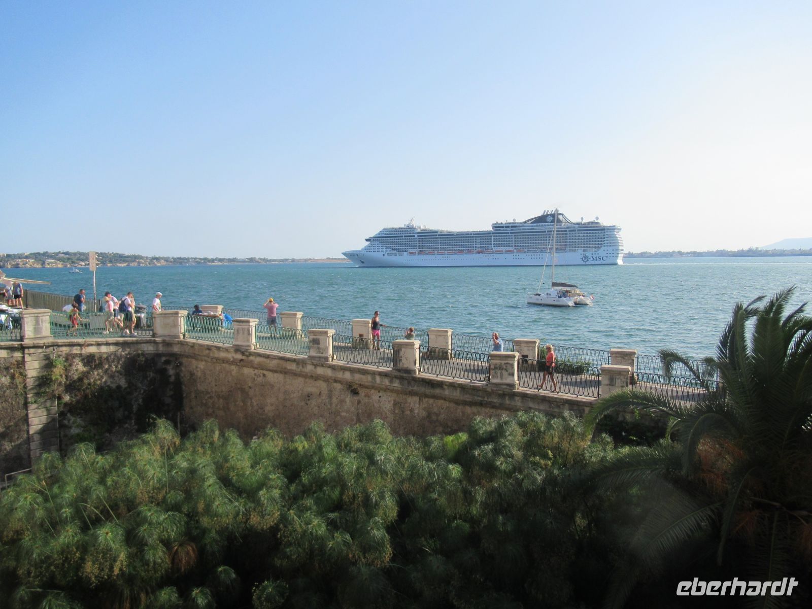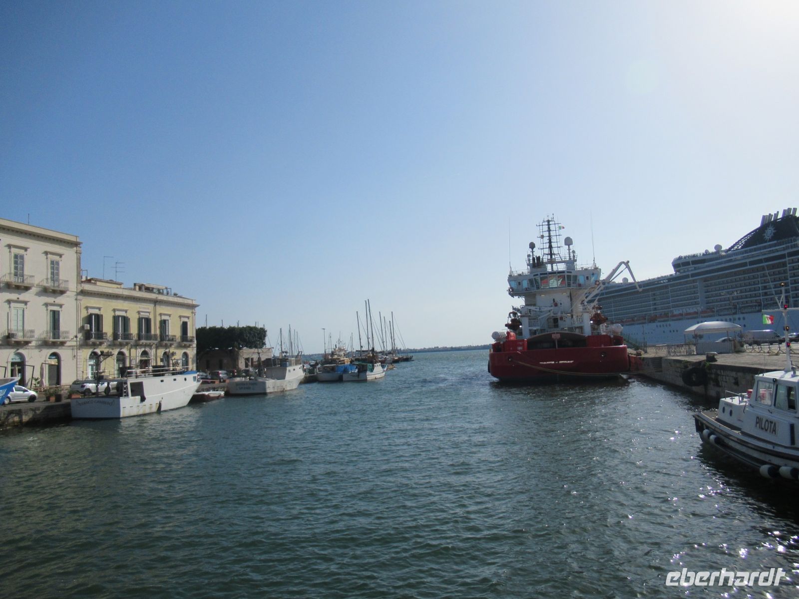 Jetzt machten wir uns auf den Weg nach Syrakus – die Autobahn Richtung Catania bis auf Südspitze der dreieckigen Insel. Syrakus oder Italienisch Siracusa. Syrakus zählt heute ca. 120.000 Einwohner und der historische Kern der Stadt liegt auf der Insel Ortygia (ital. Ortigia). In der Antike war Syrakus mehrere Jahrhunderte die größte und mächtigste Stadt Siziliens.