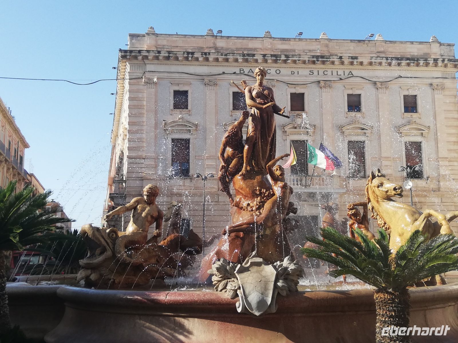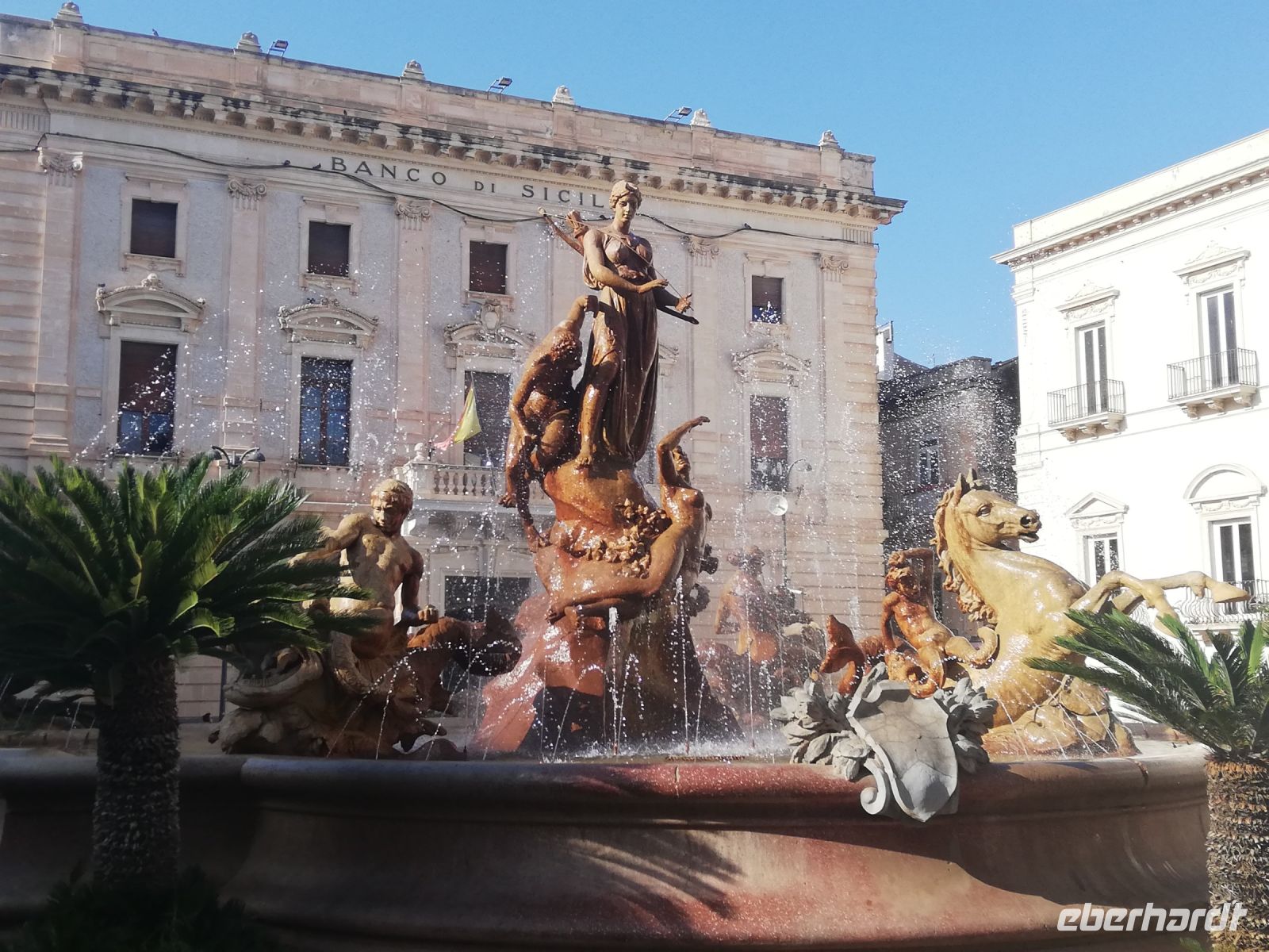 Entlang am Meer begegneten wir schon den „Archimedes“, dessen Statue etwas unscheinbar ausgefallen ist, auch wenn er als Mathematiker und Physiker so bedeutsame Konstruktionen und Berechnungen erfunden hat. Archimedes ist in Syrakus um 287 v. Chr. geboren, hat später in der Stadt gelebt und ist 212 v. Ch. in Syrakus gestorben. So „störten wir nicht seine Kreise“ und ziehen weiter durch die historische Stadt. Am Appolotempel, Fontana de Diana zu der Kathedrale von Syrakus Santa Maria delle Colonne (Il Duomo), die im 7 Jh. um den griechischen Athena-Tempel herumgebaut wurde. Ein wunderschöner Platz der zu Verweilen einlädt, nur die Zeit war zu knapp.