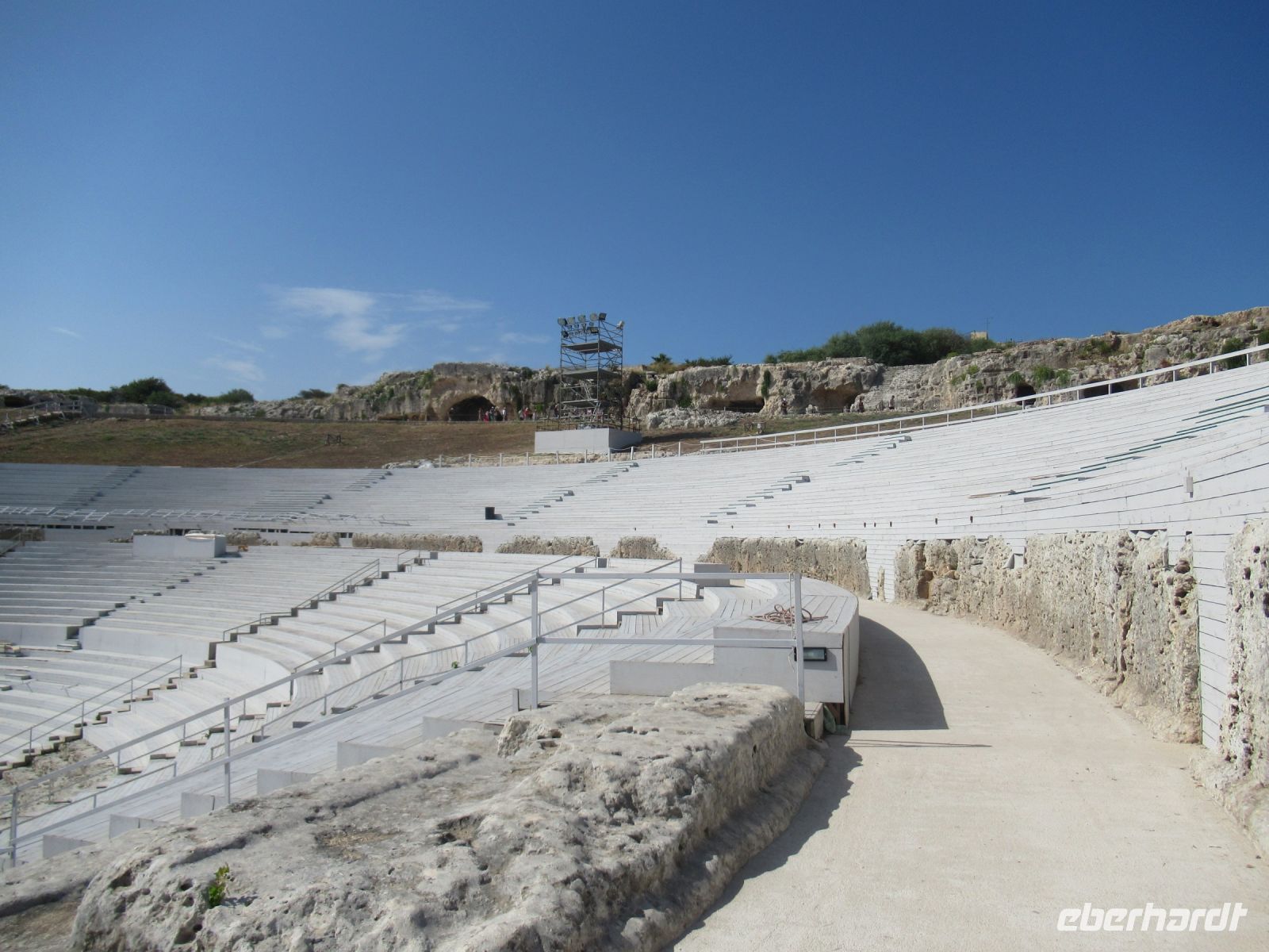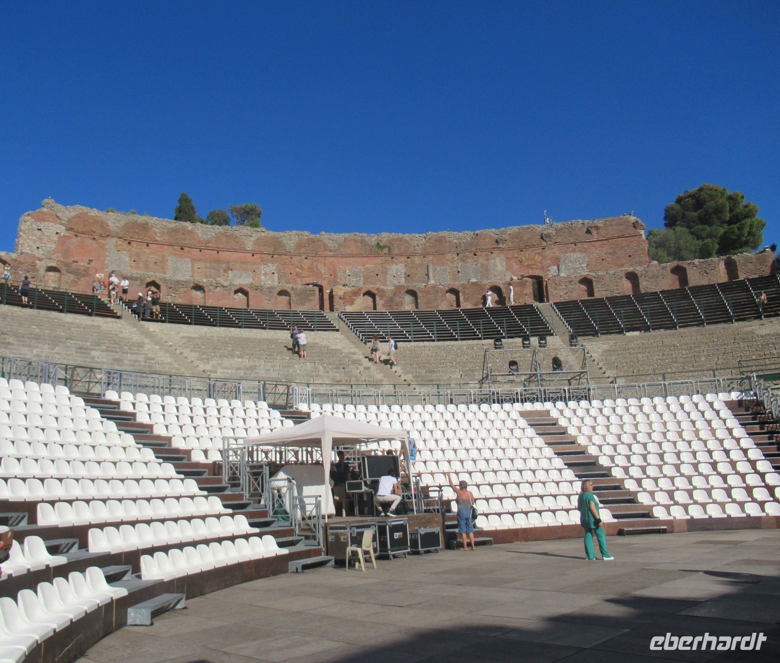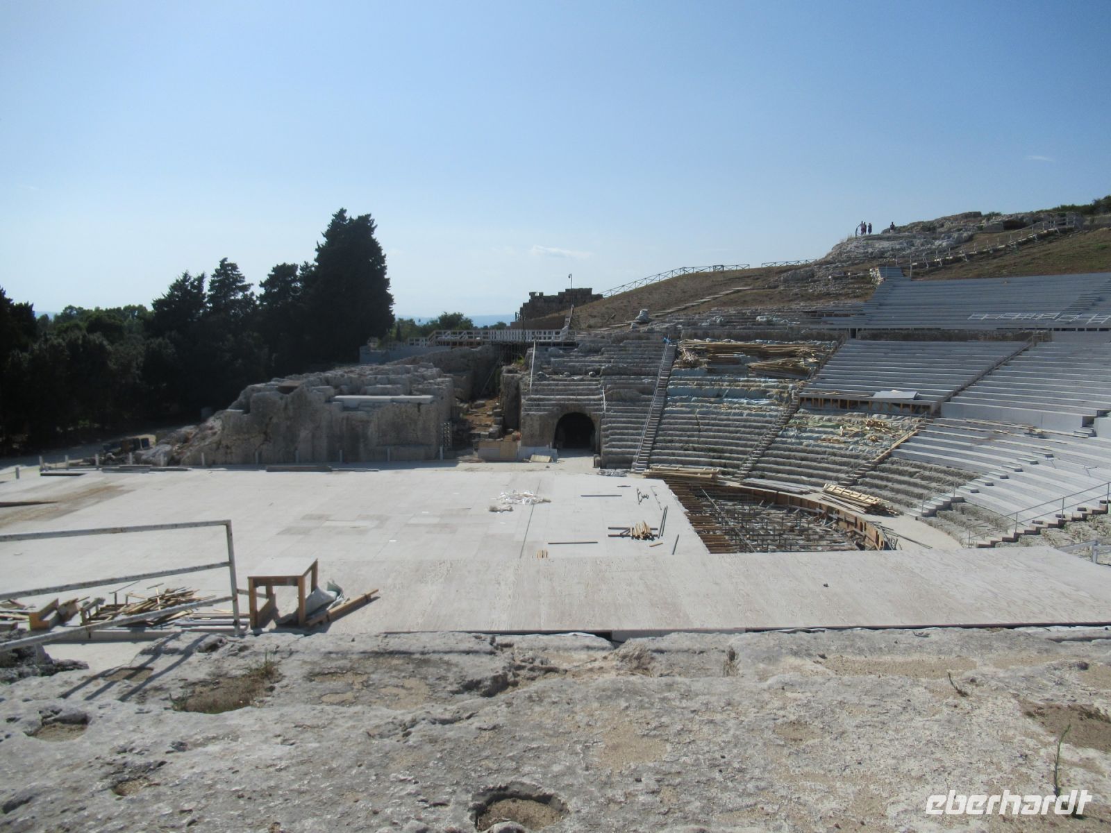 Dann stiegen wir hinauf in das Gelände vom Griechischen Theater (Teatro Greco), das aus dem 5. Jh. vor Christus stammte. Mit einem Durchmesser von ca. 140 m. eines der größten griechischen Theater. Die 67 Zuschauerränge wurden zu großem Teil direkt in der Stein gehauen. Ein Meisterwerk der Architektur. Aktuell war ein Teil der Zuschauerränge mit Bänken aus weißen Holz überbaut, um die Steine zu schützen und bequemer zu sitzen bei den im Sommer stattfindenden Veranstaltungen.
