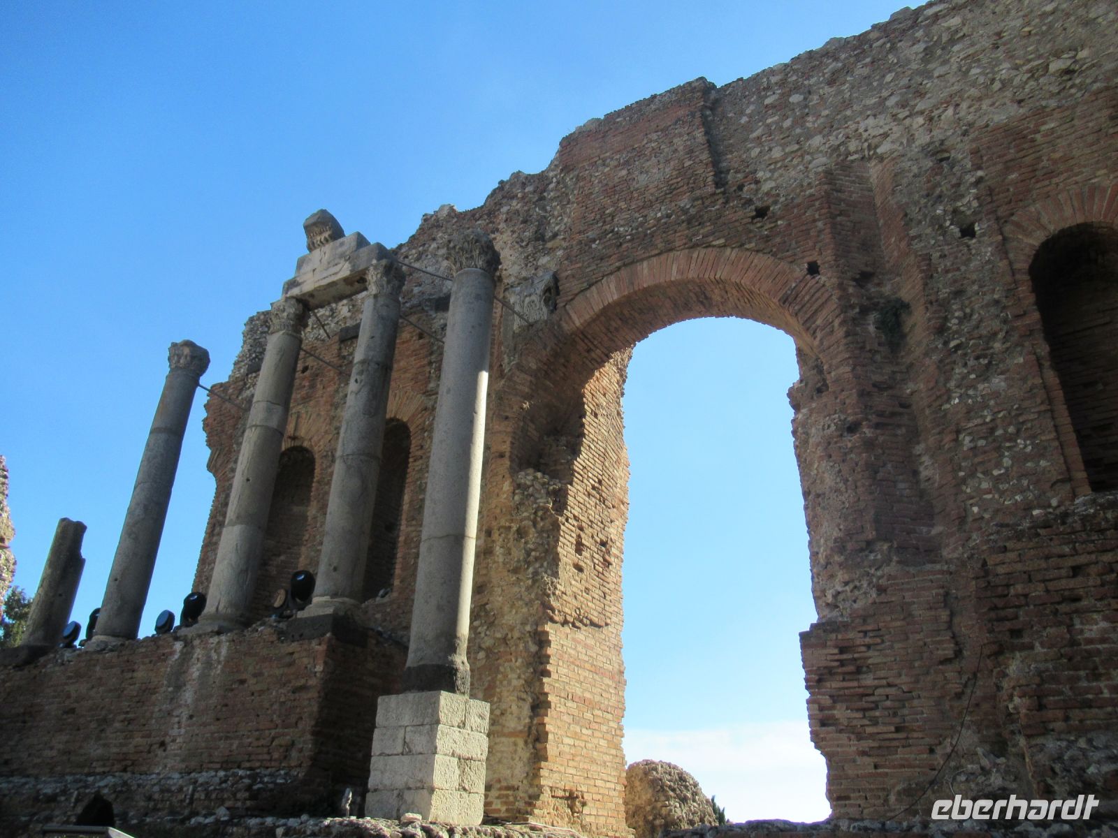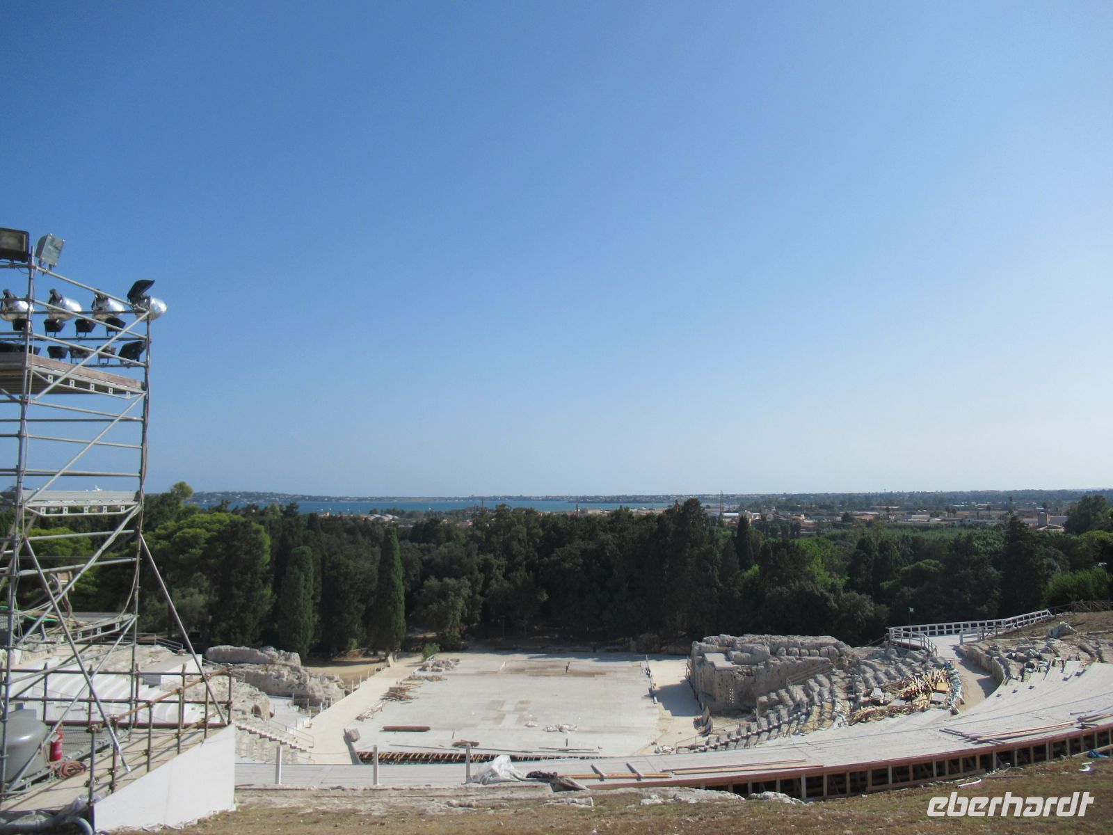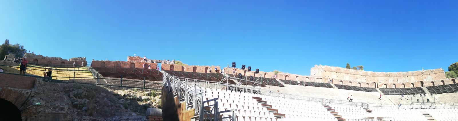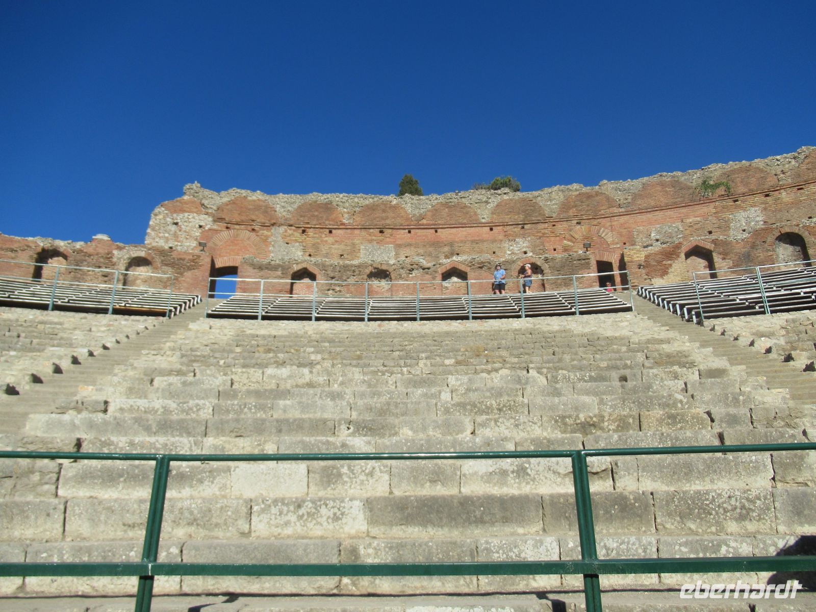 Dann stiegen wir hinauf in das Gelände vom Griechischen Theater (Teatro Greco), das aus dem 5. Jh. vor Christus stammte. Mit einem Durchmesser von ca. 140 m. eines der größten griechischen Theater. Die 67 Zuschauerränge wurden zu großem Teil direkt in der Stein gehauen. Ein Meisterwerk der Architektur. Aktuell war ein Teil der Zuschauerränge mit Bänken aus weißen Holz überbaut, um die Steine zu schützen und bequemer zu sitzen bei den im Sommer stattfindenden Veranstaltungen.