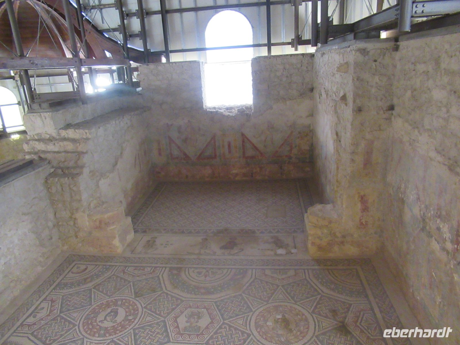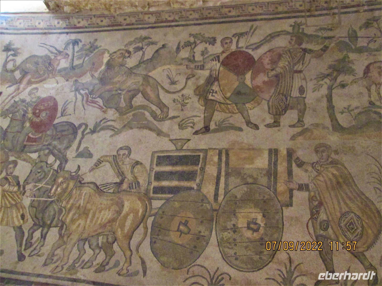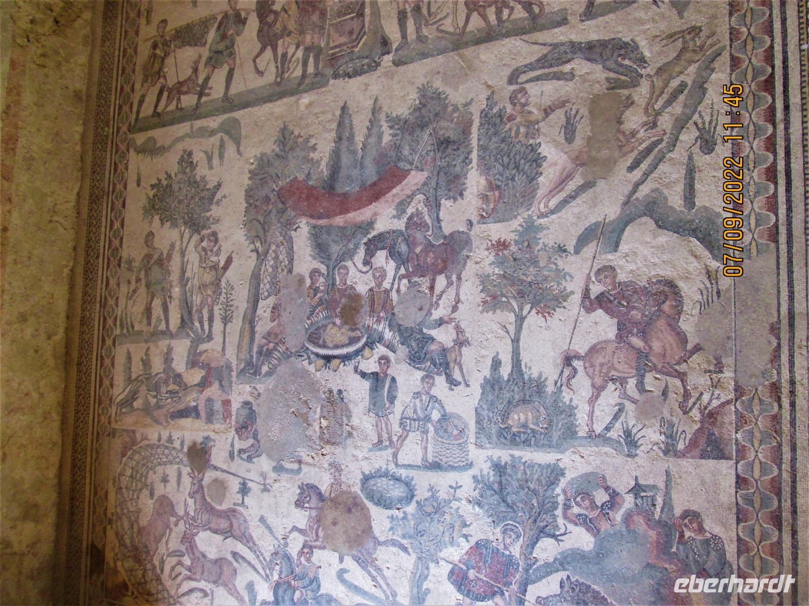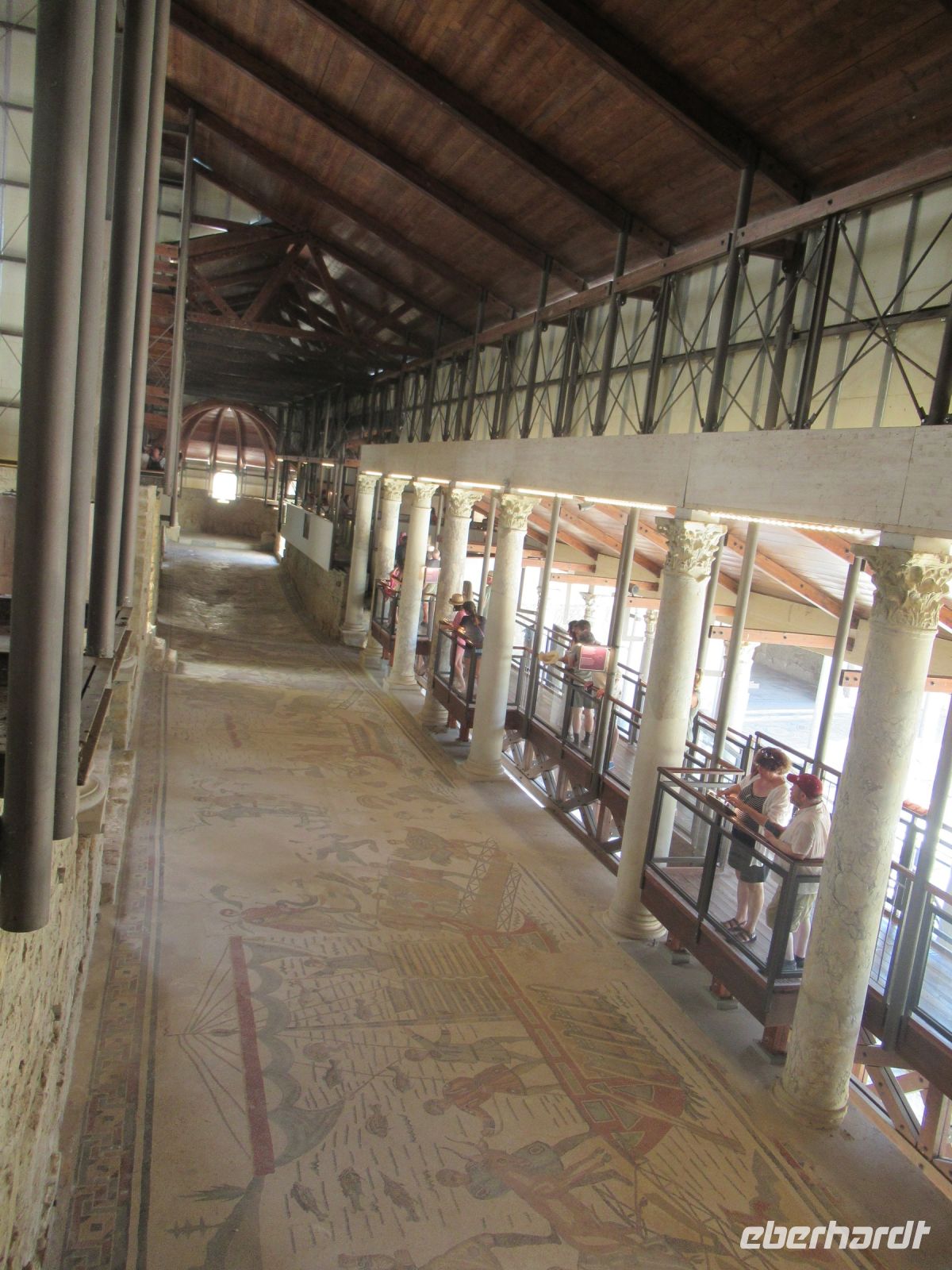 Vor dem Eingang sahen wir schon den Teil der Thermen – Caldarien – das Thermalbad, das Tepidarium – Wärmeraum, Tepidarium – Kaltwasserbecken, und einige Sporträume. Im Innenraum ein Eingangsbereich mit Atrium und Garten. Die Innenräume mit den Mosaiken wurden über Korridore von oben betrachtet. Mehr als 45 Räume mit Mosaiken mit Jagdmotiven und diversen Szenen zeugen vom Leben, Feiern, Jagen, aber auch Sportaktivitäten der dort lebenden Besitzer und deren Besuchern. Dazu gehört auch die Kapelle und nicht zuletzt der Sportraum für Frauen mit den berühmten „Bikinimädchen“. Wie viel menschliche Kunstarbeit, von ca. 1 cm großen Mosaiksteinen..... es brachte uns Alle zum staunen...