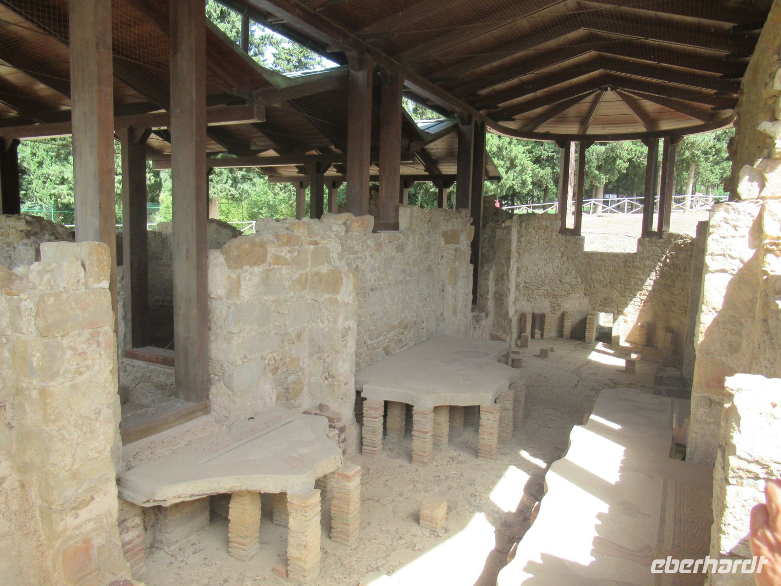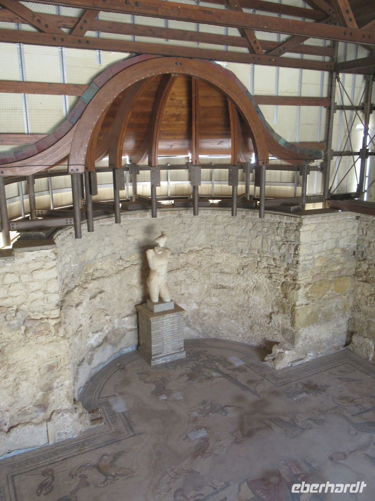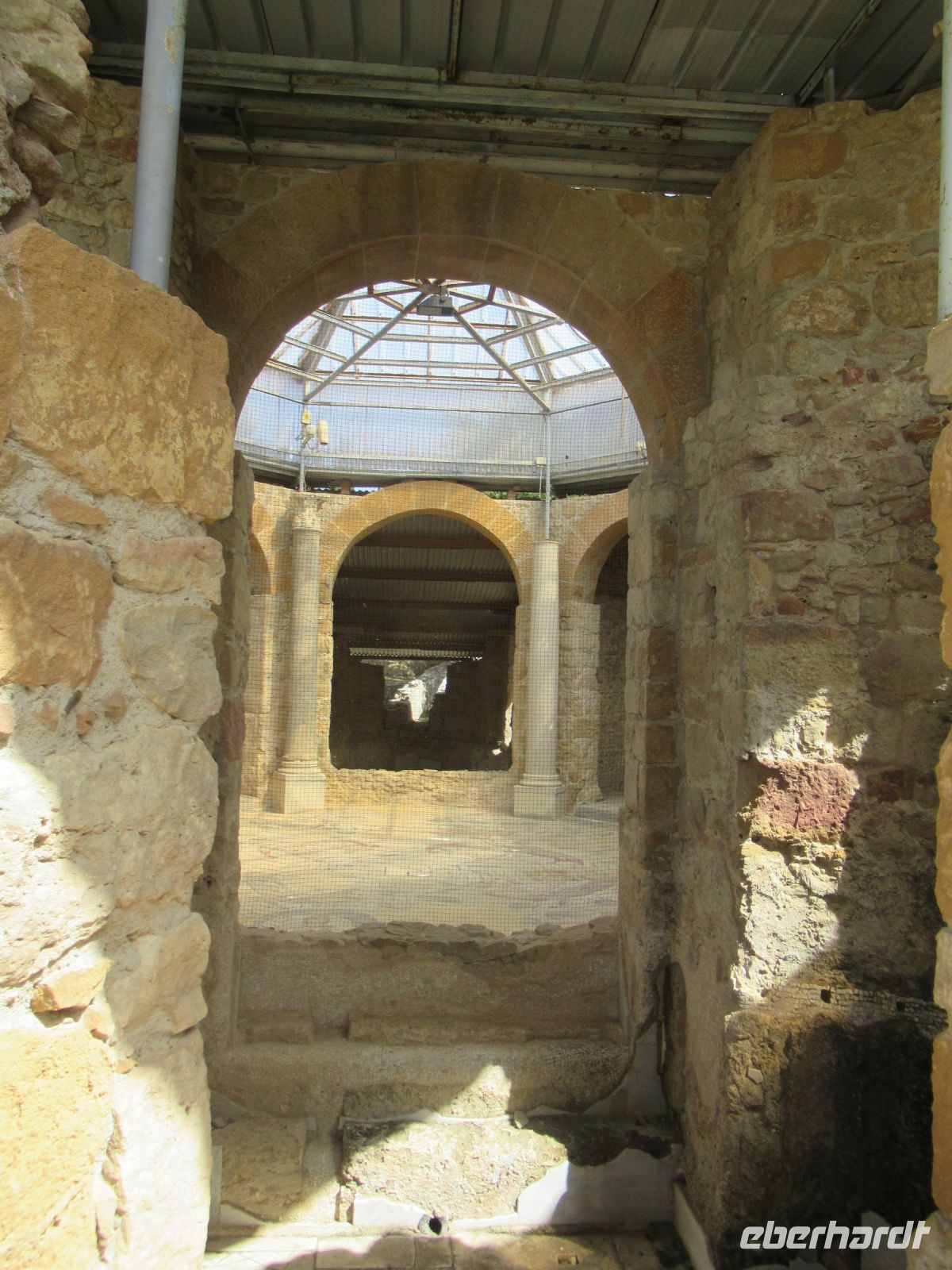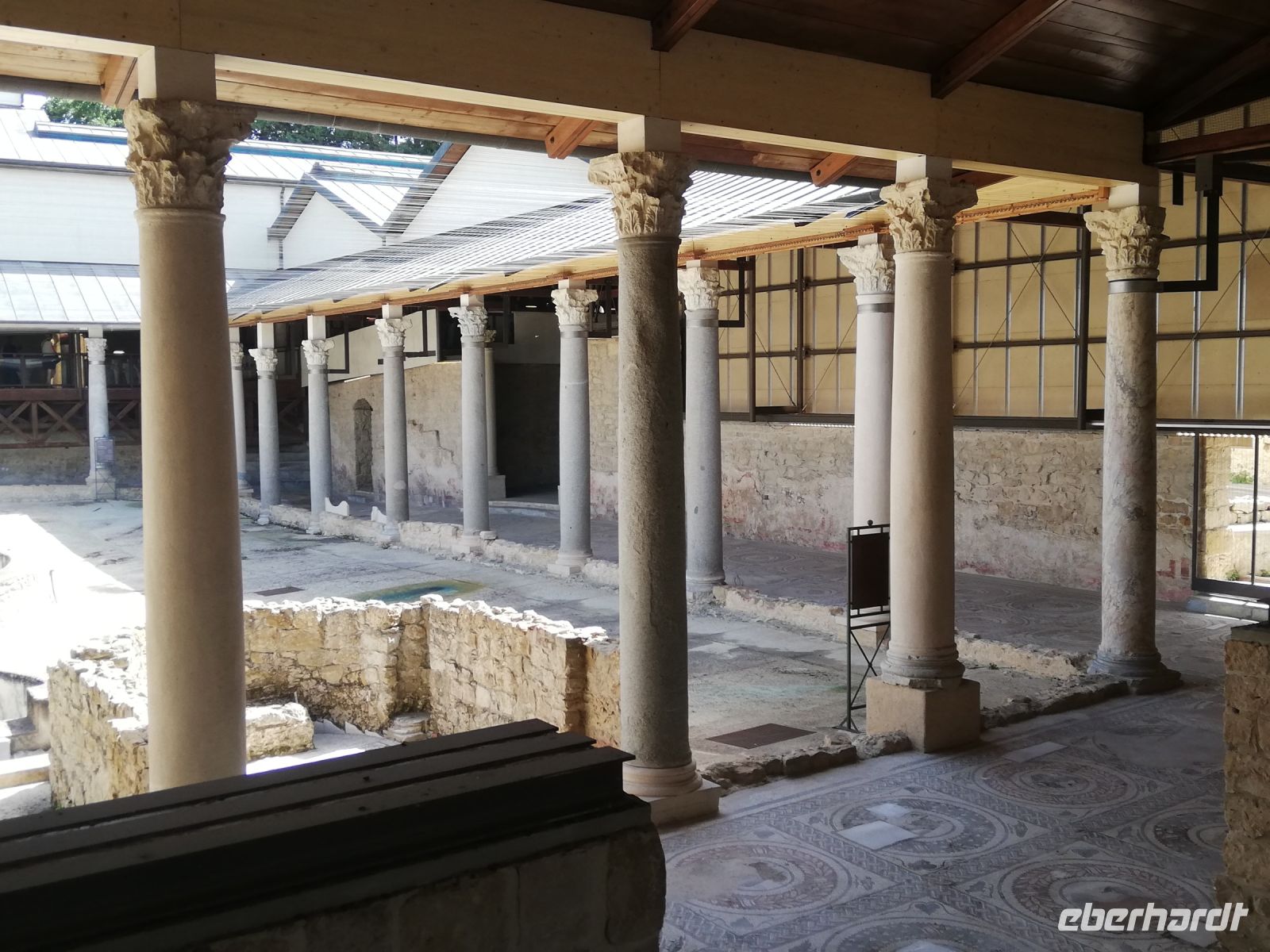 Vor dem Eingang sahen wir schon den Teil der Thermen – Caldarien – das Thermalbad, das Tepidarium – Wärmeraum, Tepidarium – Kaltwasserbecken, und einige Sporträume. Im Innenraum ein Eingangsbereich mit Atrium und Garten. Die Innenräume mit den Mosaiken wurden über Korridore von oben betrachtet. Mehr als 45 Räume mit Mosaiken mit Jagdmotiven und diversen Szenen zeugen vom Leben, Feiern, Jagen, aber auch Sportaktivitäten der dort lebenden Besitzer und deren Besuchern. Dazu gehört auch die Kapelle und nicht zuletzt der Sportraum für Frauen mit den berühmten „Bikinimädchen“. Wie viel menschliche Kunstarbeit, von ca. 1 cm großen Mosaiksteinen..... es brachte uns Alle zum staunen...