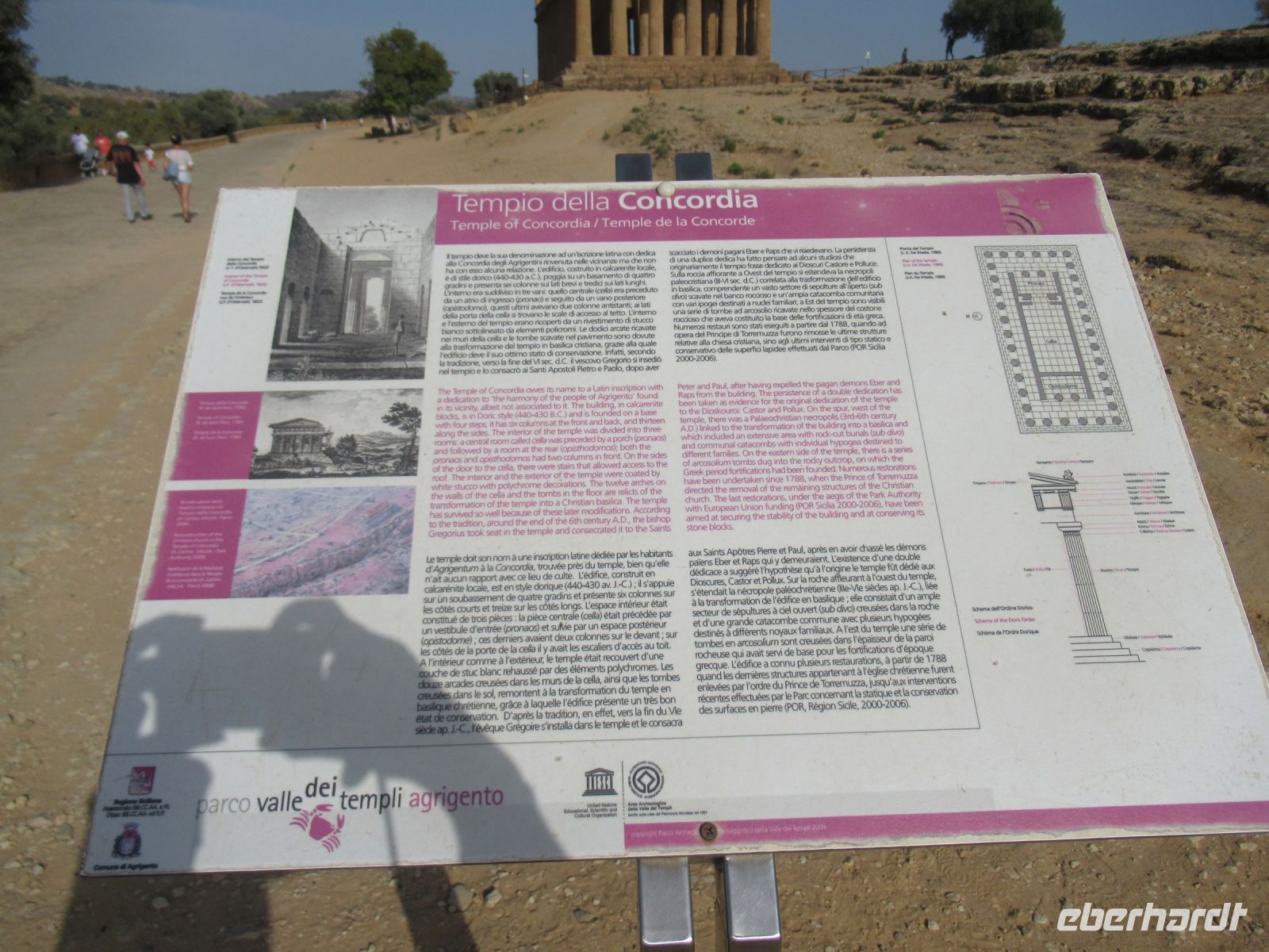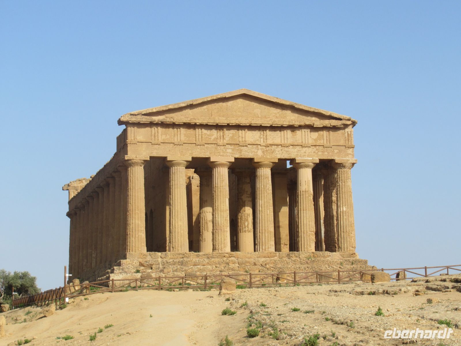 Die Stadt Akragas war einst die bedeutendste antike griechische Stadt. Akragas war 582 v. Chr. von Griechen gegründet worden. Eine Reihe von monumentalen Tempel wurden im 5. Jh. vor Chr. errichtet, von denen trotz 2500 Jahre, Eroberungen von Karthagen, Erdbeben dennoch Tempel, Säulen auch heute noch in den Himmel ragen. Herkulestempel, Tempel der Concordia zählen zu den besterhaltenen Tempel. Concordia Tempel und bedeckt eine Fläche von 834,38 m2.
