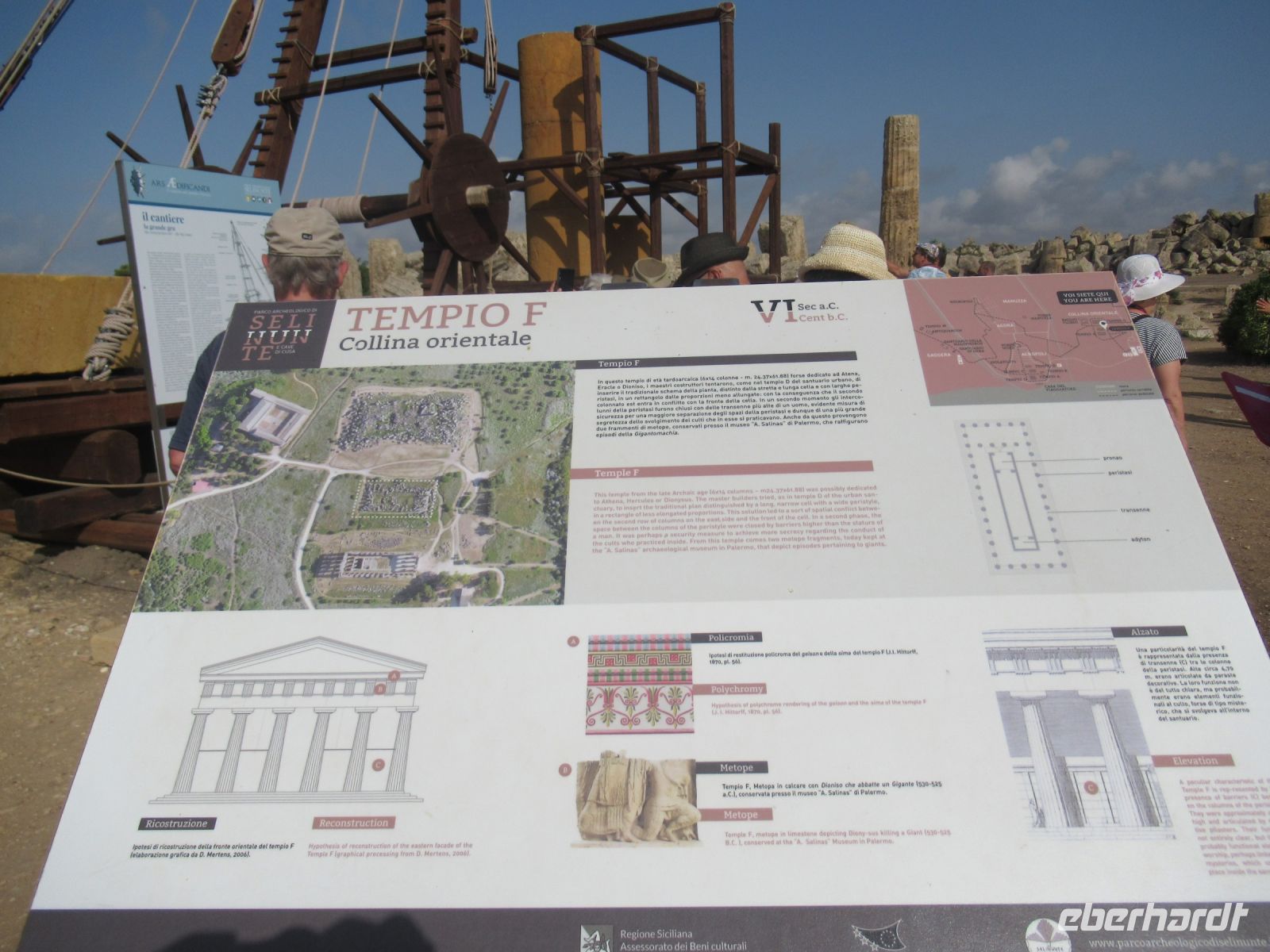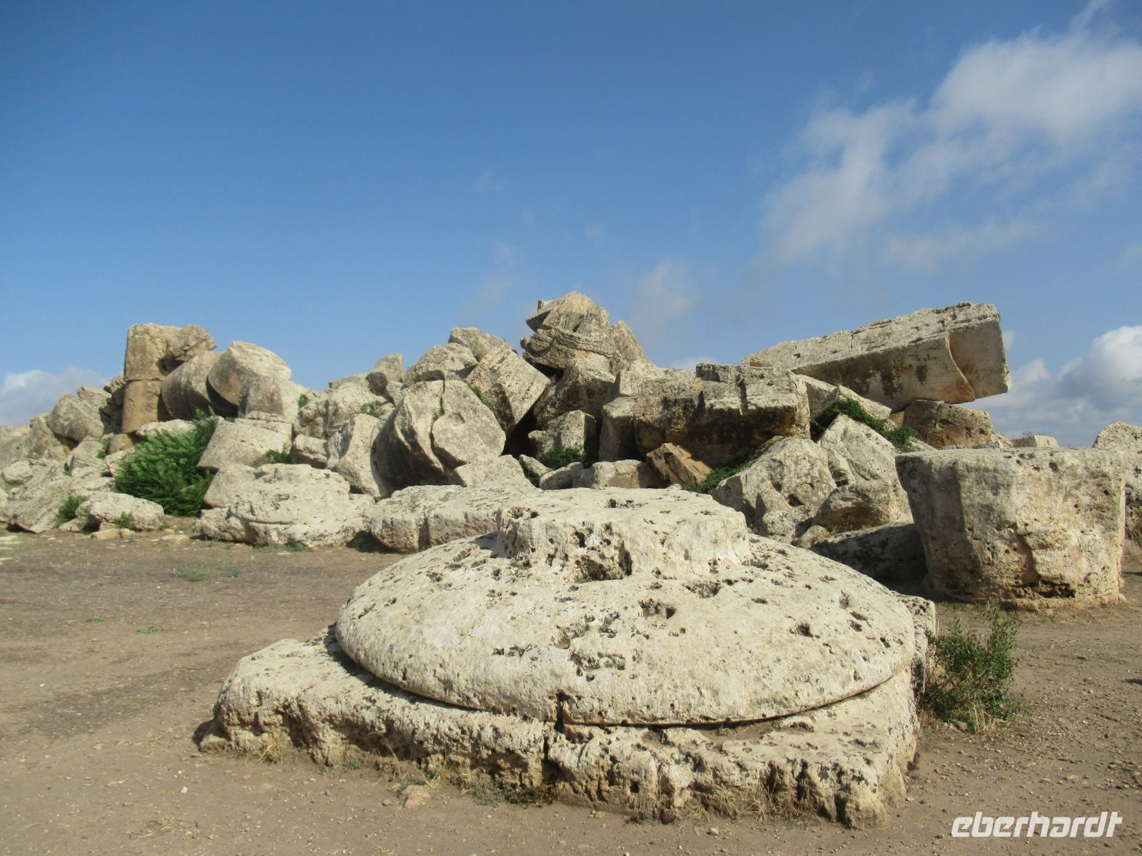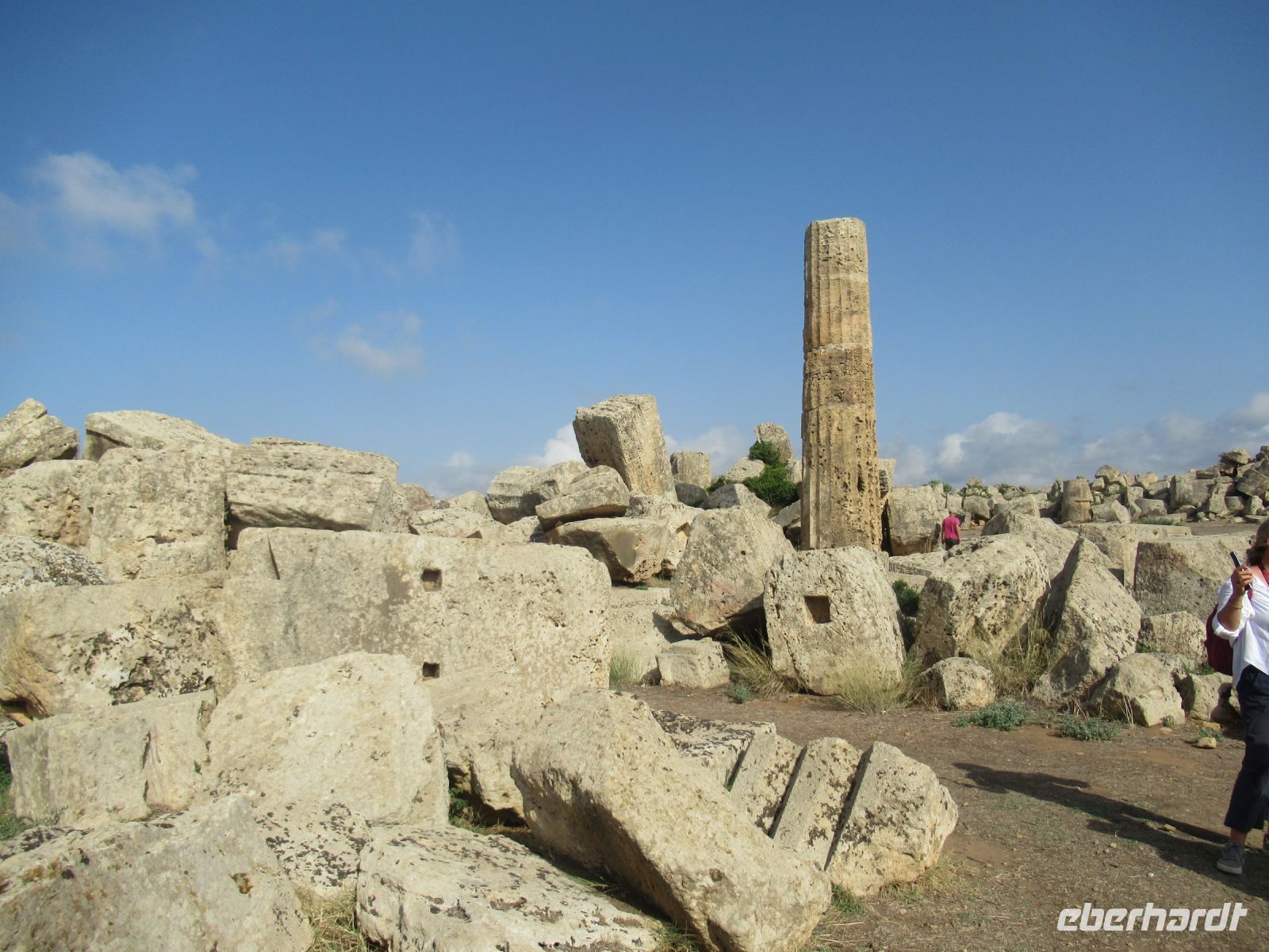 Da die Tempel nicht eindeutig den Göttern zugeordnet konnten, sind sie nur mit den Buchstaben benannt. Wir standen zunächst vor dem Tempel E, der nach vorne geöffnet ist. Christiane erzählte uns, wie es wohl ursprünglich aussah. Hier wurde anschaulich auch die Bauweise erklärt und die einfachen, aber doch effektiven Hilfsmittel der damaligen Zeit. Tempel F ist etwas kleiner und wir hatten hier einen wunderschönen Blick aufs Meer, wo die Akropolis zu sehen ist und wussten gar nicht, welche der Bilder wir noch in die Fotoapparate einfangen sollen. Tempel G ist nur noch ein Steinhaufen von Säulen, Riesensteinblöcken mit Ausmassen von 113 x 54 m Fläche.
