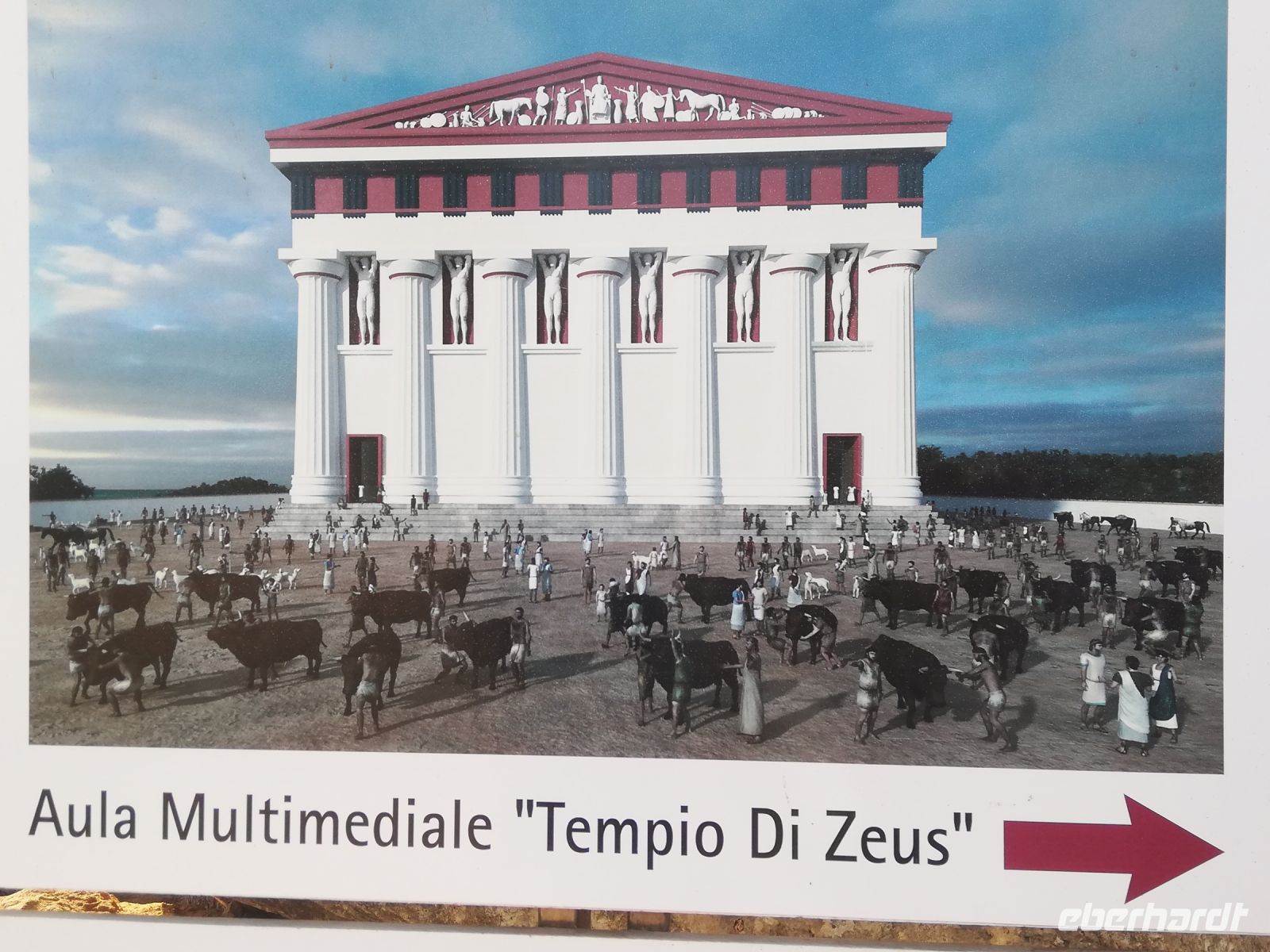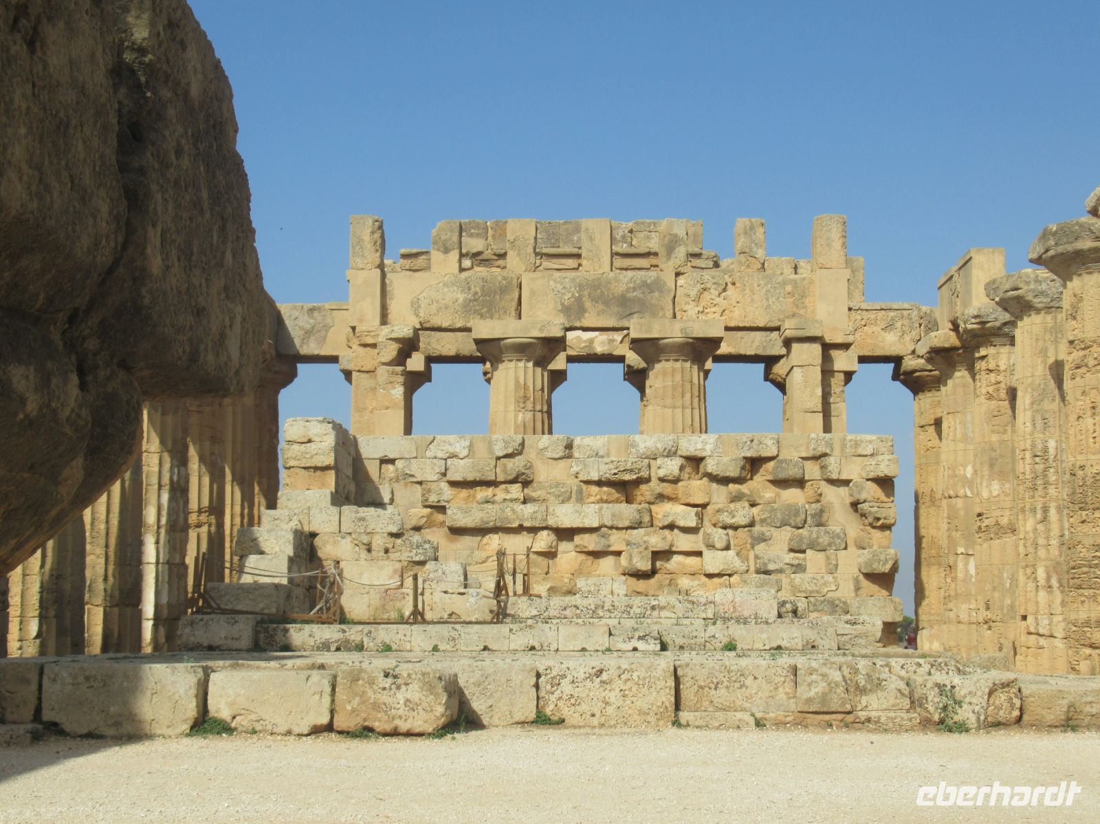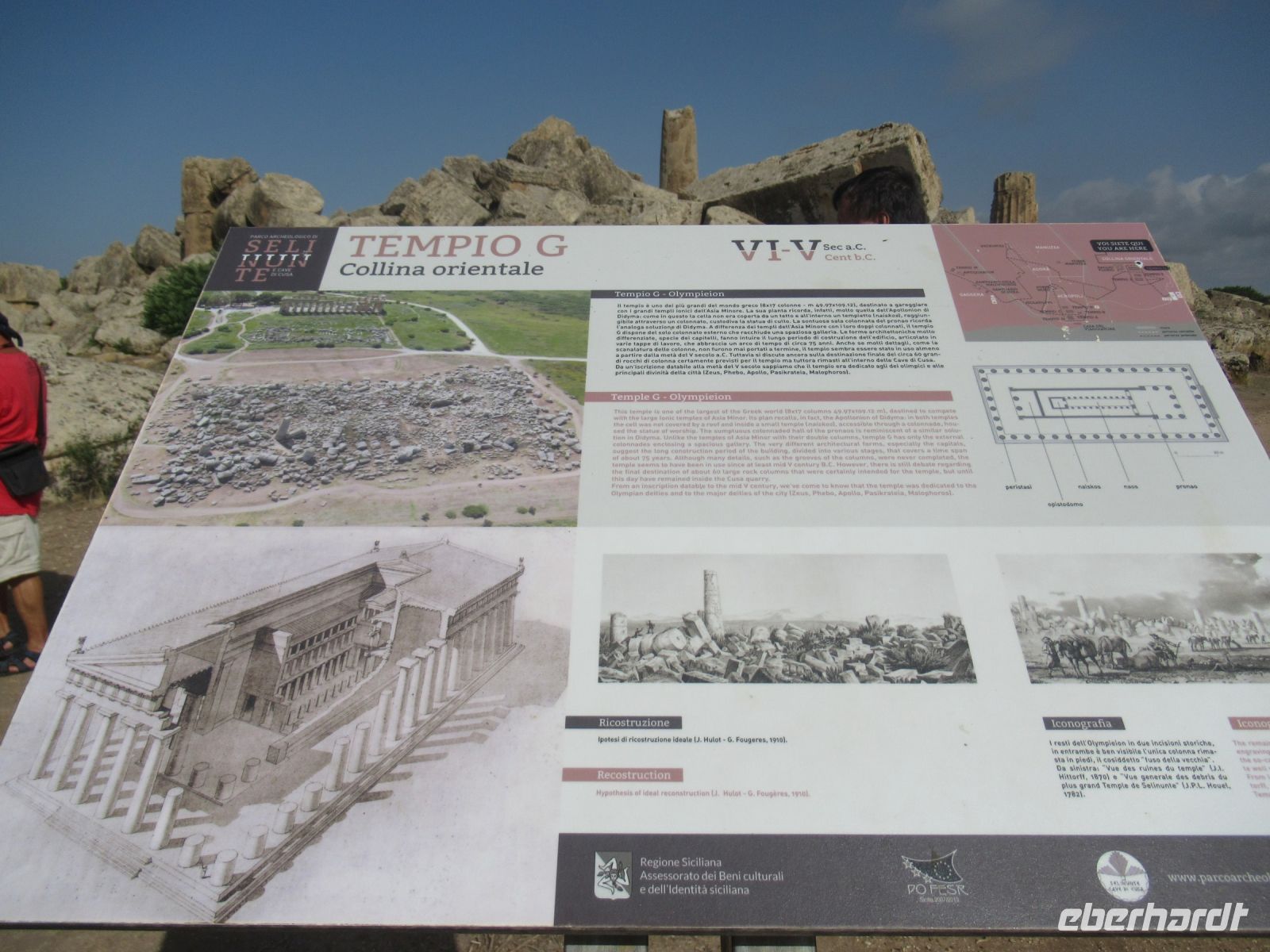Da die Tempel nicht eindeutig den Göttern zugeordnet konnten, sind sie nur mit den Buchstaben benannt. Wir standen zunächst vor dem Tempel E, der nach vorne geöffnet ist. Christiane erzählte uns, wie es wohl ursprünglich aussah. Hier wurde anschaulich auch die Bauweise erklärt und die einfachen, aber doch effektiven Hilfsmittel der damaligen Zeit. Tempel F ist etwas kleiner und wir hatten hier einen wunderschönen Blick aufs Meer, wo die Akropolis zu sehen ist und wussten gar nicht, welche der Bilder wir noch in die Fotoapparate einfangen sollen. Tempel G ist nur noch ein Steinhaufen von Säulen, Riesensteinblöcken mit Ausmassen von 113 x 54 m Fläche.