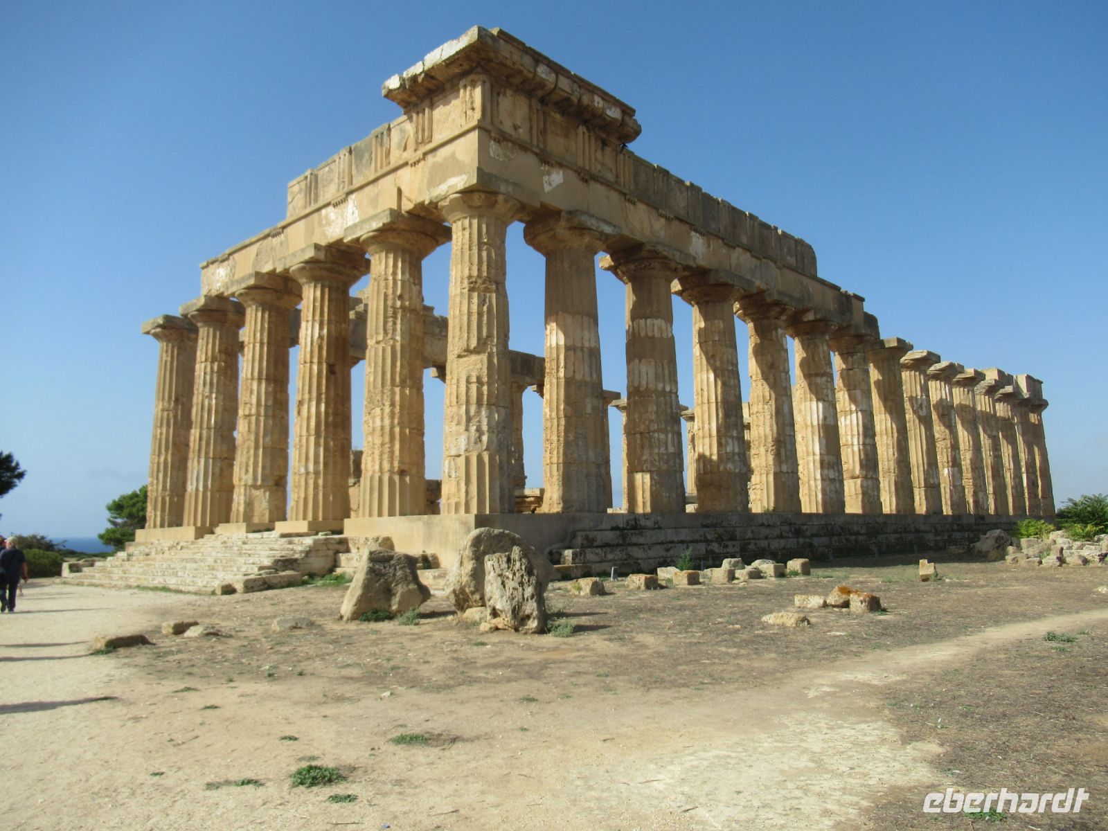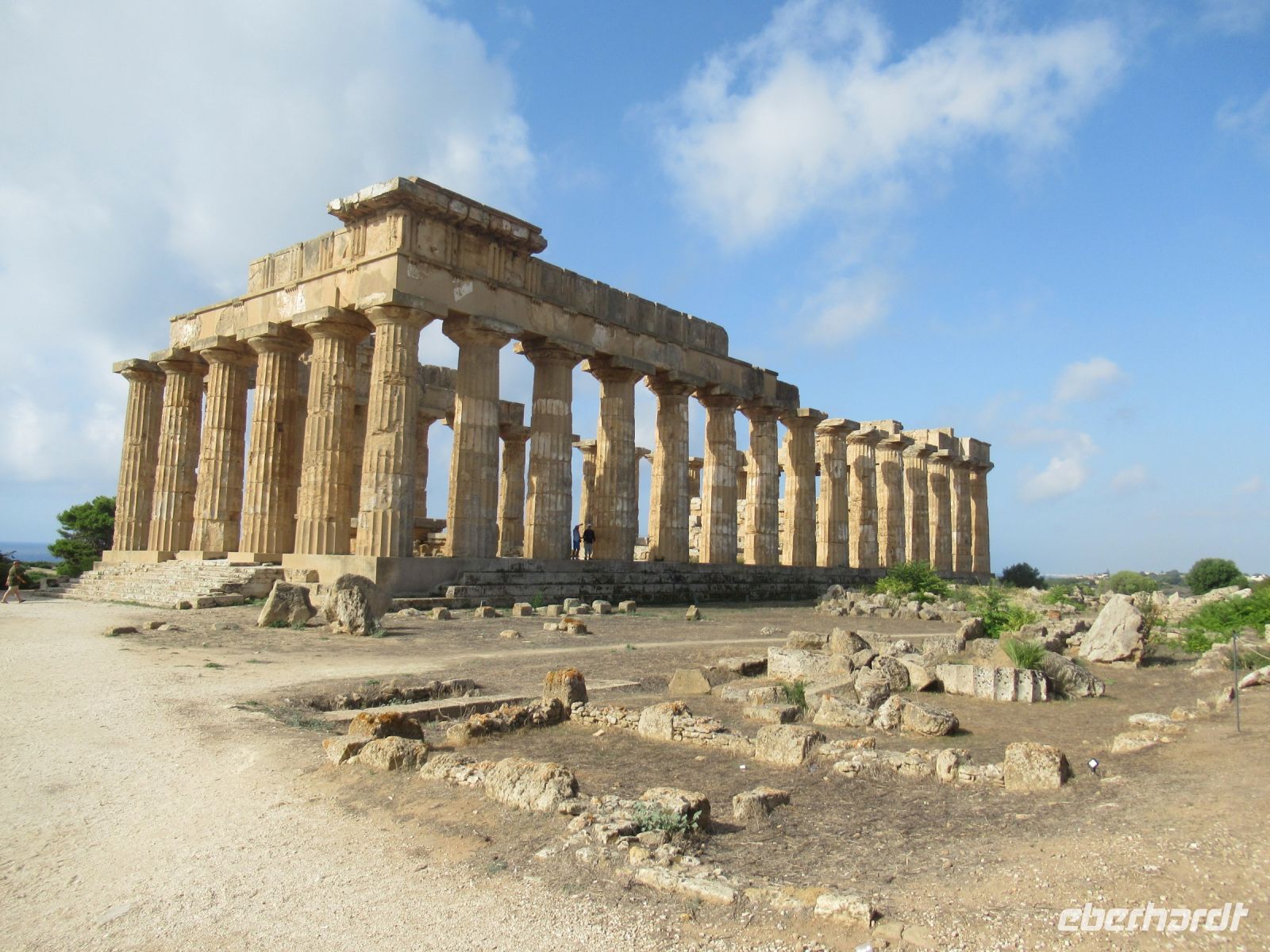 Christiane begann im Schatten des Baumes die Erklärungen. Die Stadt Selinunte wurde 628 v. Chr. von den griechischen Kolonisten Megara Hyblaea gegründet. Der Name der Stadt leitet sich vom griechischen Selinon ab, das auf den wilden Sellerie hinweist, der in der Gegend wächst und der auch zum Symbol der Stadt wurde. Die Stadt wurde 409 v. Chr. von den Karthagern zerstört und kehrte nie zu ihrem früheren Glanz zurück. Zwischen den Ruinen lebten in der byzantinischen christlichen und arabischen Zeit kleine Gemeinden, aber ein schreckliches Erdbeben im Mittelalter setzte der Geschichte von Selinunte endgültig ein Ende.