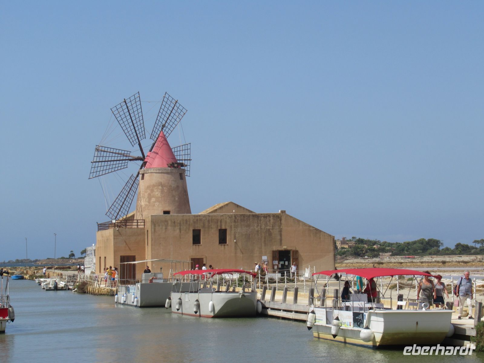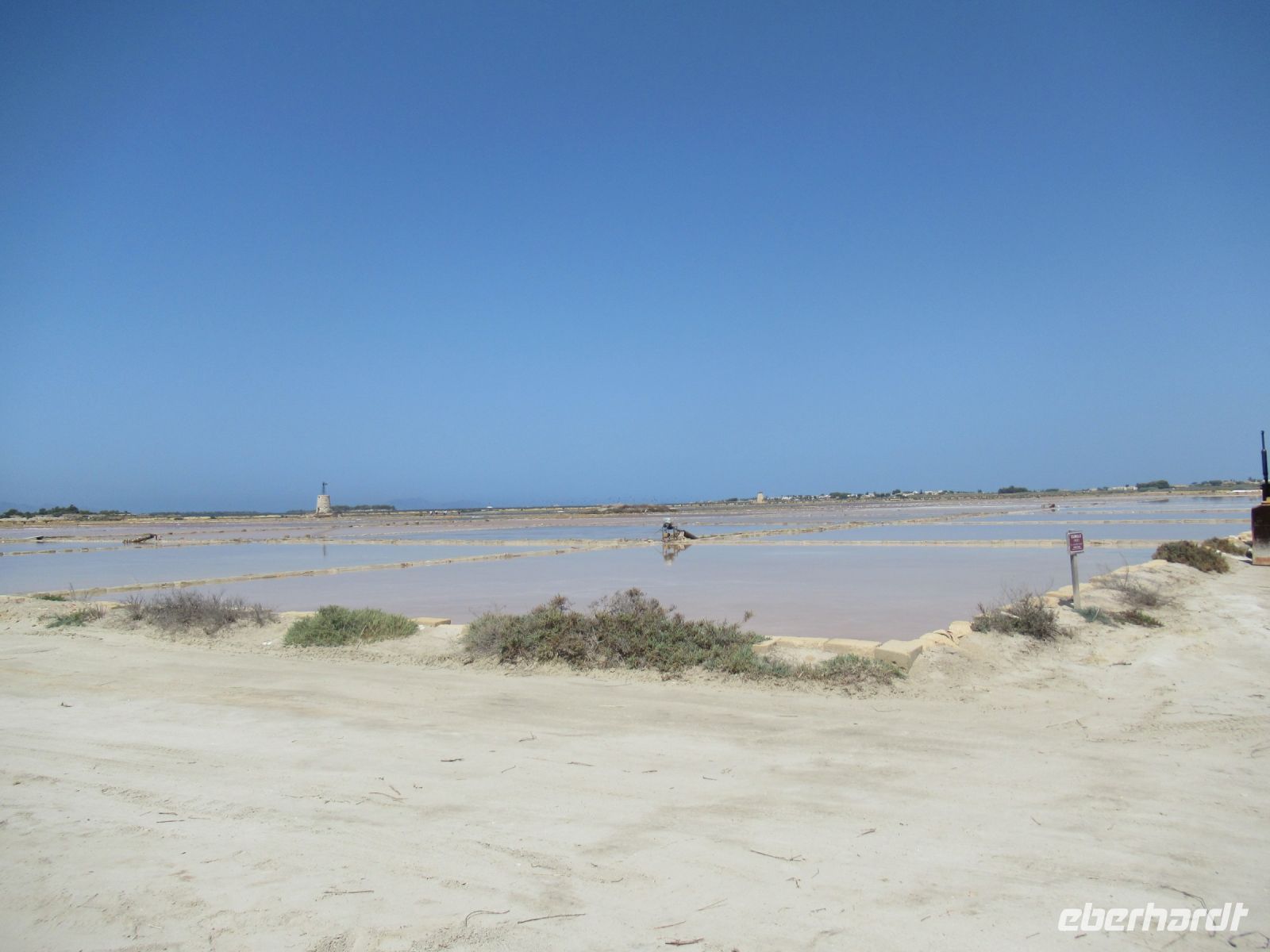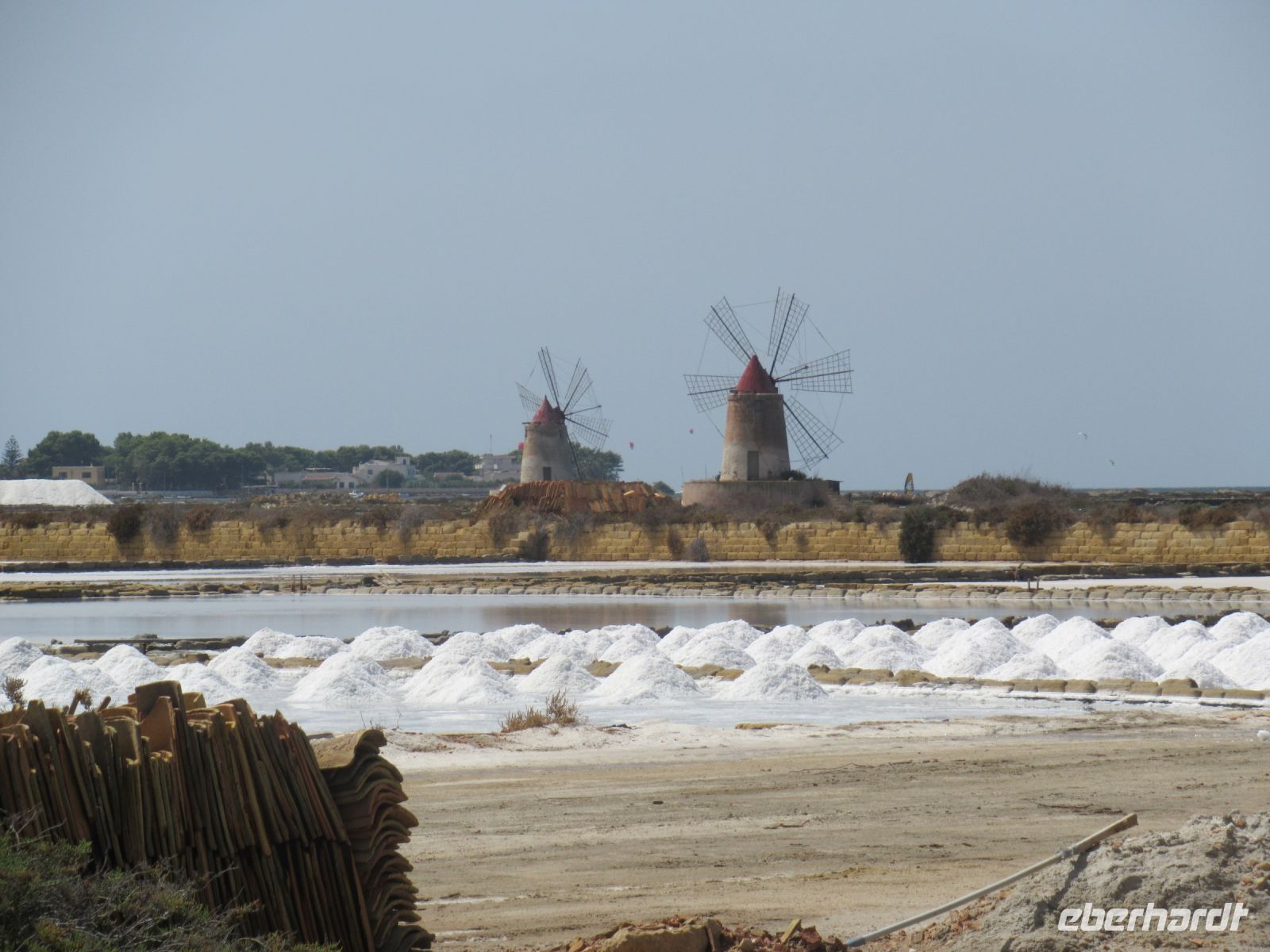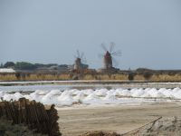 So kehrten wir langsam zurück zum Parkplatz, noch eine kleine Erfrischungspause und wir fuhren zu unseren nächsten Ziel – Salinen. Wir fuhren noch ein Stück die Autobahn bis die Mazara der Vallo, wo die Autobahn endete und dann die Landstraße teils am Meer und über den Ort Marsala. Entlang der westlichen Küsten konnten wir die Inseln Isole di Marsala, Isola di Favignana und Isola di Levanzo sehen und viele Surfer, die dank der Winde hier ideale Bedingungen haben. Christiane erzählte uns über den Olivenanbau und Verarbeitung, sowie über den Weinanbau und den berühmten Marsala-Wein.