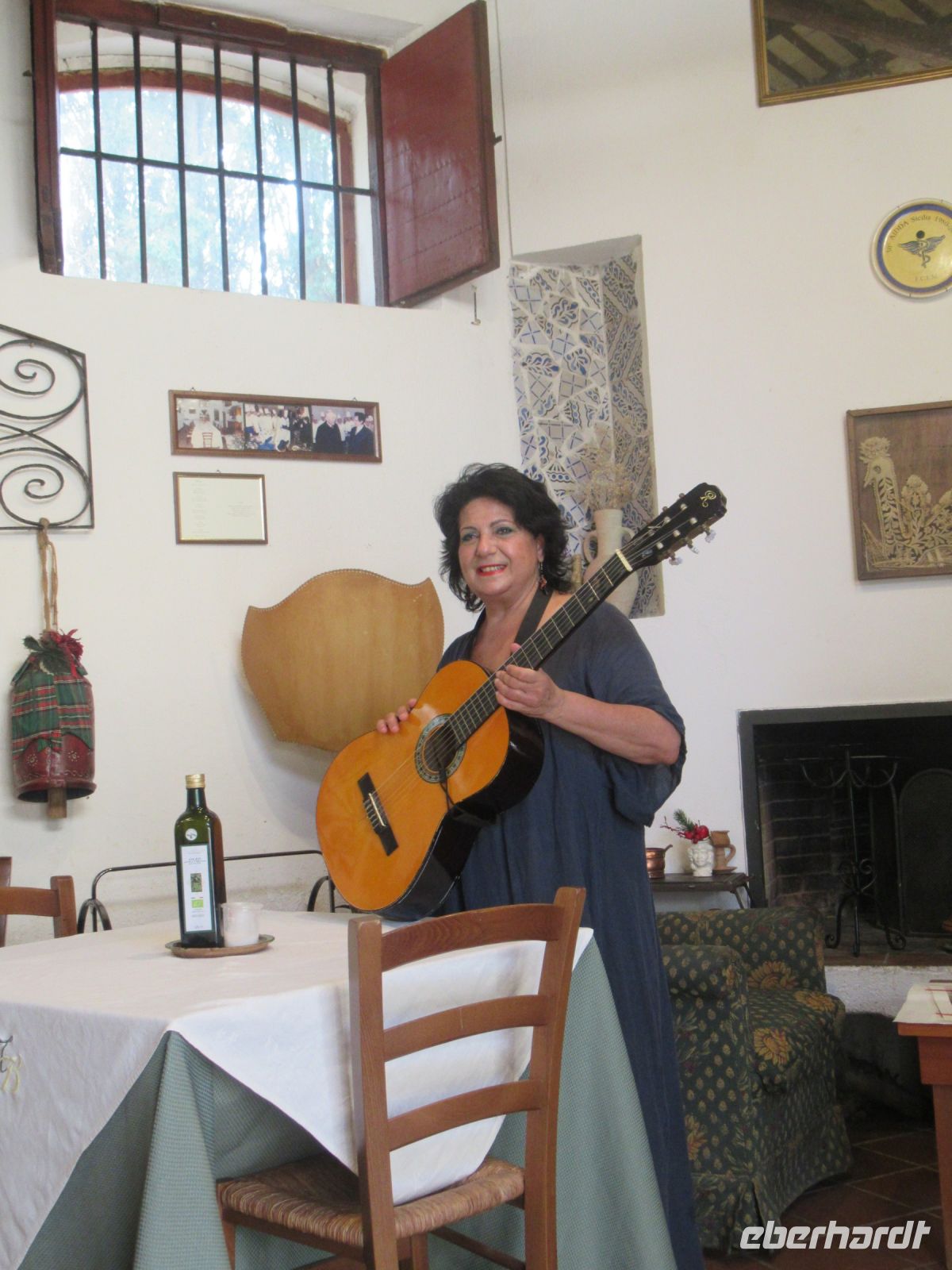 Nach einem kurzen Stop ging es über eine Landstraße zu unserem Mittagessen in Agriturismo im Restaurant „Azienda Fontanasalsa“. Schon im Hof eine Überraschung, eine rassige Sizilianerin begrüßte uns mit Gesang und Gitarre vom Balkon des Hofatrium. Dieser toller Gesang und Musik begleitete auch unser fantastisches Sizilianisches Spezialitätenmenü. Mit Einlage von Tänzchen einiger Teilnehmer endete das Mittagessen mit einem Liebeslied für ein Paar im Hof.