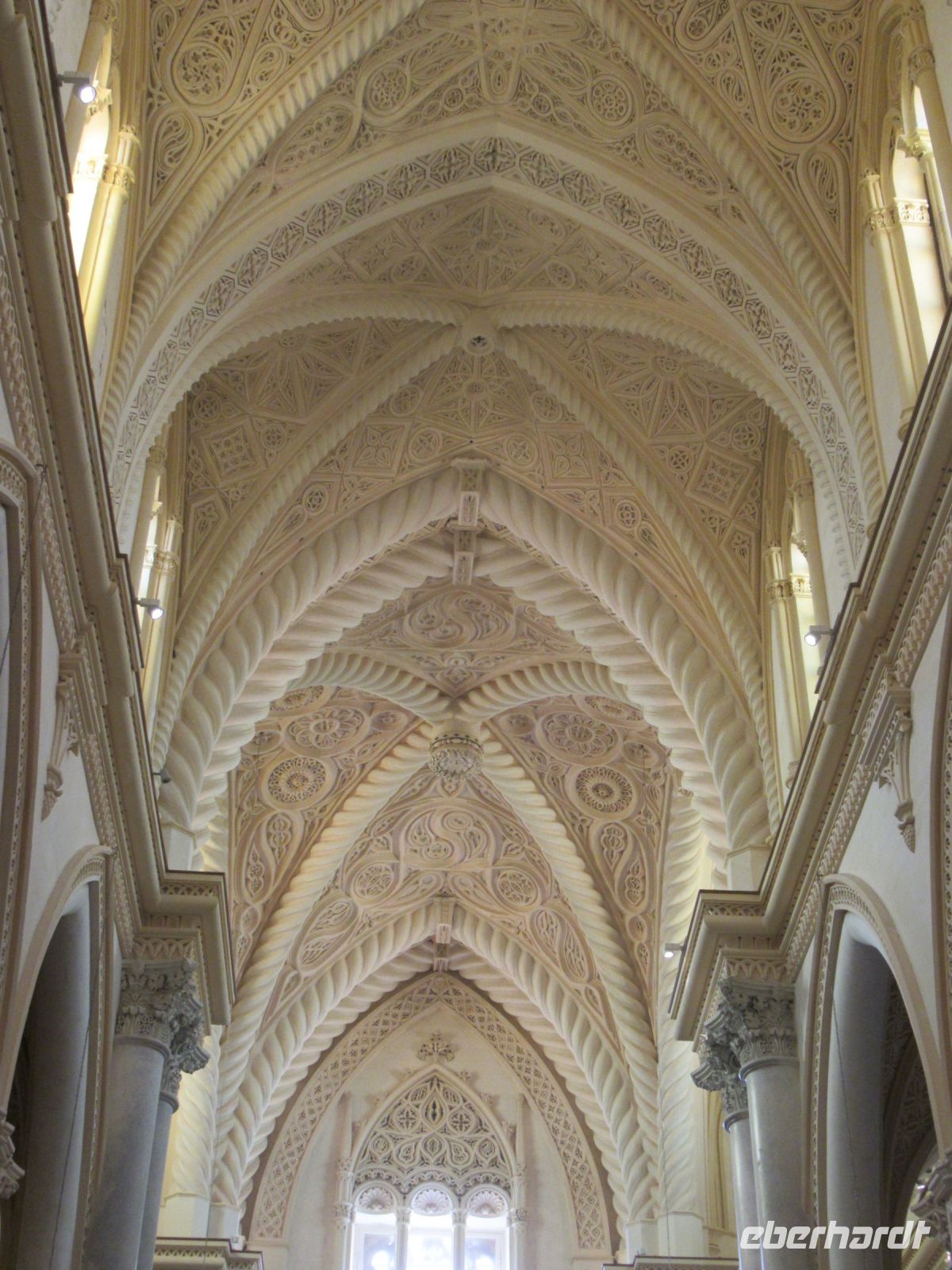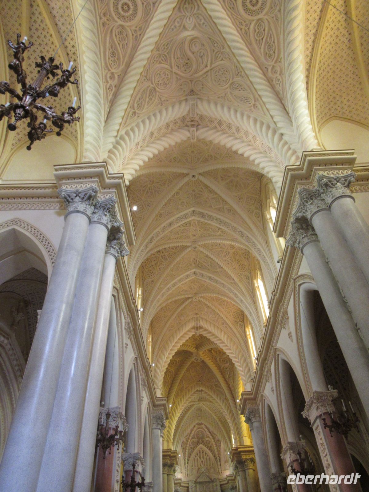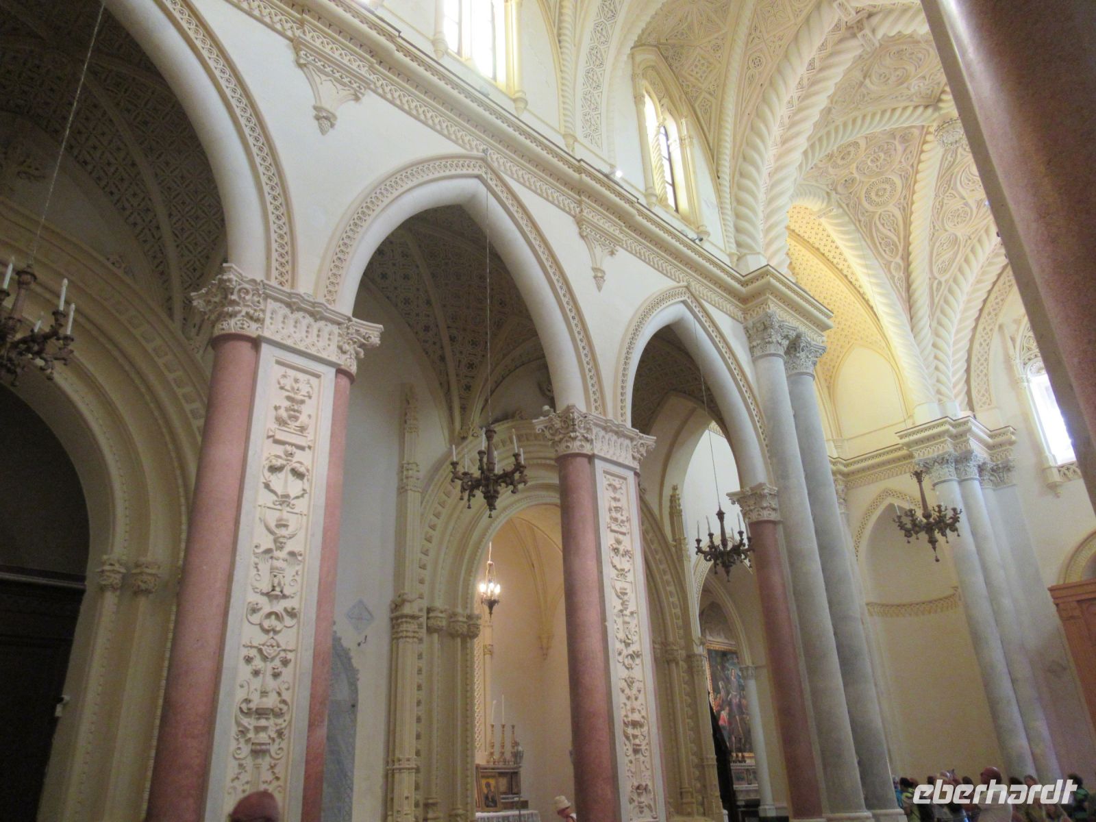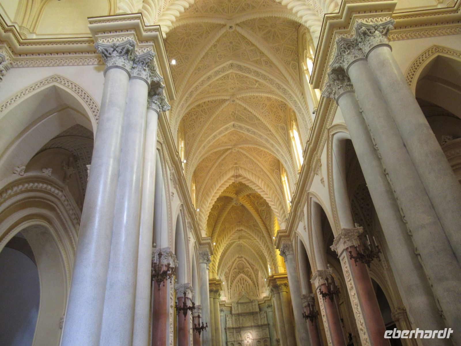 So starteten wir in dem Dom (Chiesa Regia Matrice), der vom 13. Jahrhundert stammt. Im 19. Jahrhundert wurde das Kircheninnere im gotischen Stil umgestaltet. Als würde eine cremfarbene feine Spitze auf die Decke gelegt, so filigran ist die Kirchendecke gestaltet.