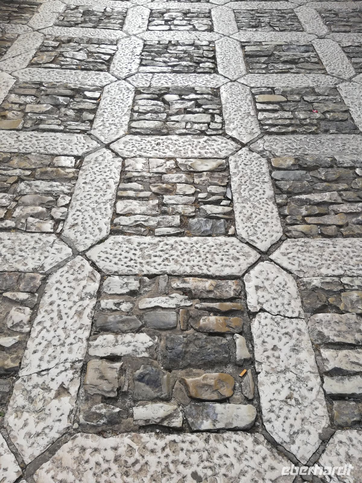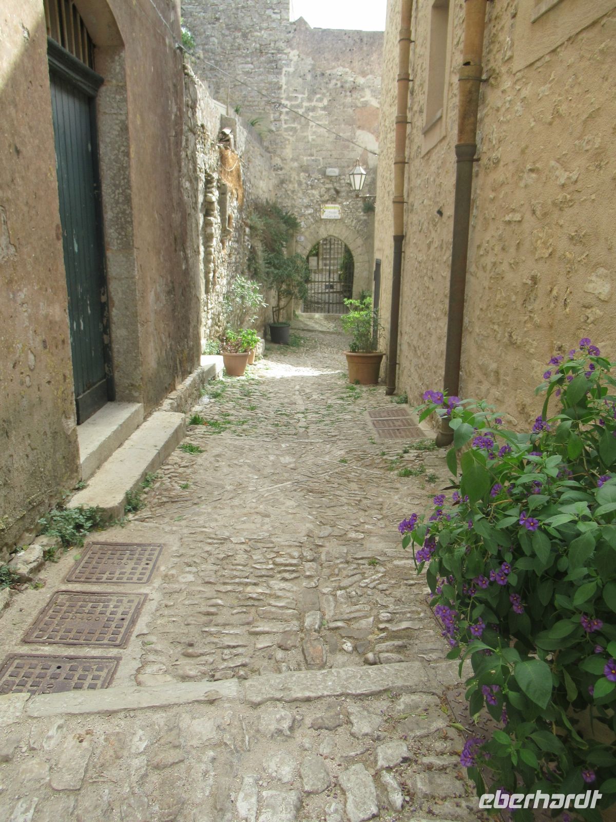 Ein wunderbarer Blick aufs Meer eröffnete sich bei jeder Kurve, sogar Blick auf einige Egadische Inseln. Angekommen in Erice betraten wir das „steinerne“ Städtchen durch ein Tor, die Pflasterwege mit einem schönen Muster waren wie poliert, wehe, es wäre nass....